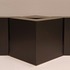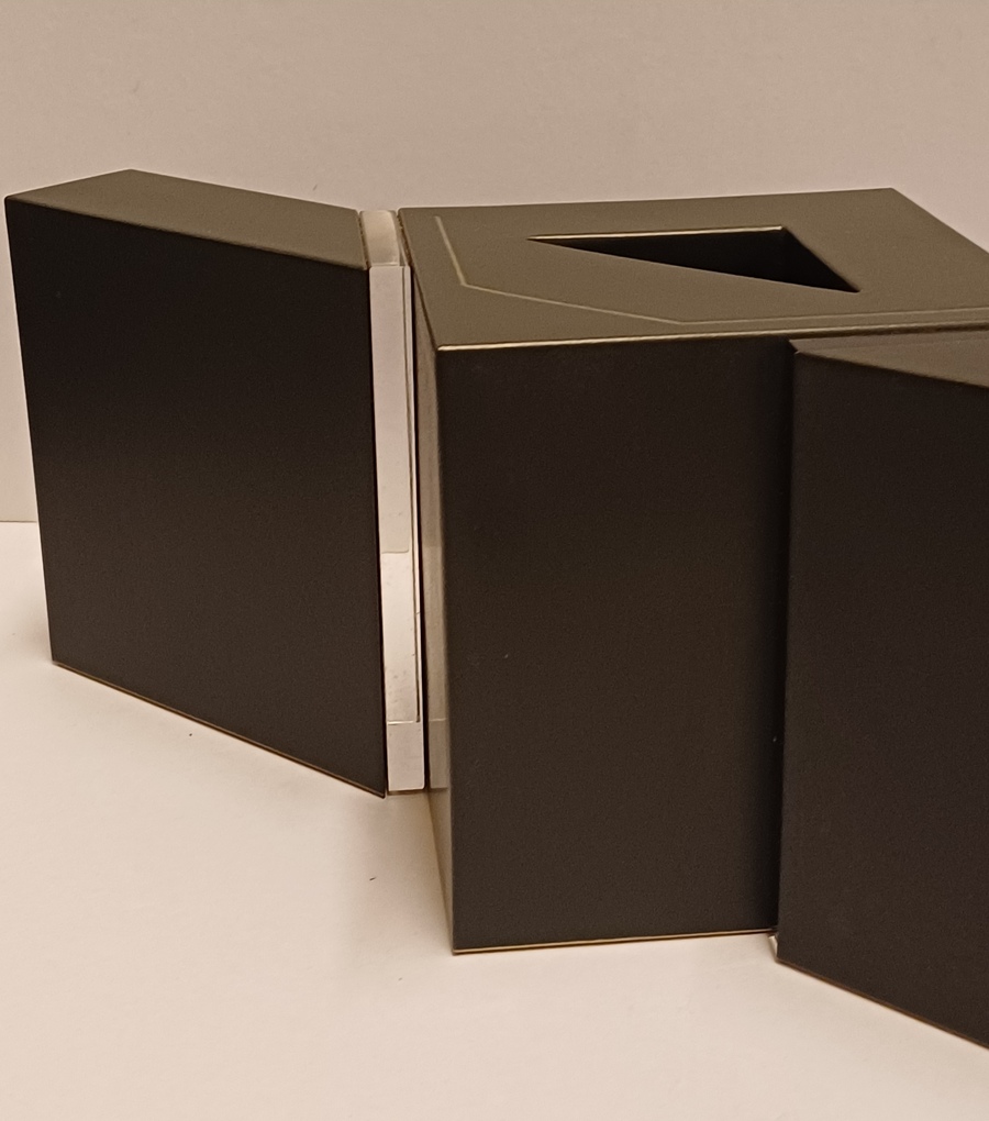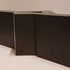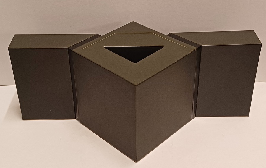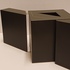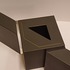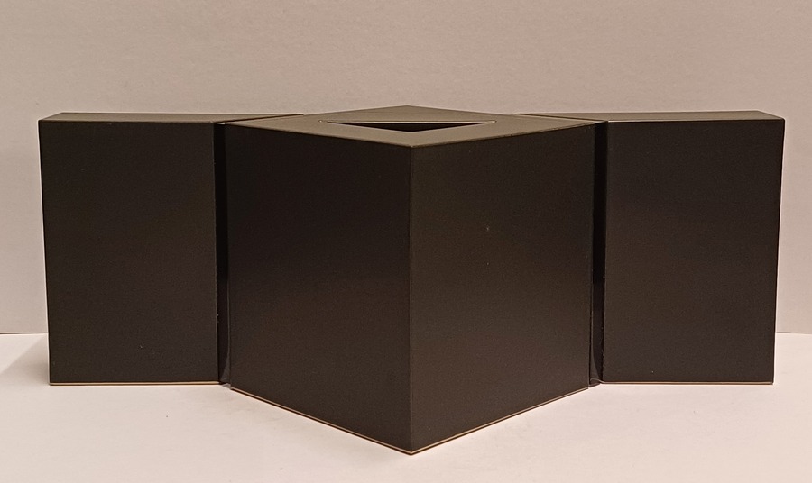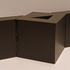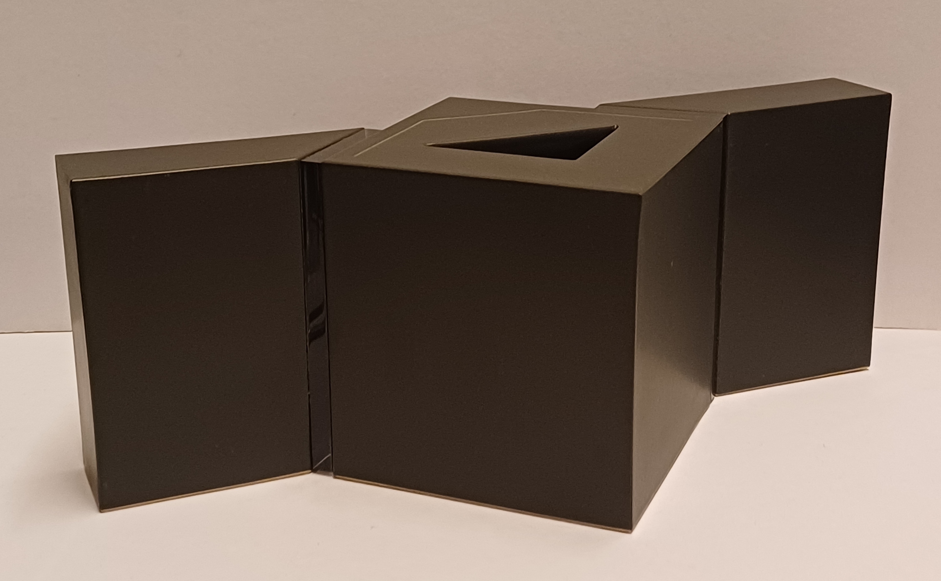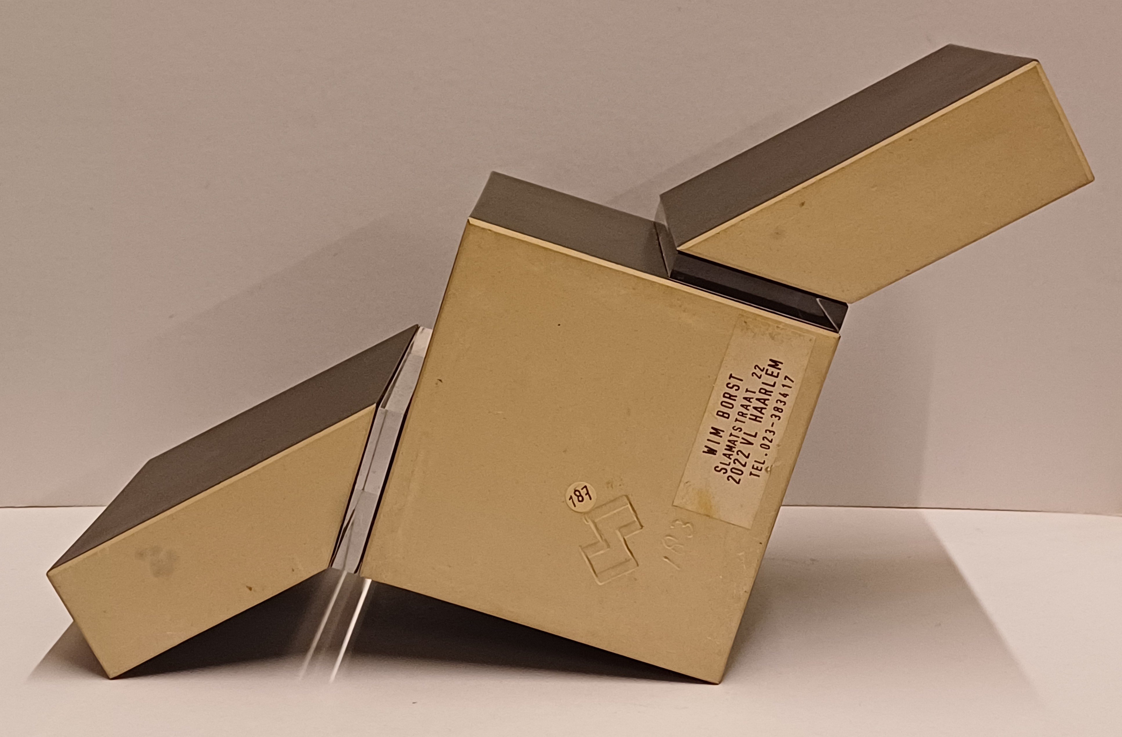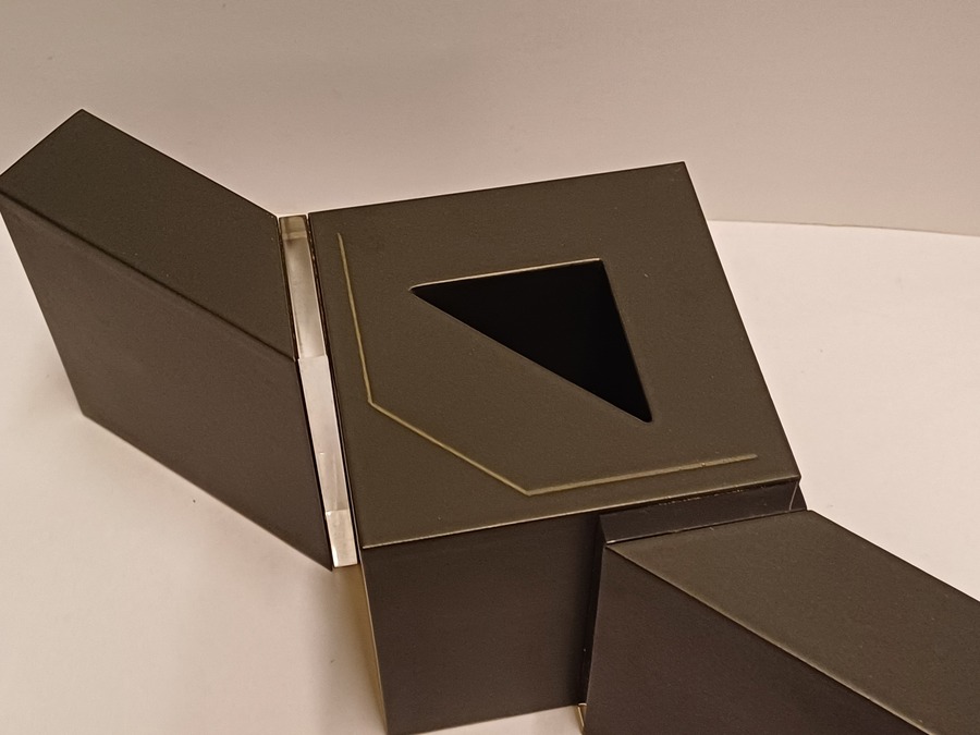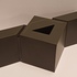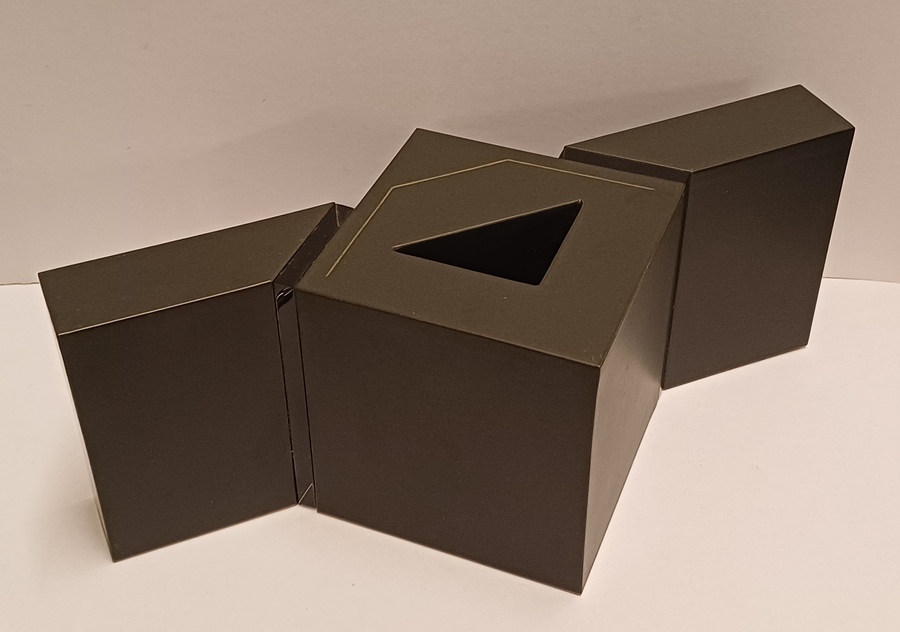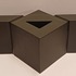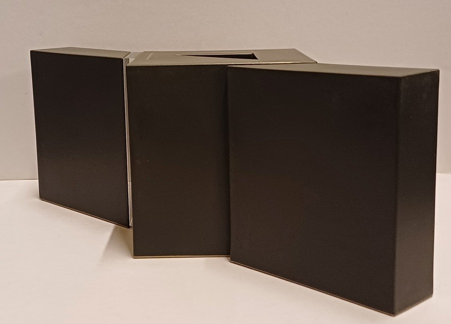 Zwarte aardewerken geometrische vorm met plexi glazen tussen stukken. Onderzijde met kunstenaars monogram.