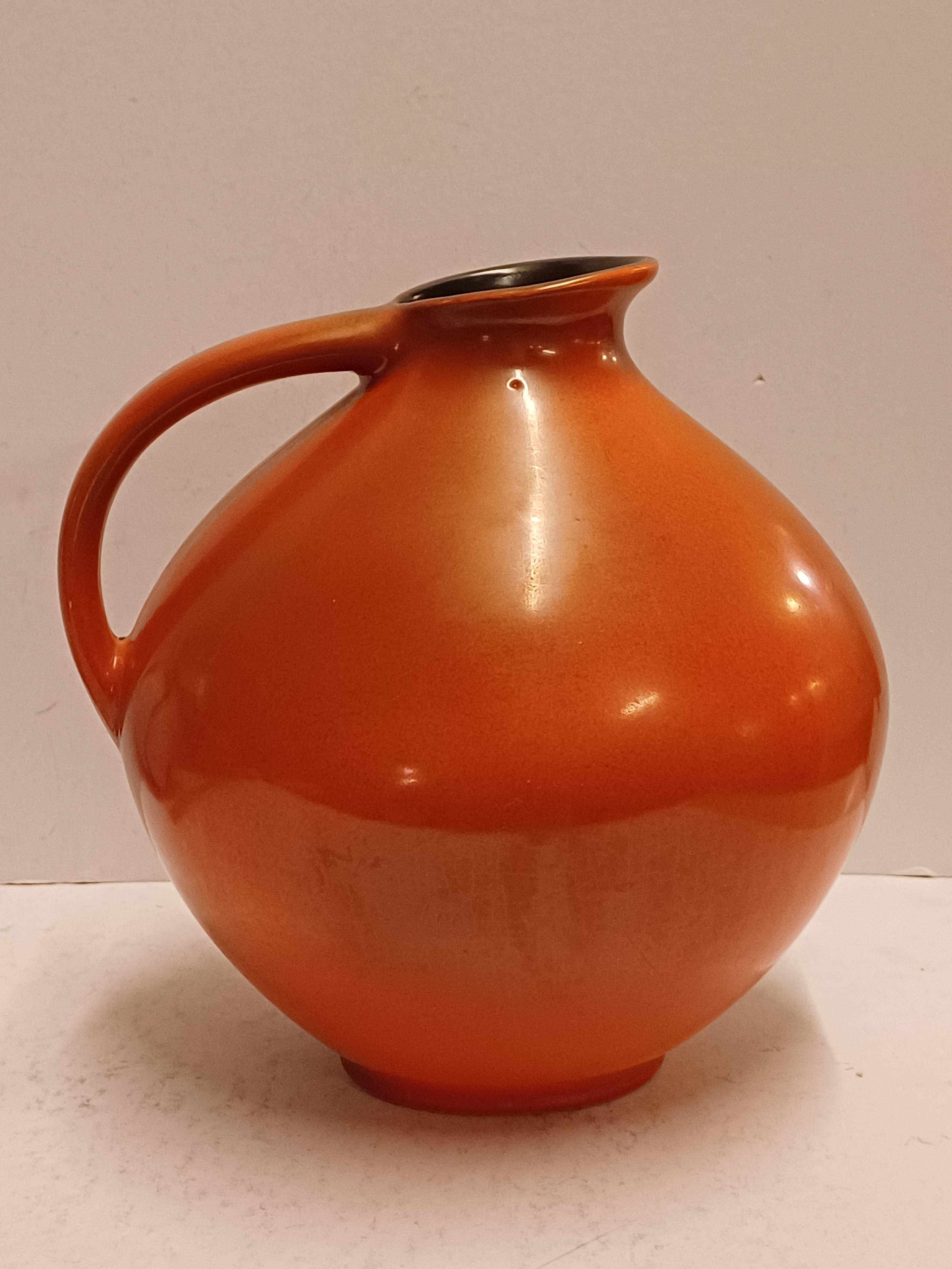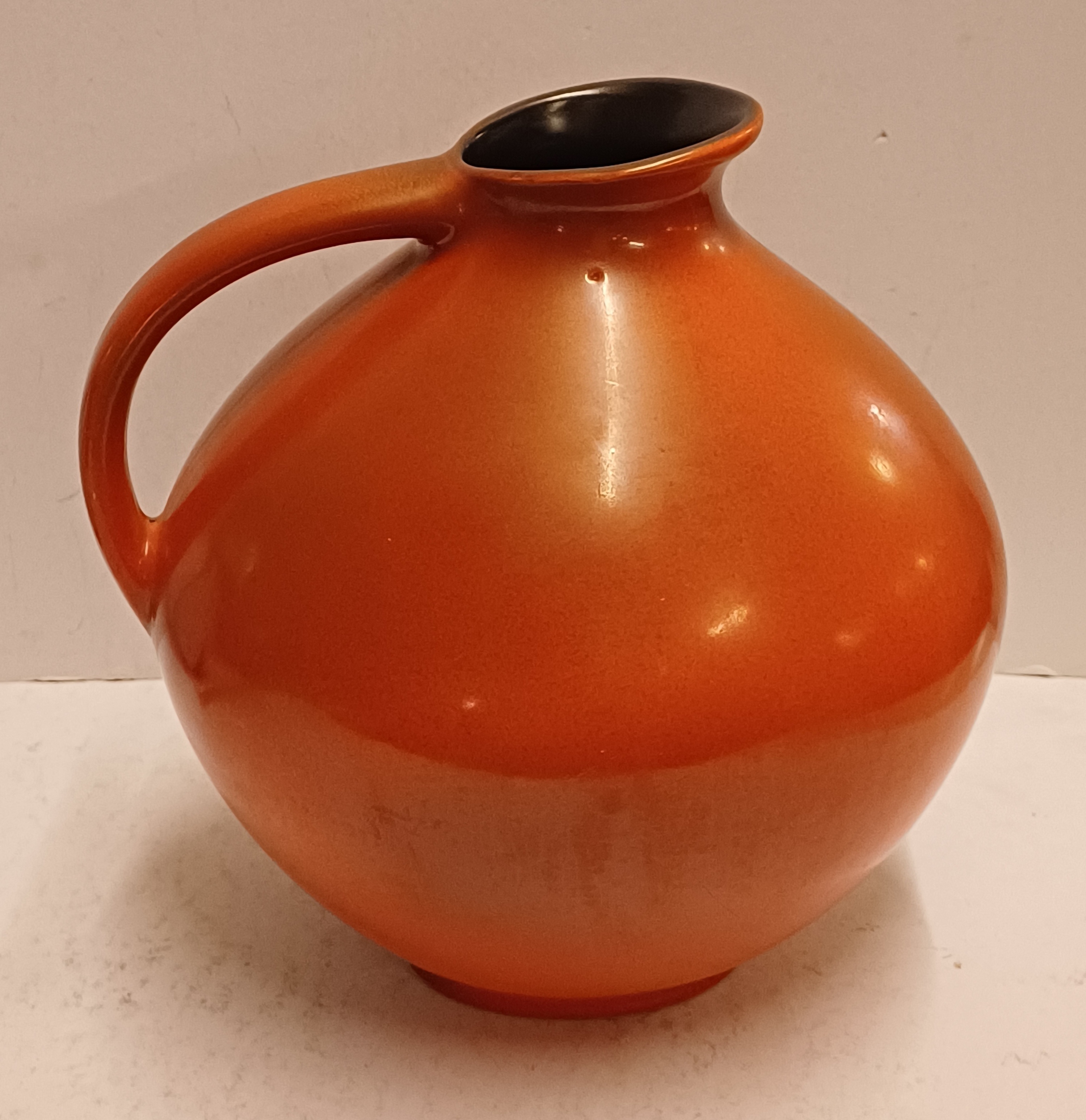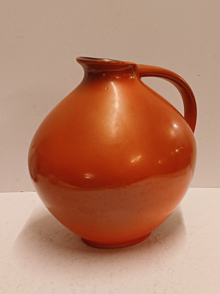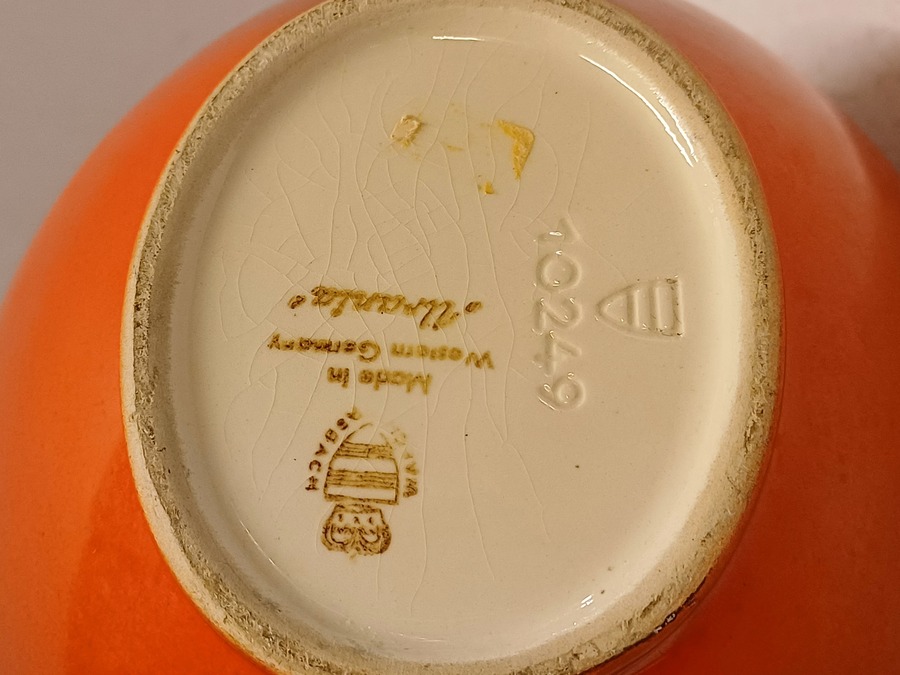 Sierkan met rode spuitglazuur en zwarte binnenzijde. Decornaam Urania, onderzijde met fabrieksmerk