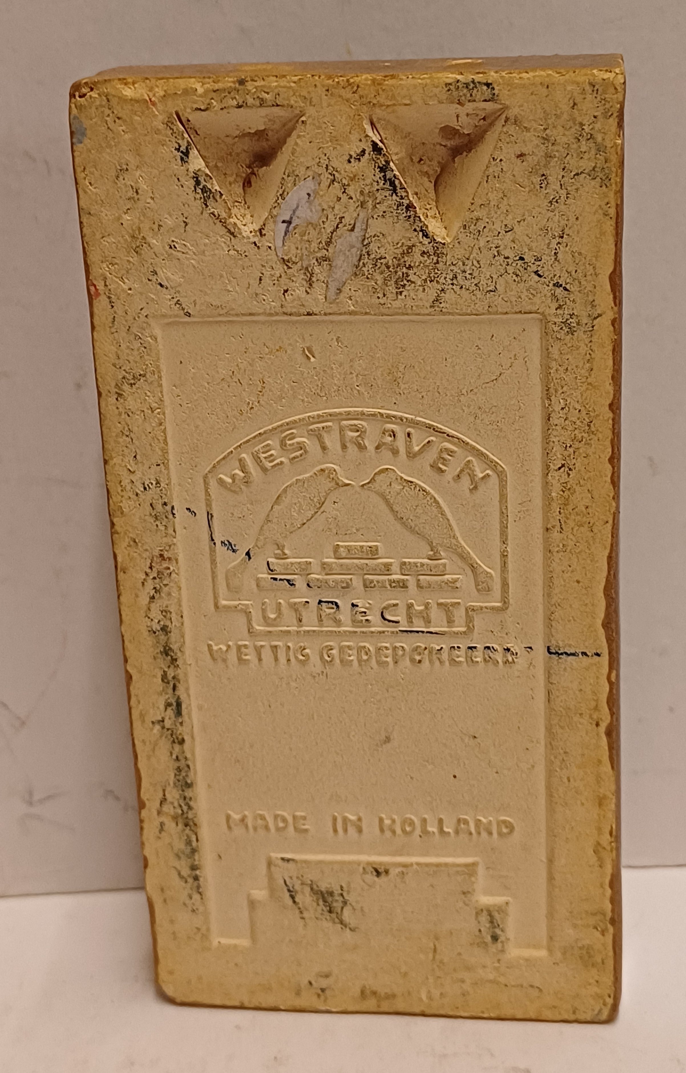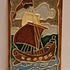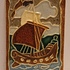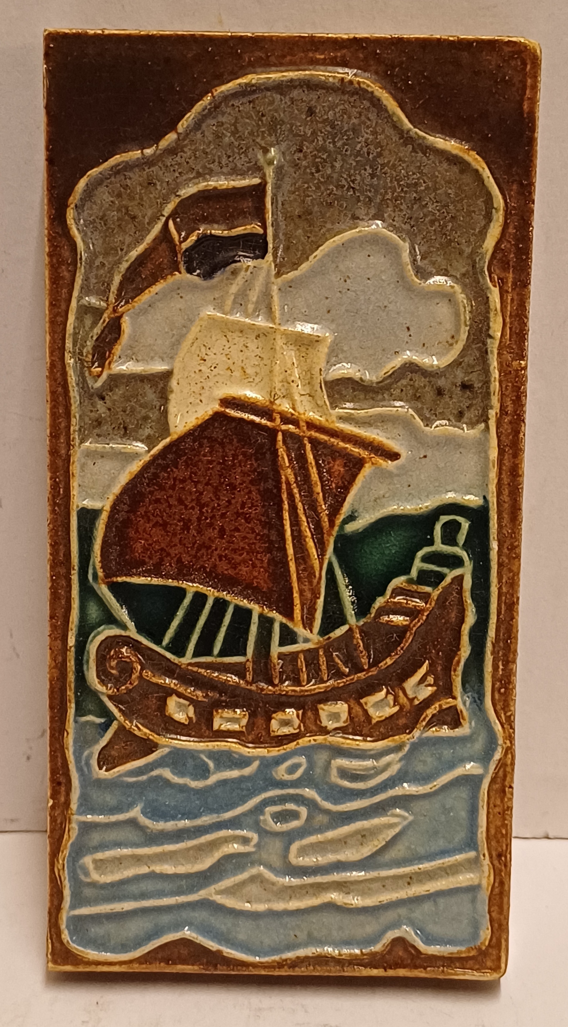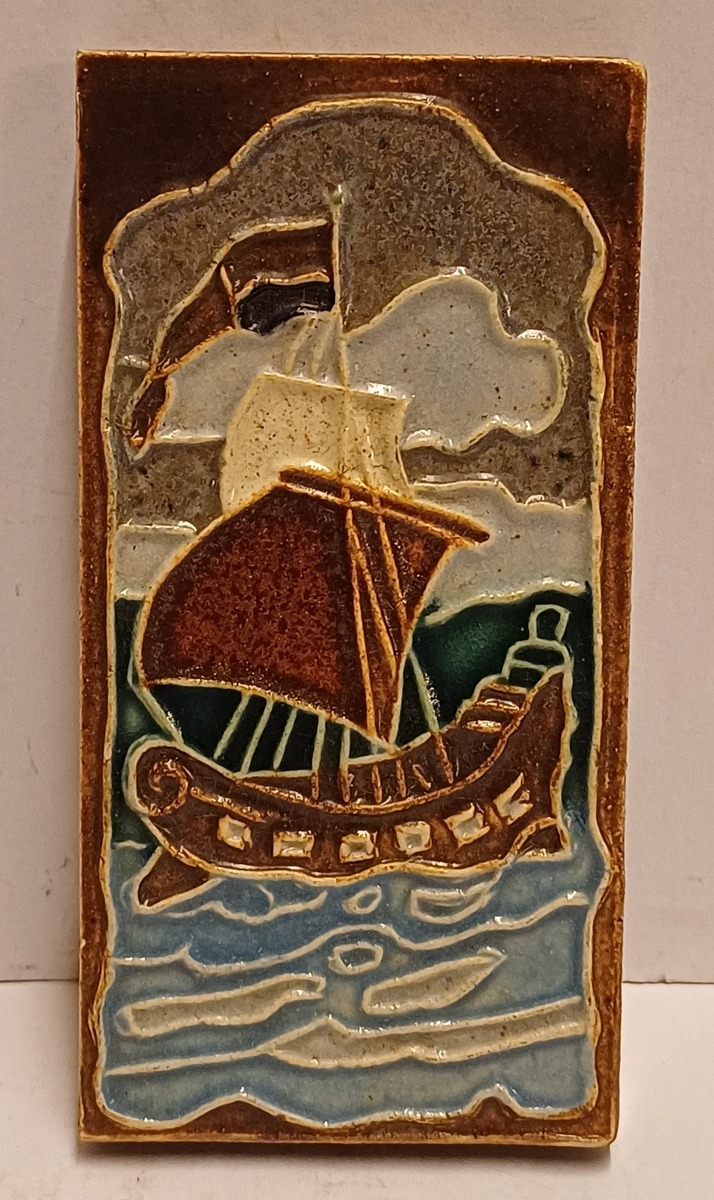 Smal cloisonne tegeltje met voorsteloling van een schip. Achterzijde met fabrieksmerk.