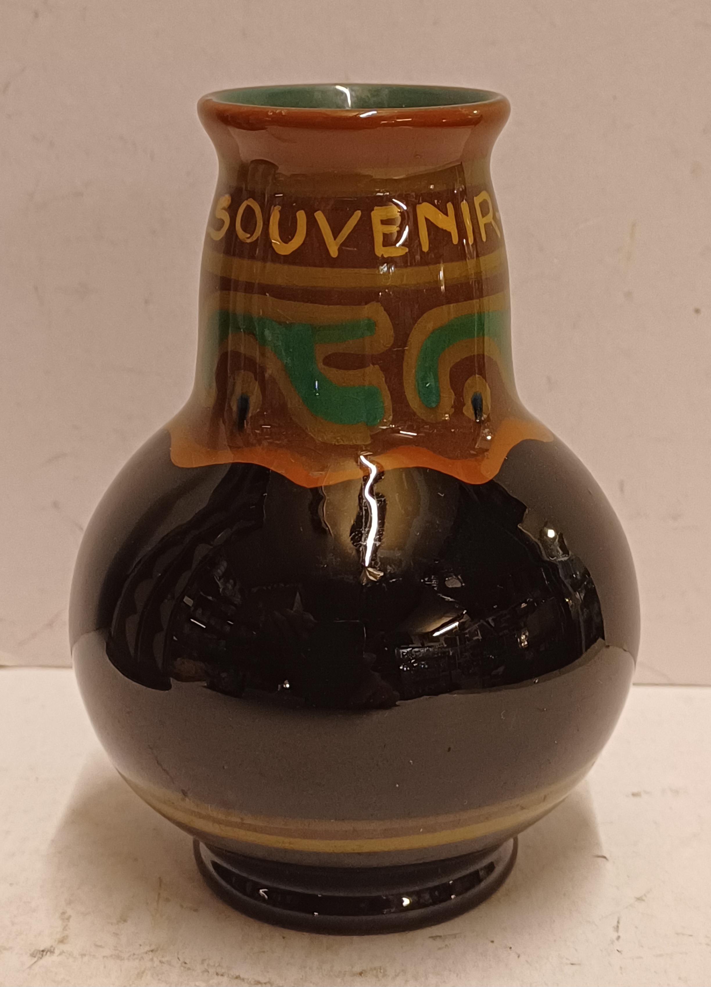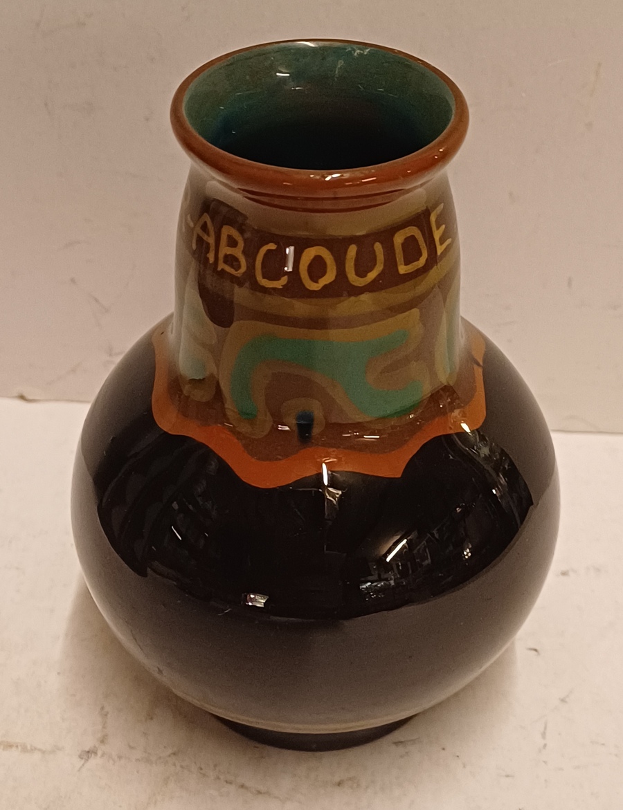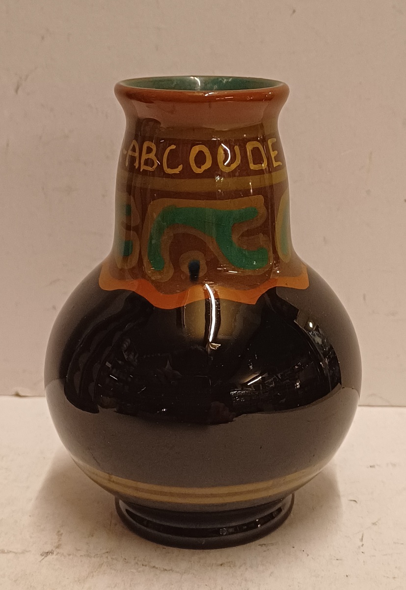 Platelen vaasje met gestileerde horizontale band en de tekst " souvenier Abcoude". Onderzijde gemerkt.