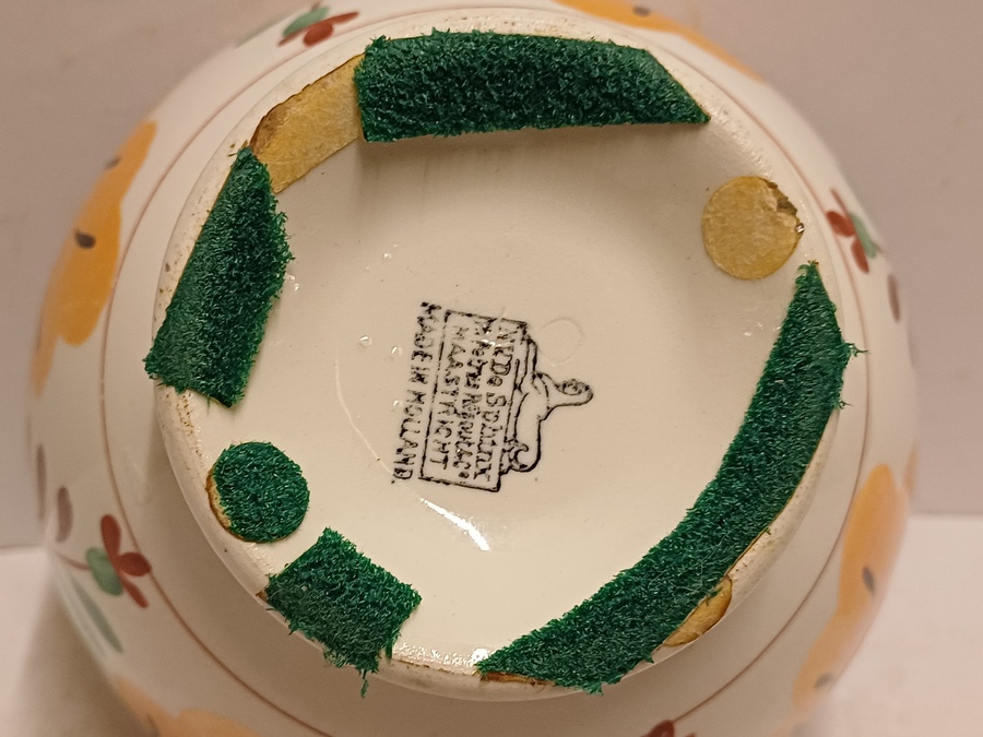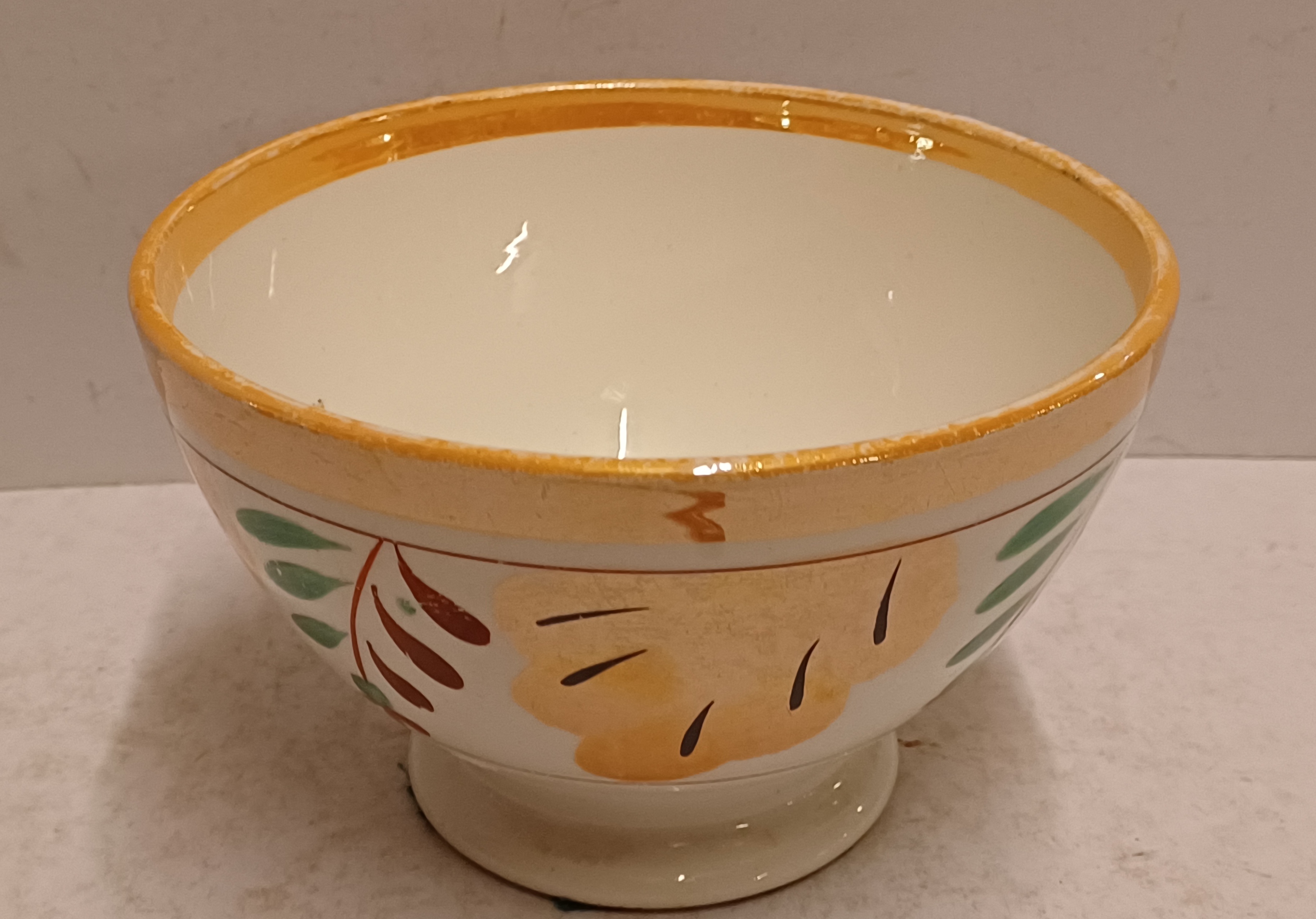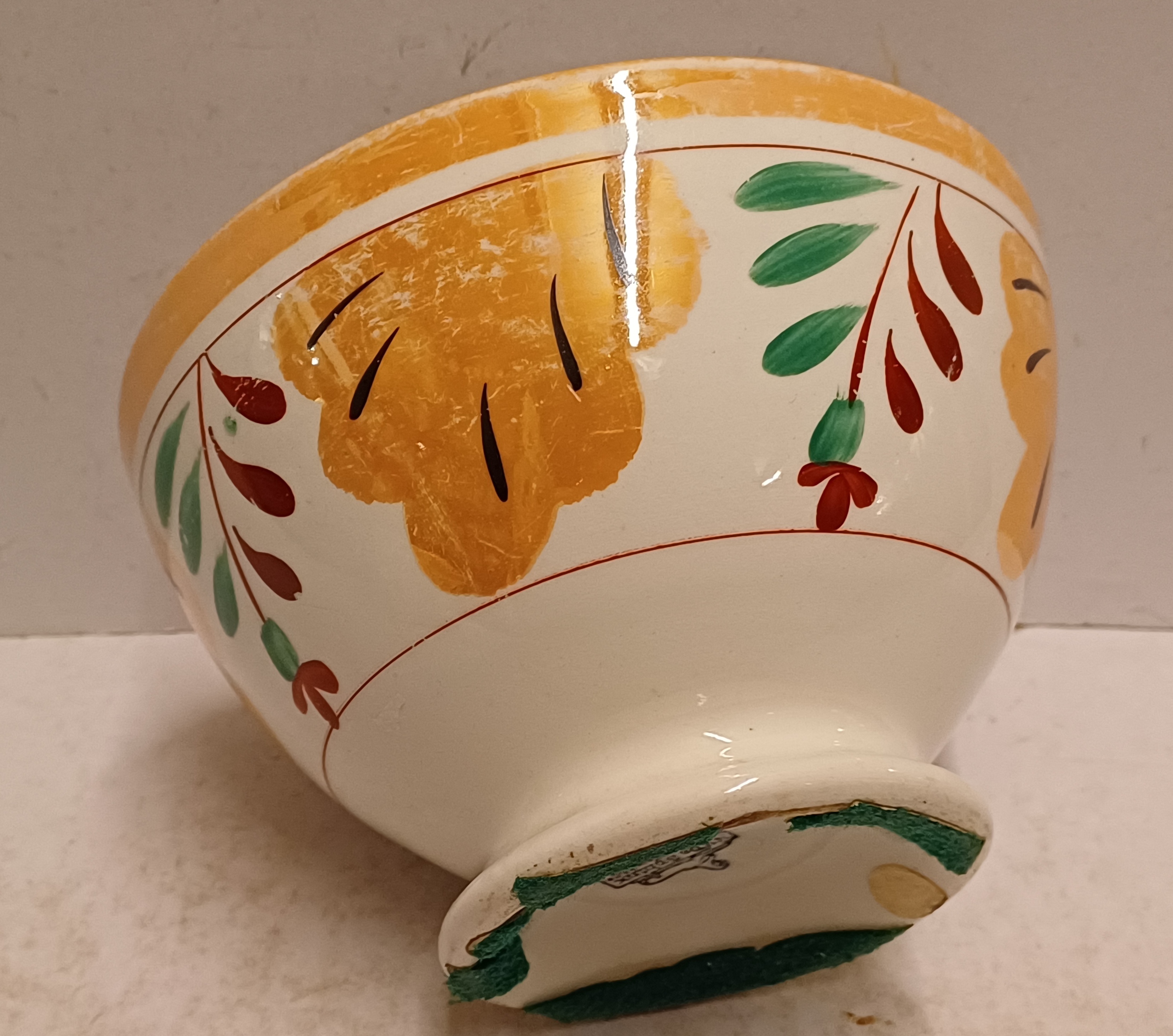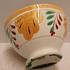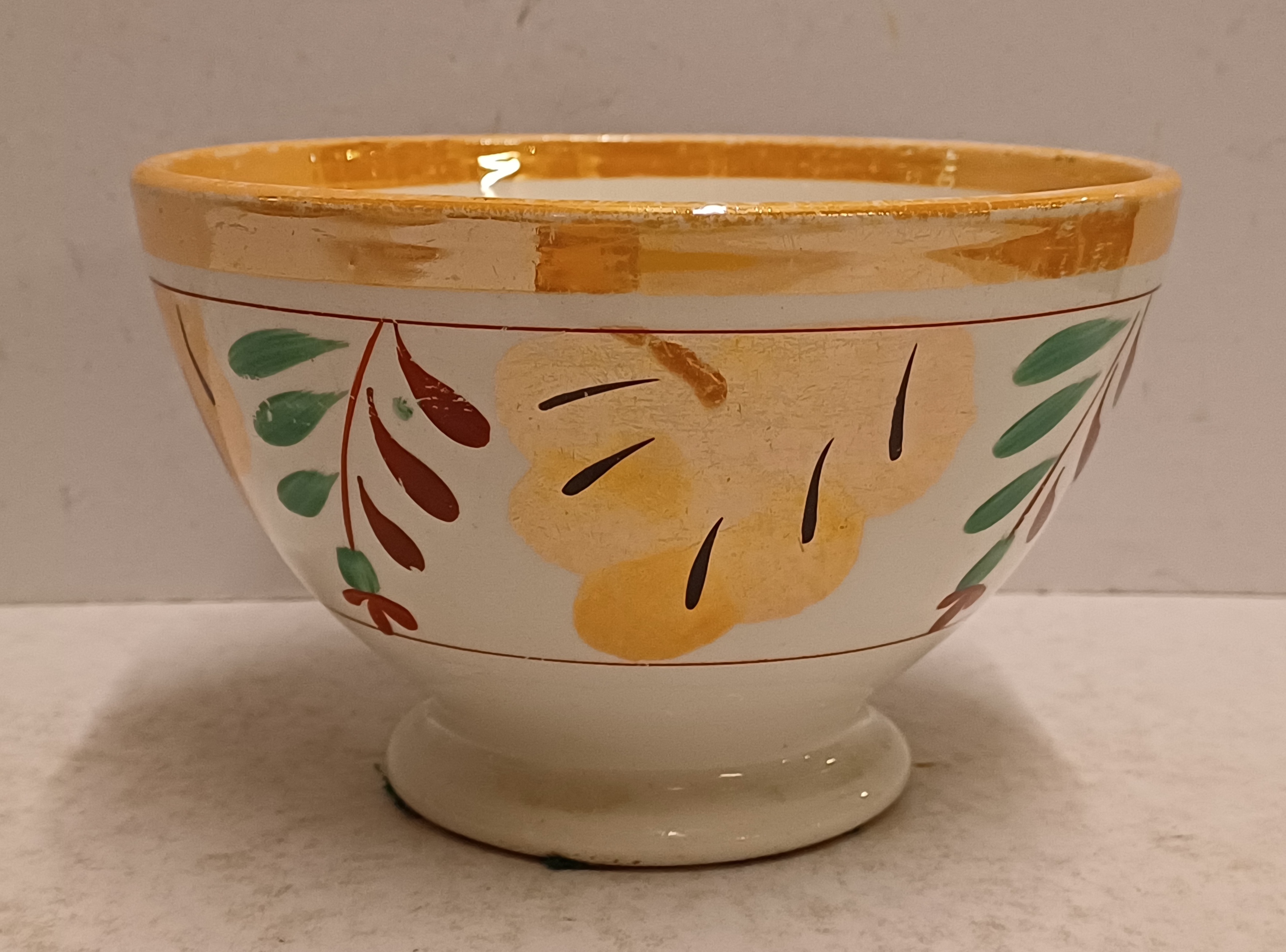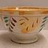 Kleine spoelkom met luster decor Boerenbont en rode en groene blaadjes. Onderzijde met fabrieksmerk.