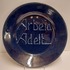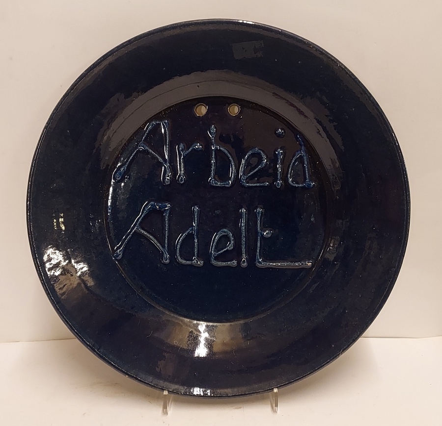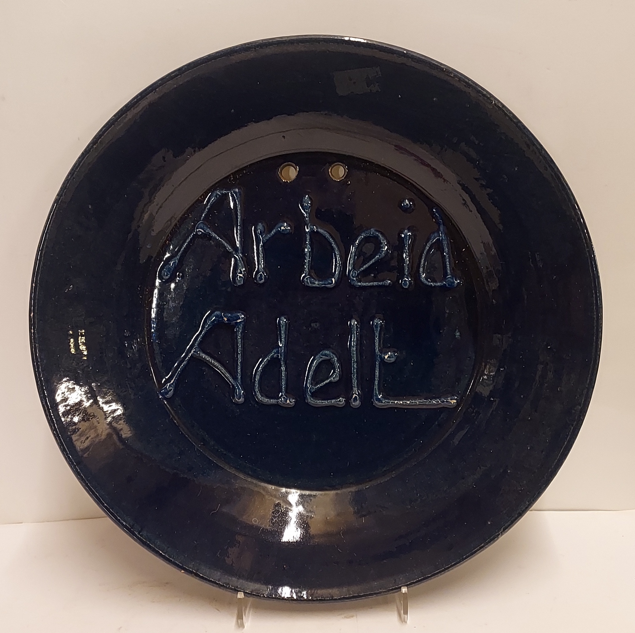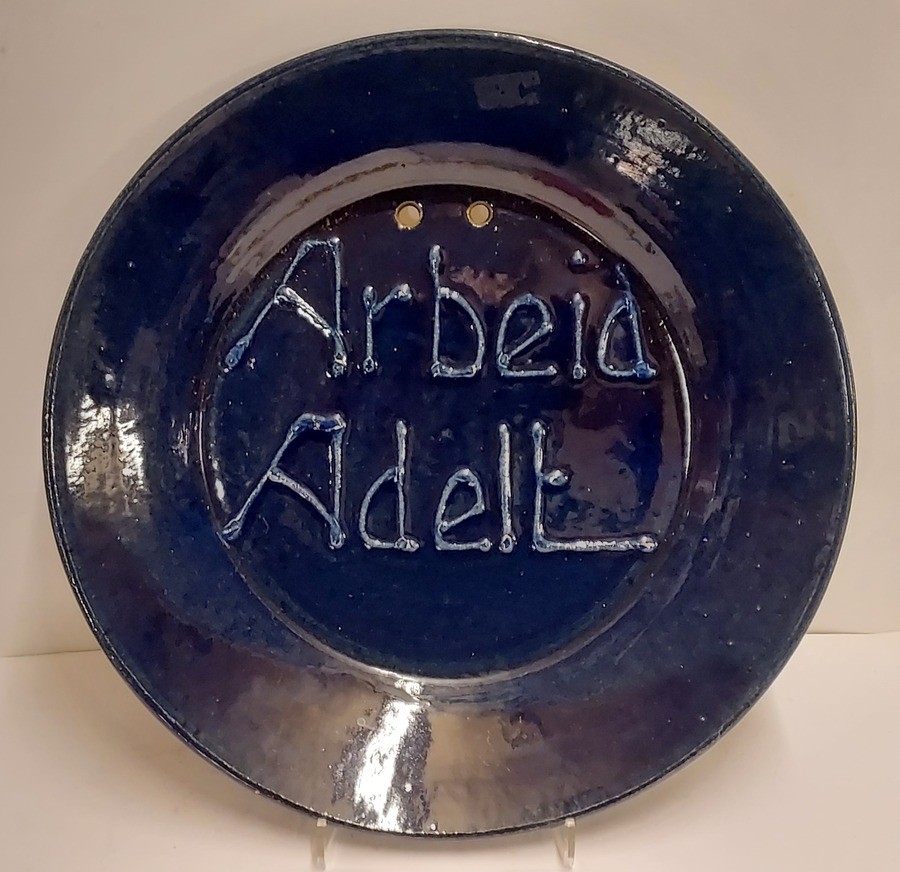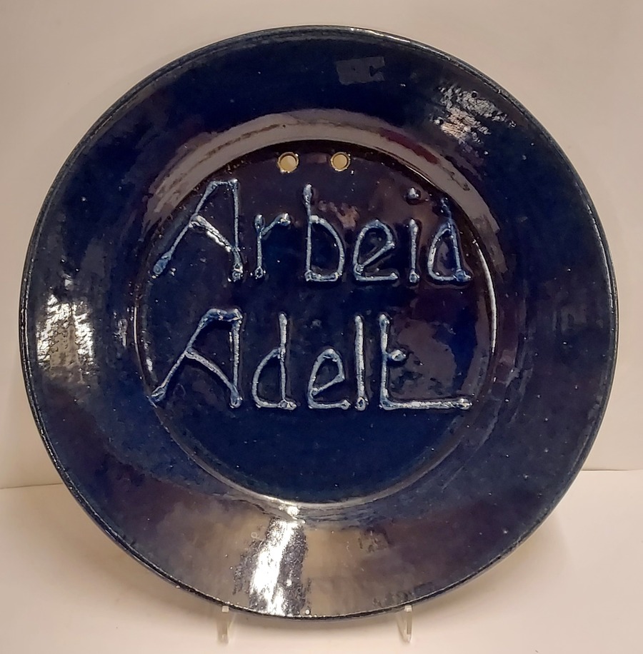 Piatto smaltato in blu scuro con il testo "Arbeid Adelt". Sul retro, primo marchio DR.