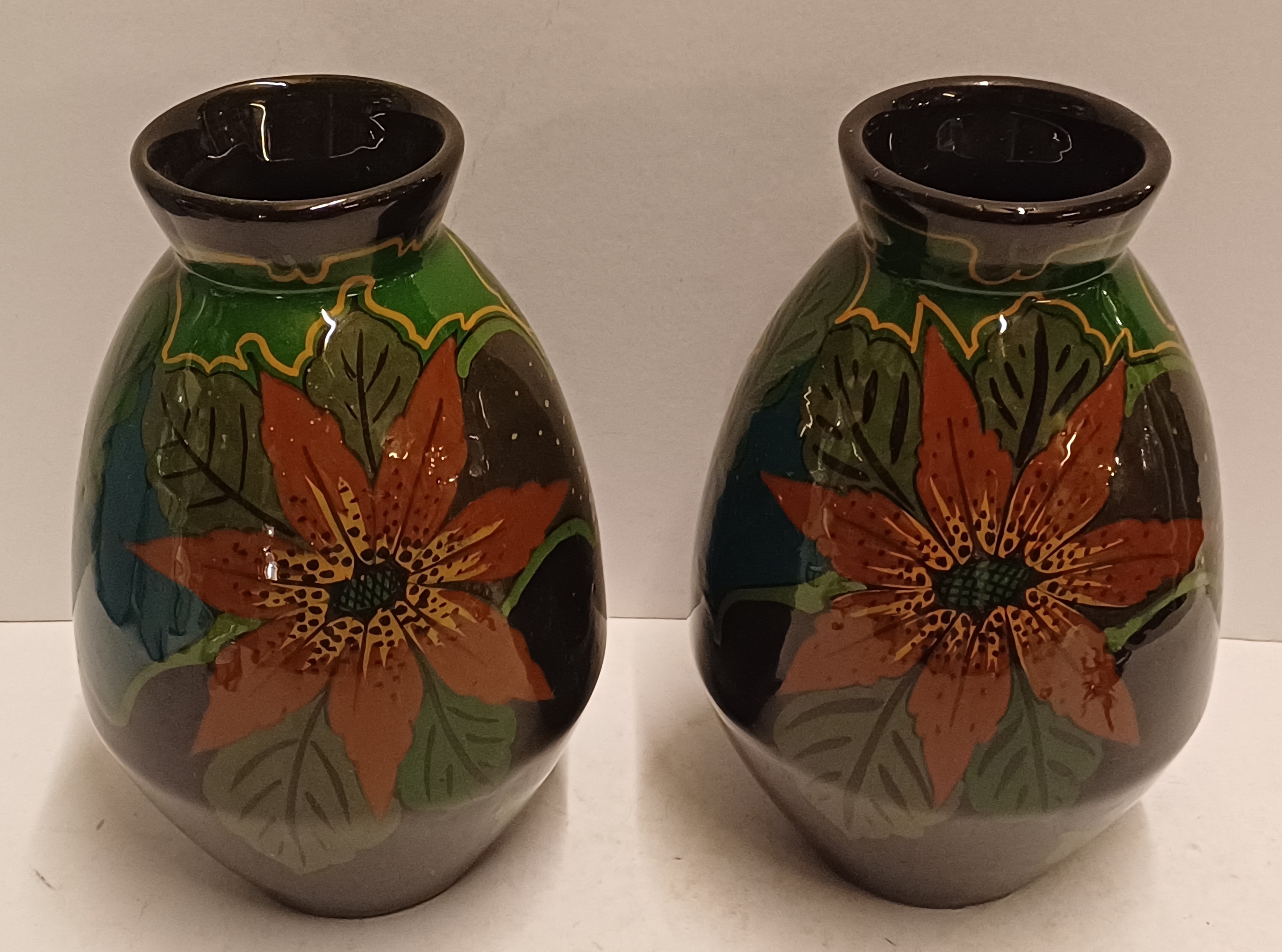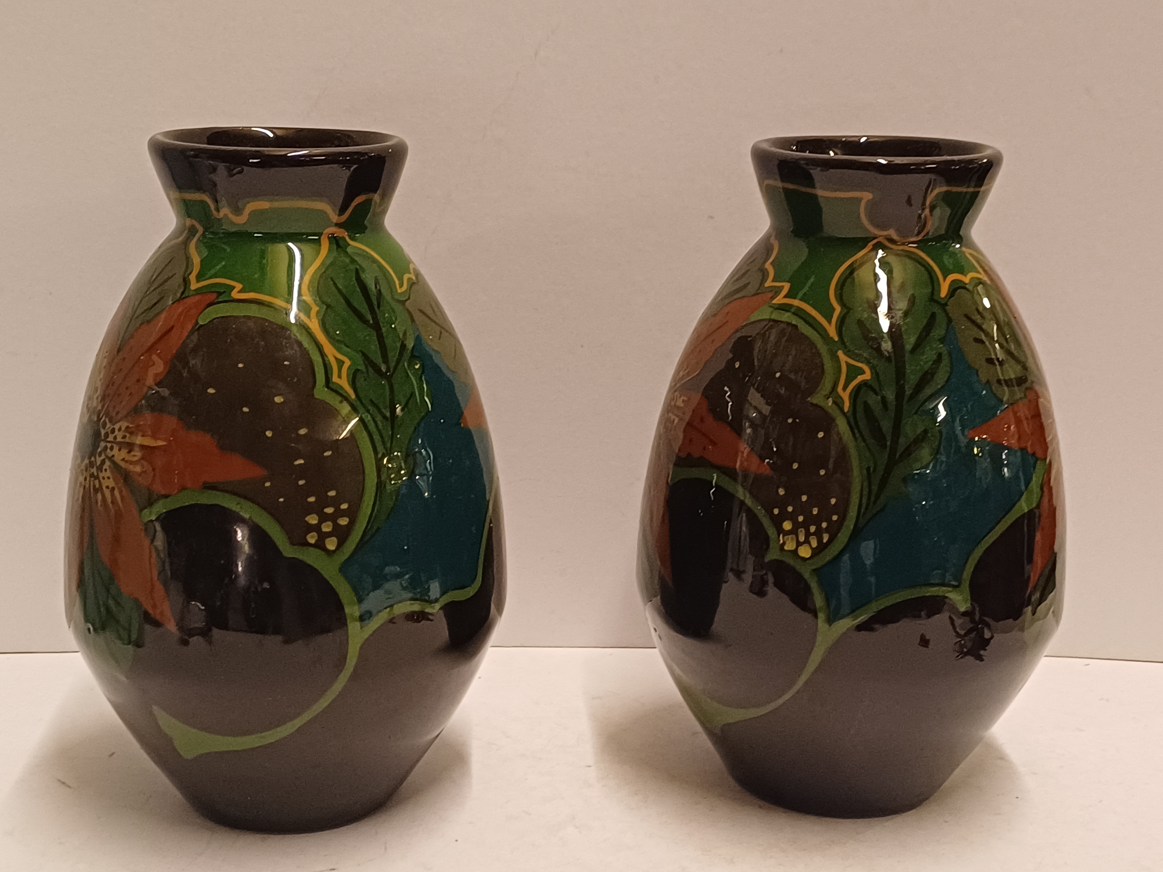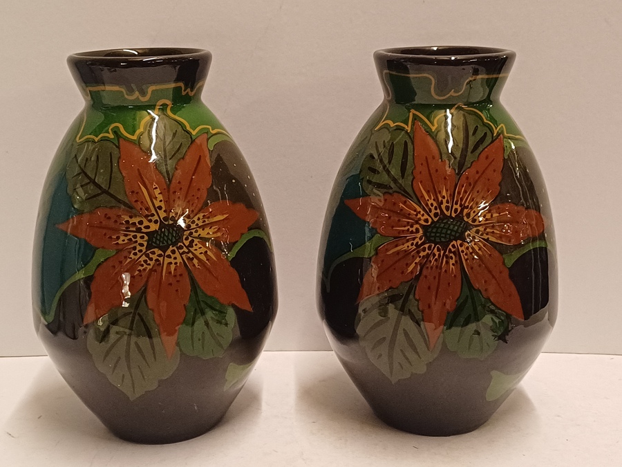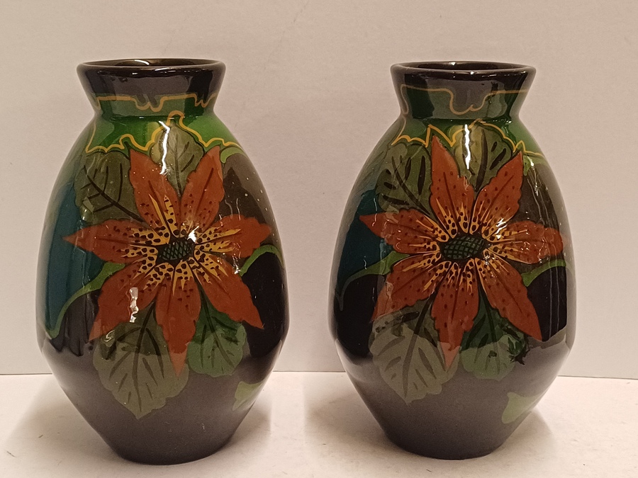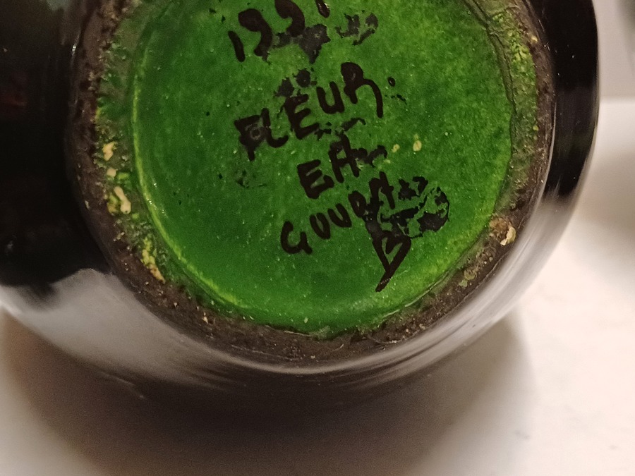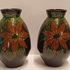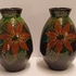 Stel glansplatelen vazen met gestileerd floraal decor Fleur op donker fond. Onderzijde met fabrieksmerk.