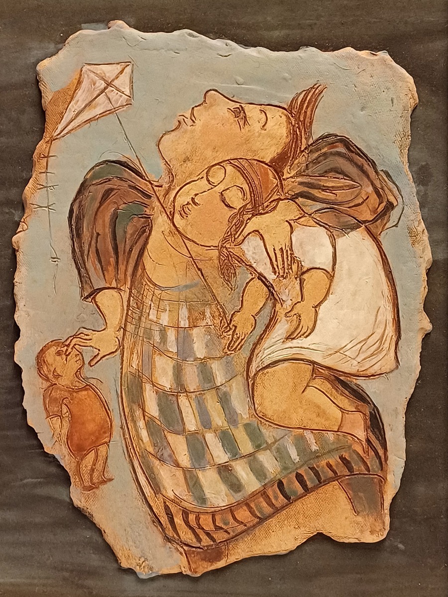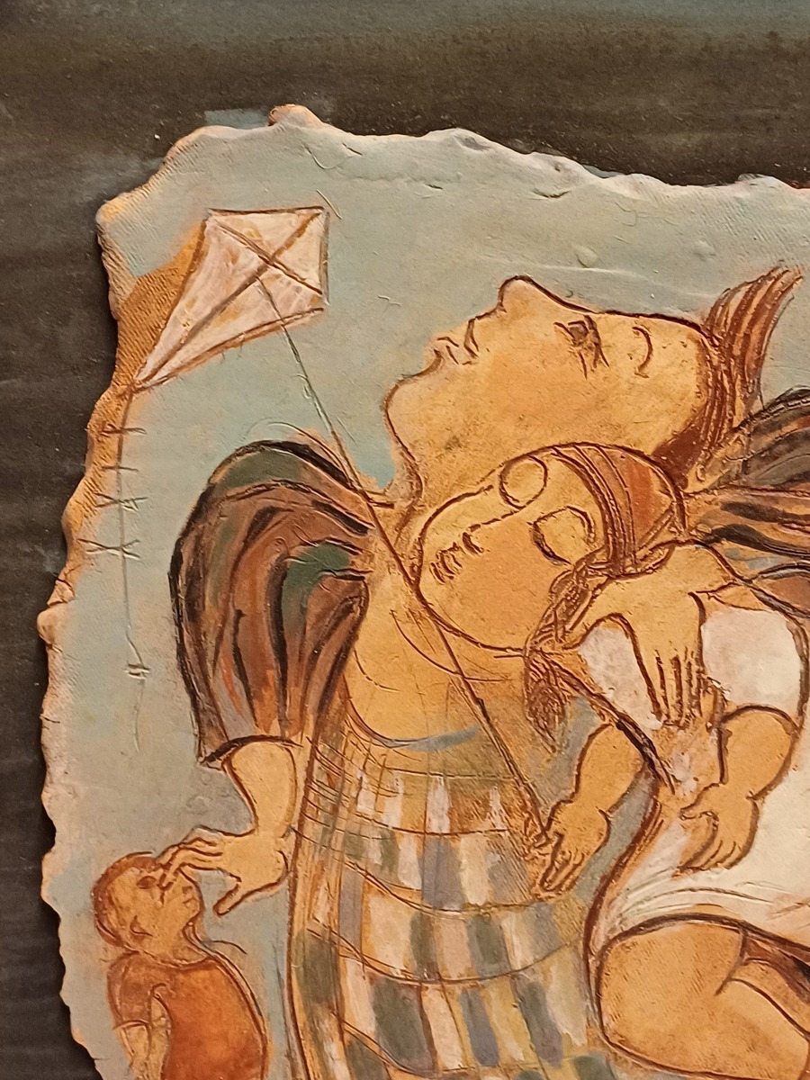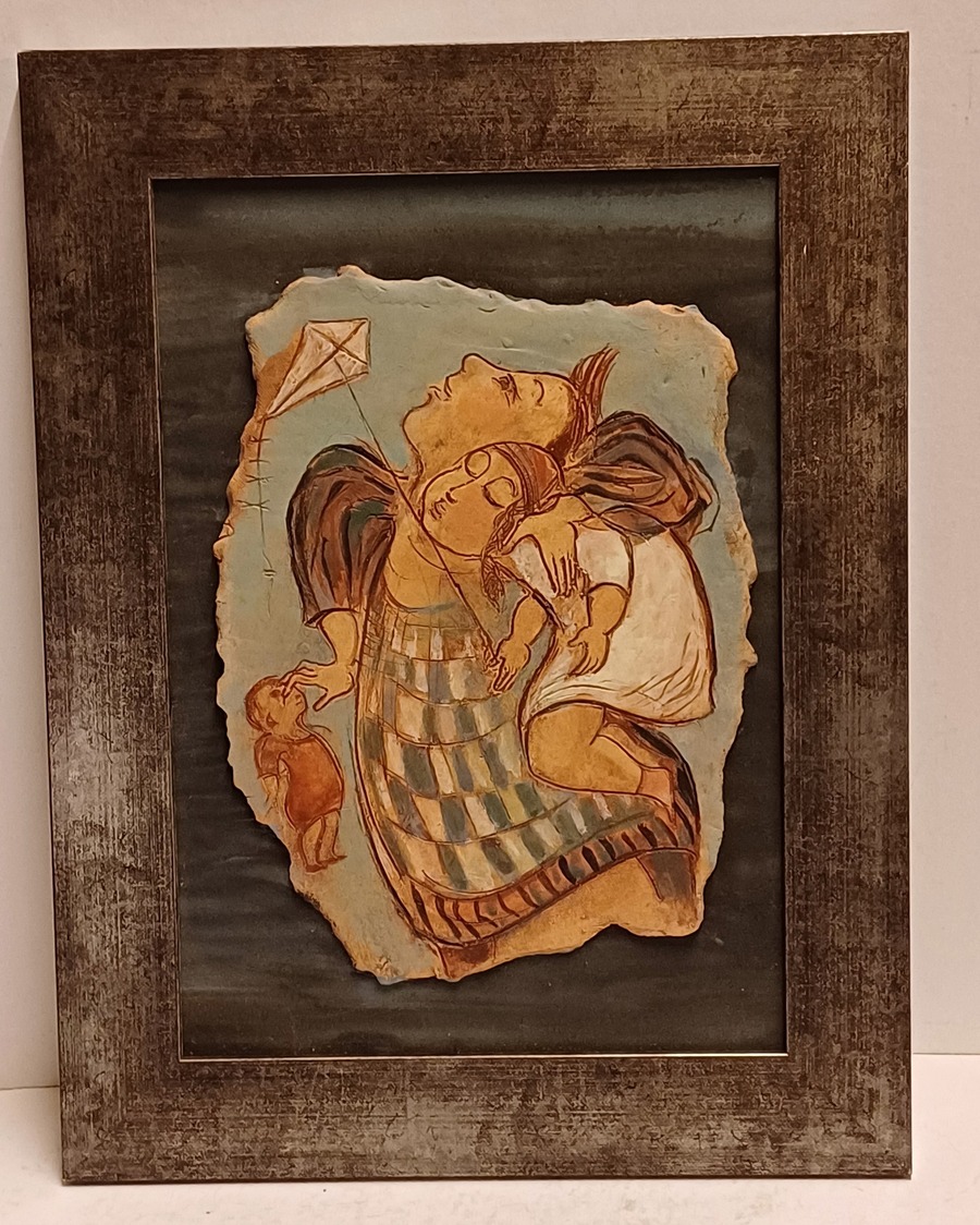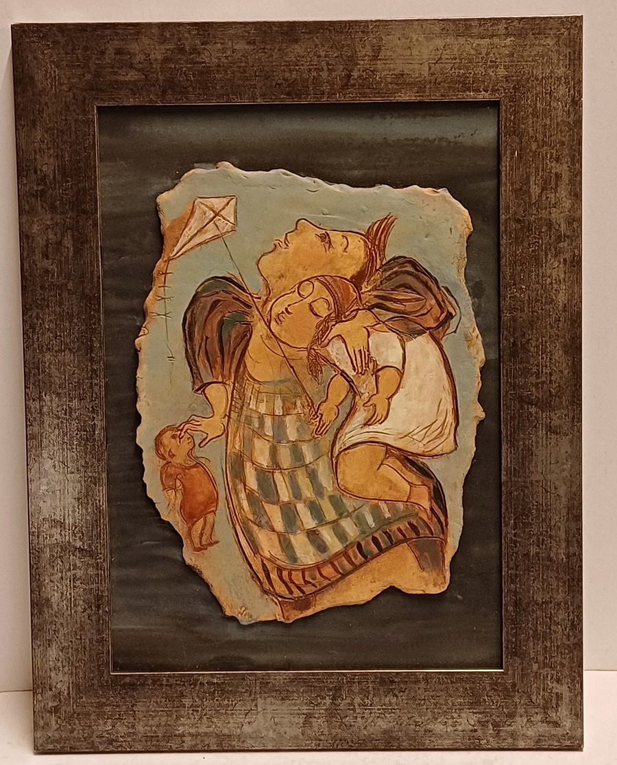 Piastrella in ceramica con rappresentazione policroma di diverse figure con aquilone. Montata su pannello di hardboard e incorniciata. Non firmata.