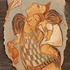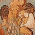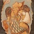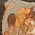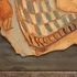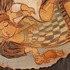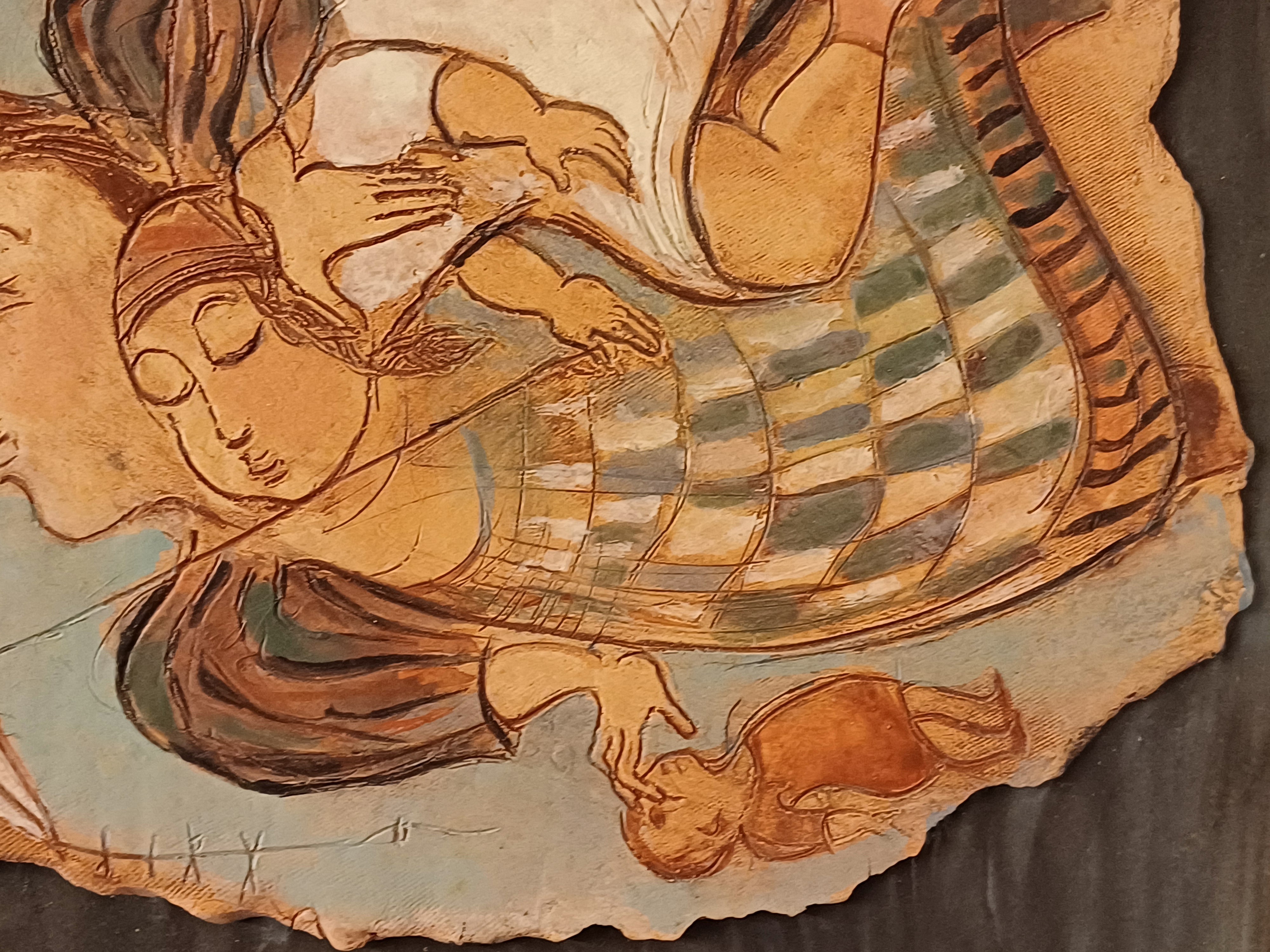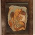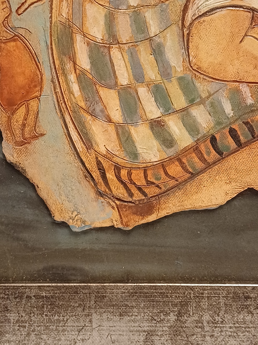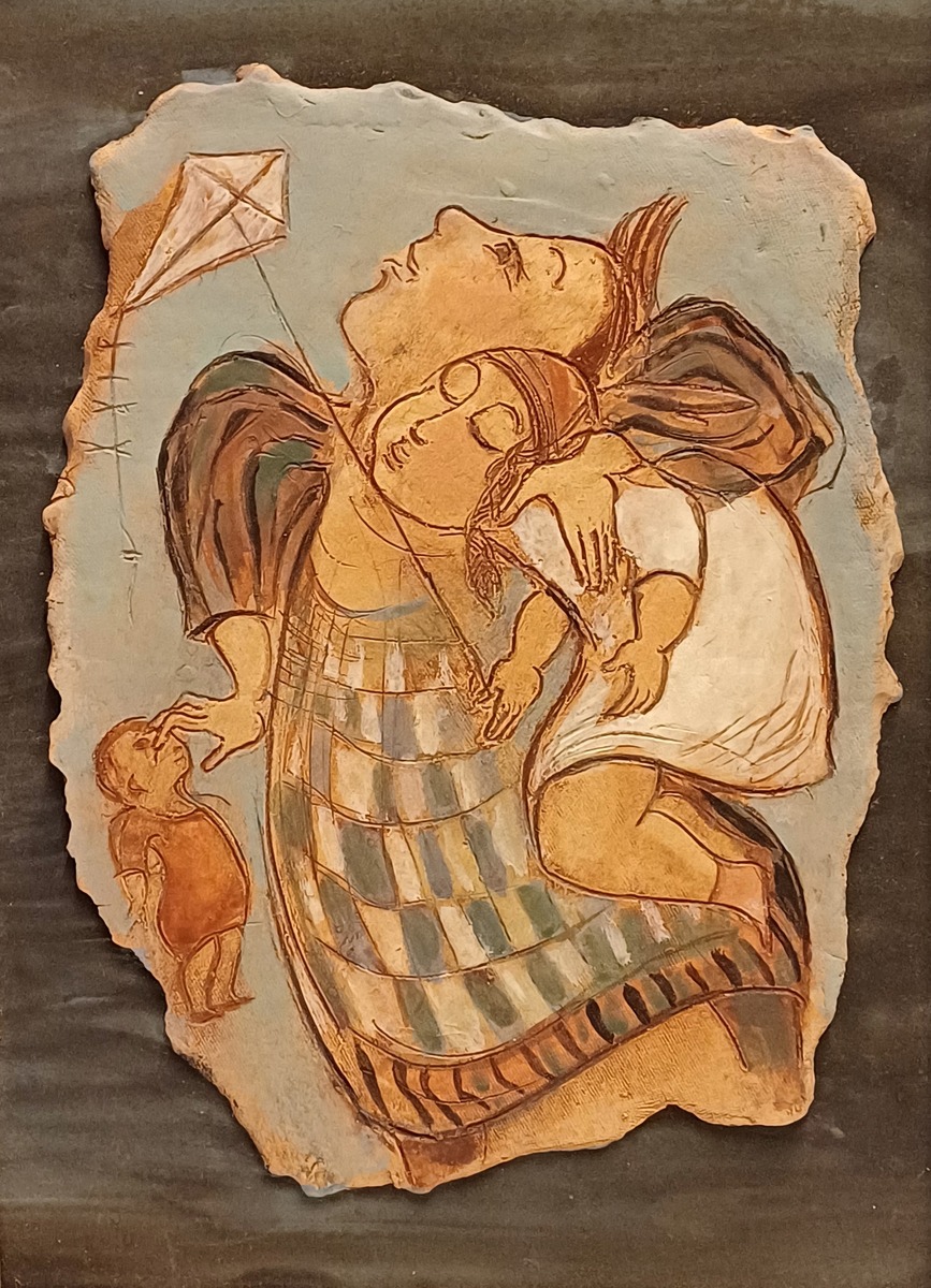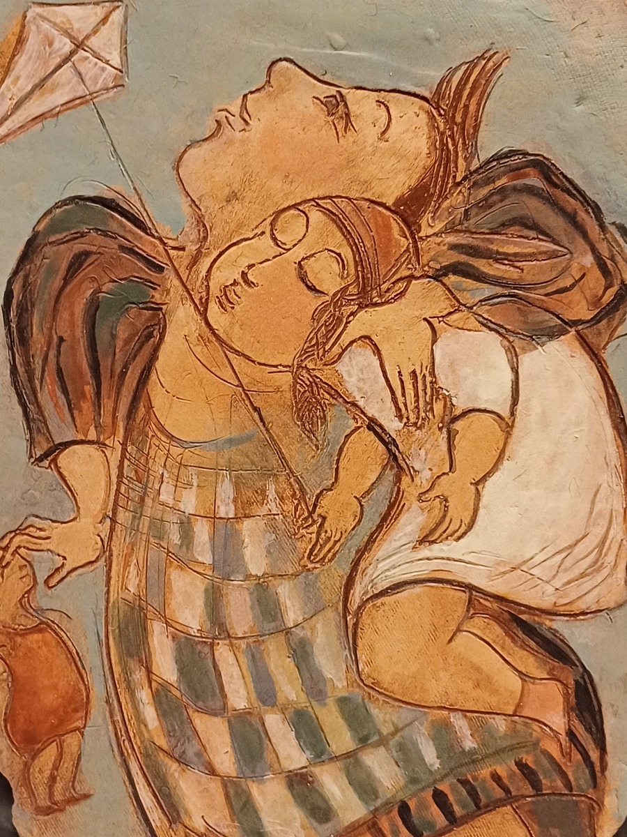 Piastrella in ceramica con rappresentazione policroma di diverse figure con aquilone. Montata su pannello di hardboard e incorniciata. Non firmata.