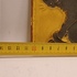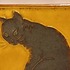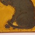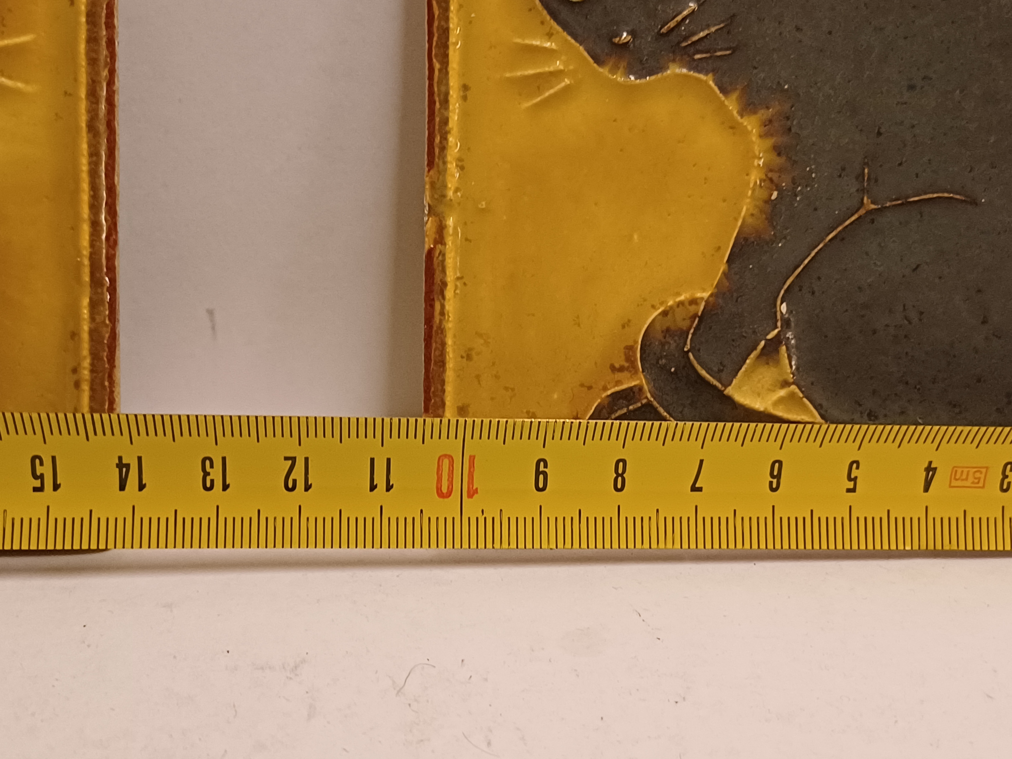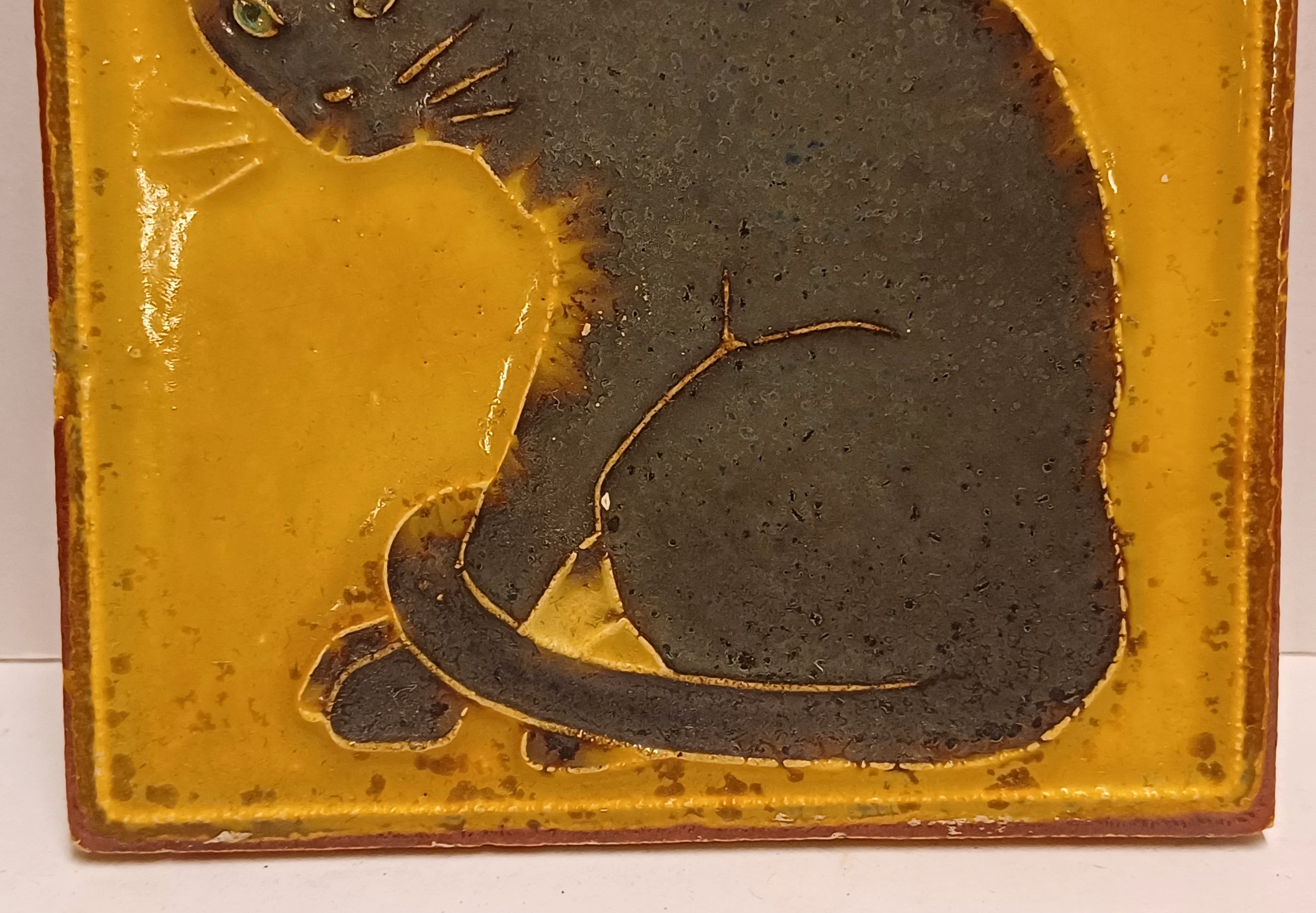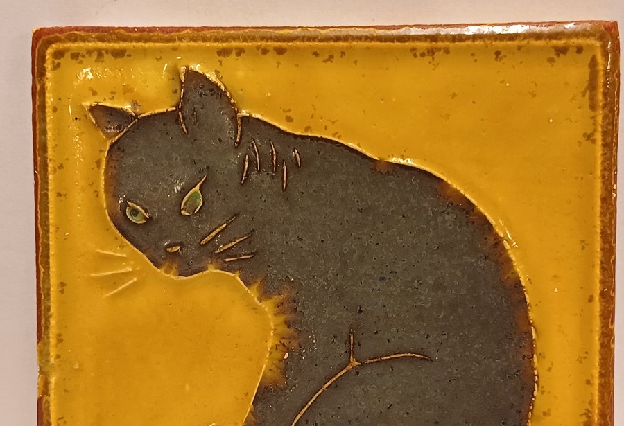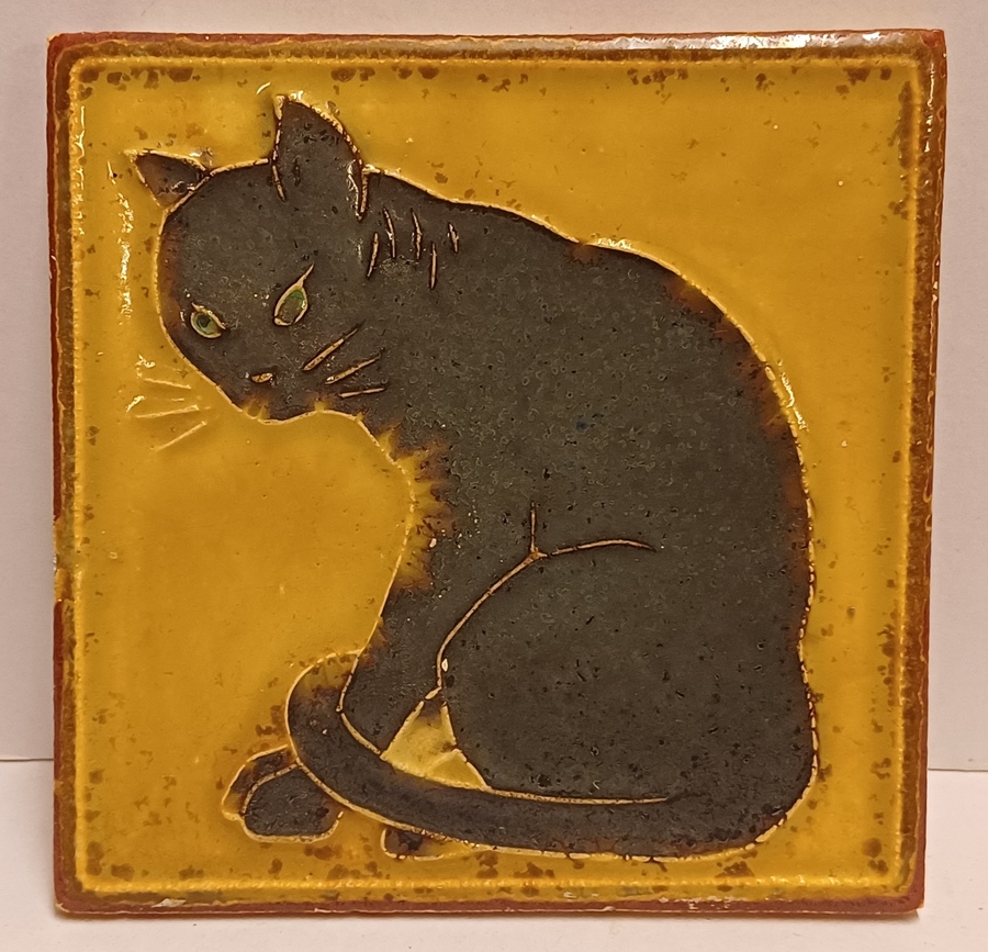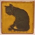 Piastrella muraria cloisonné raffigurante un gatto seduto su sfondo ocra e bordo marrone stretto. Non firmata.