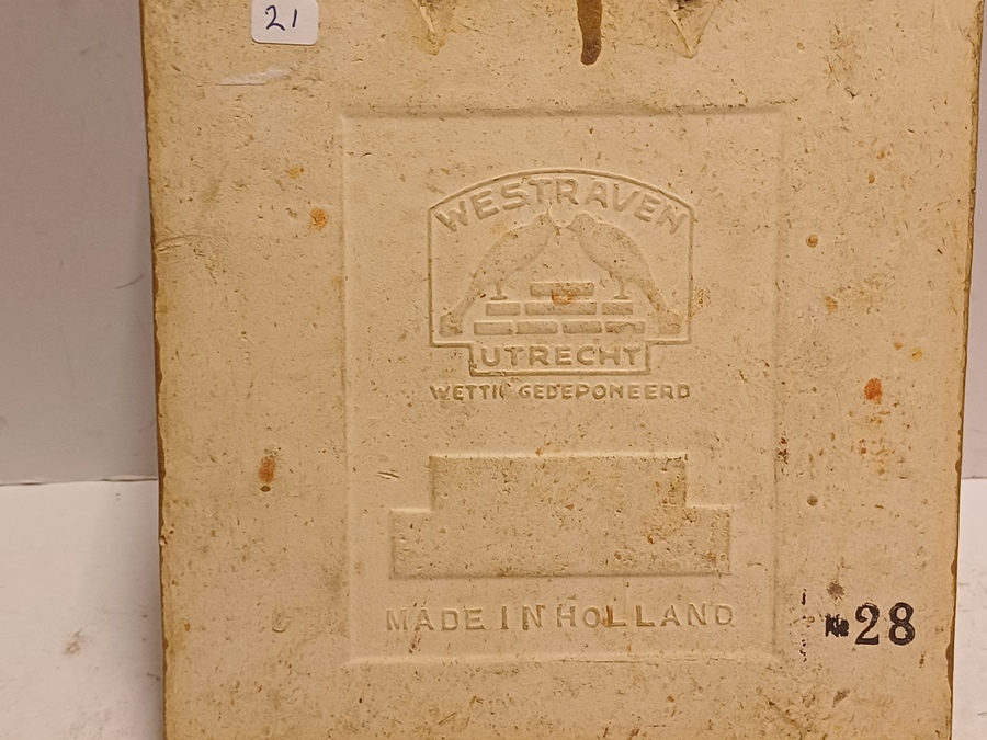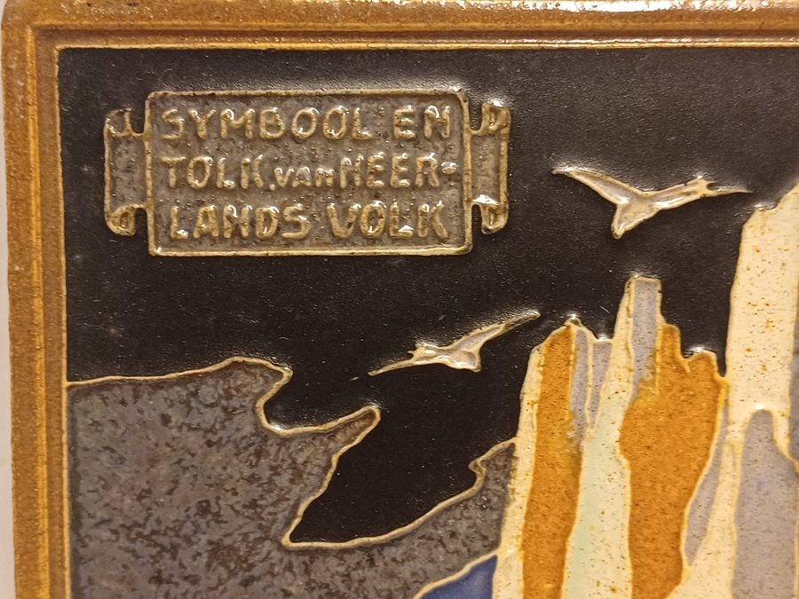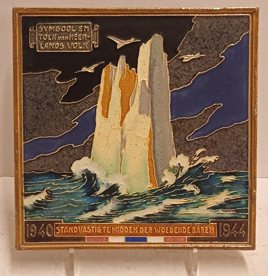 Afbeelding van een rots in zee. en de tekst. "Symbool en tolk van Neerlands volk- Standvastig te midden der woedende baren 1940-1945". Achterzijde met fabrieksmerk.