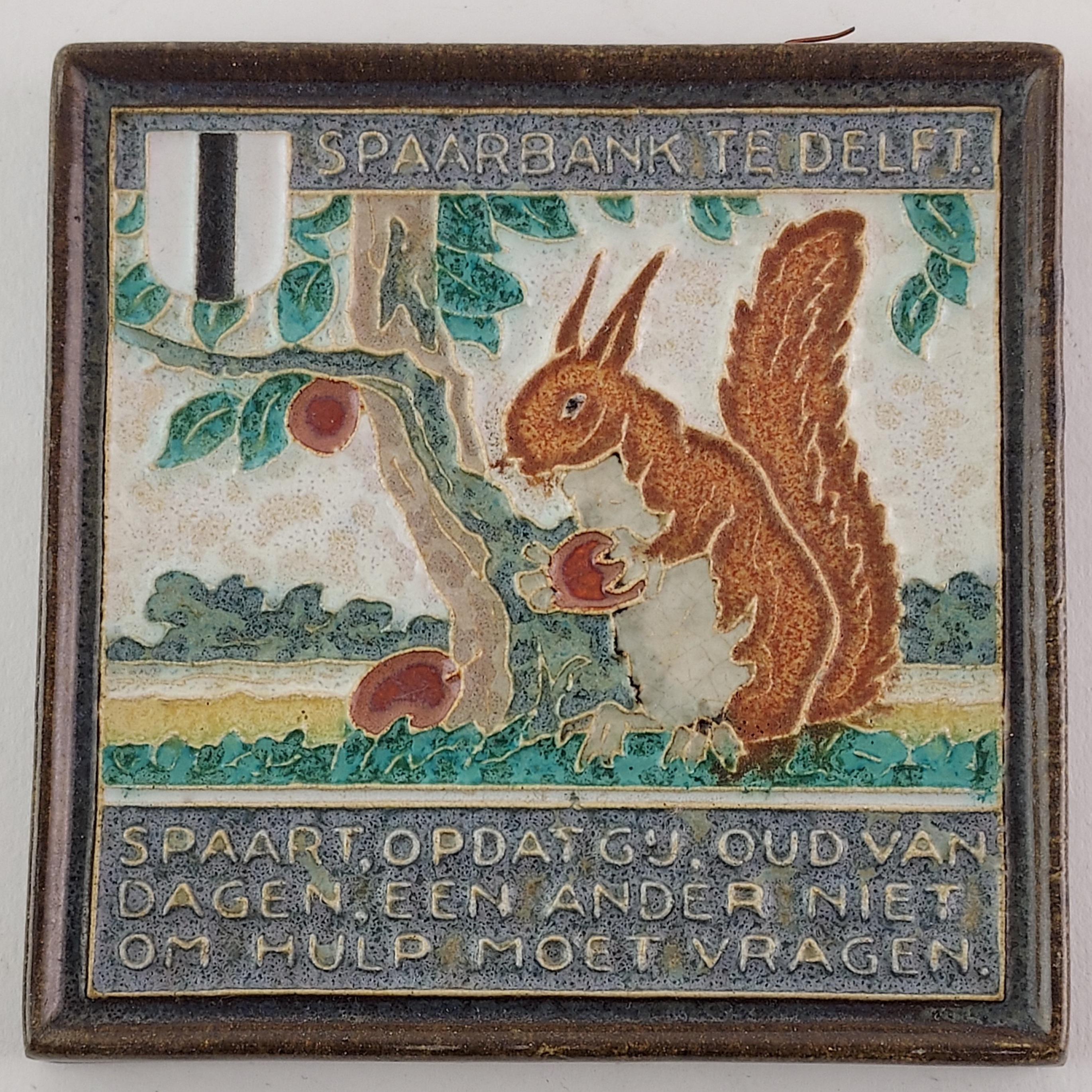 Raffigurazione di uno scoiattolo vicino a un albero, con il testo "Spaart opdat gij een ander niet om hulp moet vragen".