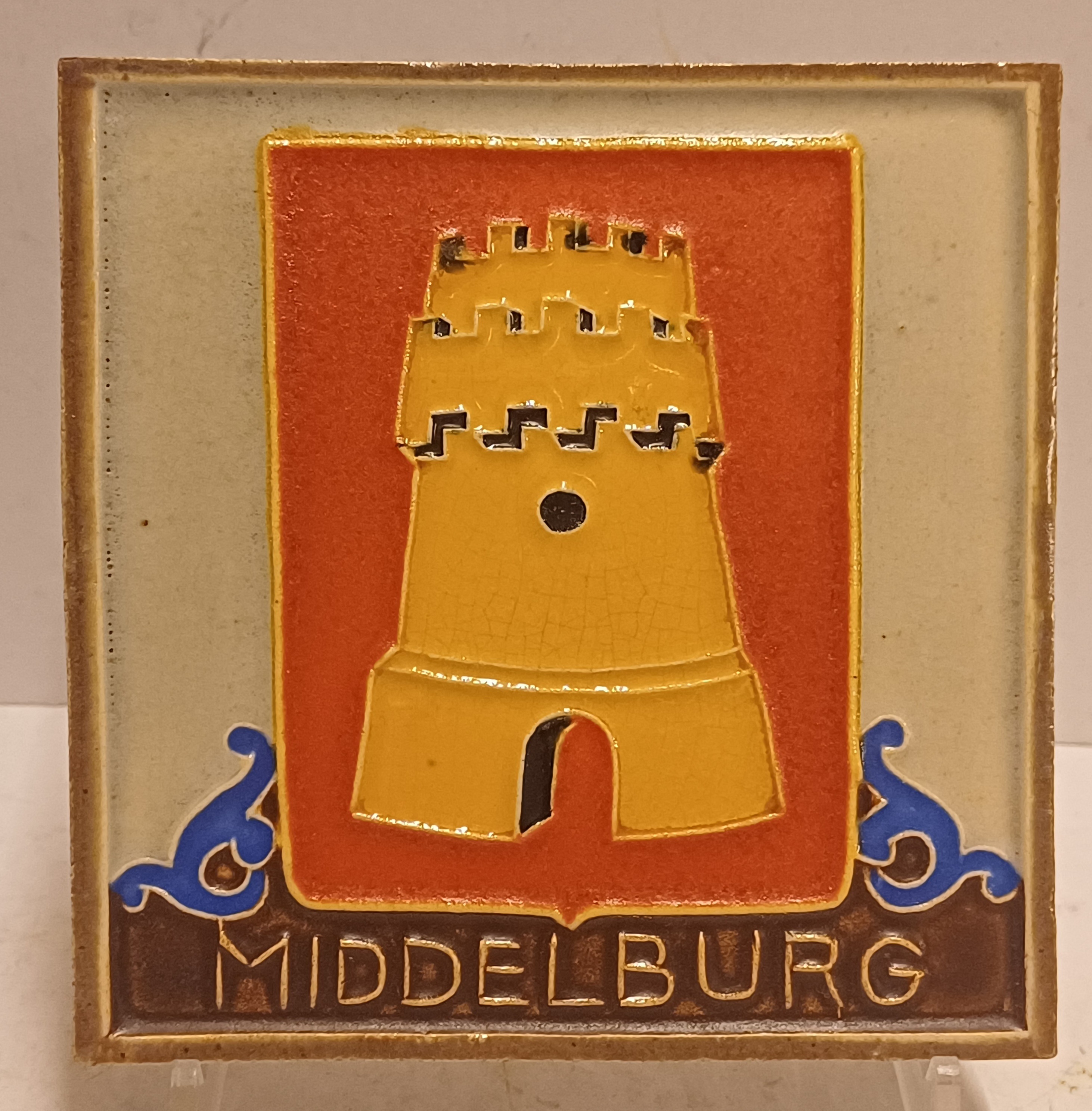 Aardewerken cloisonne tegel met het wapenschild van de stad Middelburg. Achterzijde met fabrieksmerk.