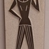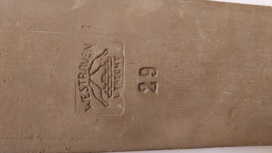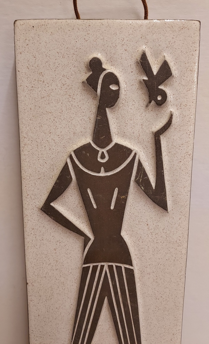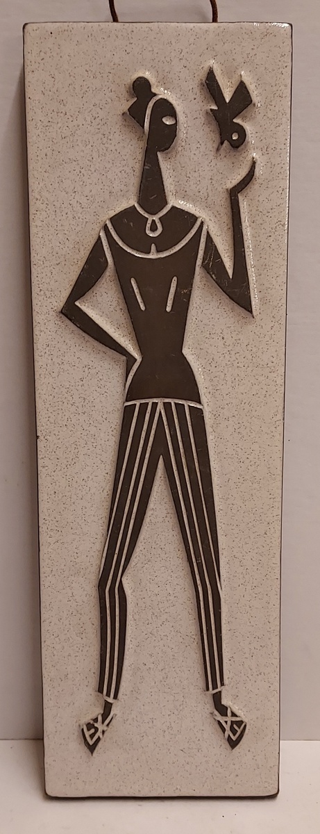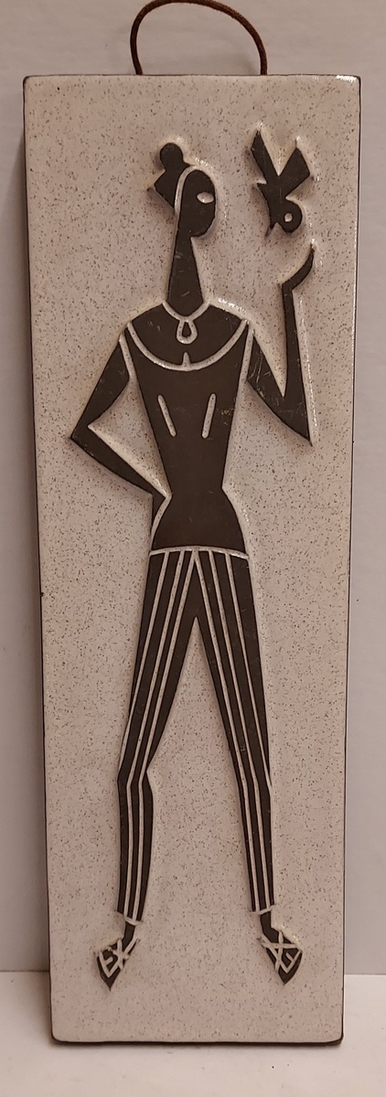 Piastrella Chanoir con rappresentazione di figura allungata con uccello. Design di Leendert Blok. Retro con marchio di fabbrica.