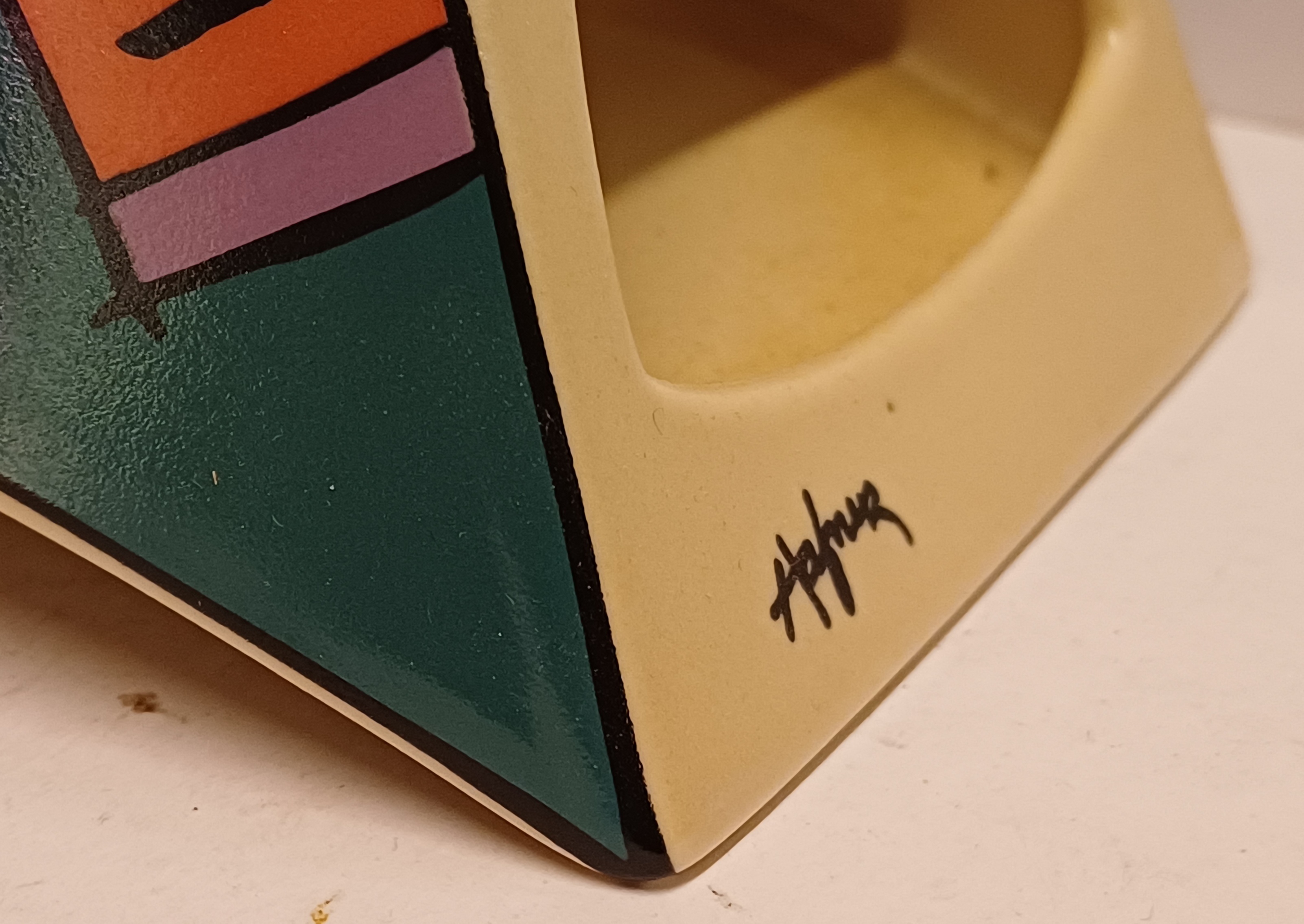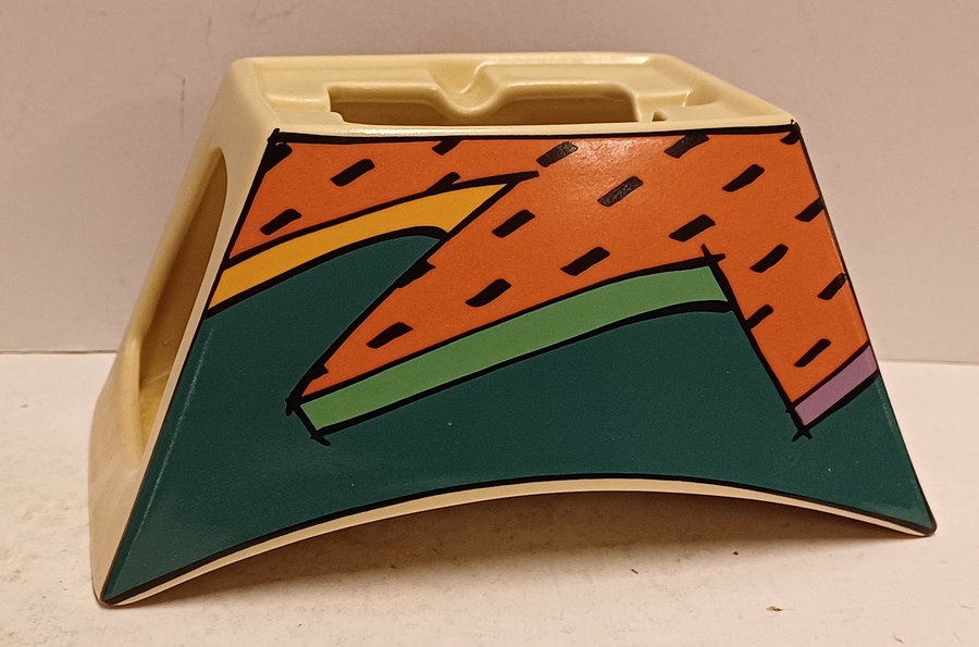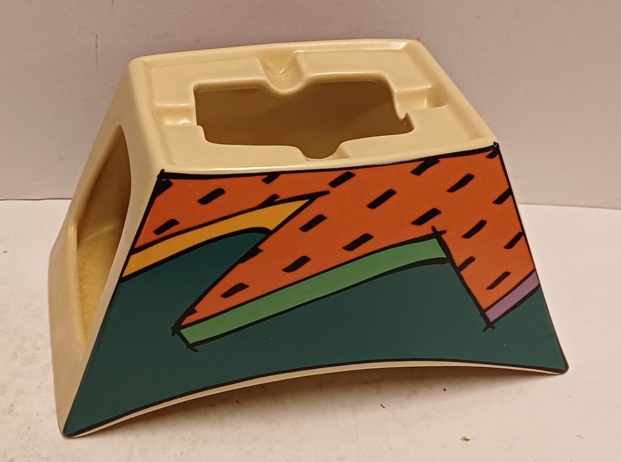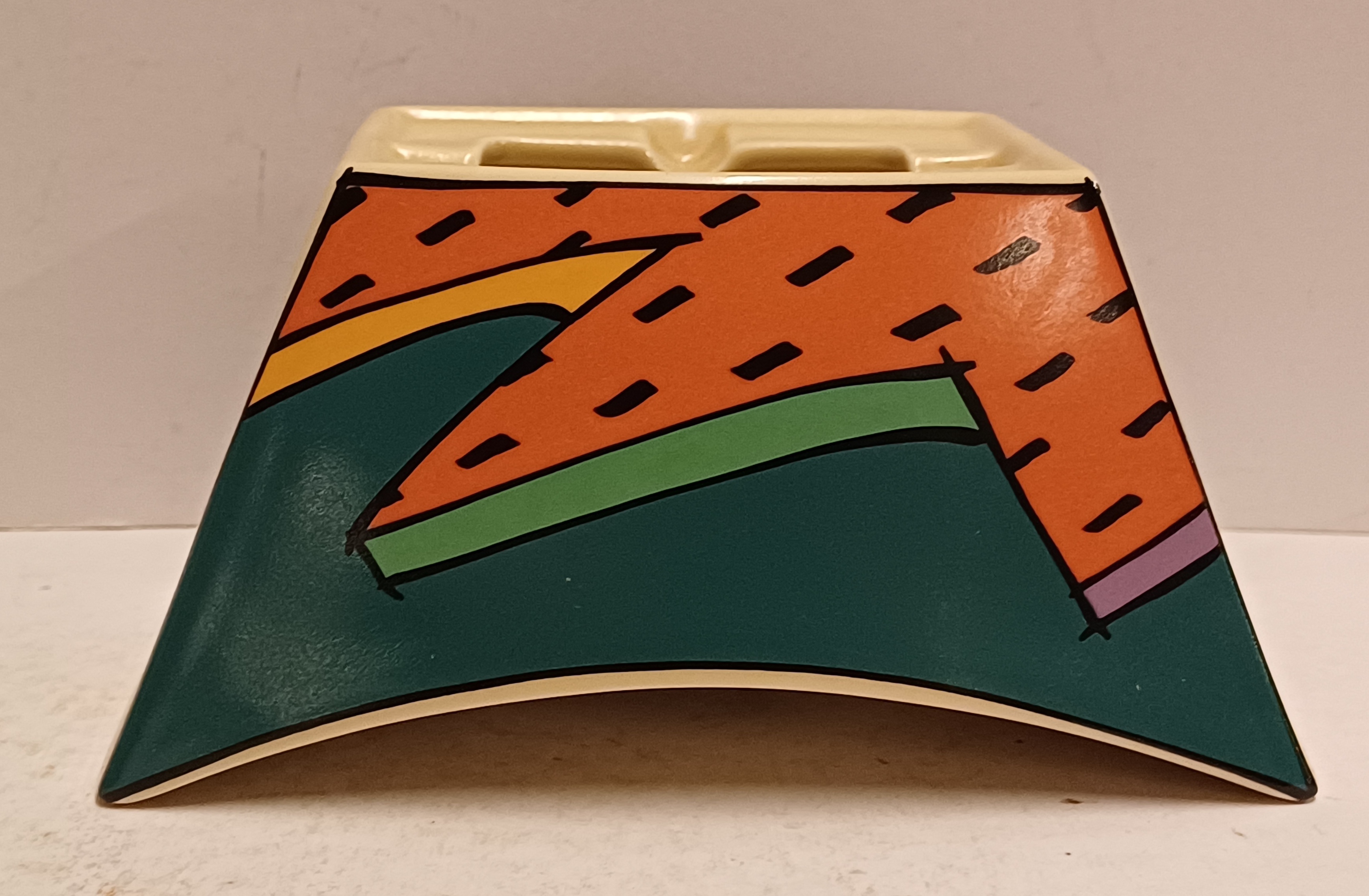Portacandele in ceramica con decoro policromo Memphis Flash. Design di Dorothy Hafner, realizzato da Rosenthal Studio Line.