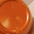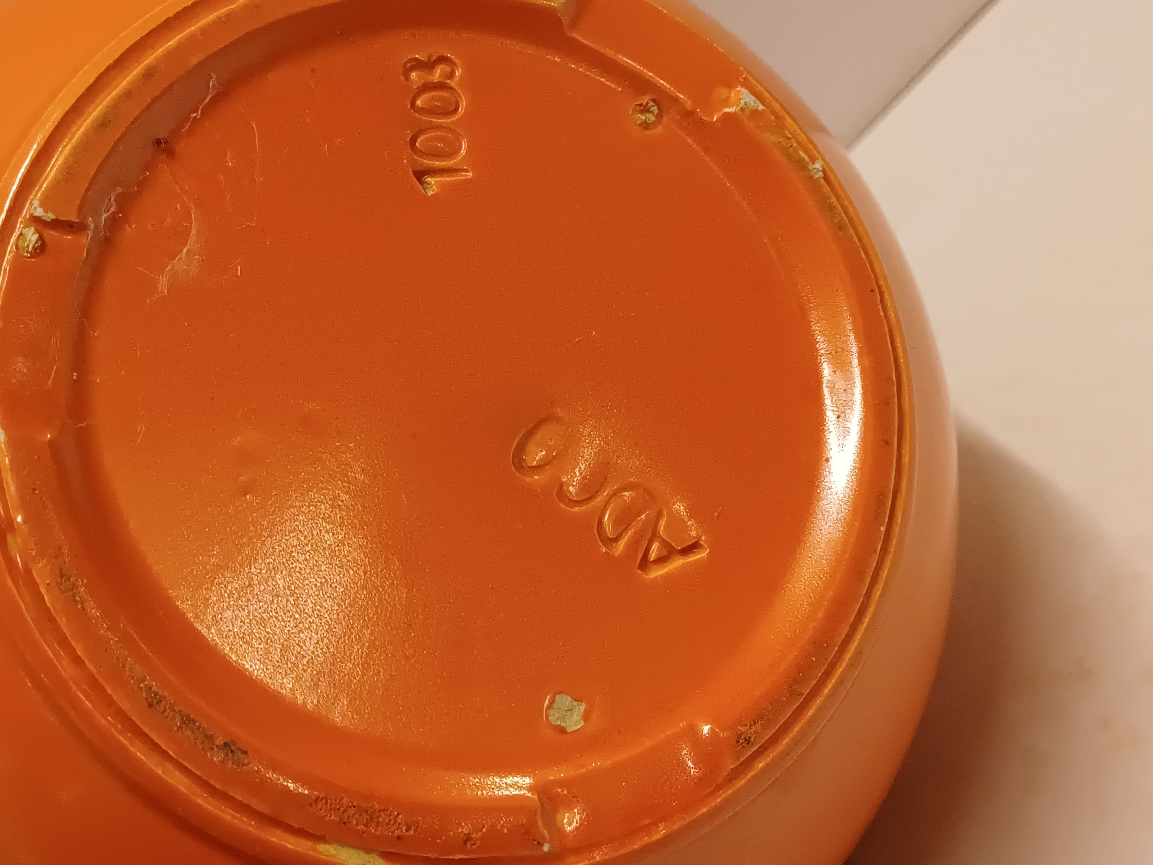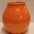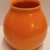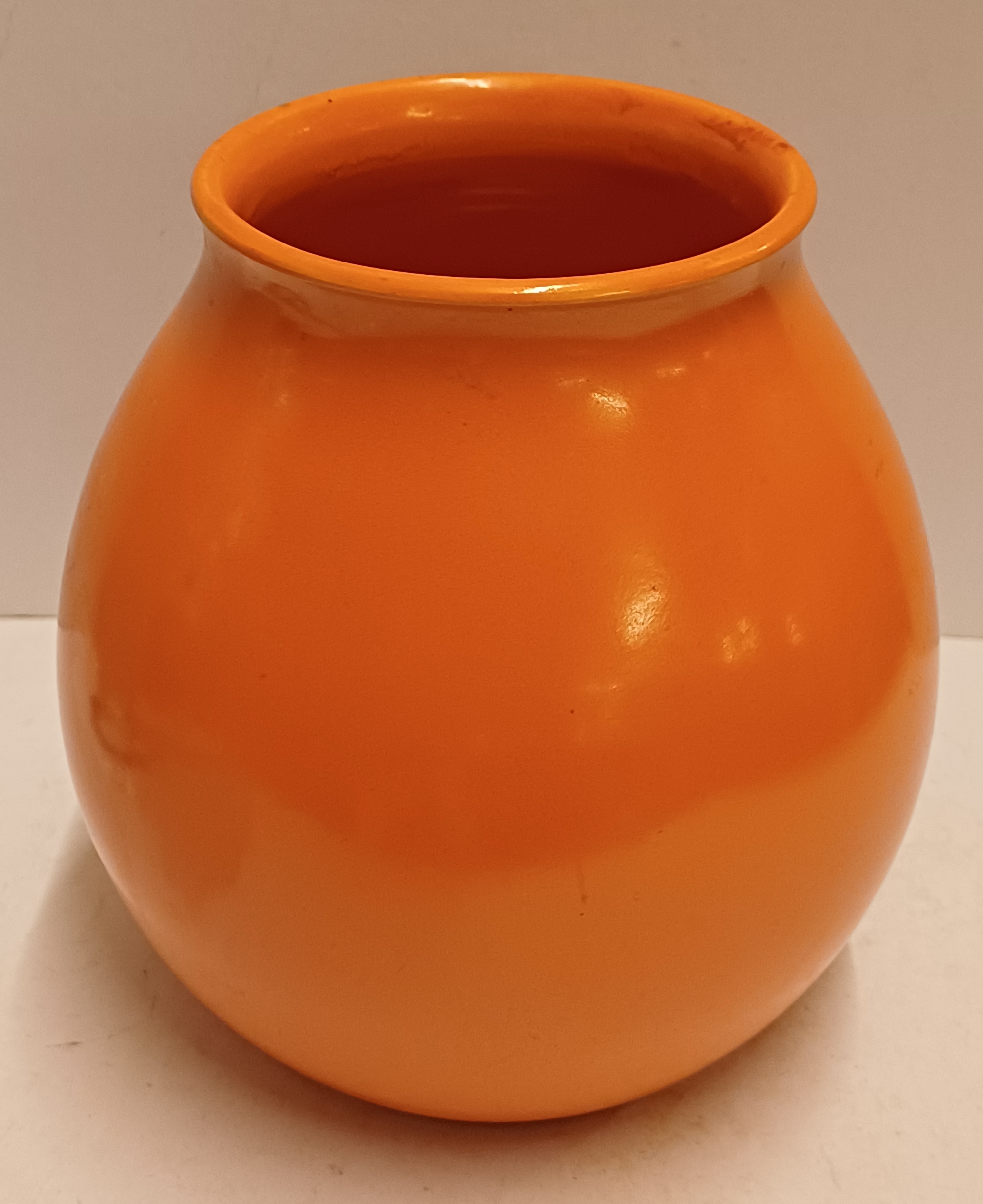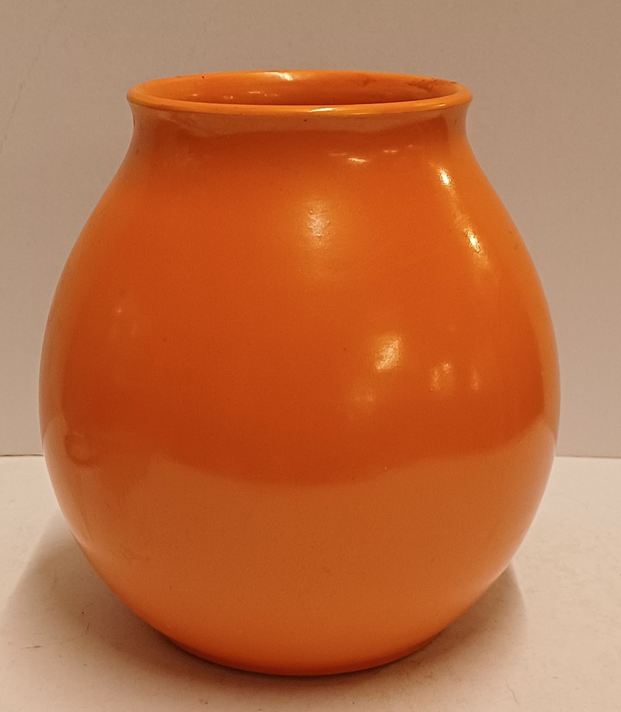 Aardewerken bolle vaas met oranje glazuur. Onderzijde met fabrieksmerk.