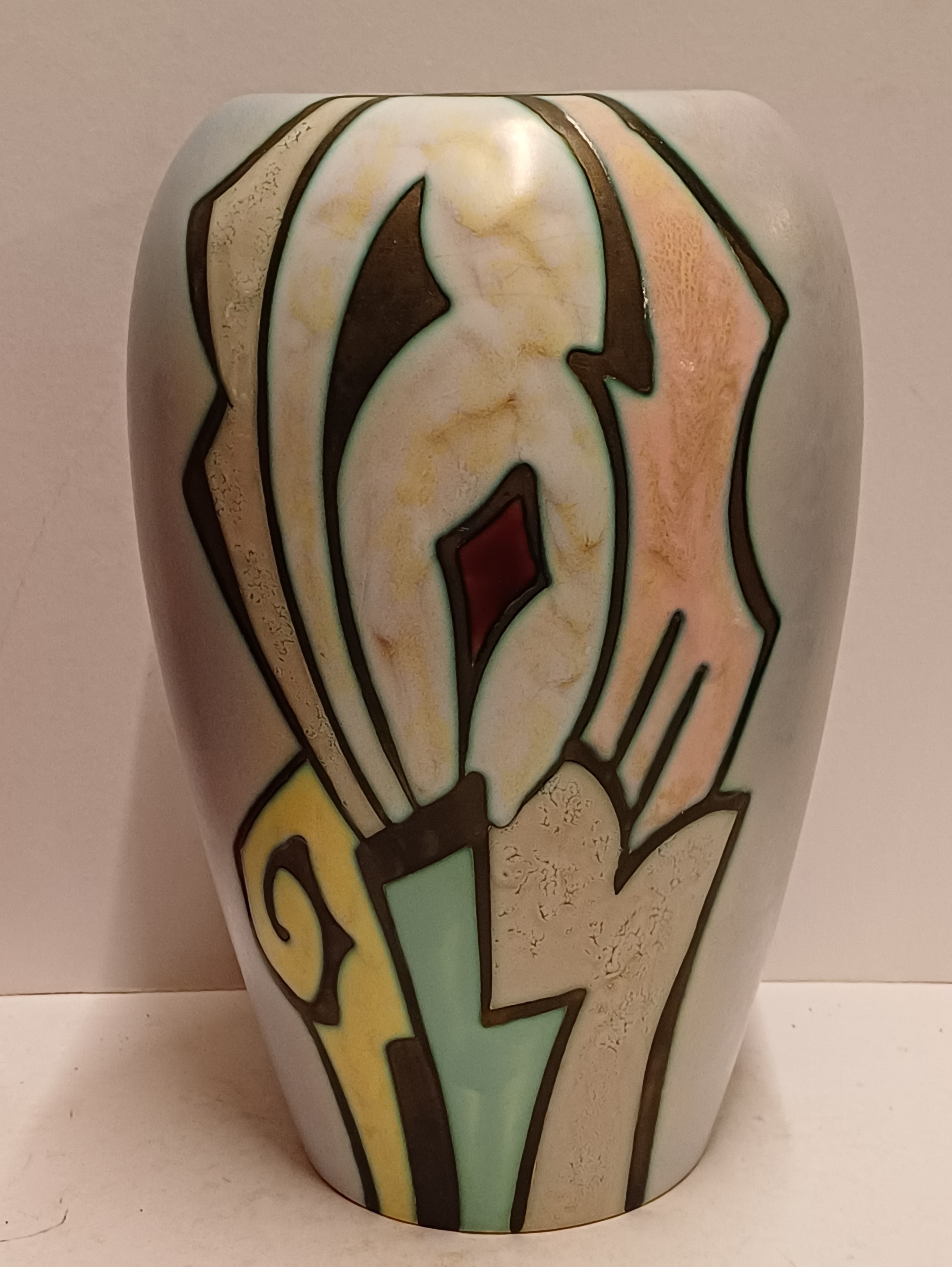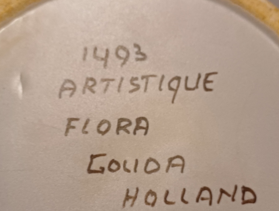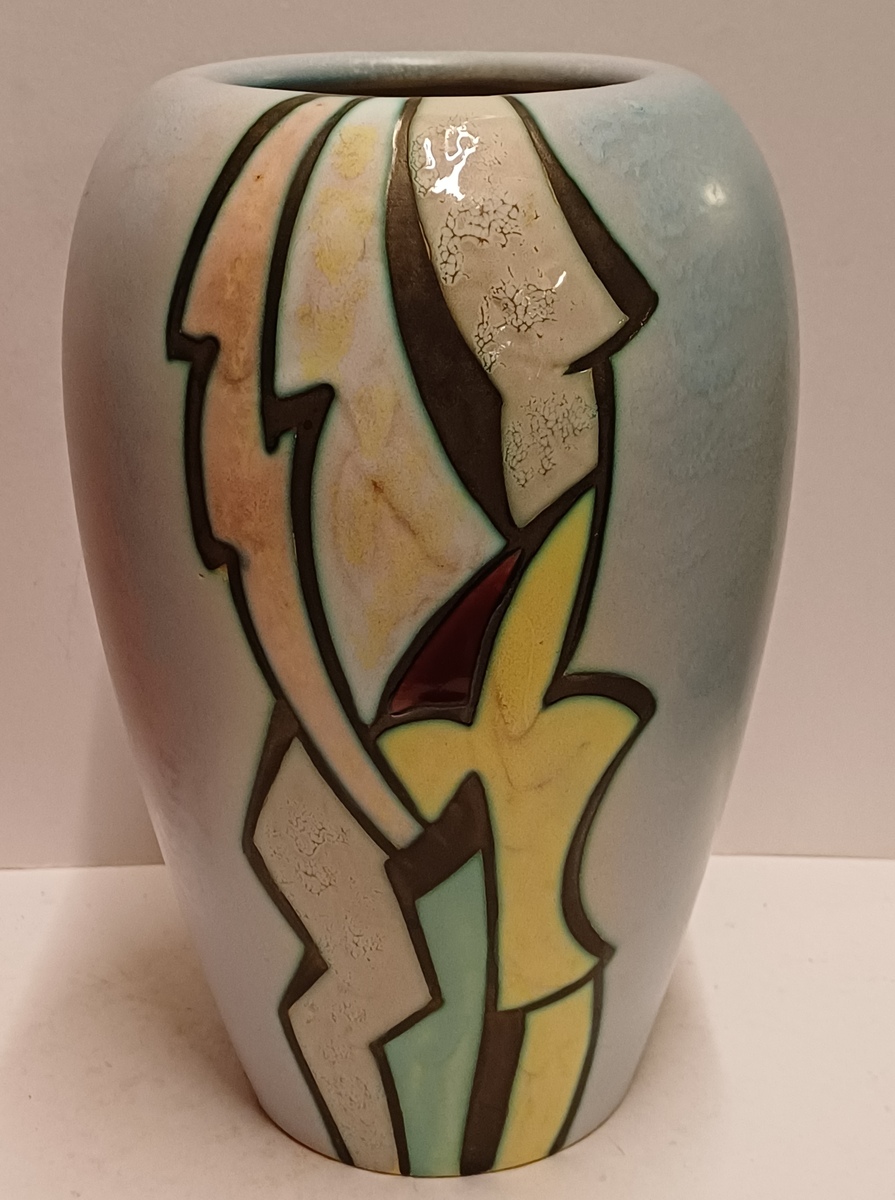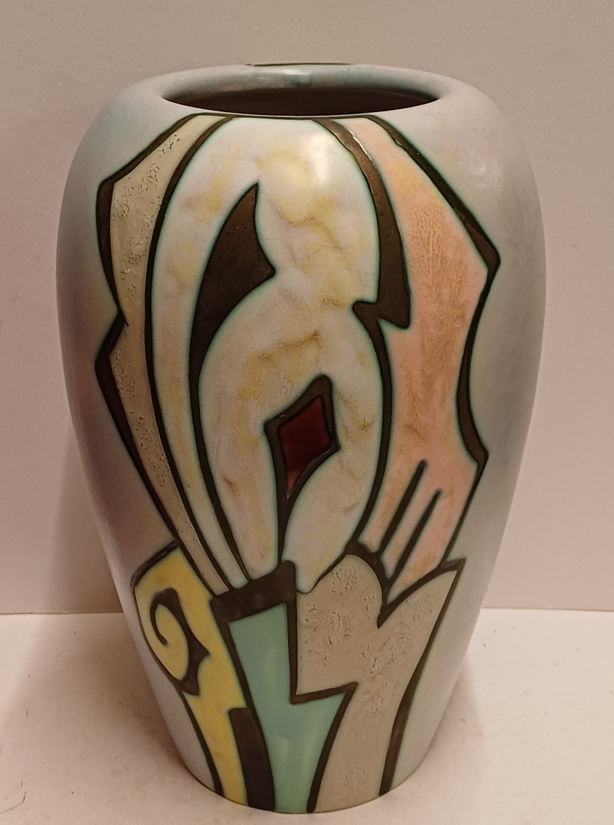 Platelen vaas met decor artistique. Onderzijde met fabrieksmerk en modelnummer.