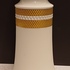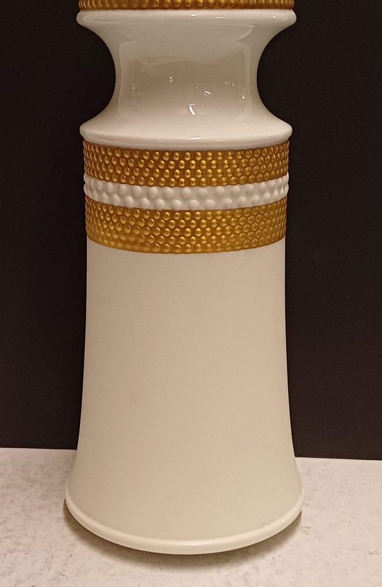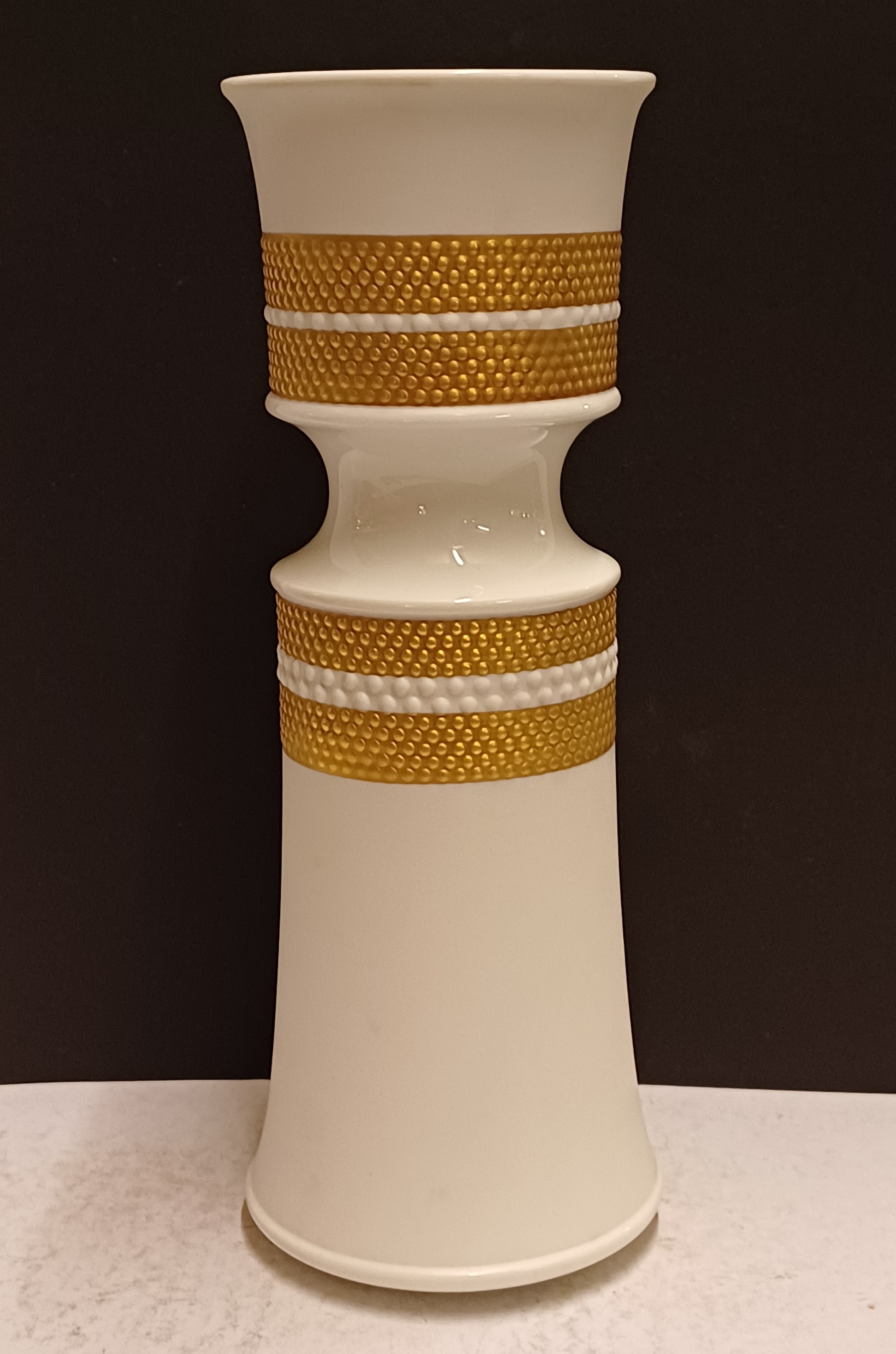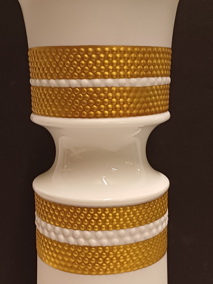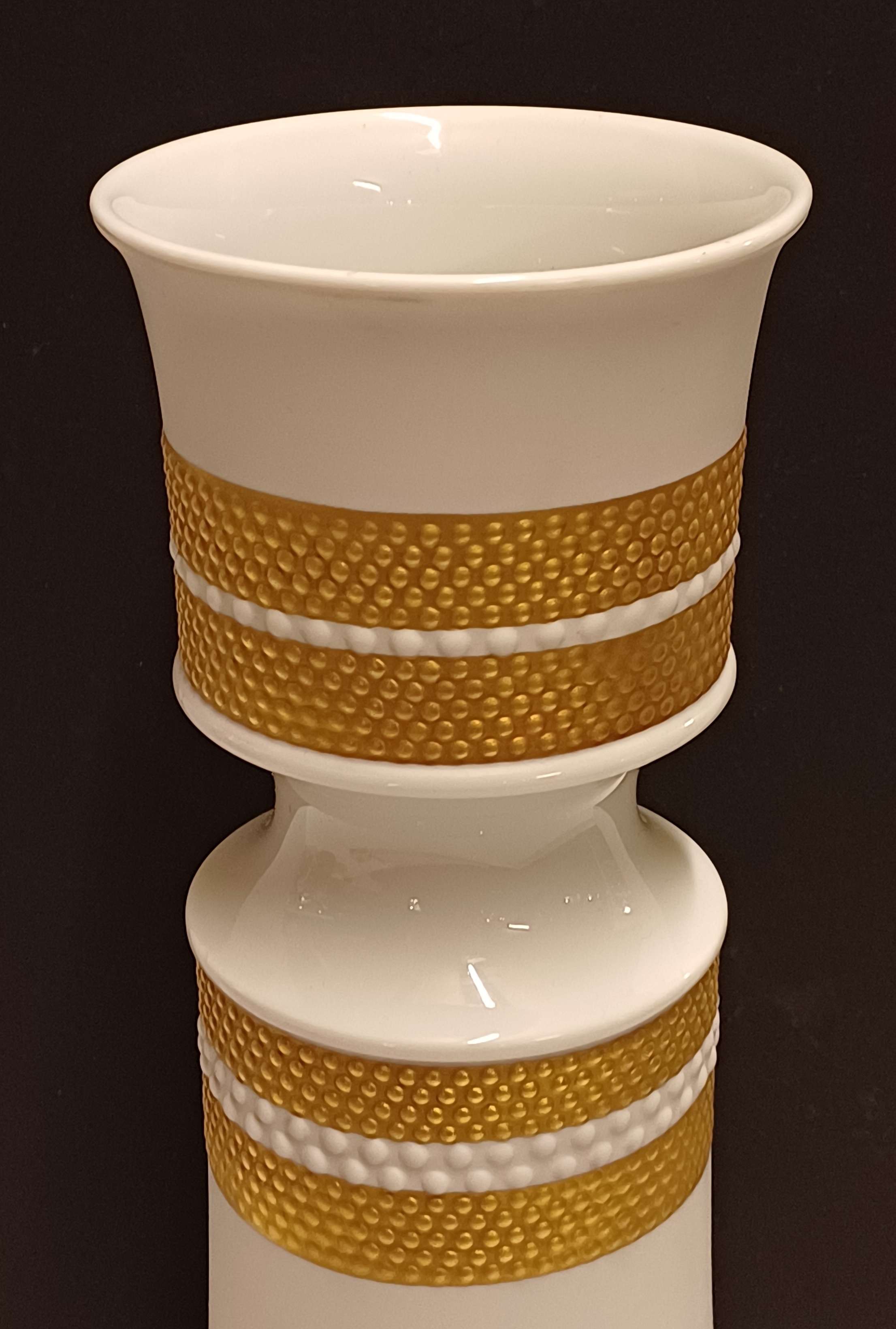 Wit porseleinen vaas met deels gematteerde en gouden banen met stippen decoratie. Onderzijde met fabrieksmerk.