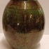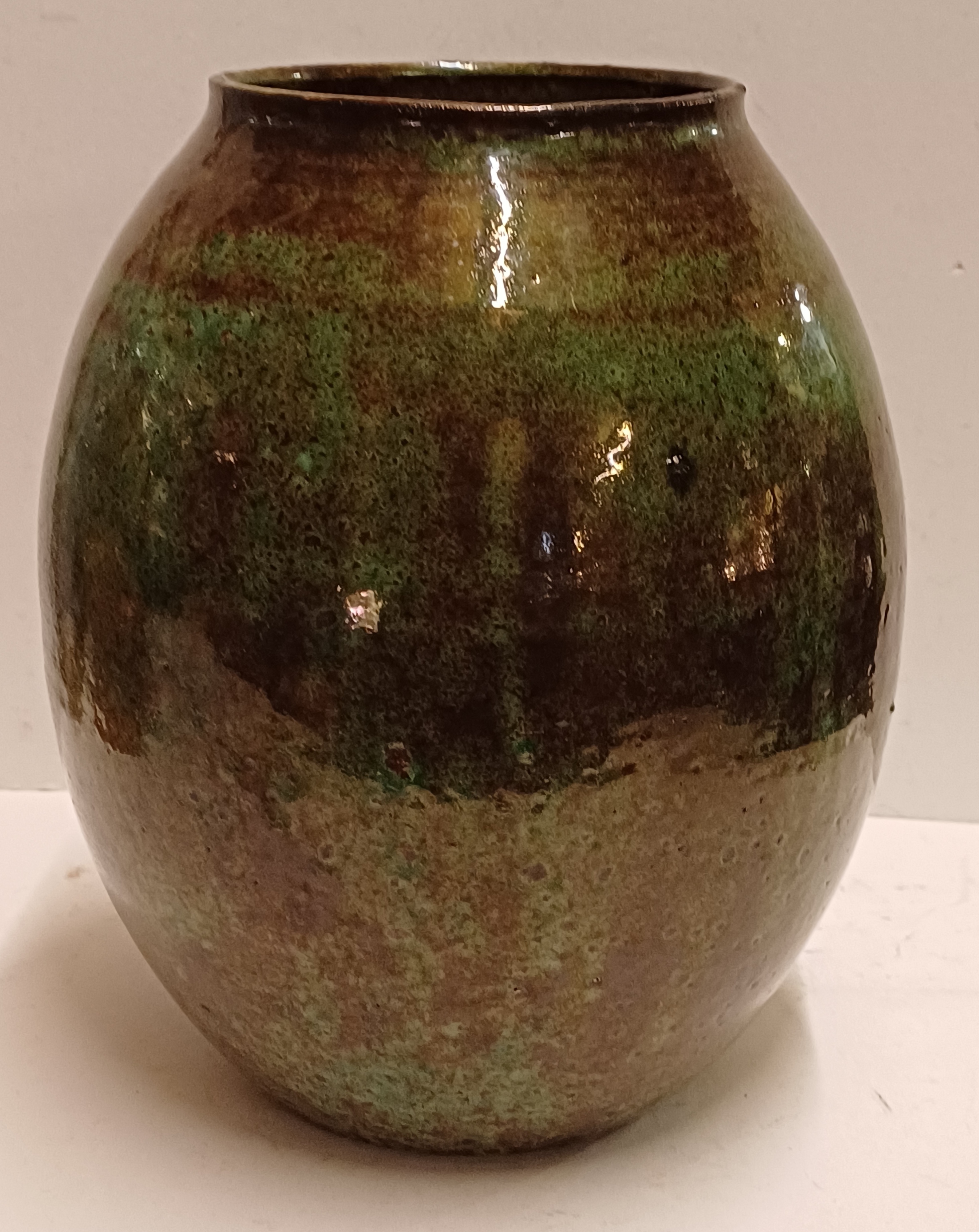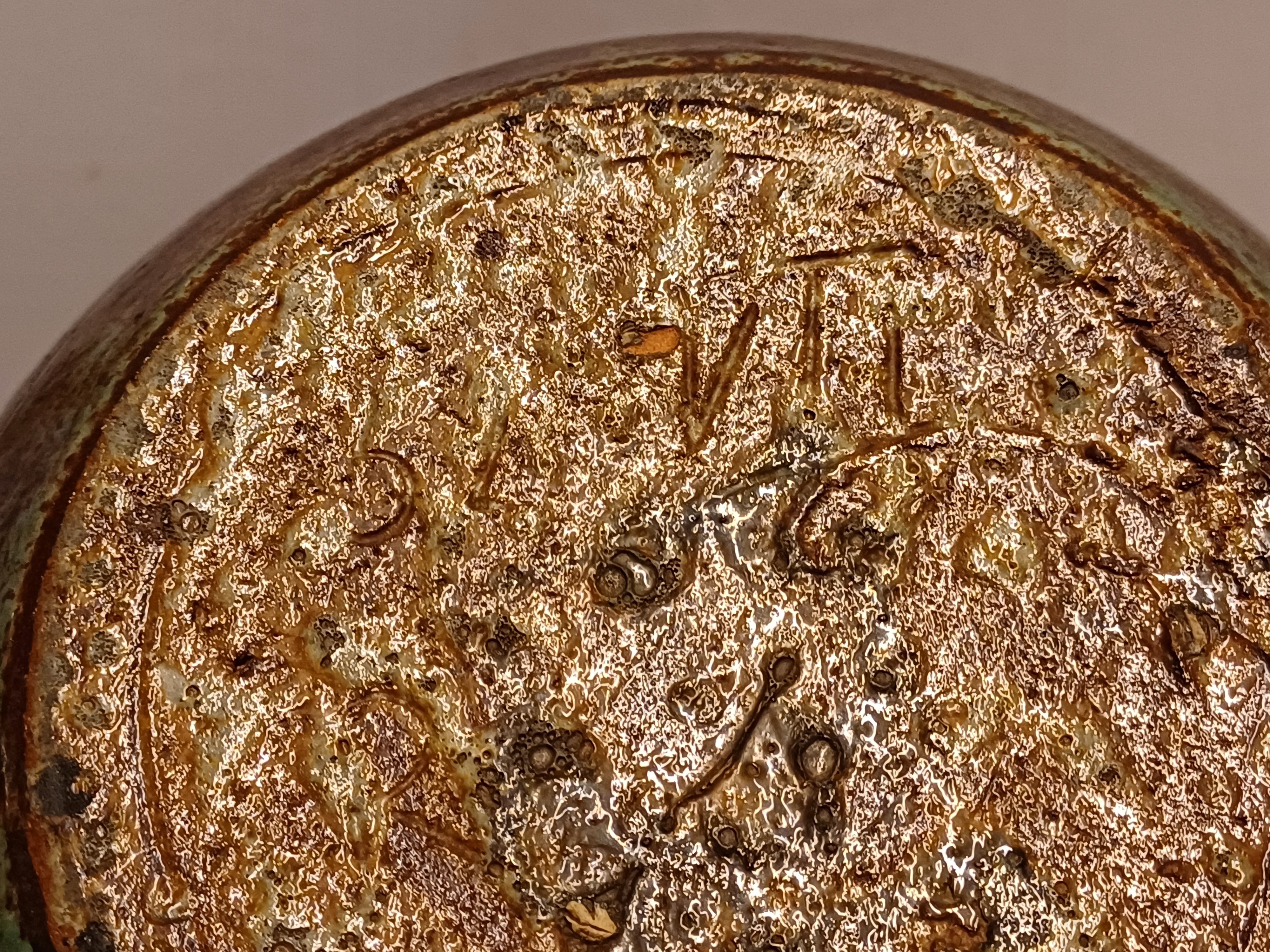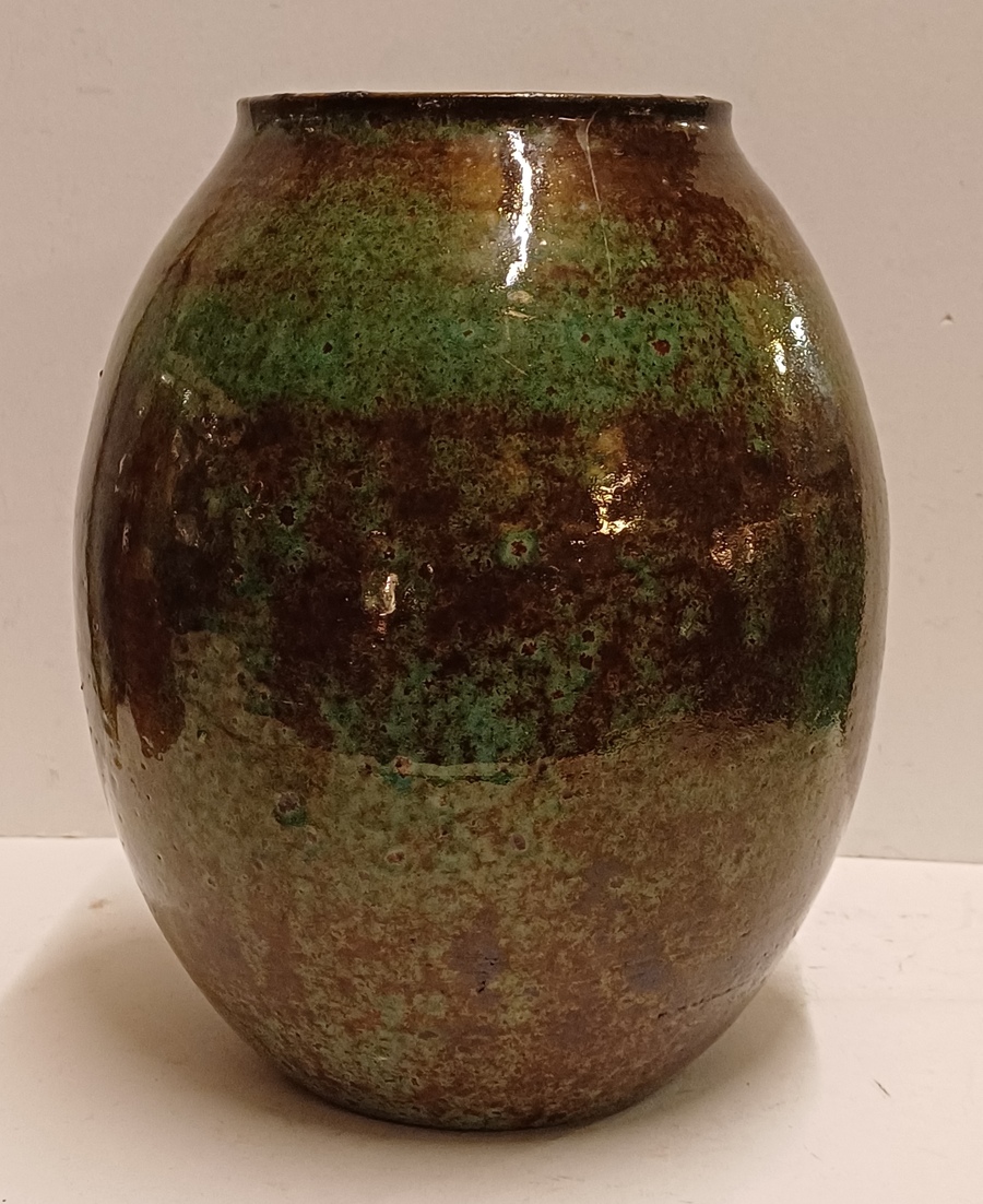 Grotevaas met donkere glazuur met groene accenten. Onderzijde gemerkt met romeins cijfer geen fabrieksmerk.