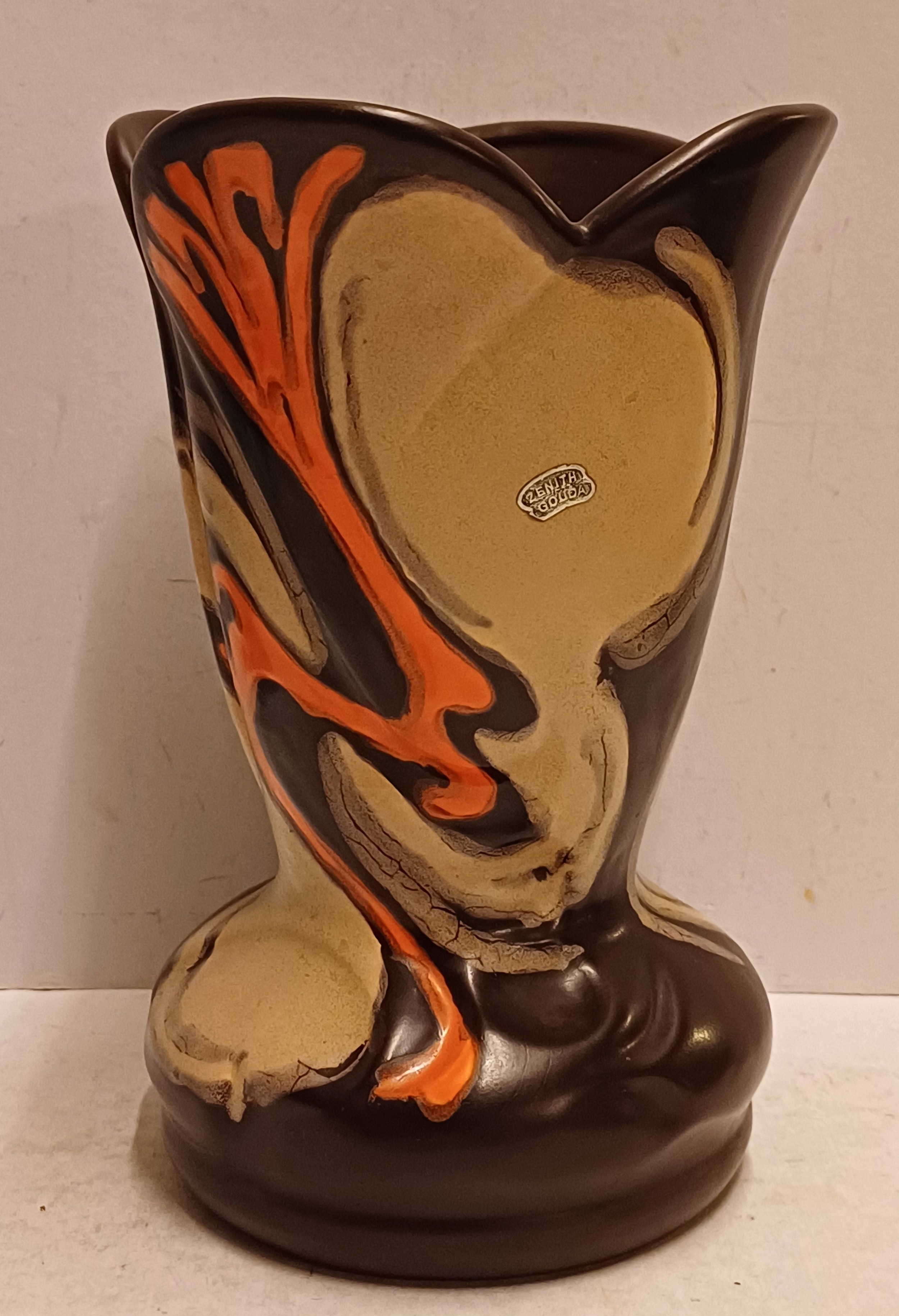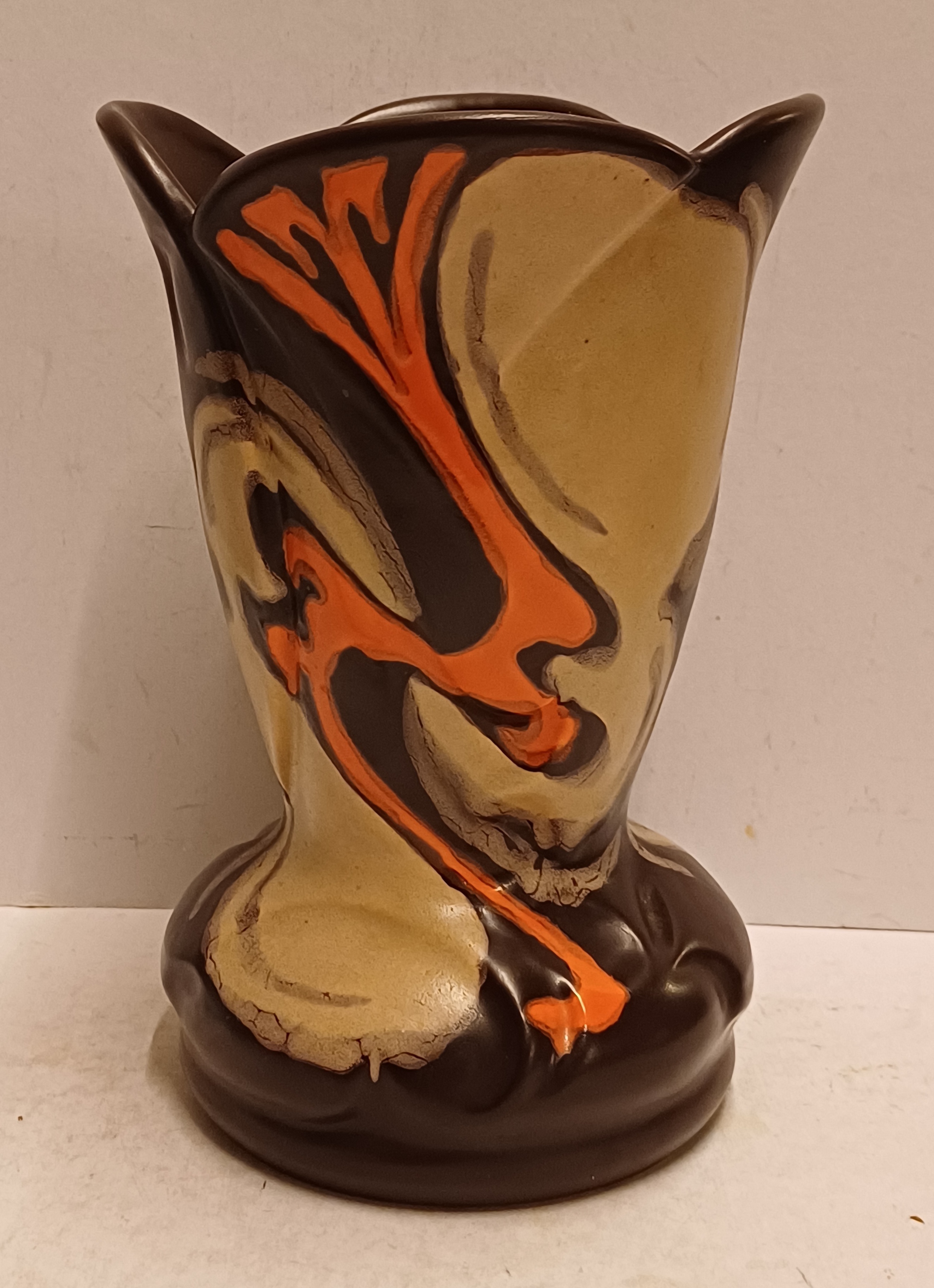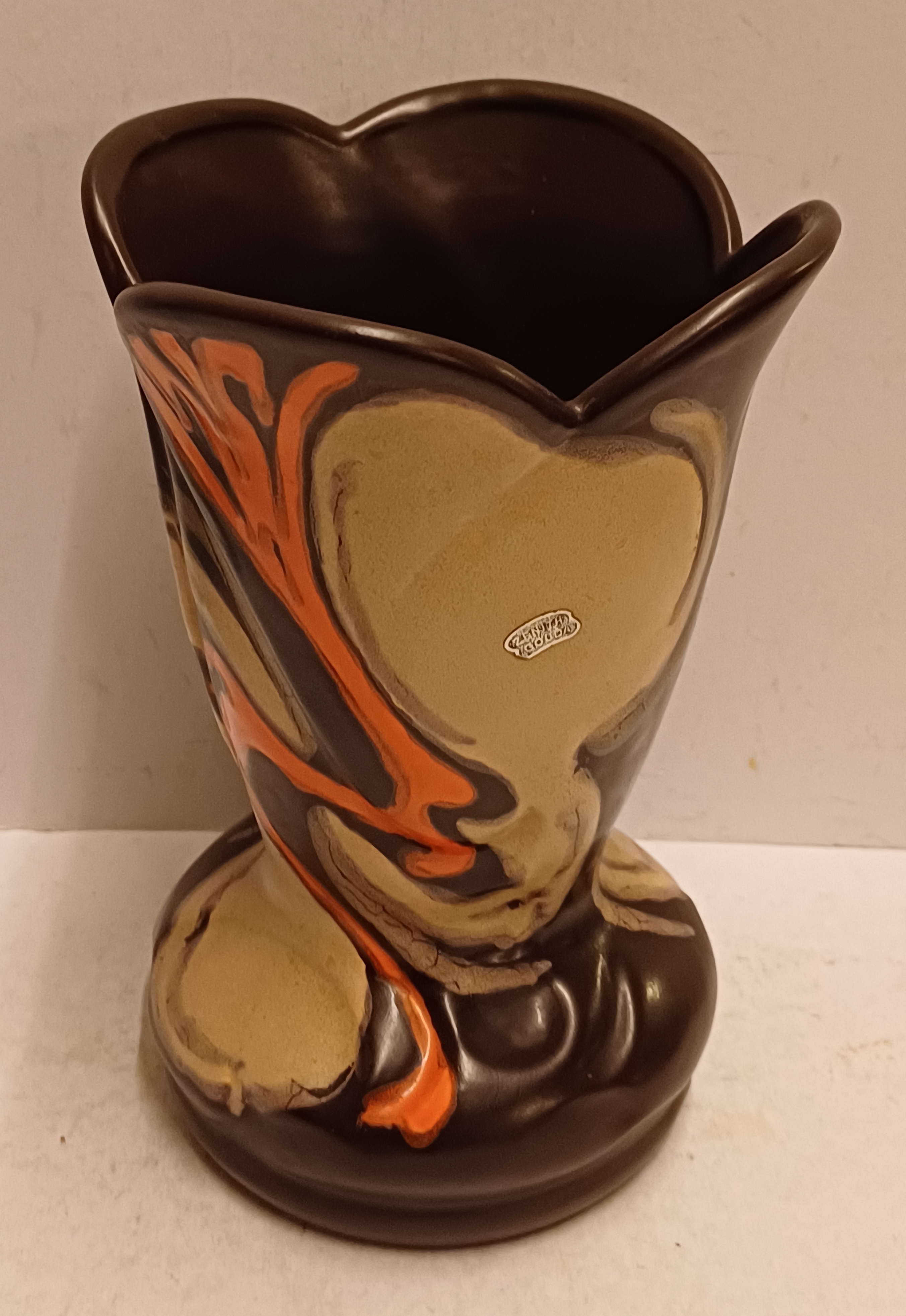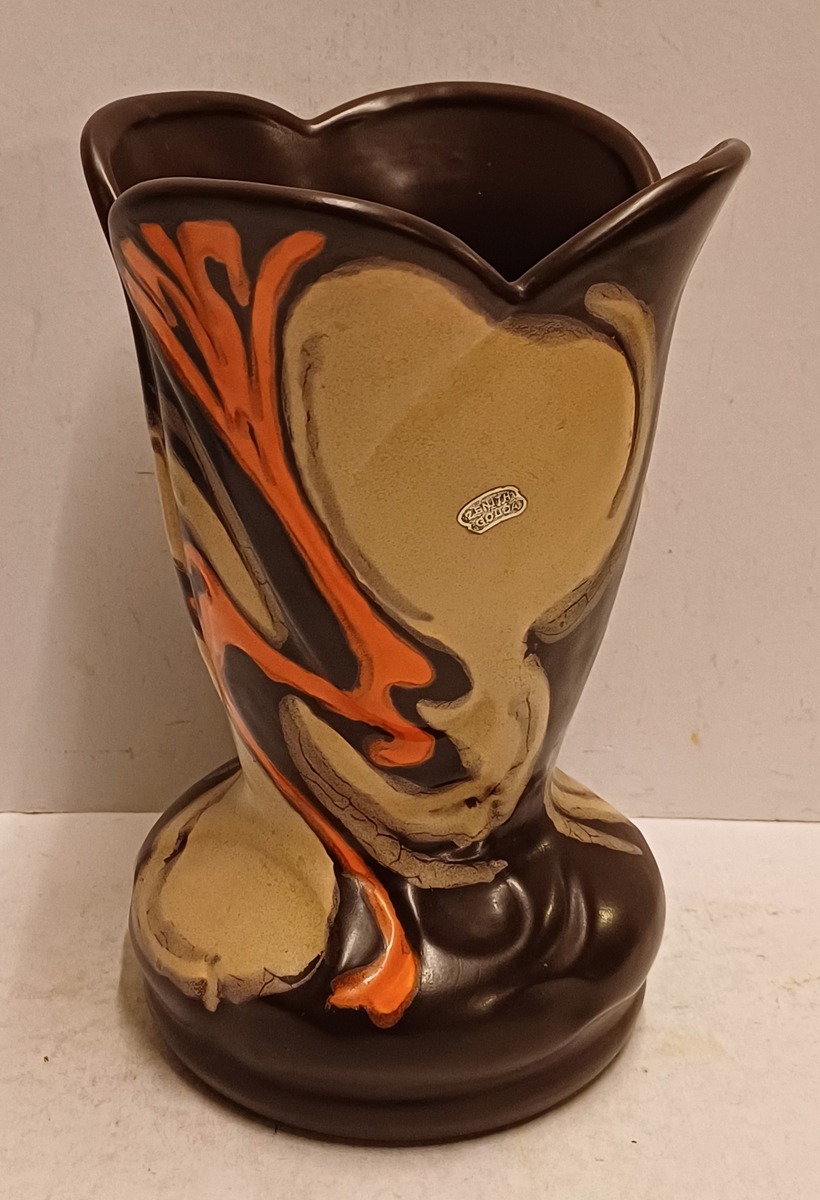 Aardewerken gegoten vaas met Sepia decoratie. Onderzijde gemerkt en originele etiket op de vaas.