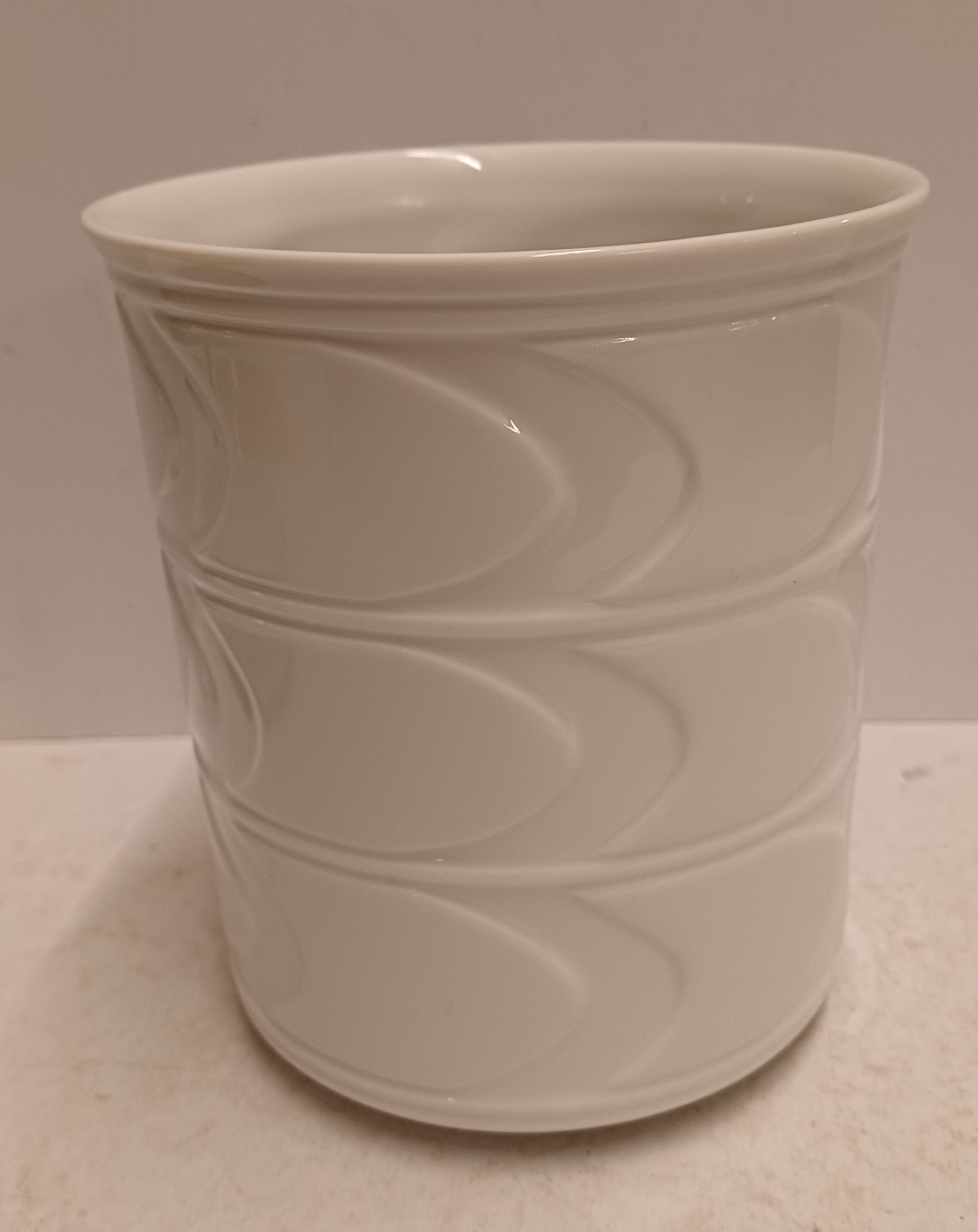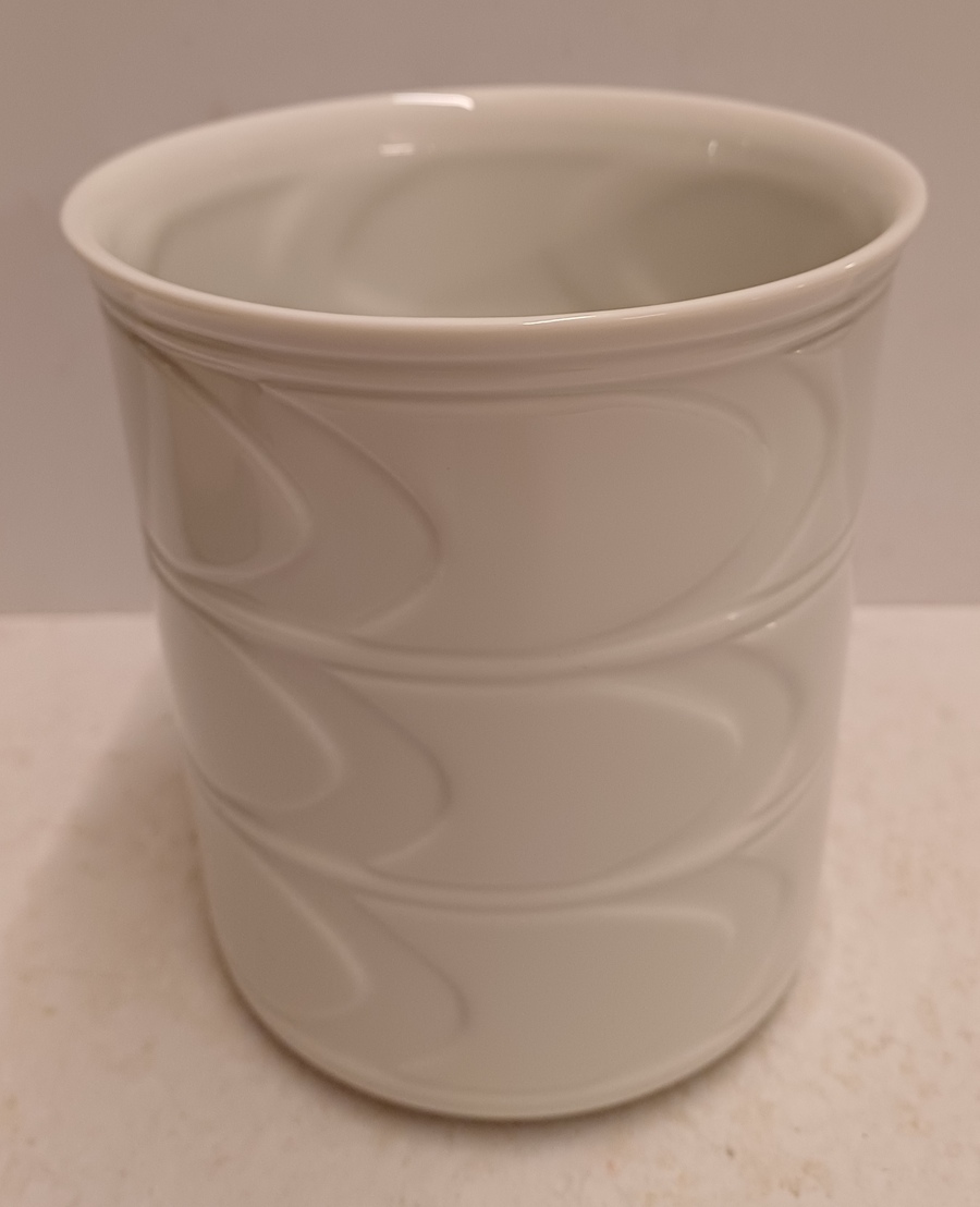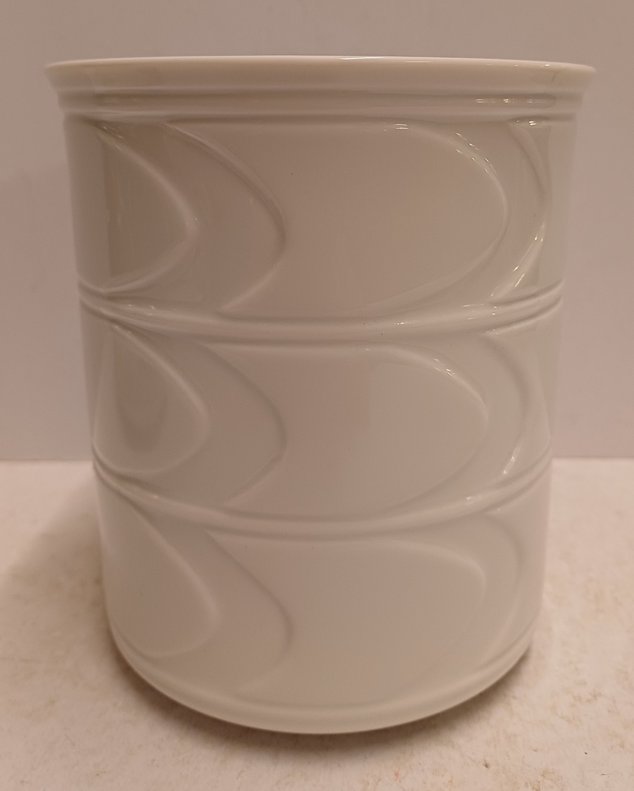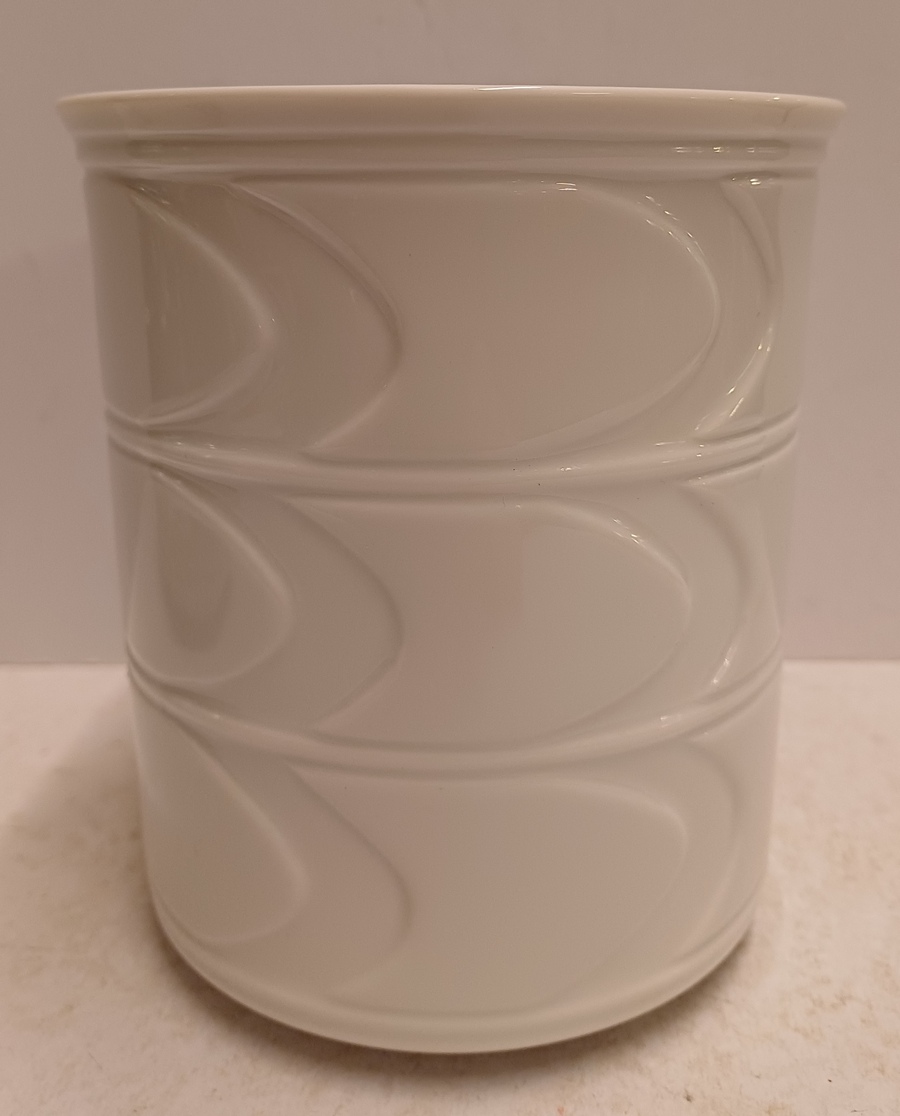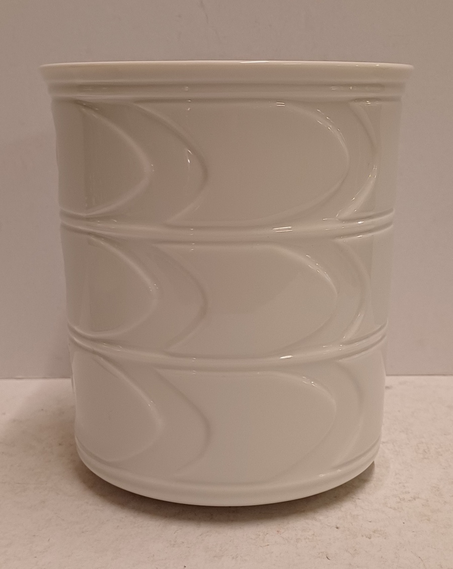Vaso a beccuccio in porcellana bianca con decorazione geometrica in tre fasce. Design di Alev Siesbye. Parte inferiore con marchio Rosenthal Studio Line.