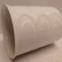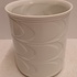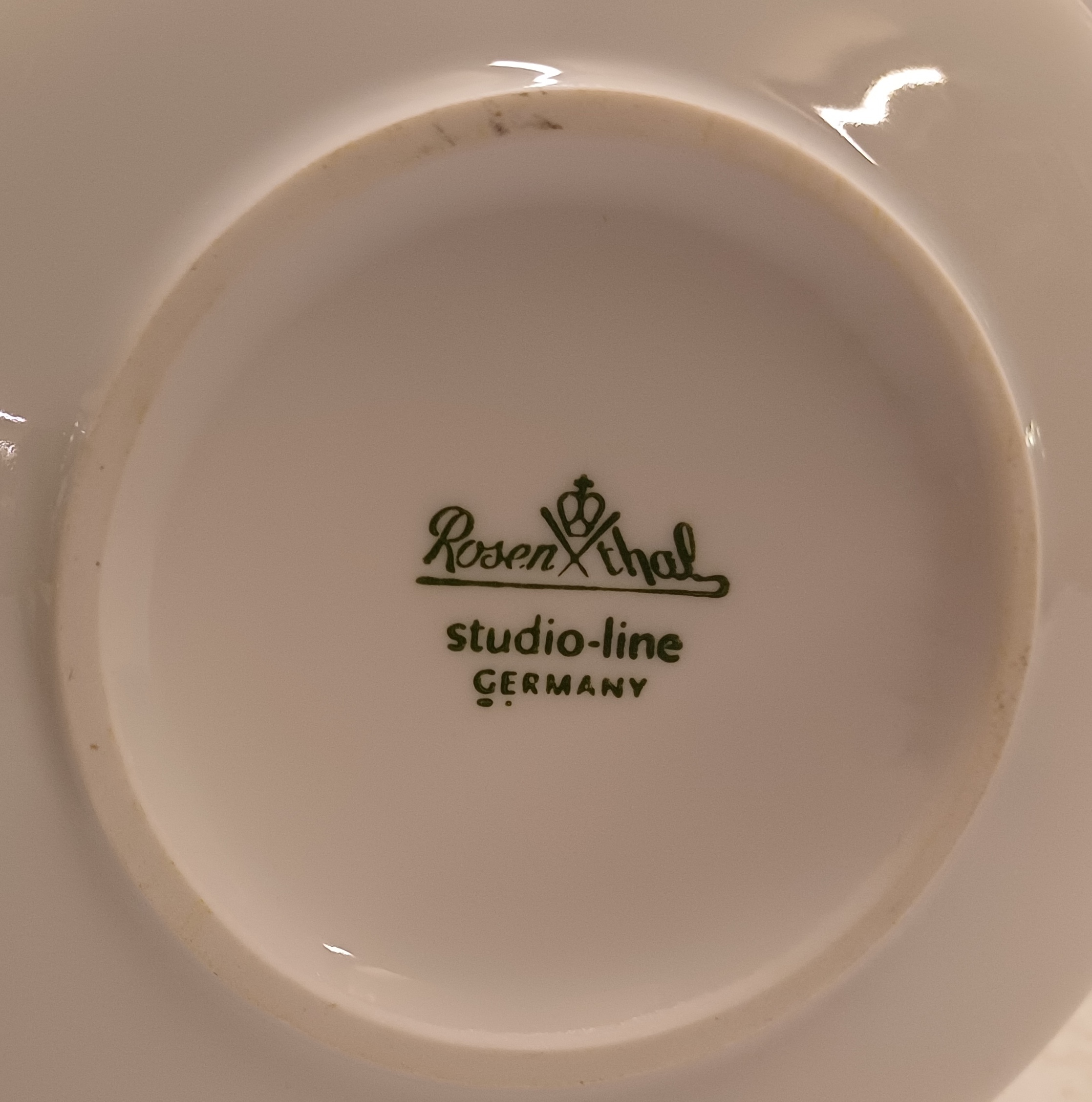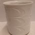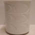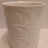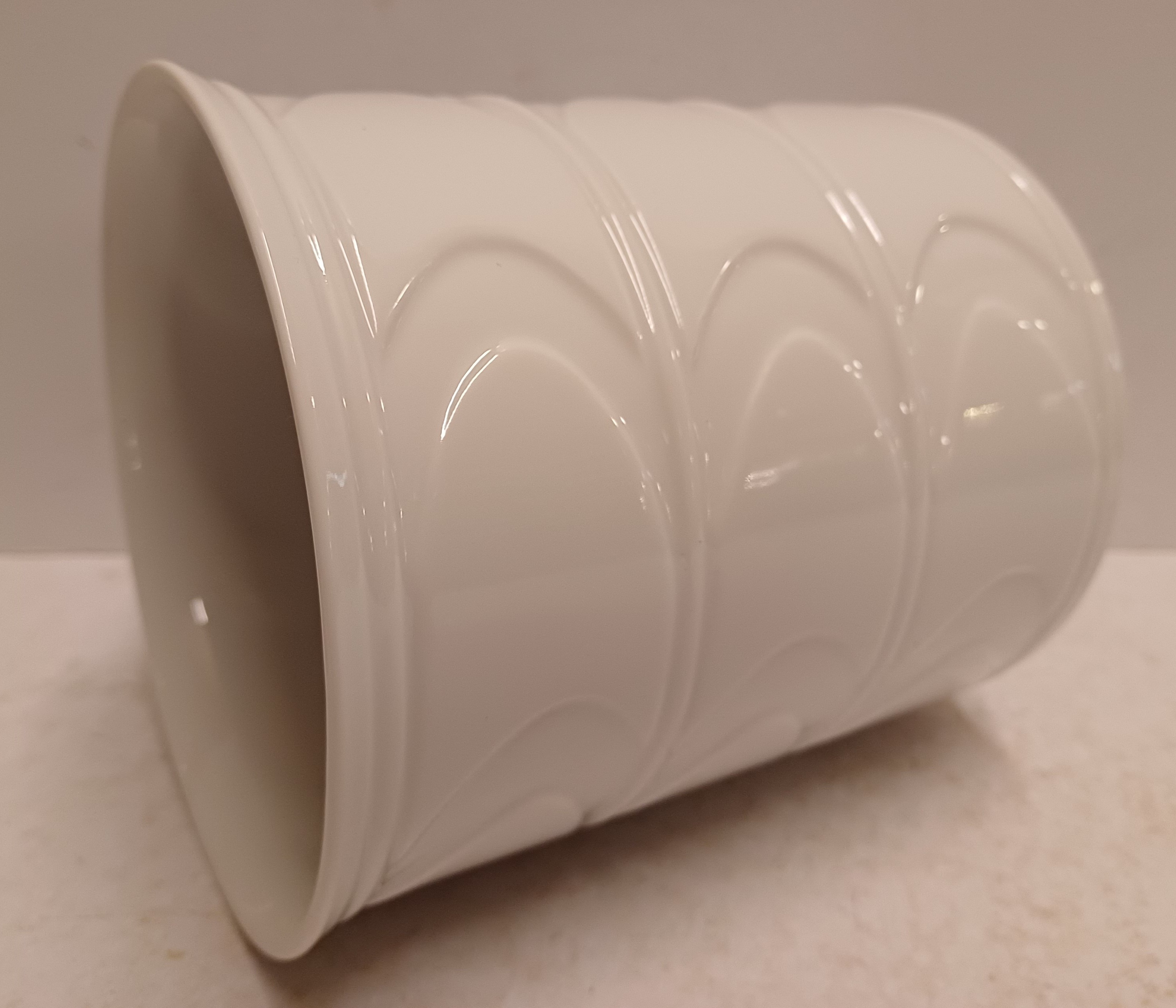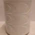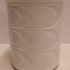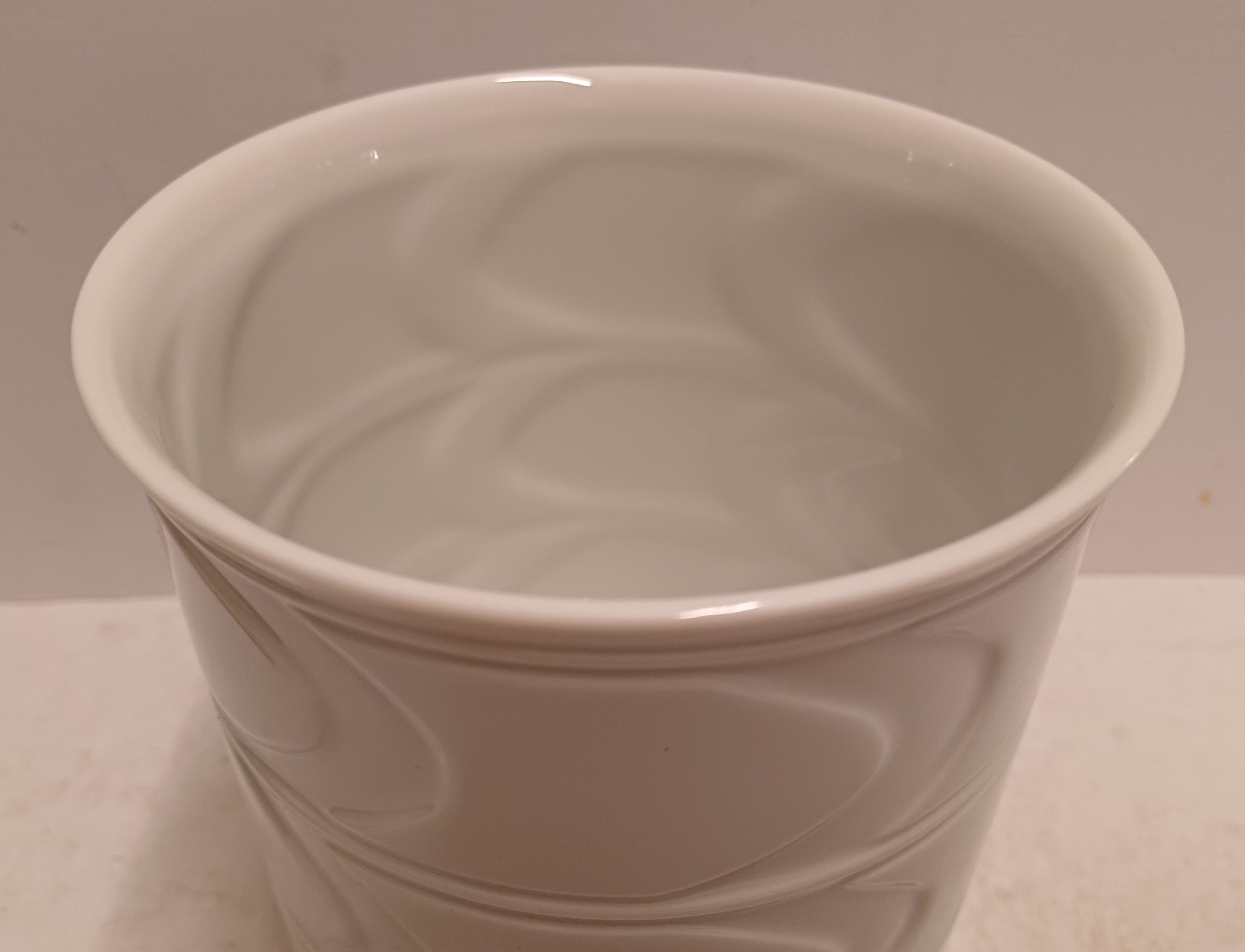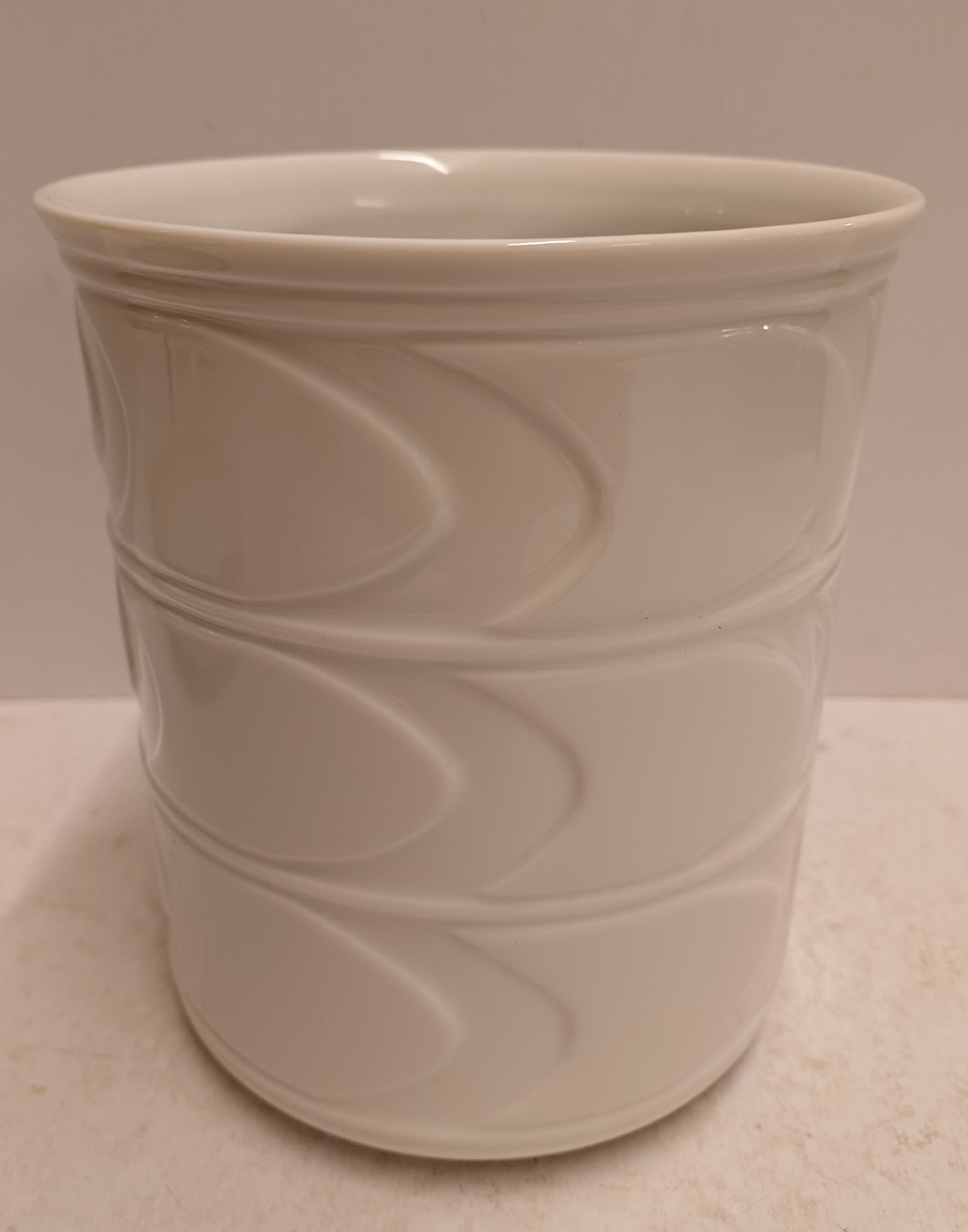 Vaso a beccuccio in porcellana bianca con decorazione geometrica in tre fasce. Design di Alev Siesbye. Parte inferiore con marchio Rosenthal Studio Line.