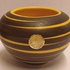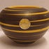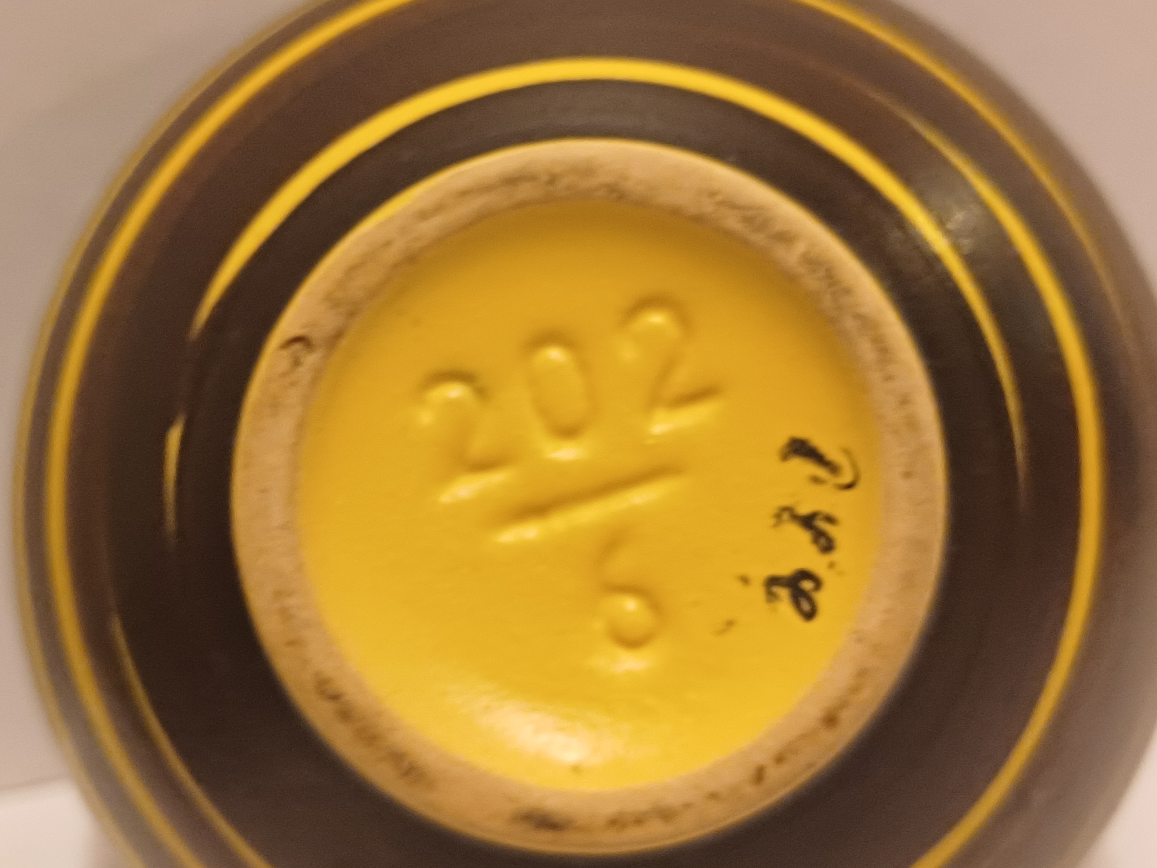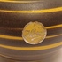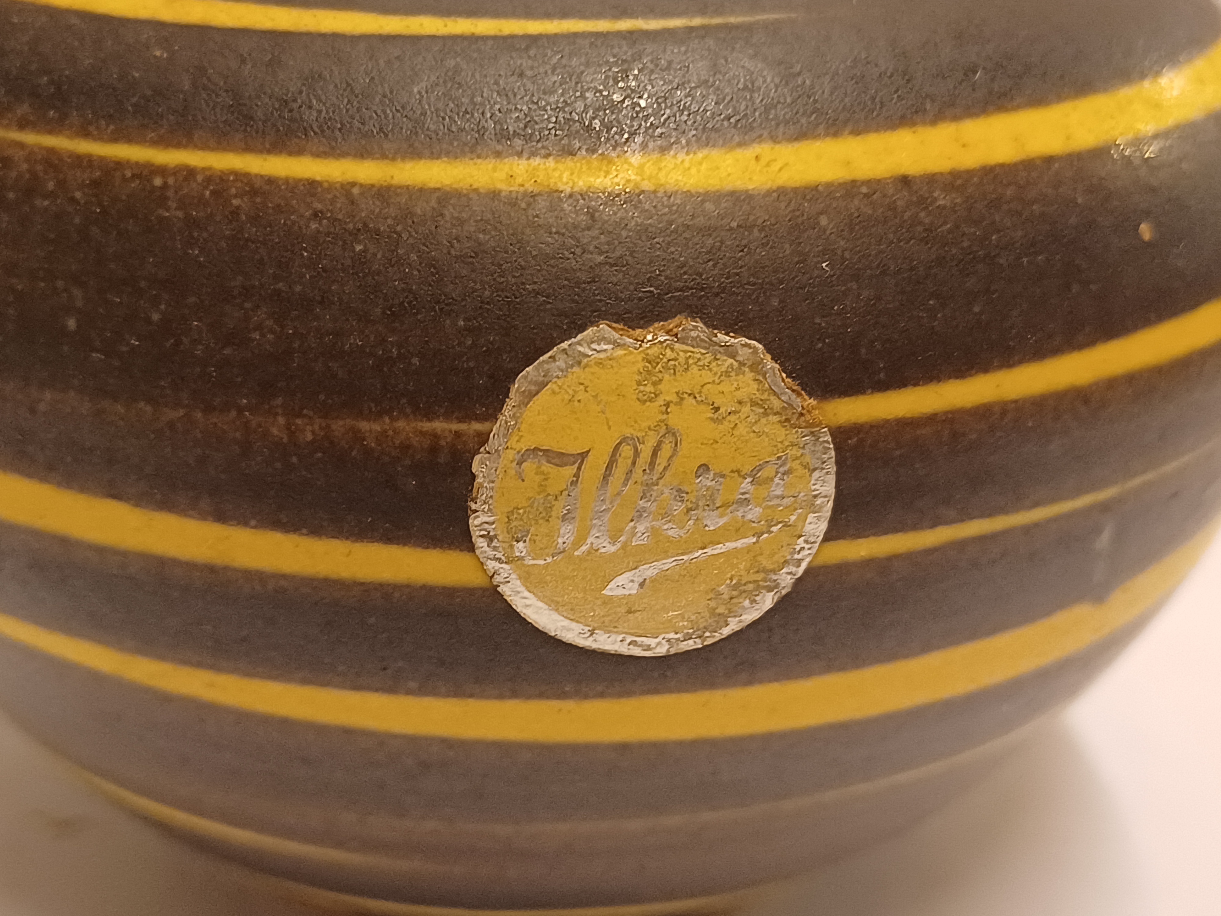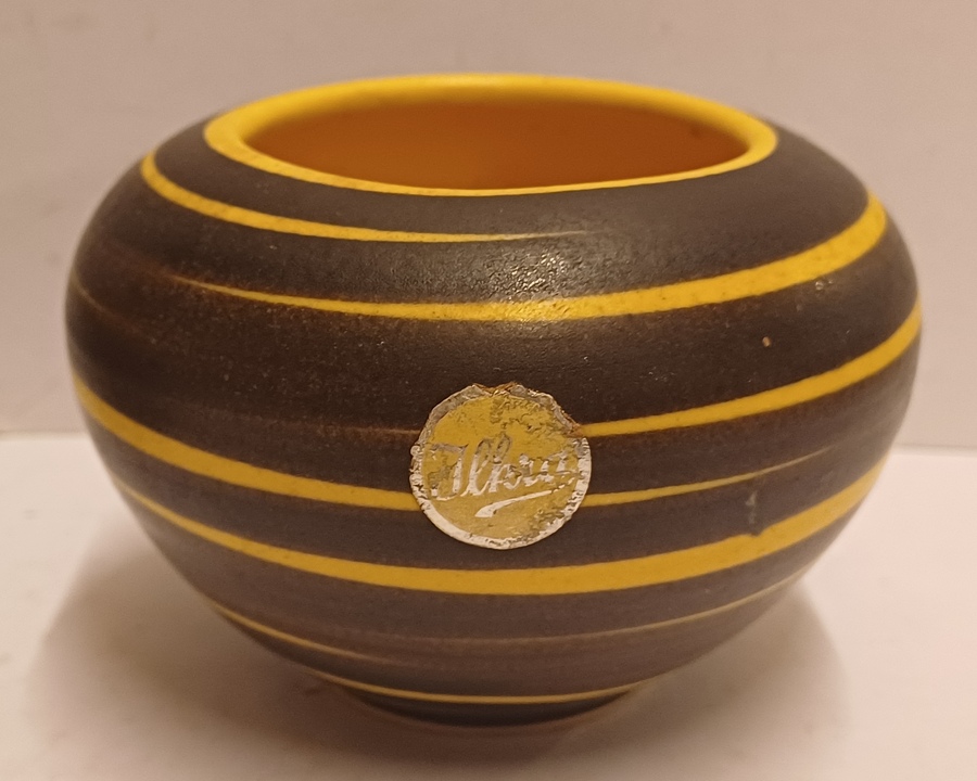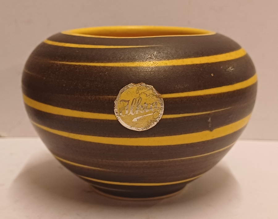 Gegoten vaas met met geel bruin strepen decor. Onderzijde met modelnummer 202-6