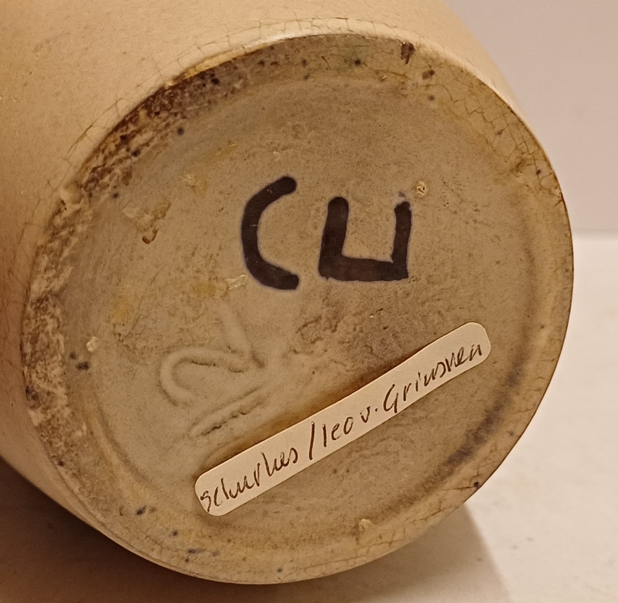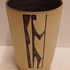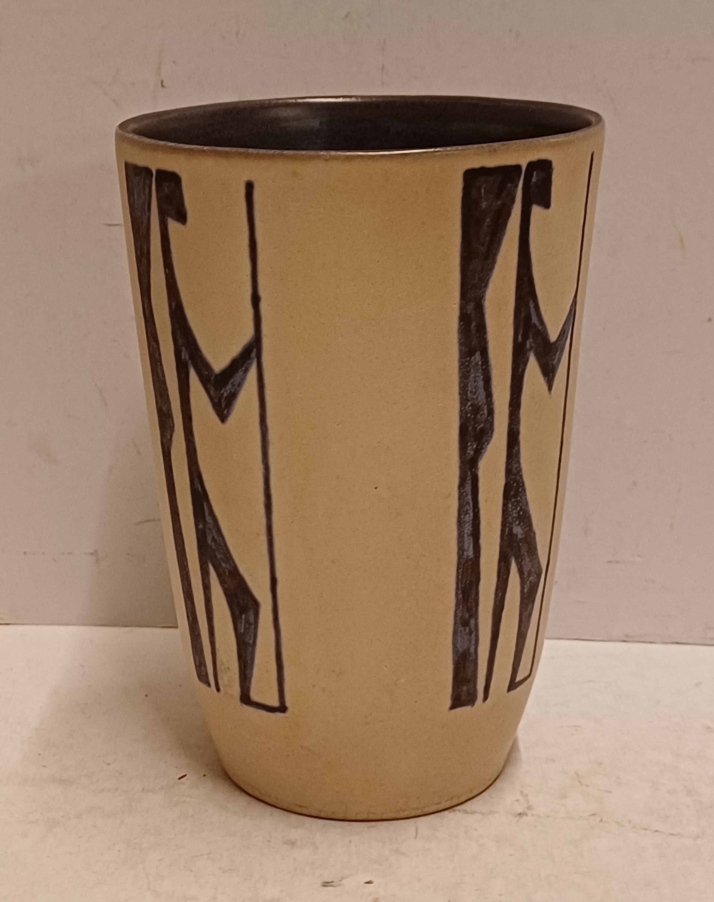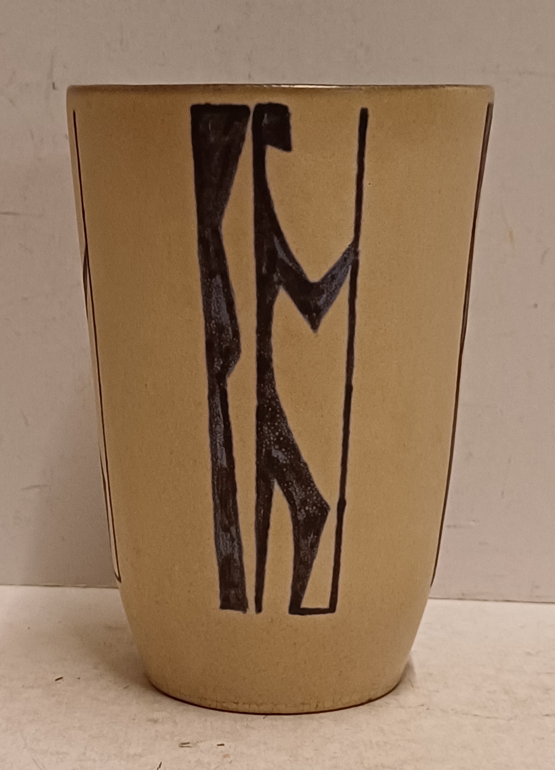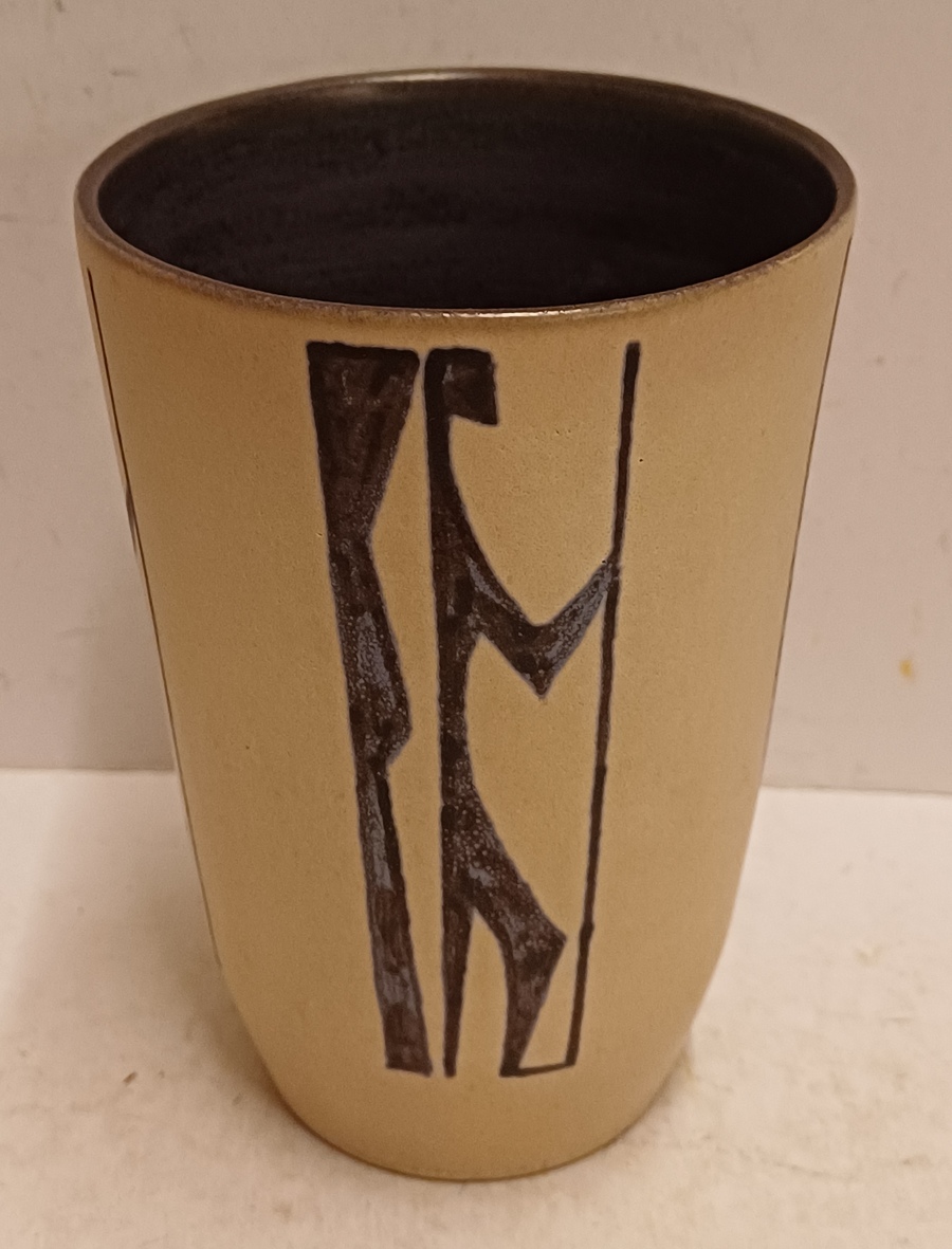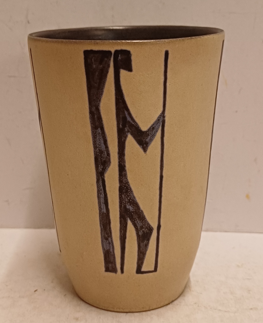 Aardewerken vaas met figuraal decor van een strijder met speer op creme fond Decor Figura. Binnenzijde met zwarte glazuur. Onderzijde gemerkt ontwerp Leo van Grinsven vorm Jan Schuurkes