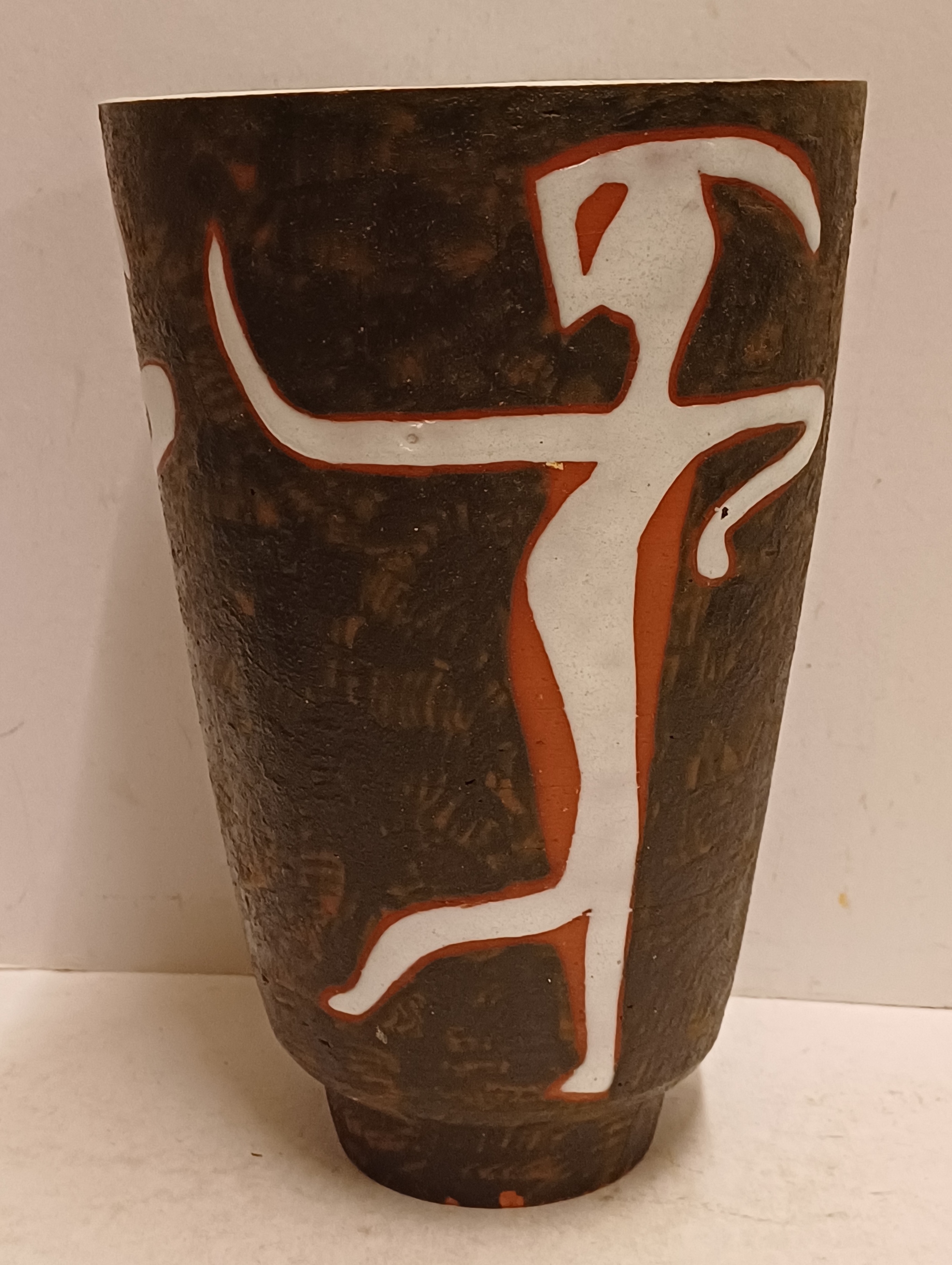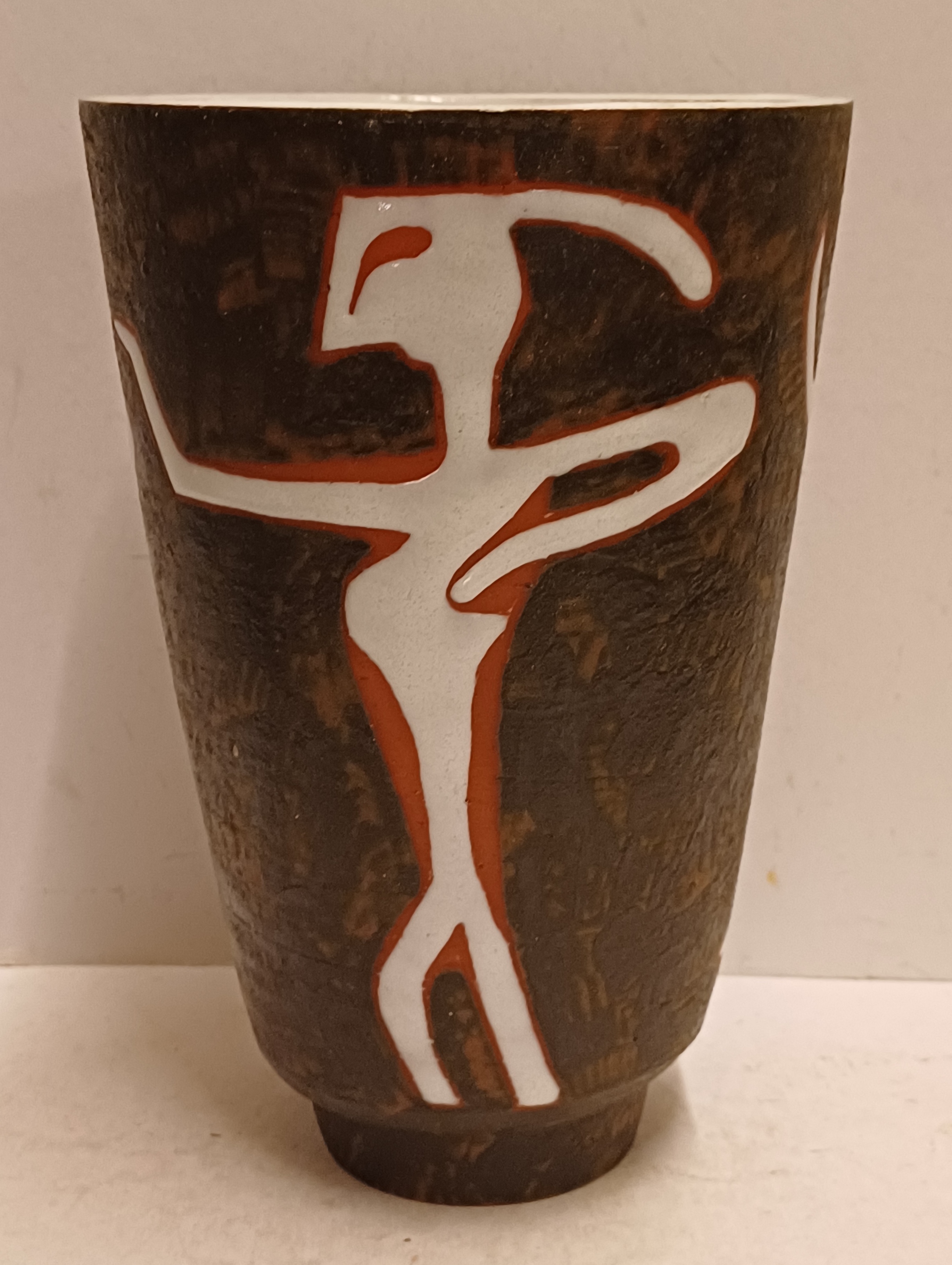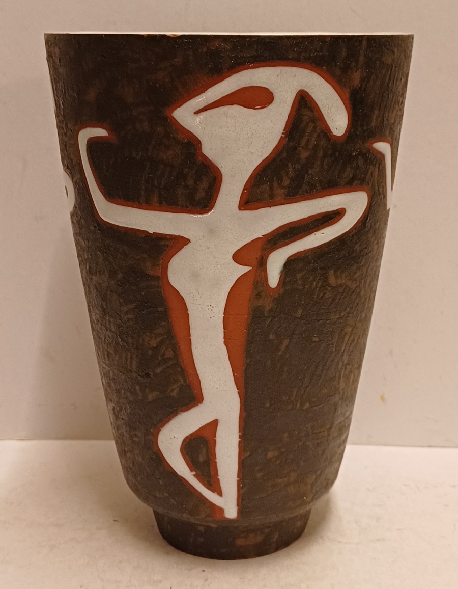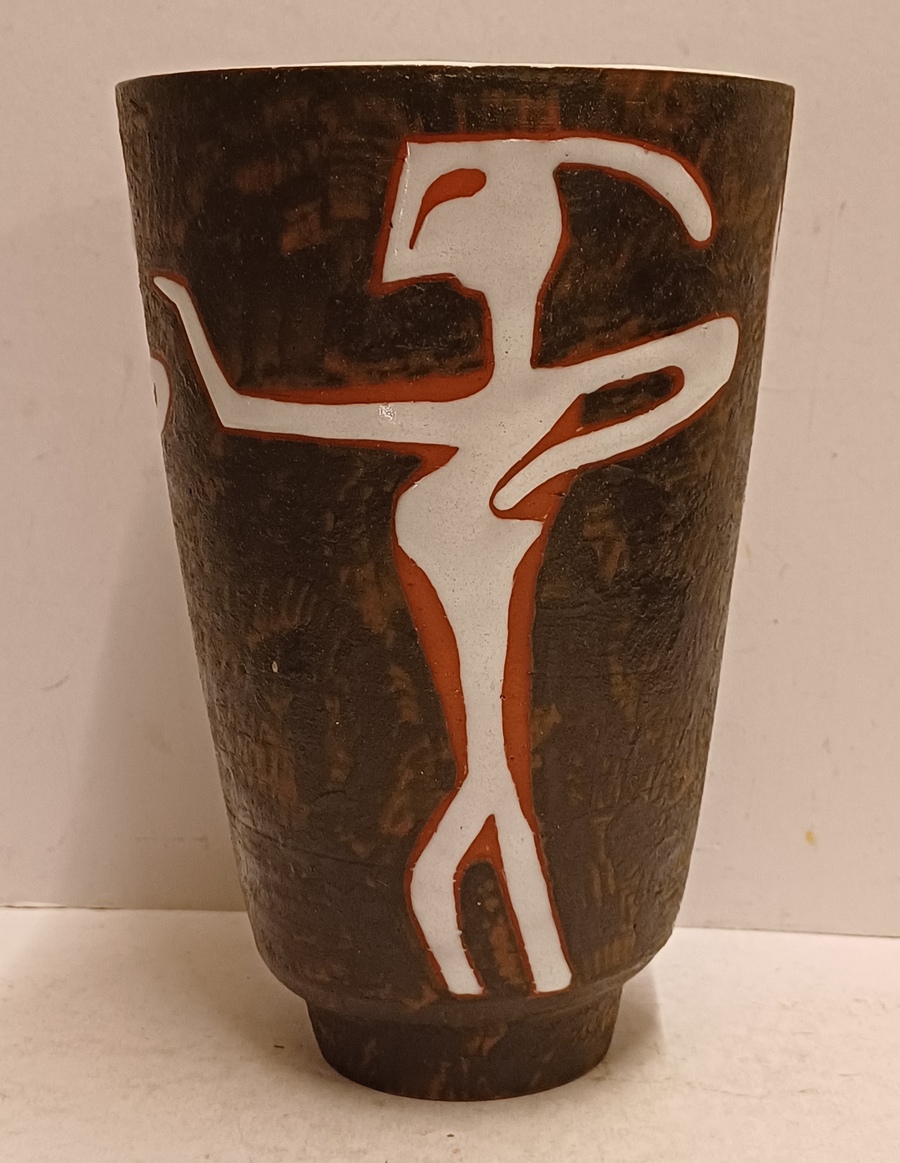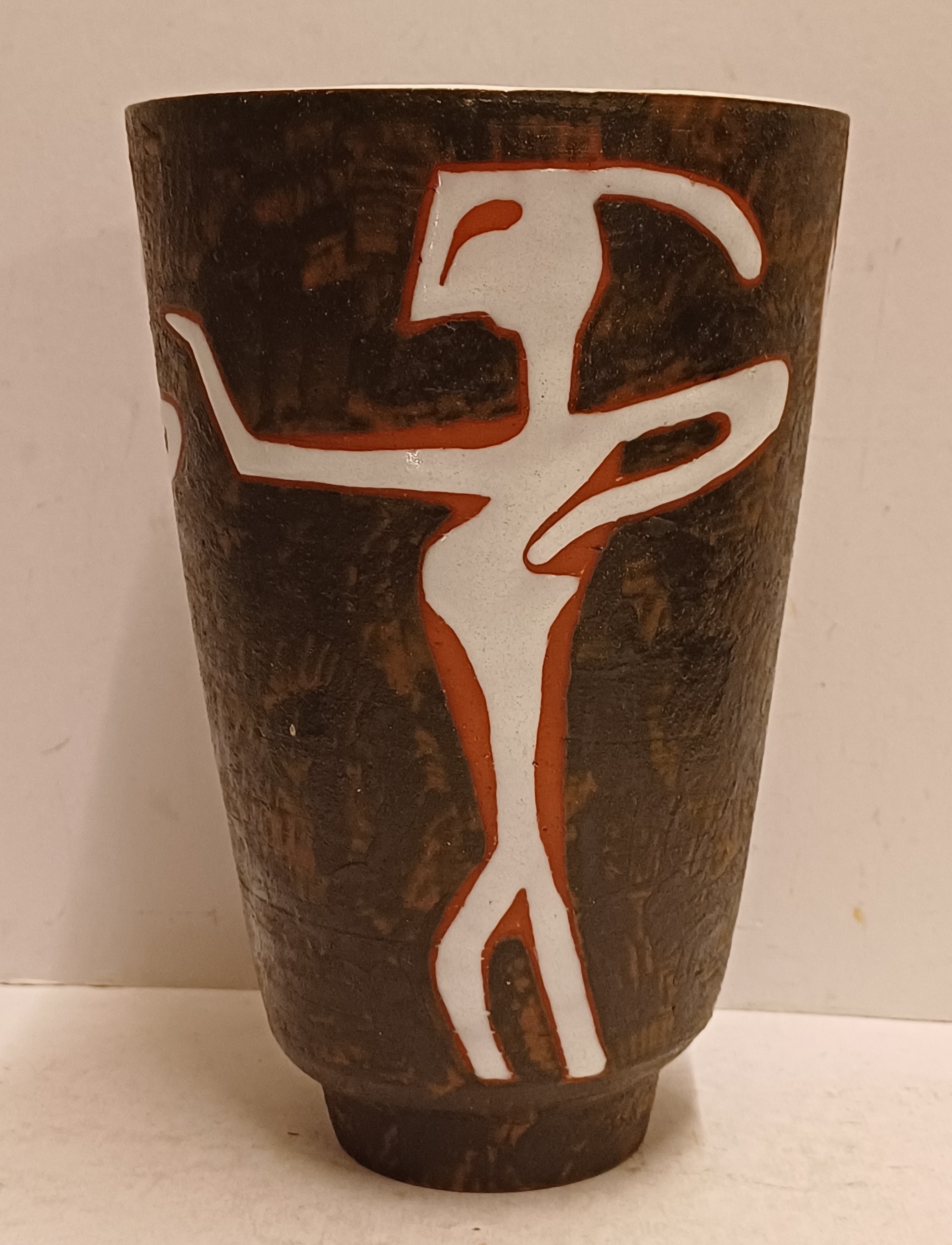 Vroege vaas met in witte glazuur geschilderde figuren rondom op een mat bruine ondergrond. De binnenzijde met een witte tinglazuur. Niet gesigneerd, ontwerp Rademakers en Schuurkes, circa 1955.