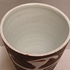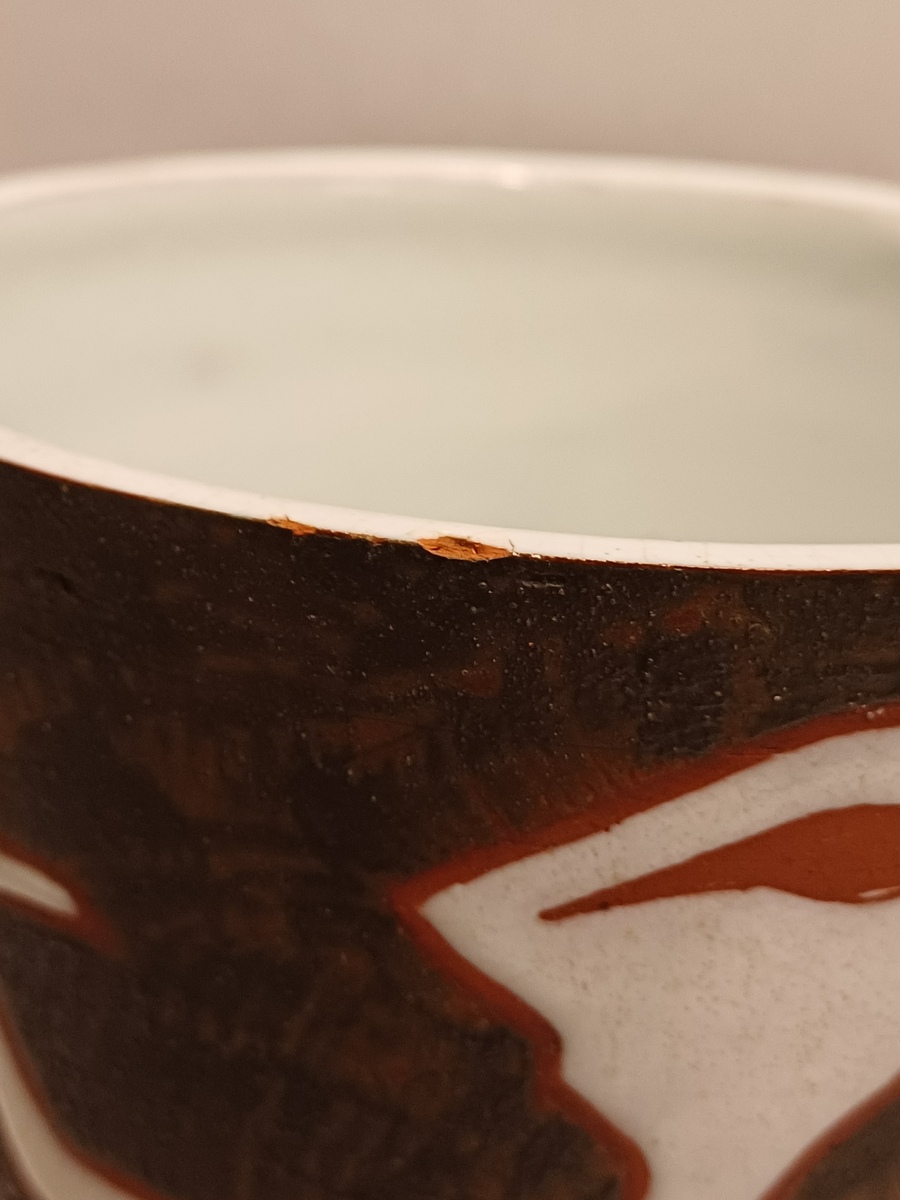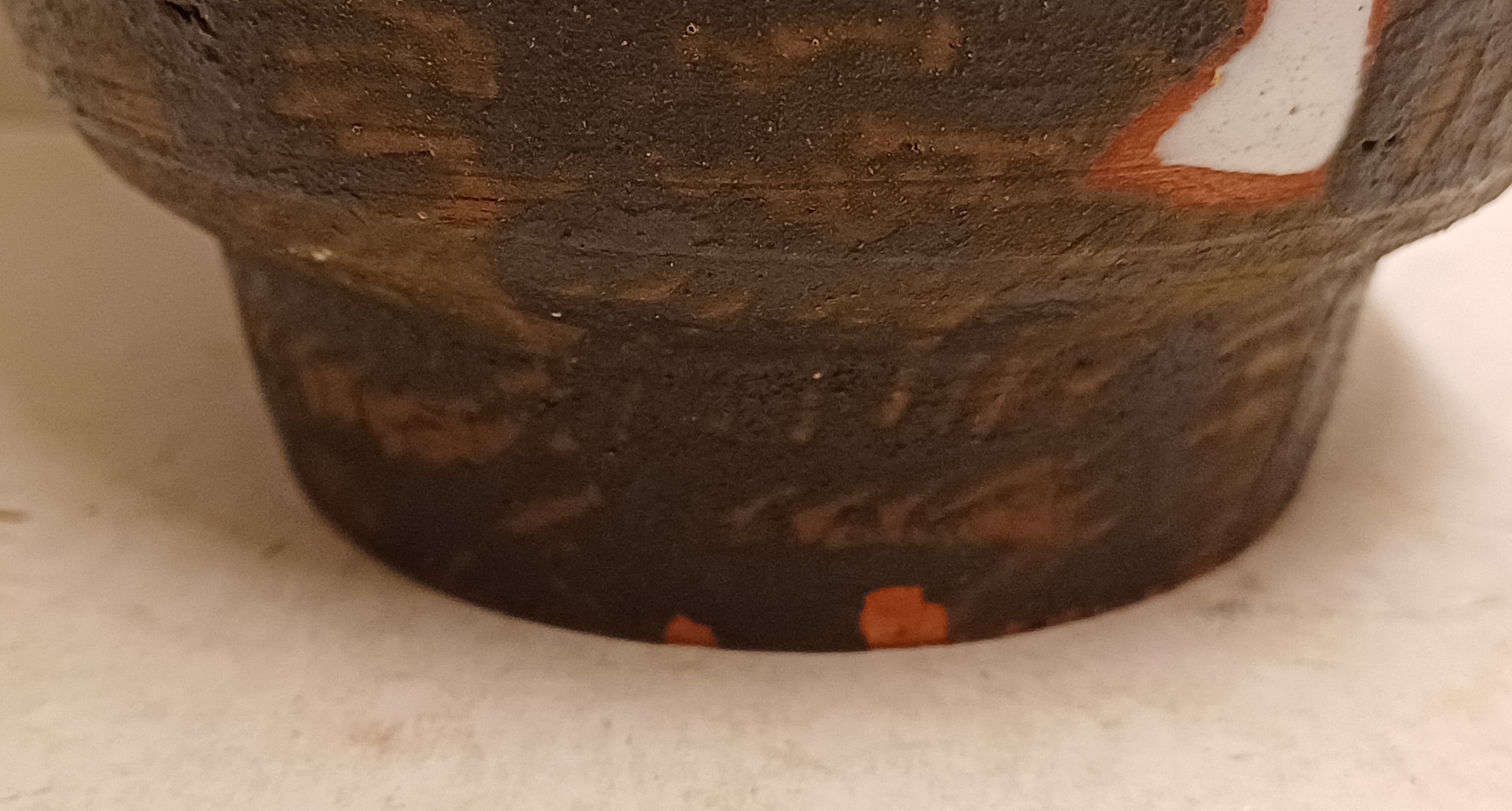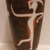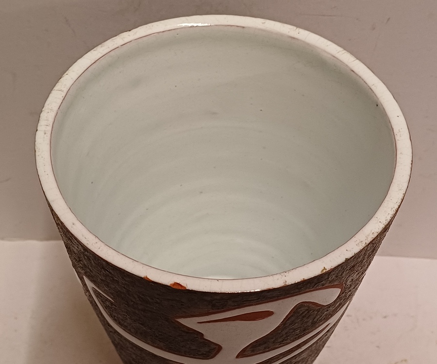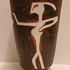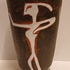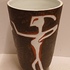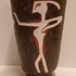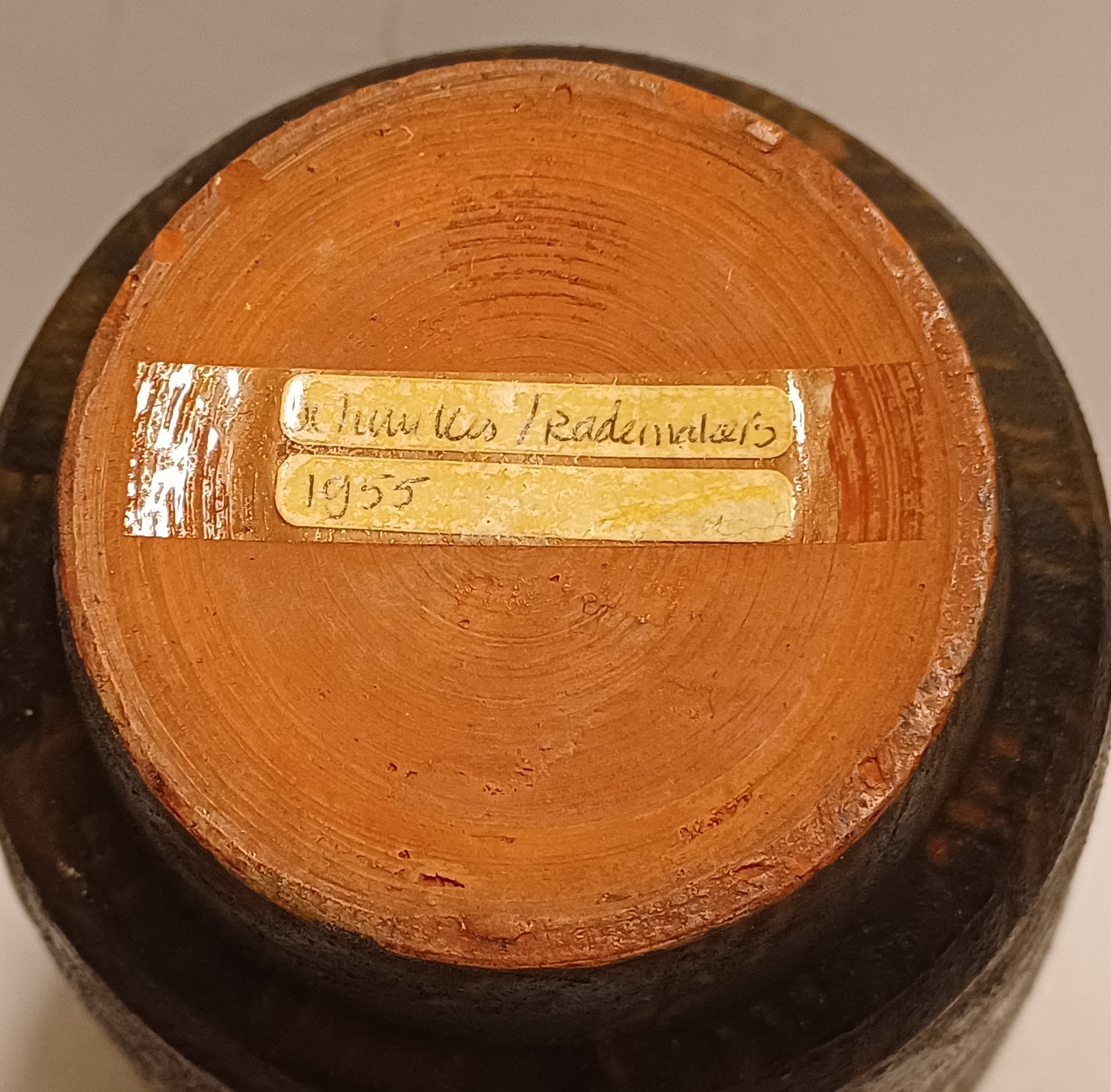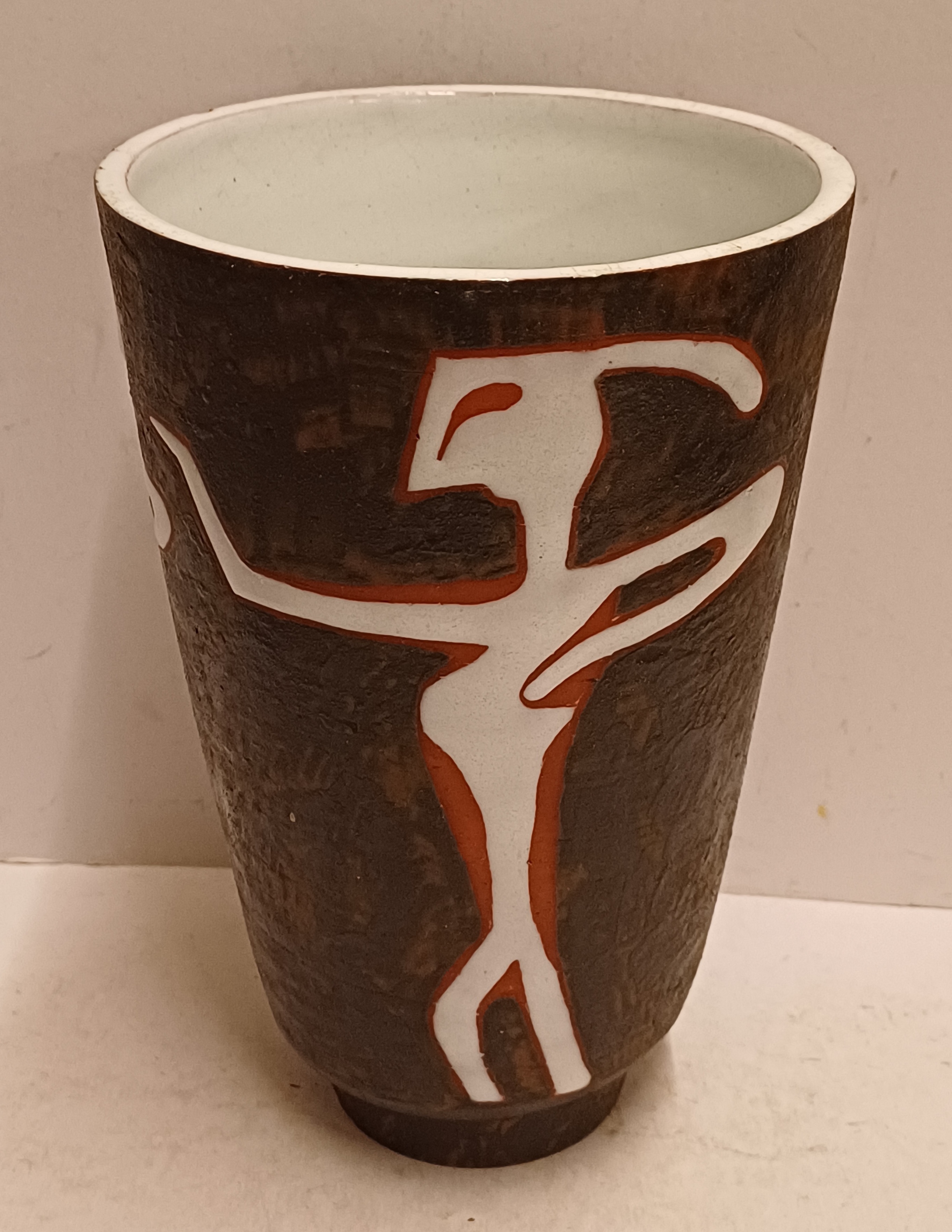 Vroege vaas met in witte glazuur geschilderde figuren rondom op een mat bruine ondergrond. De binnenzijde met een witte tinglazuur. Niet gesigneerd, ontwerp Rademakers en Schuurkes, circa 1955.