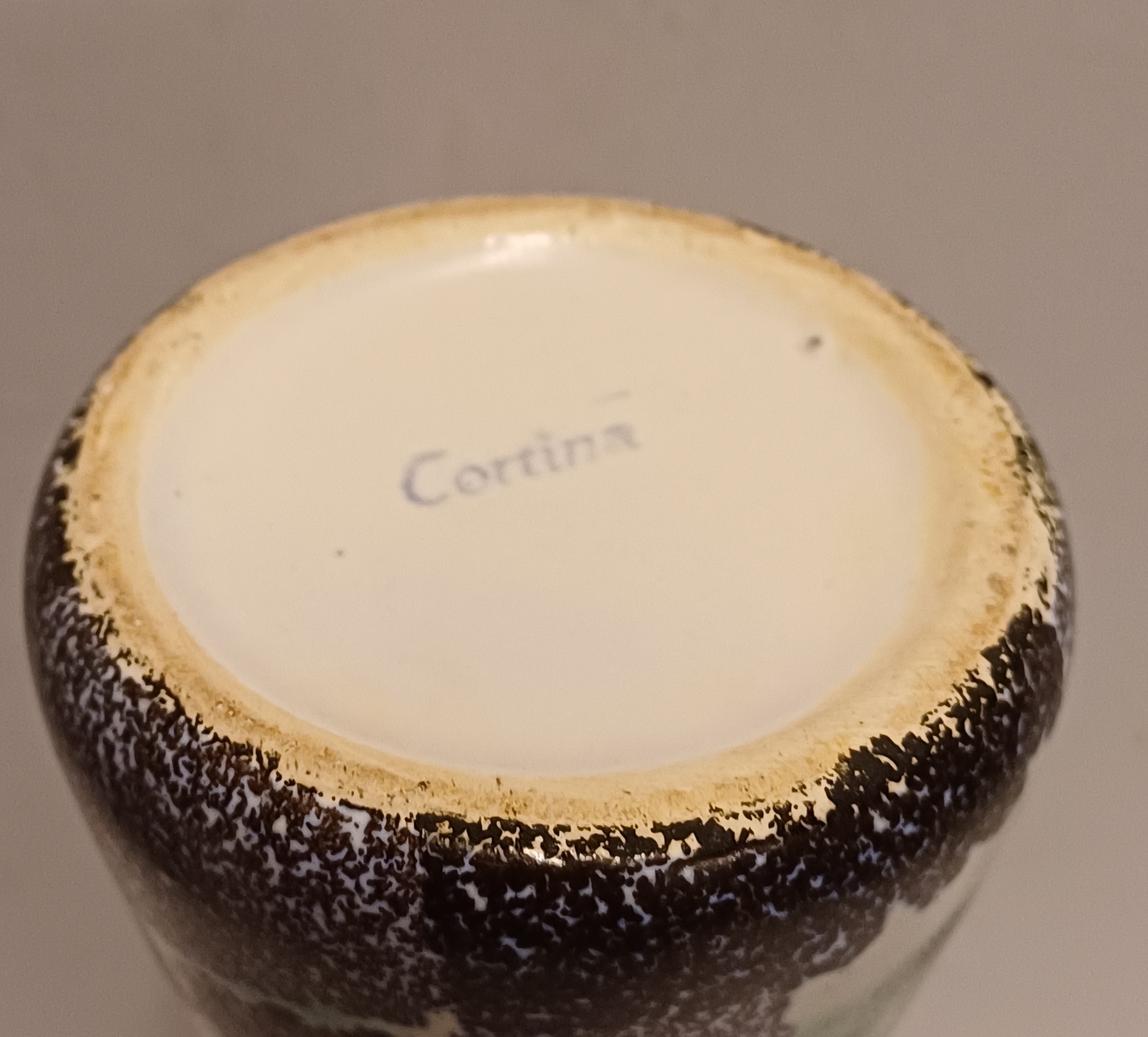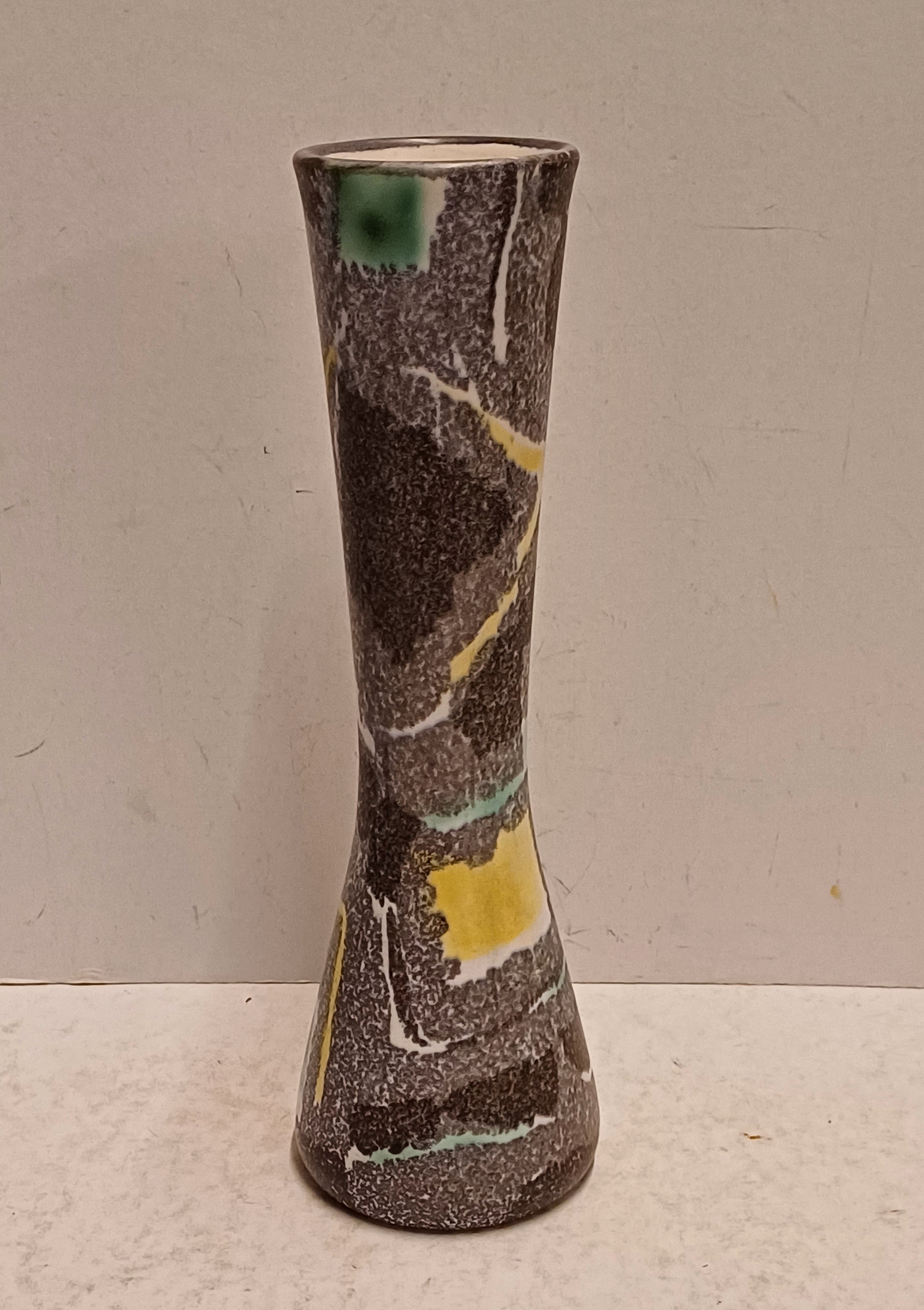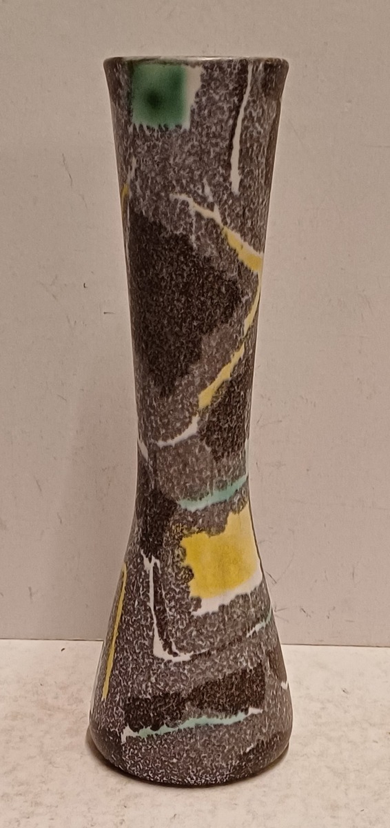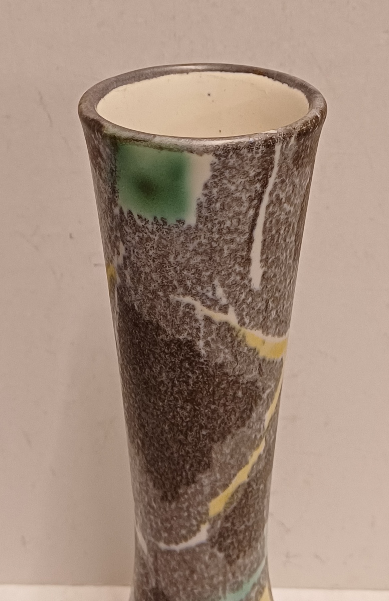 Vaas met meerkleurige print op gespikkeld grijs fond. Onderzijde met fabrieksmerk en decornaam.