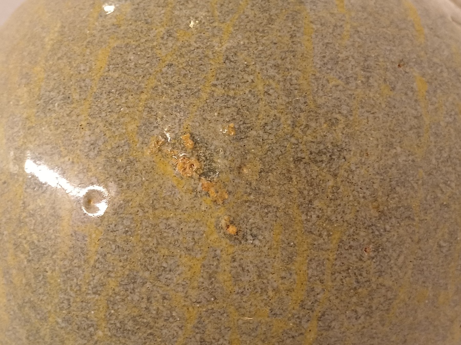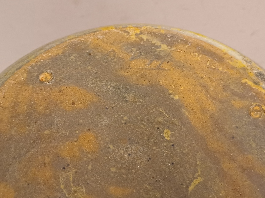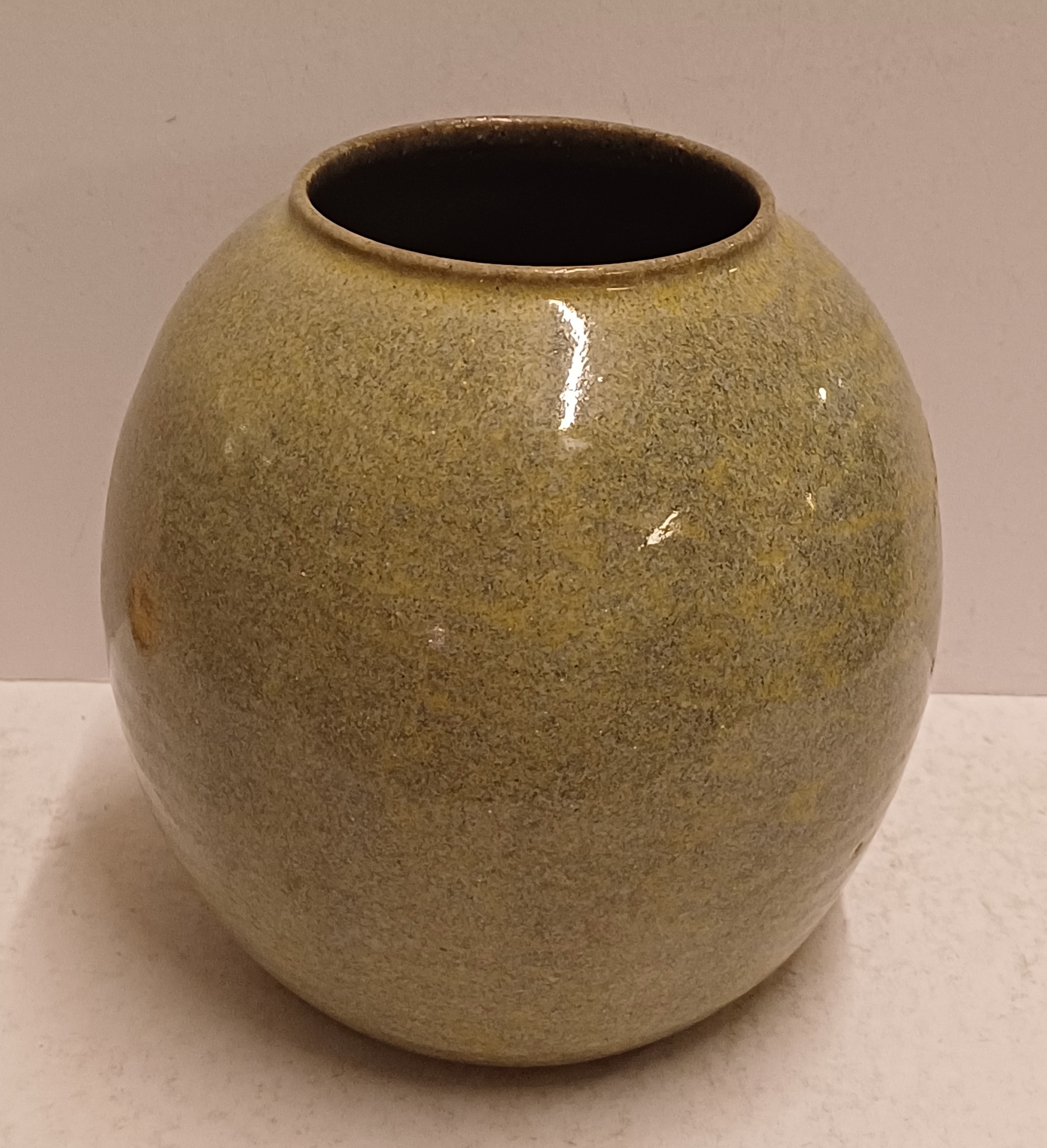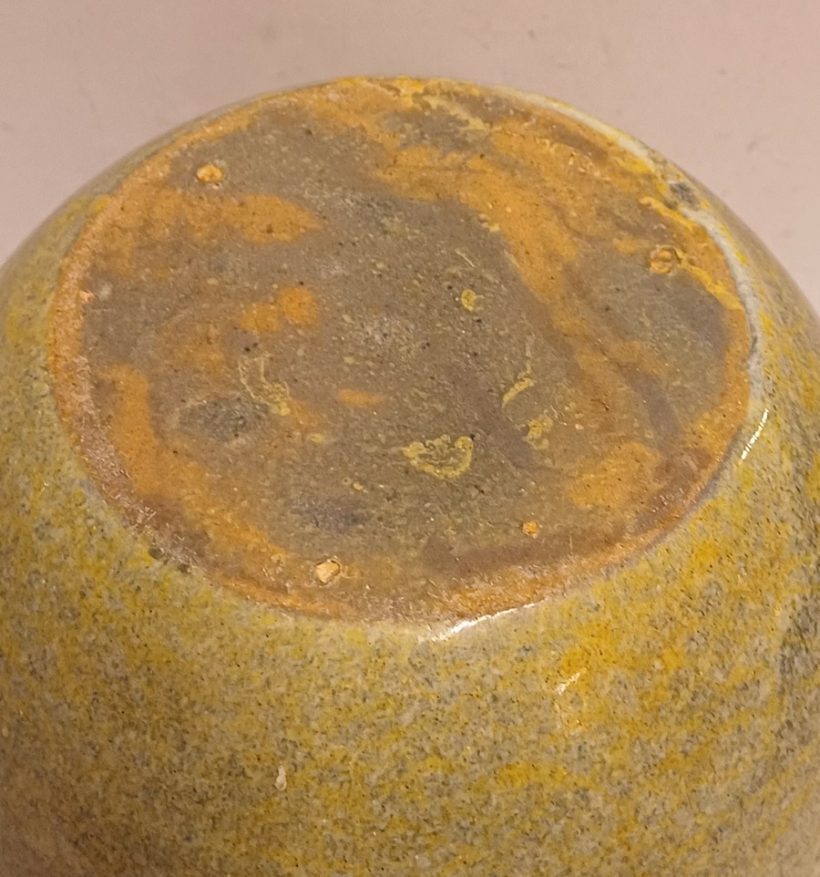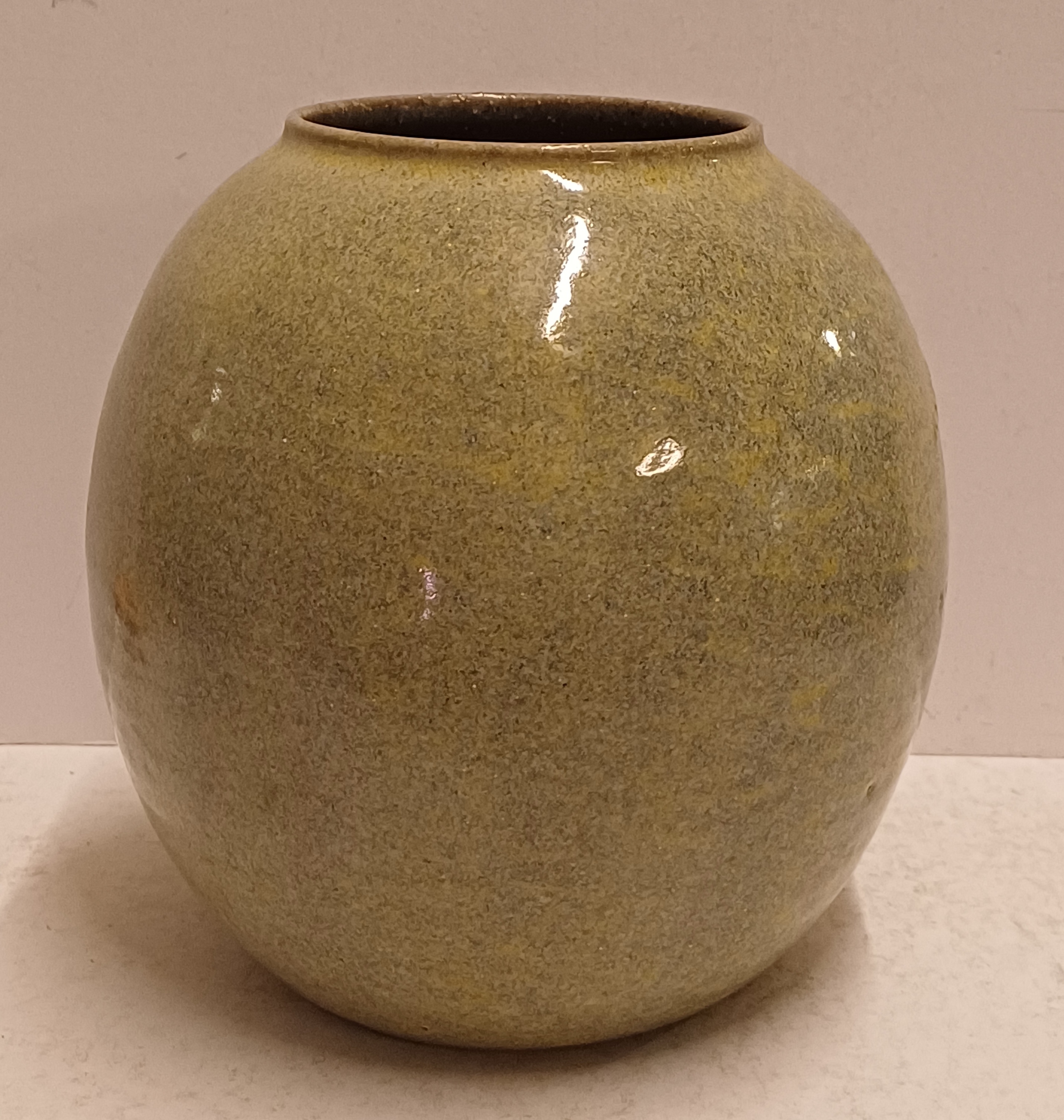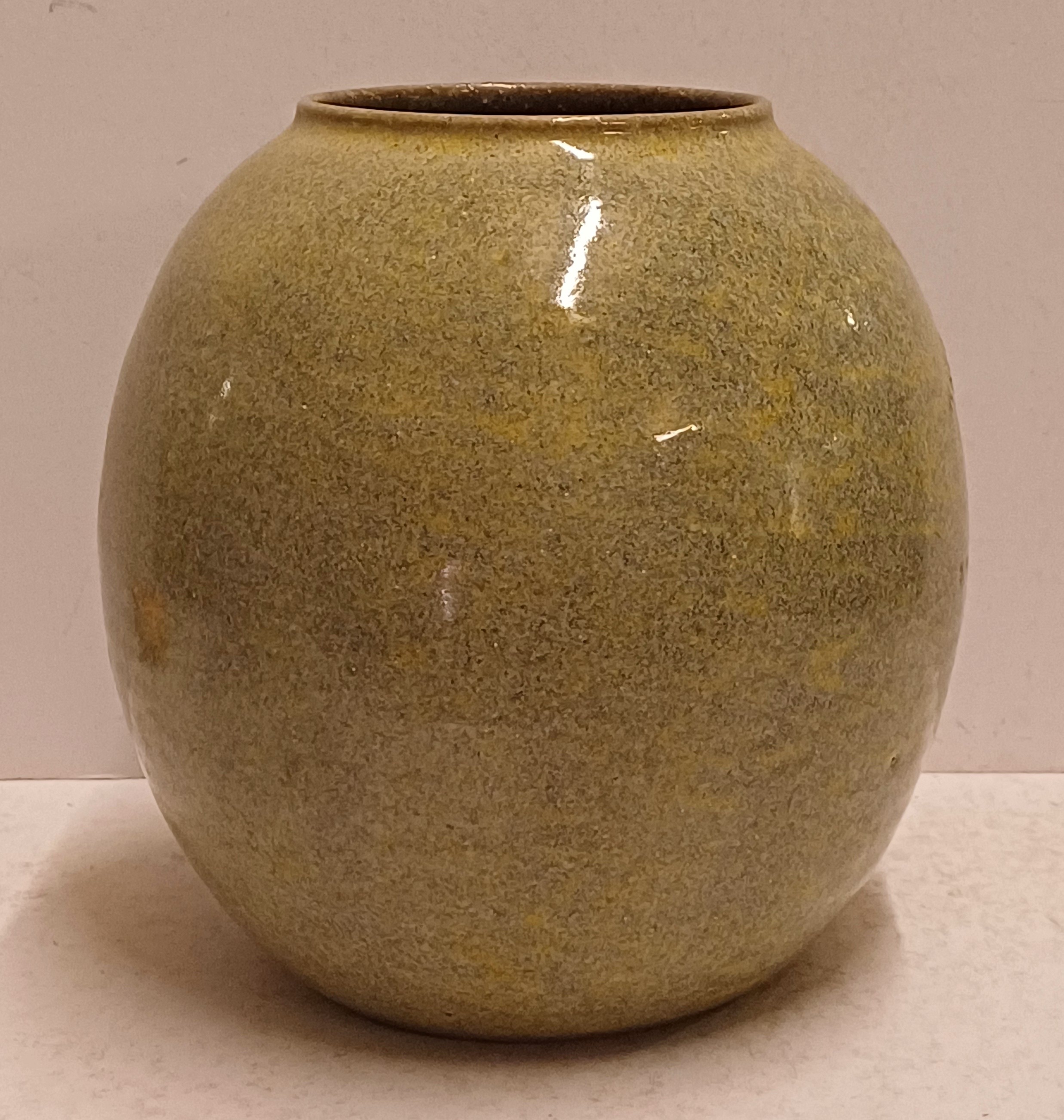 Groot formaat vaas met lichte beige glazuur met gele gloed. Onderzijde alleen met romeins cijfer geen fabrieksmerk.