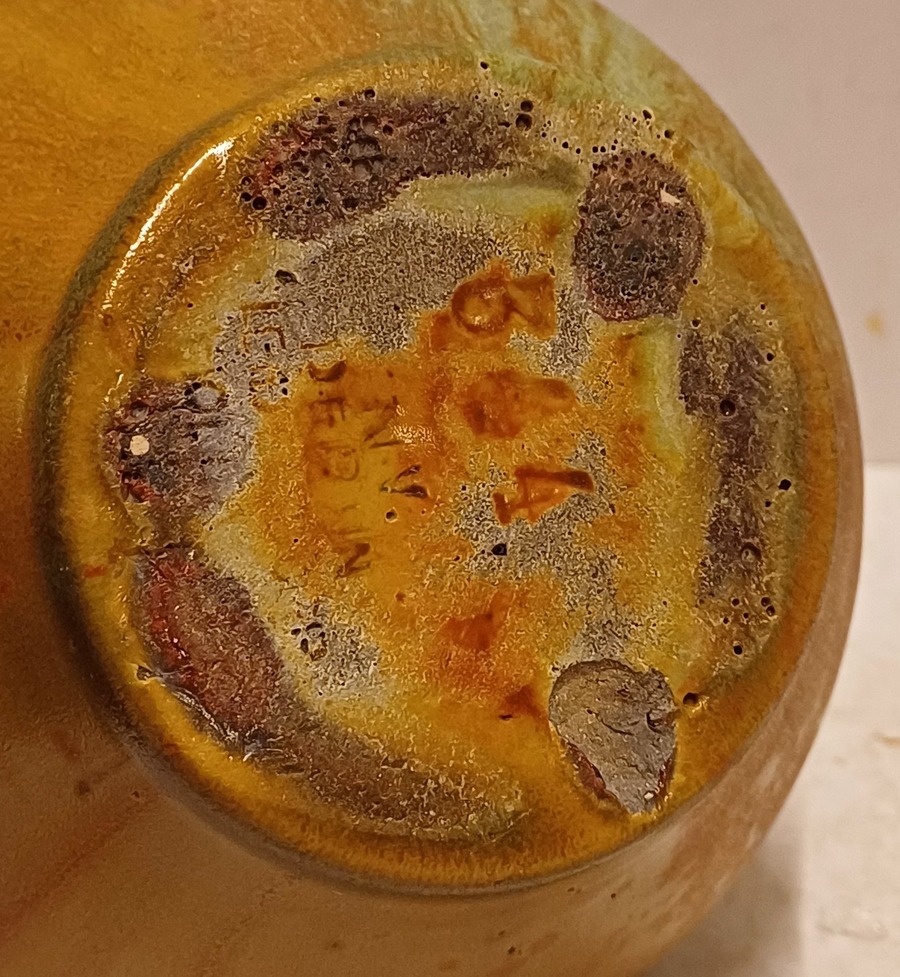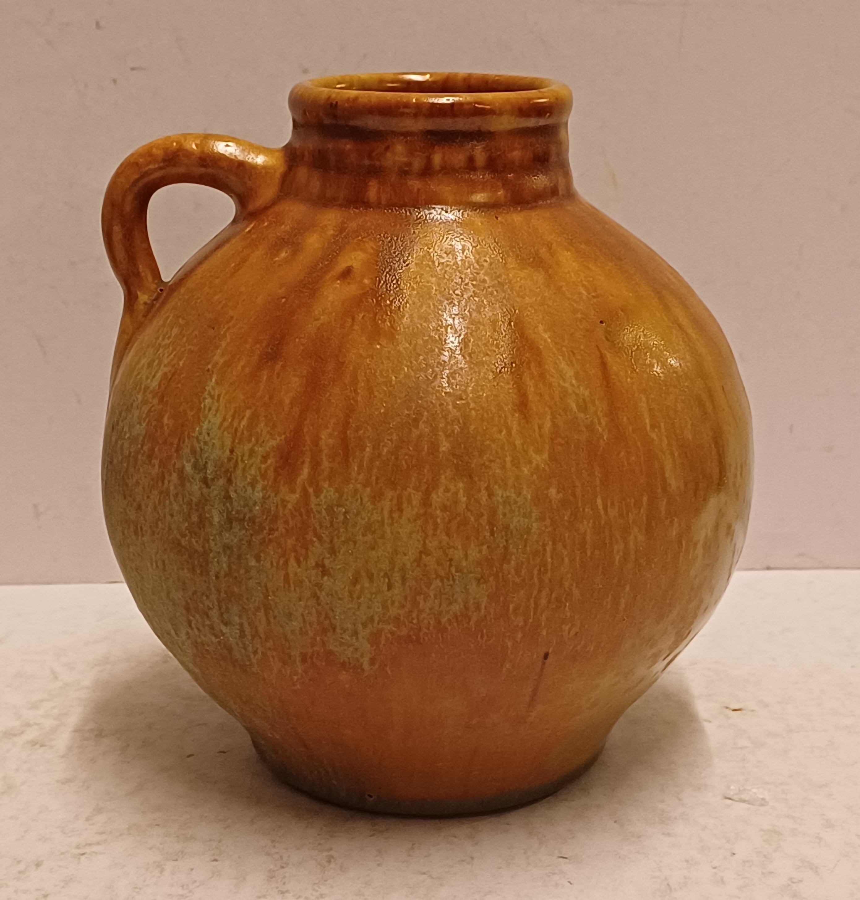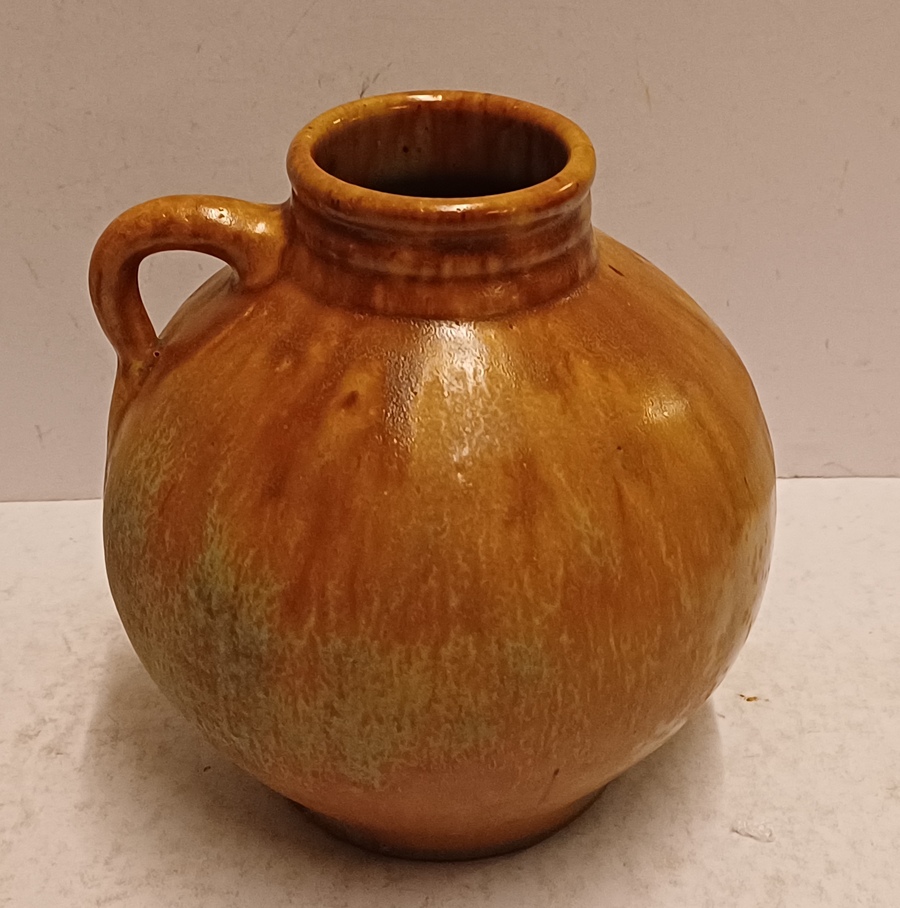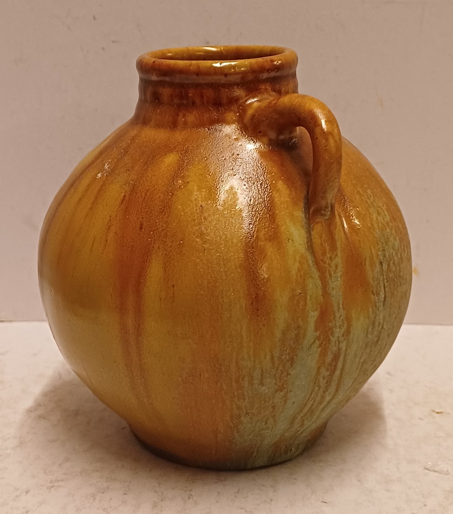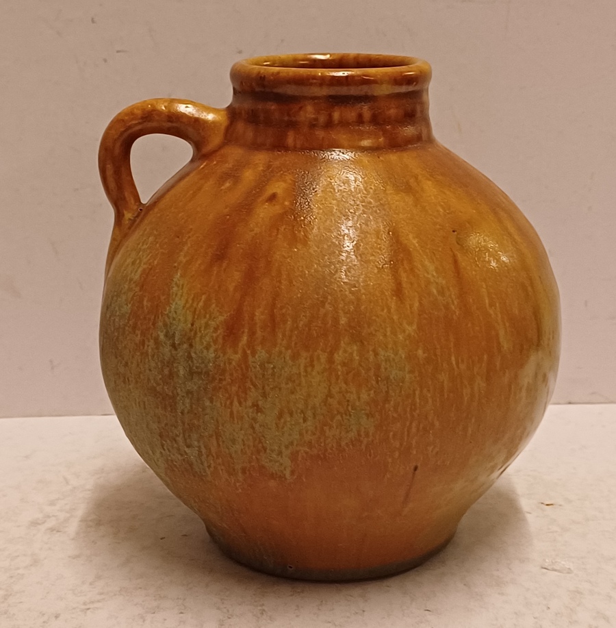 Vaasje met oor met matte glazuur. Onderzijde met fabrieksmerk.