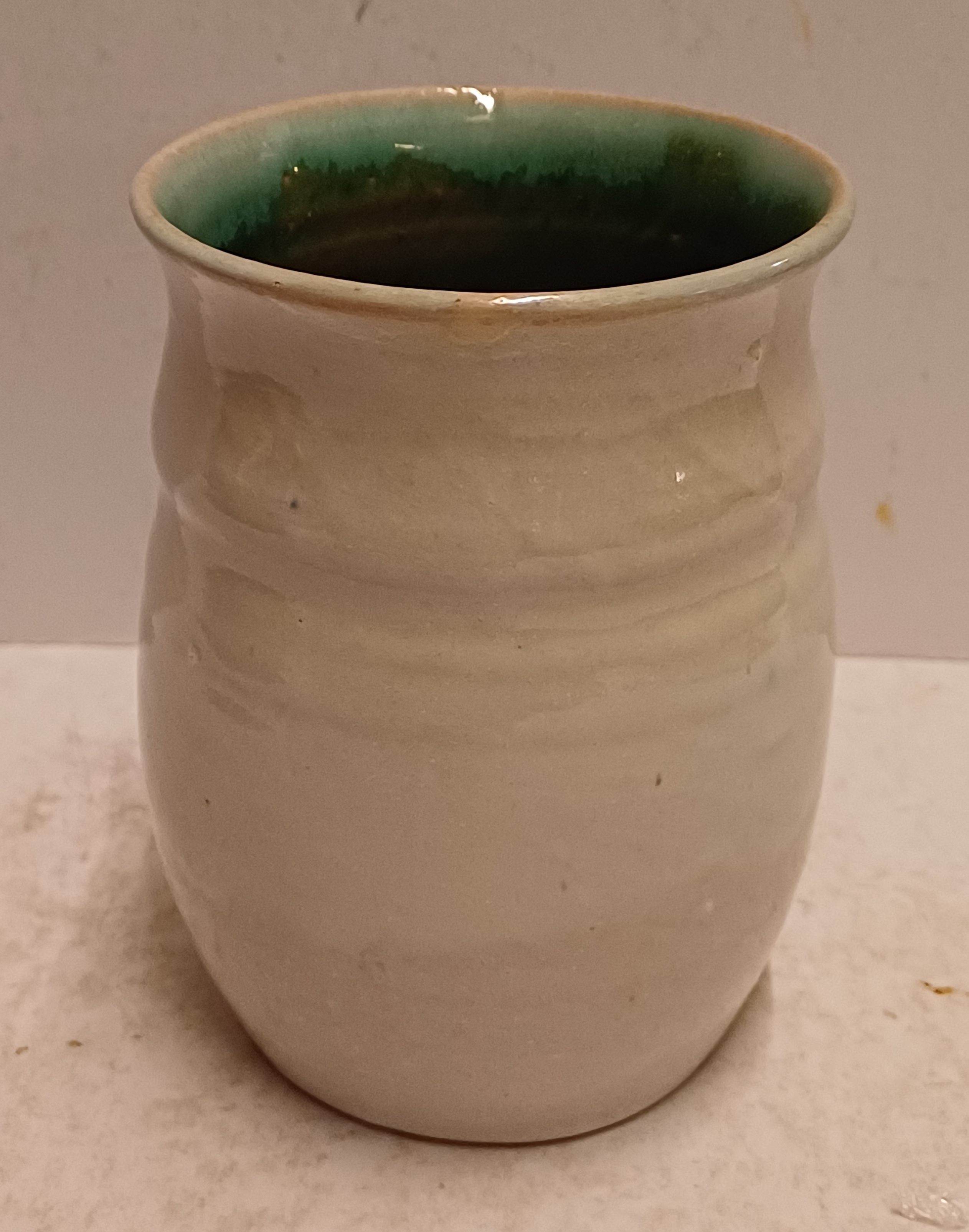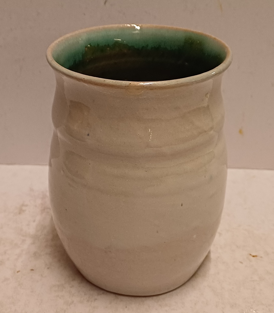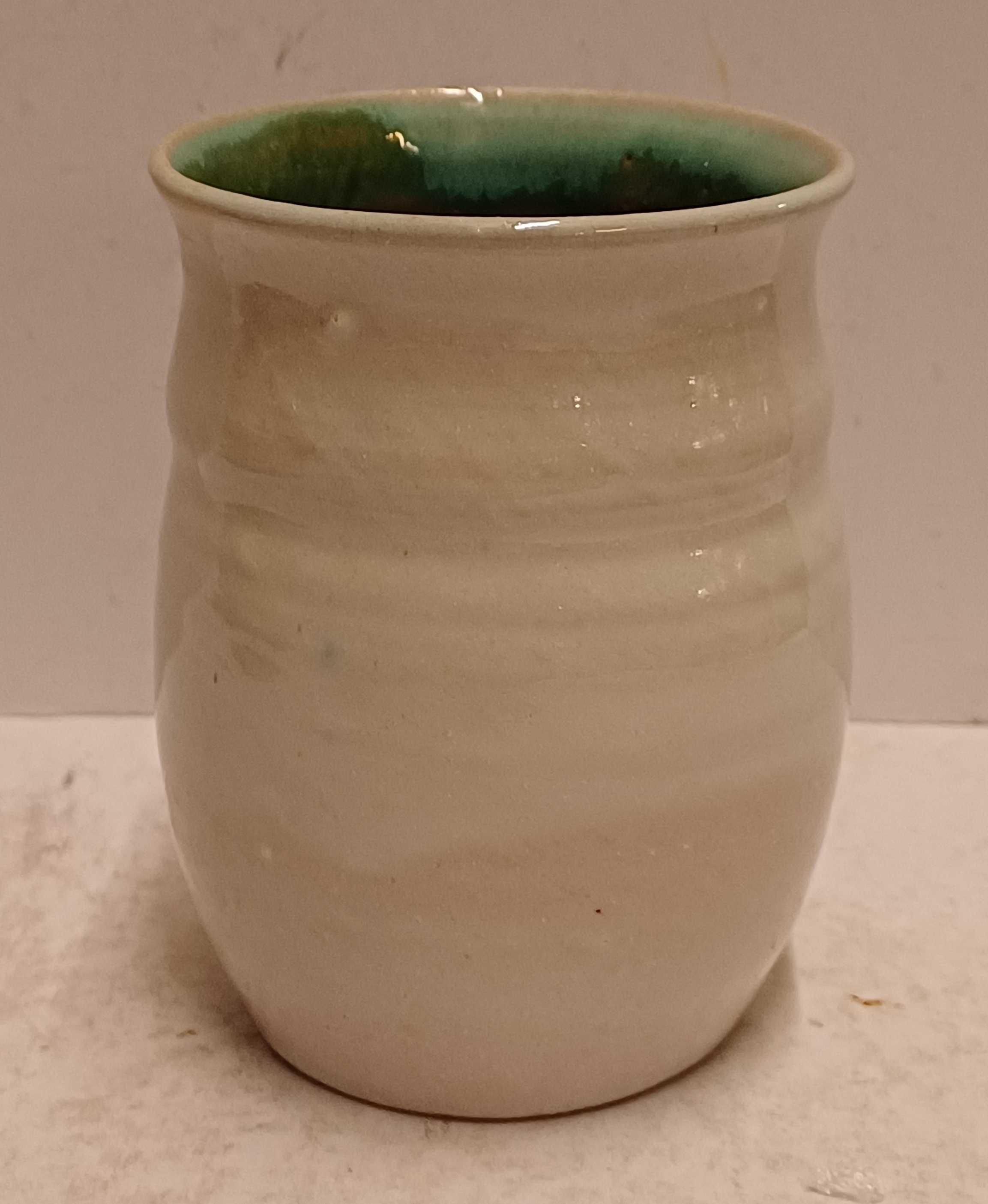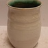 Vaasje met witte tinglazuur en groene binnenzijde. Onderzijde met fabrieksmerk.