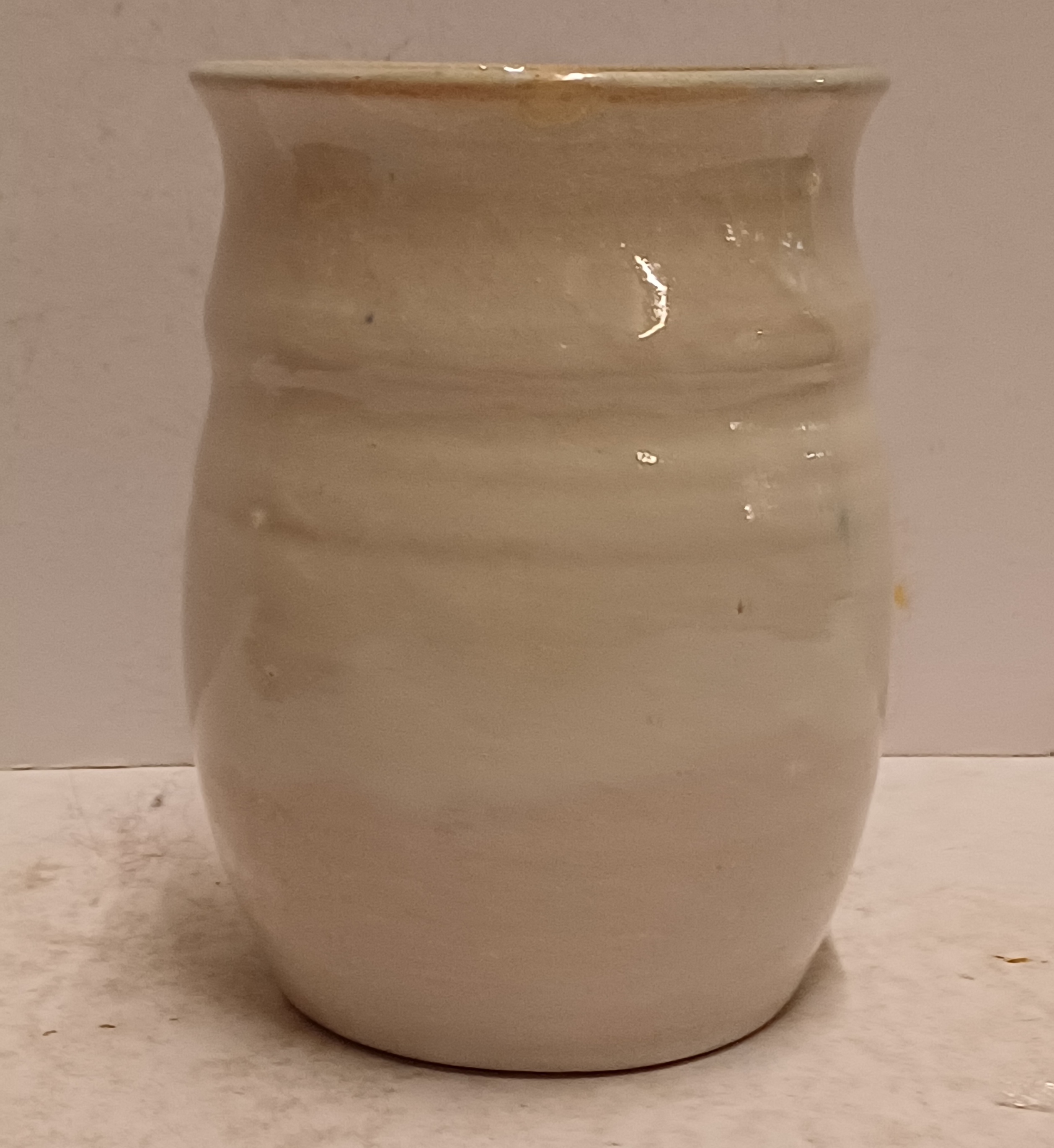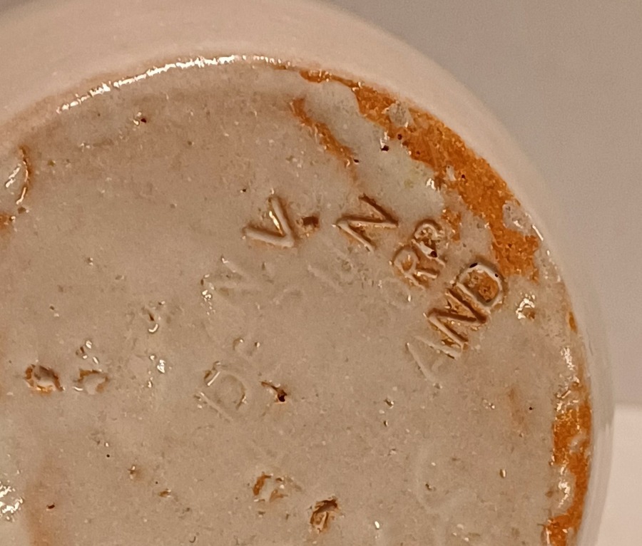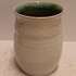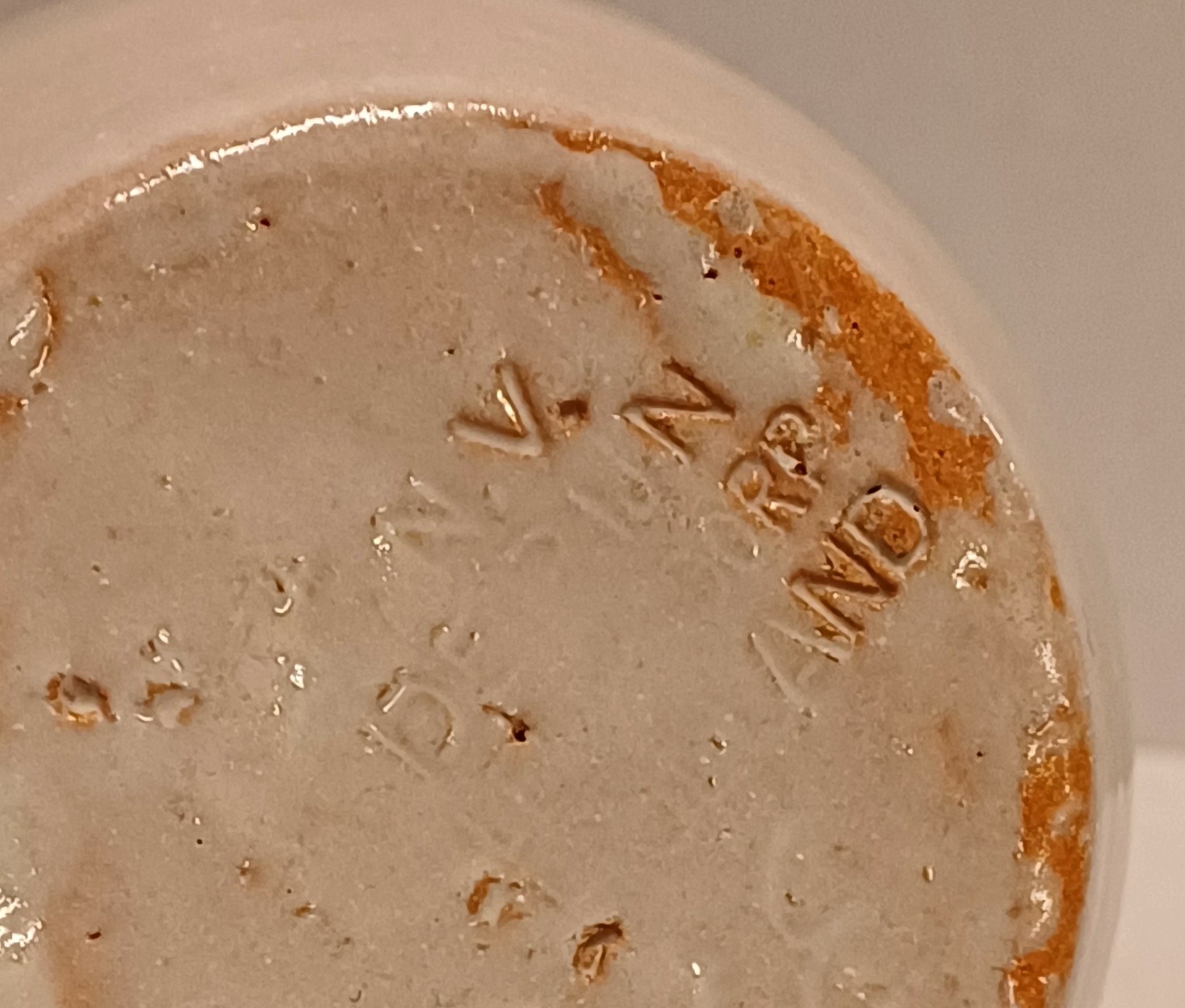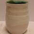 Vaasje met witte tinglazuur en groene binnenzijde. Onderzijde met fabrieksmerk.