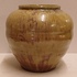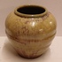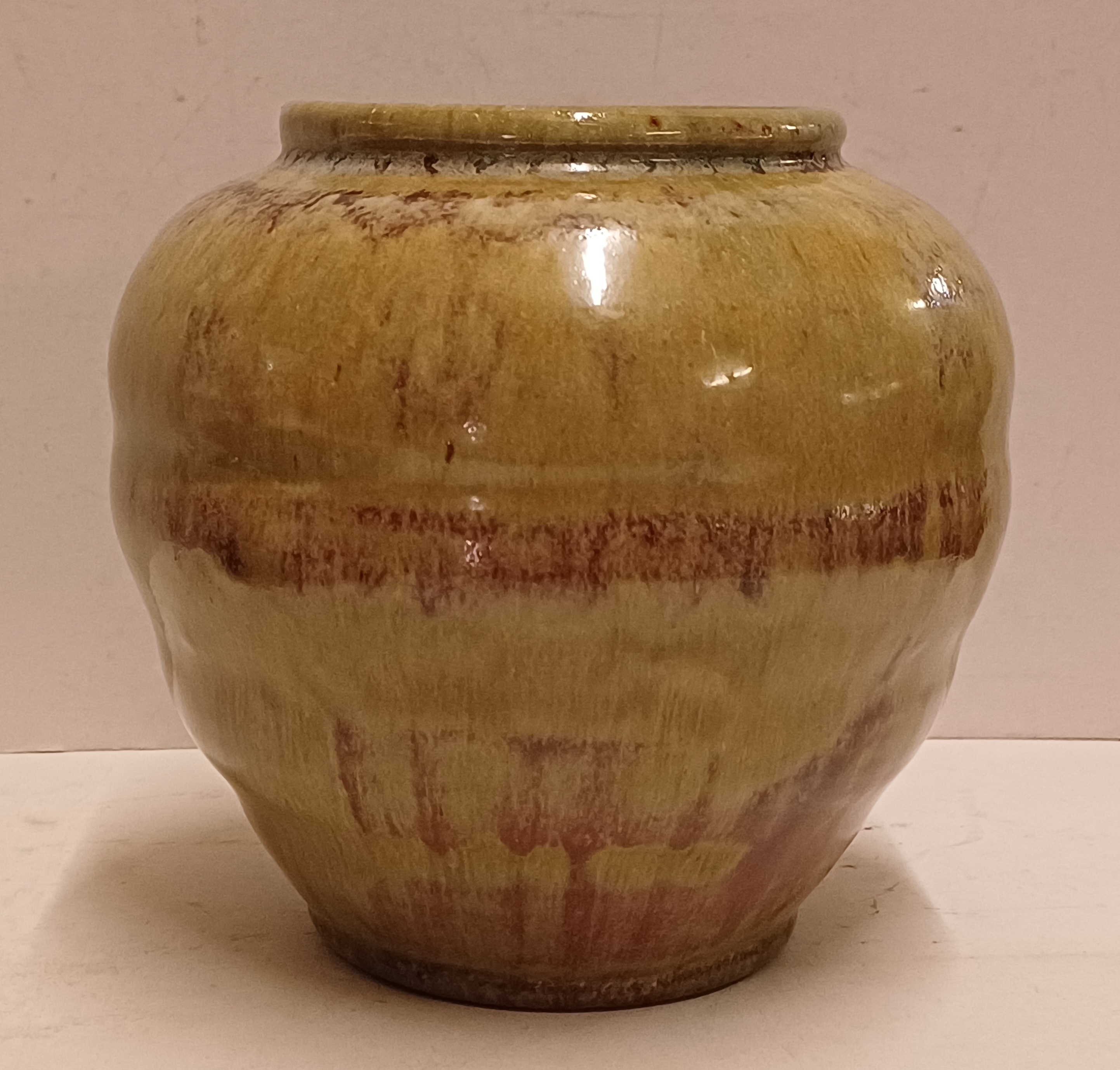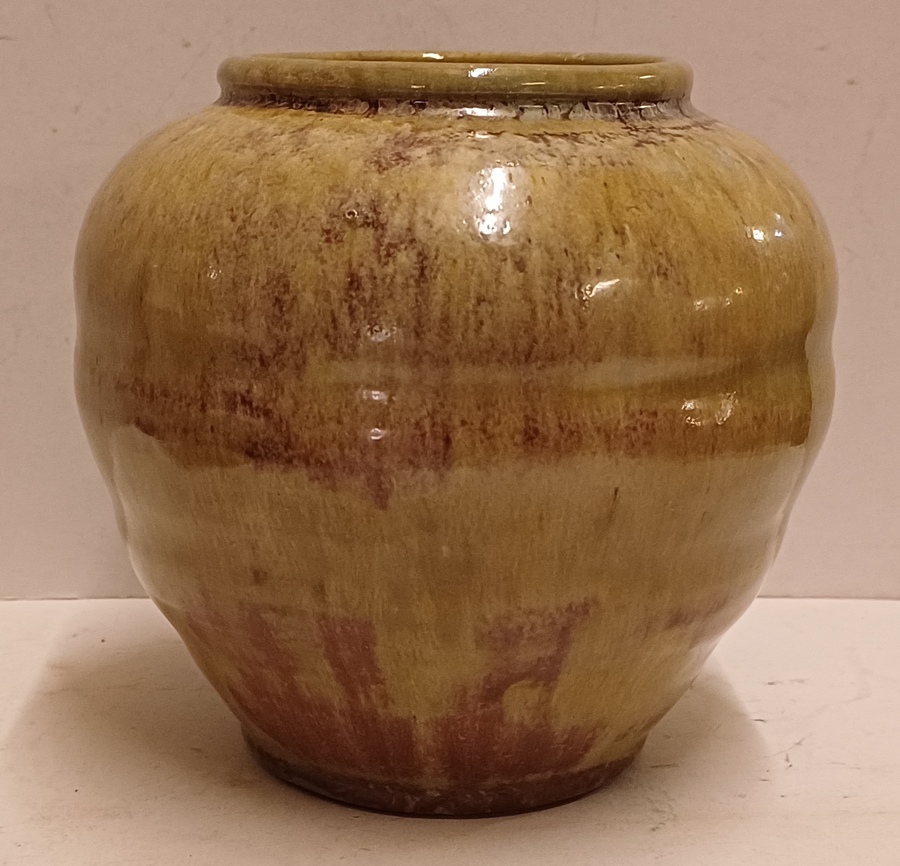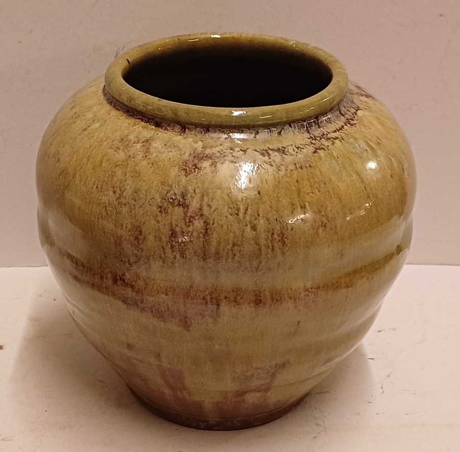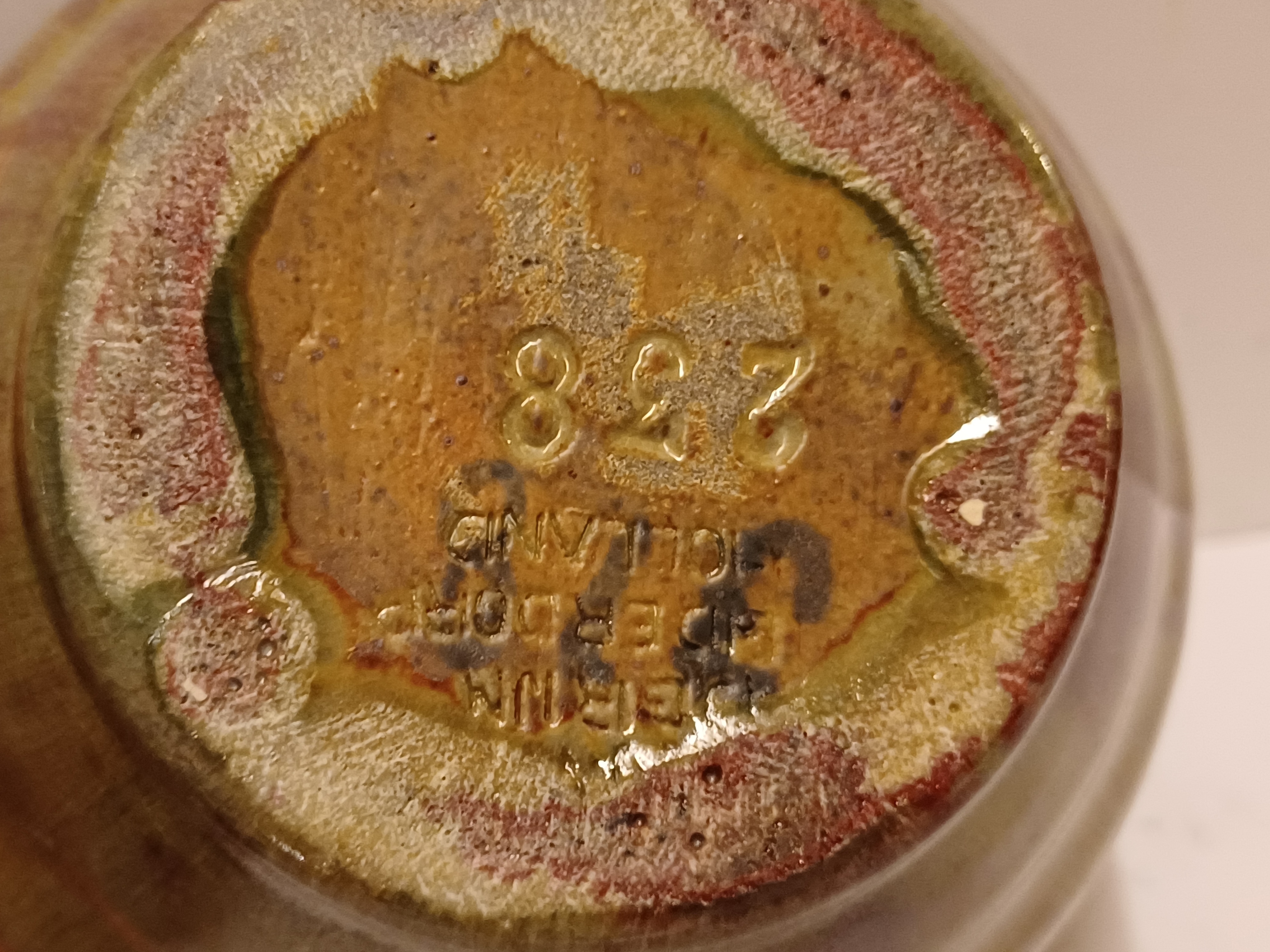 Aardewerken vaas met grijs groene stroomglazuur. Onderzijde met fabrieksmerk.