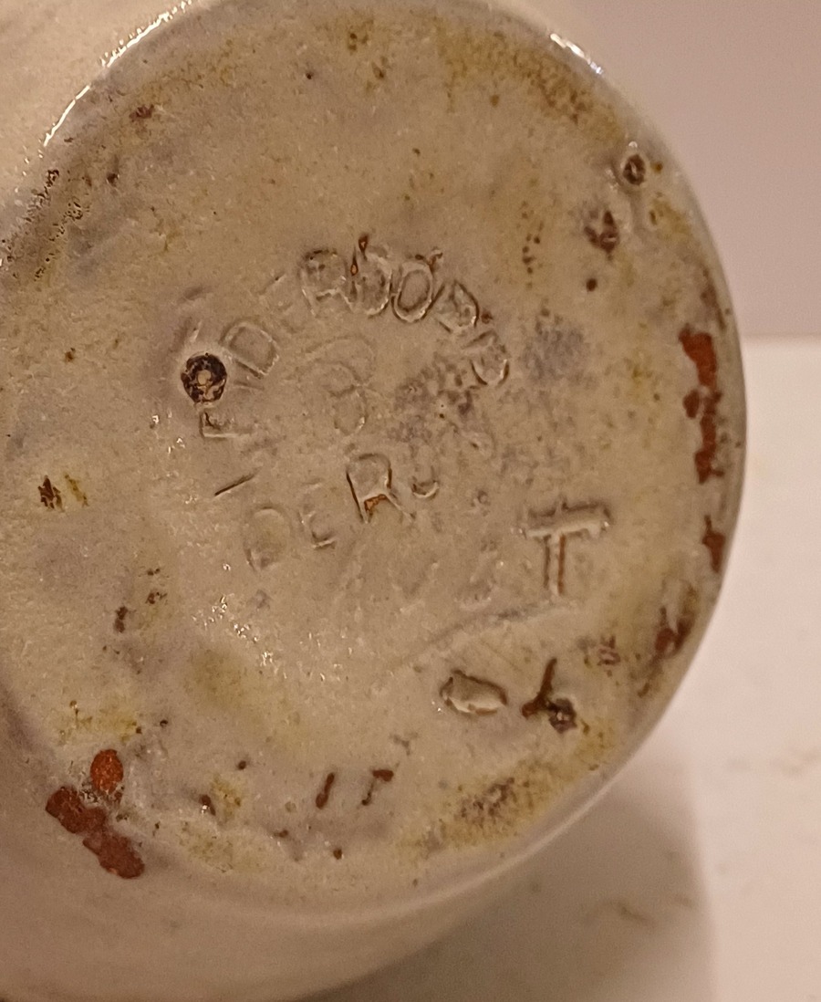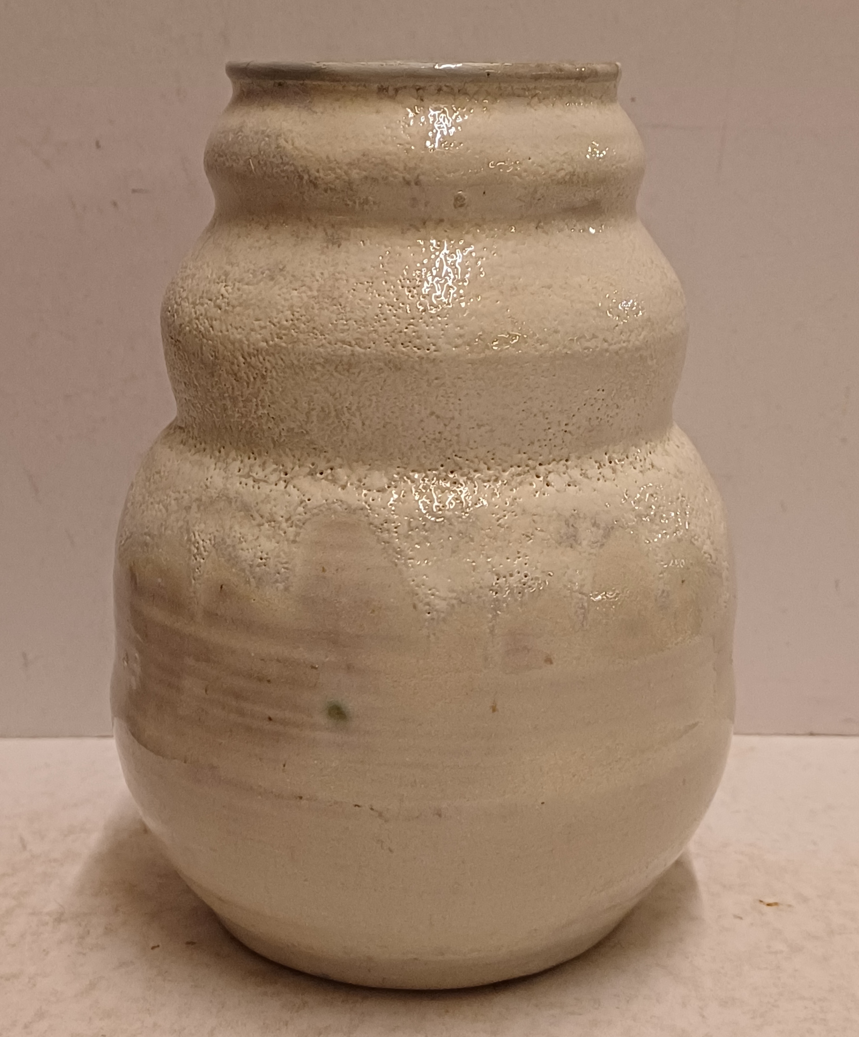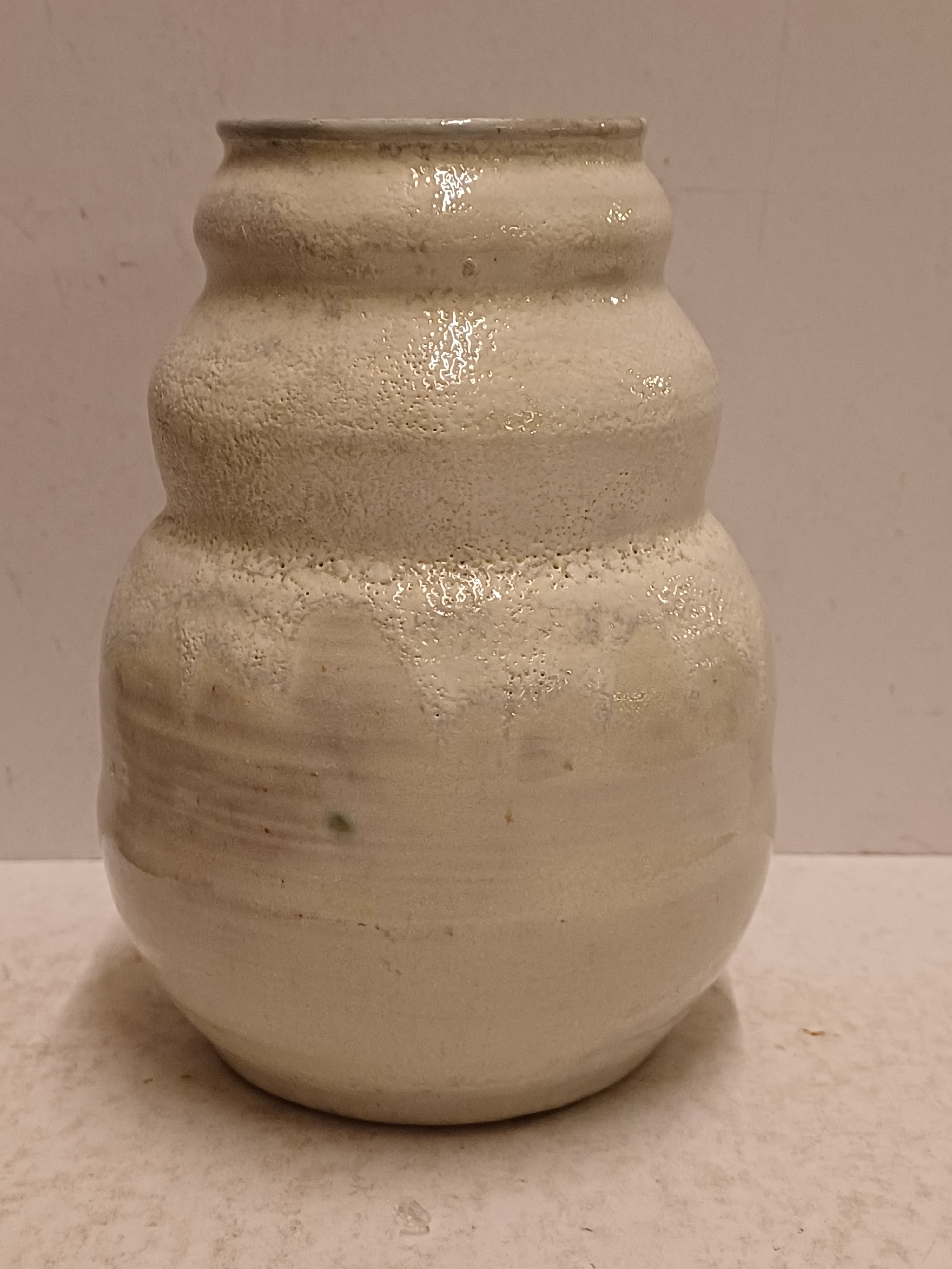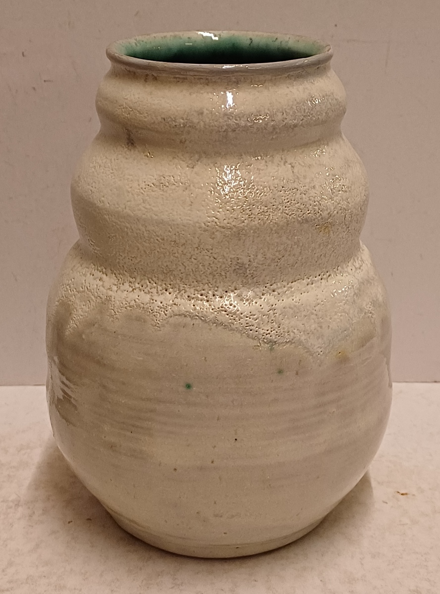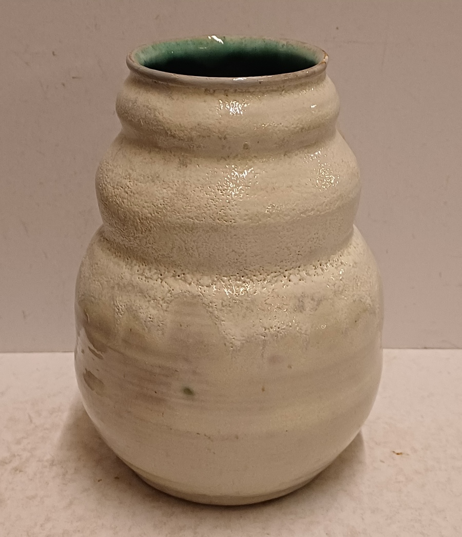 Vaas met witte tingalzuur en groene binnenzijde. Onderzijde met fabrieksmerk.