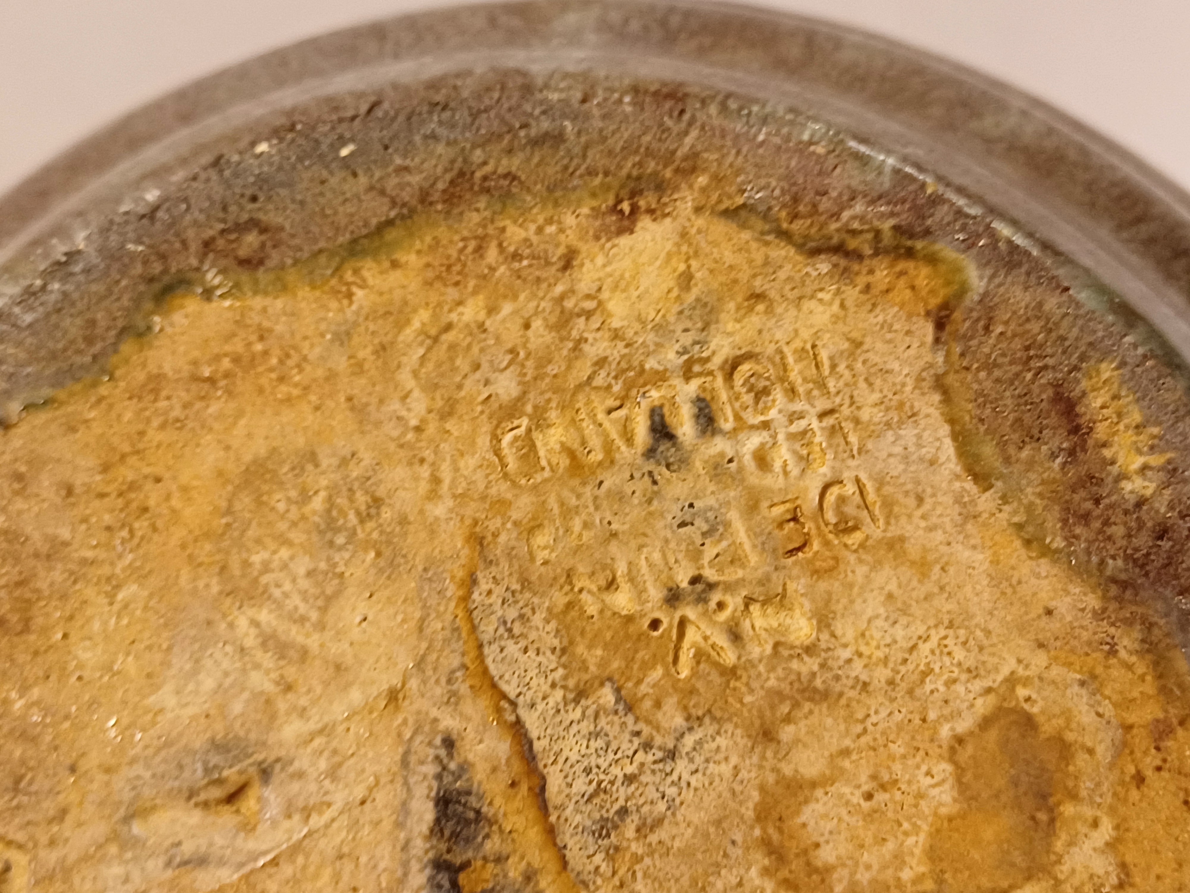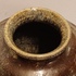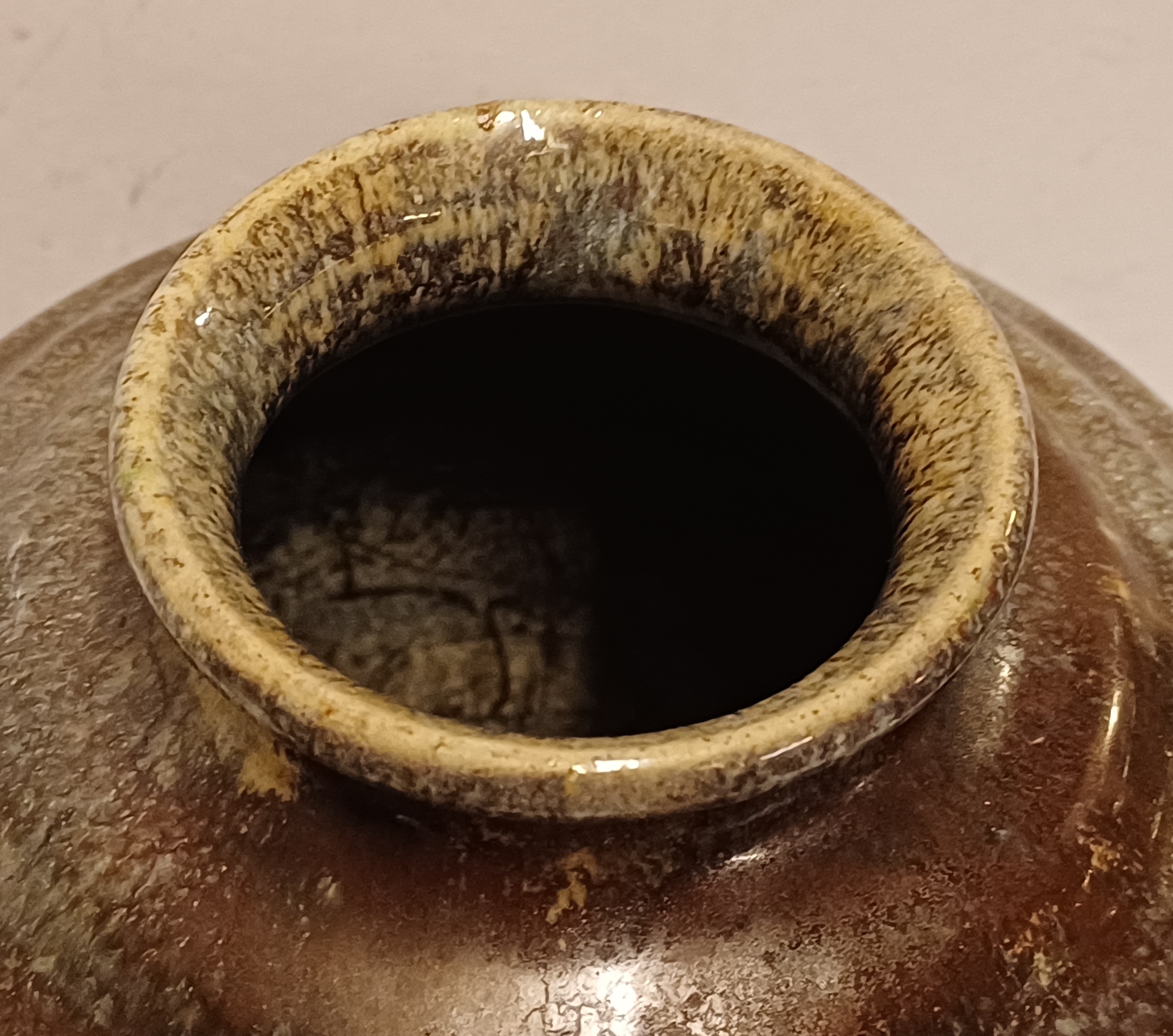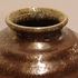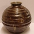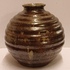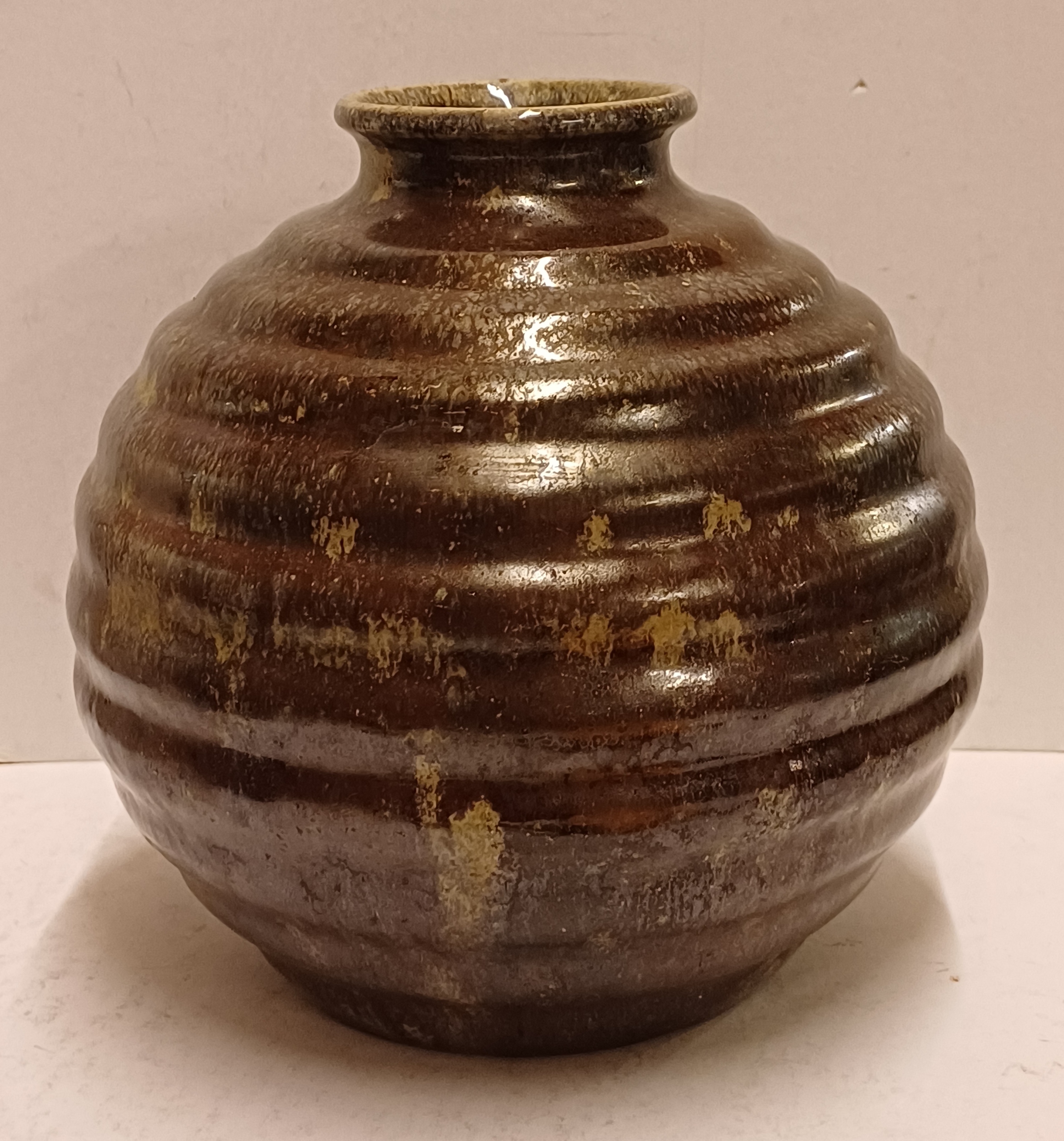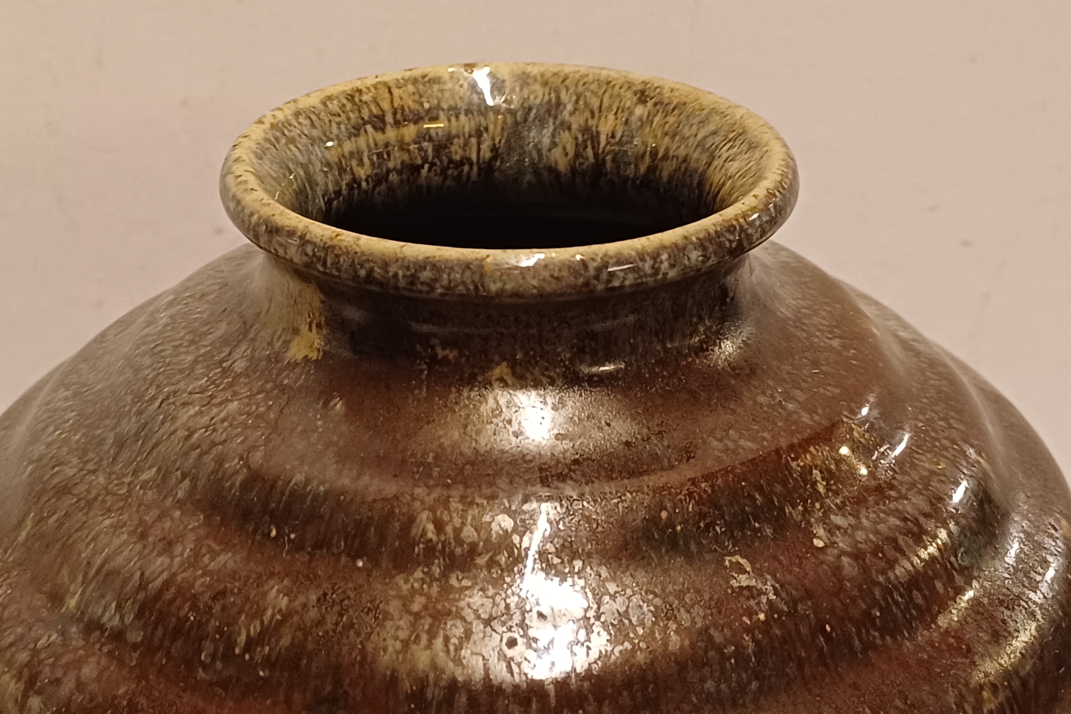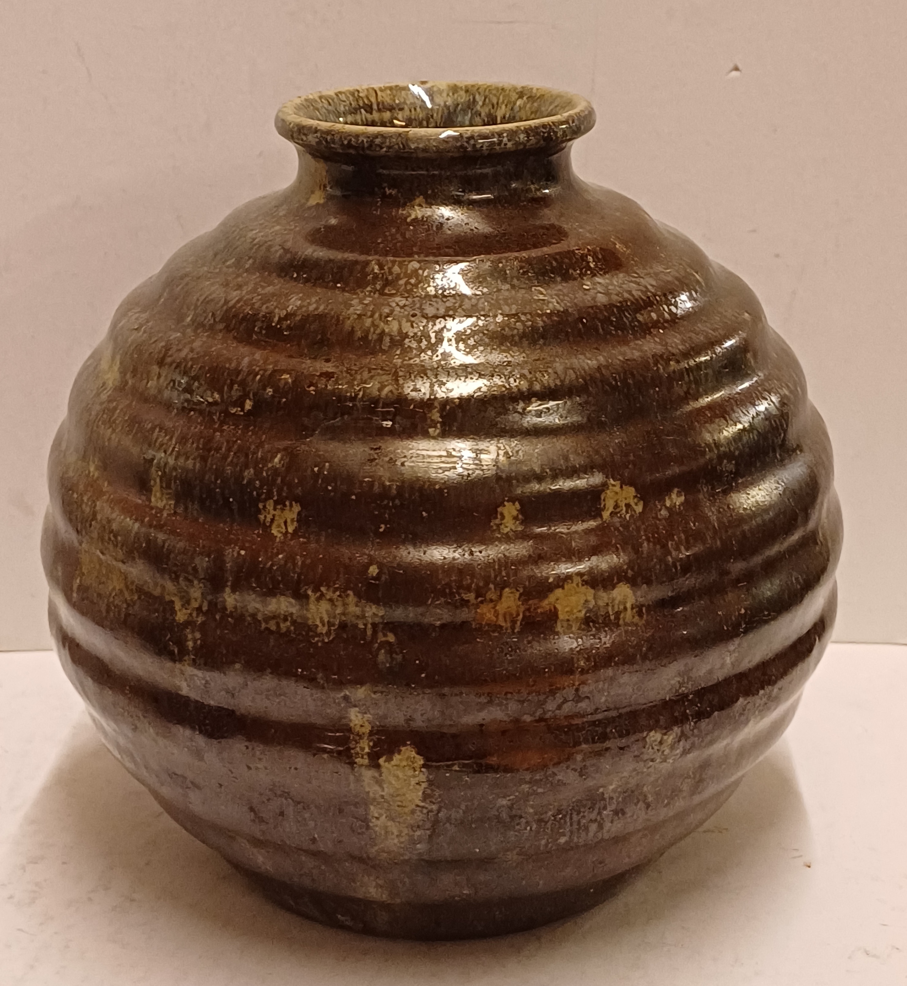 Bolle vaas met brede ribbel met metallic stroomglazuur. Onderzijde met fabrieksmerk.