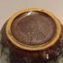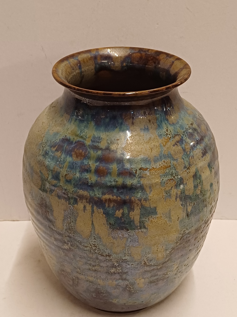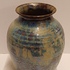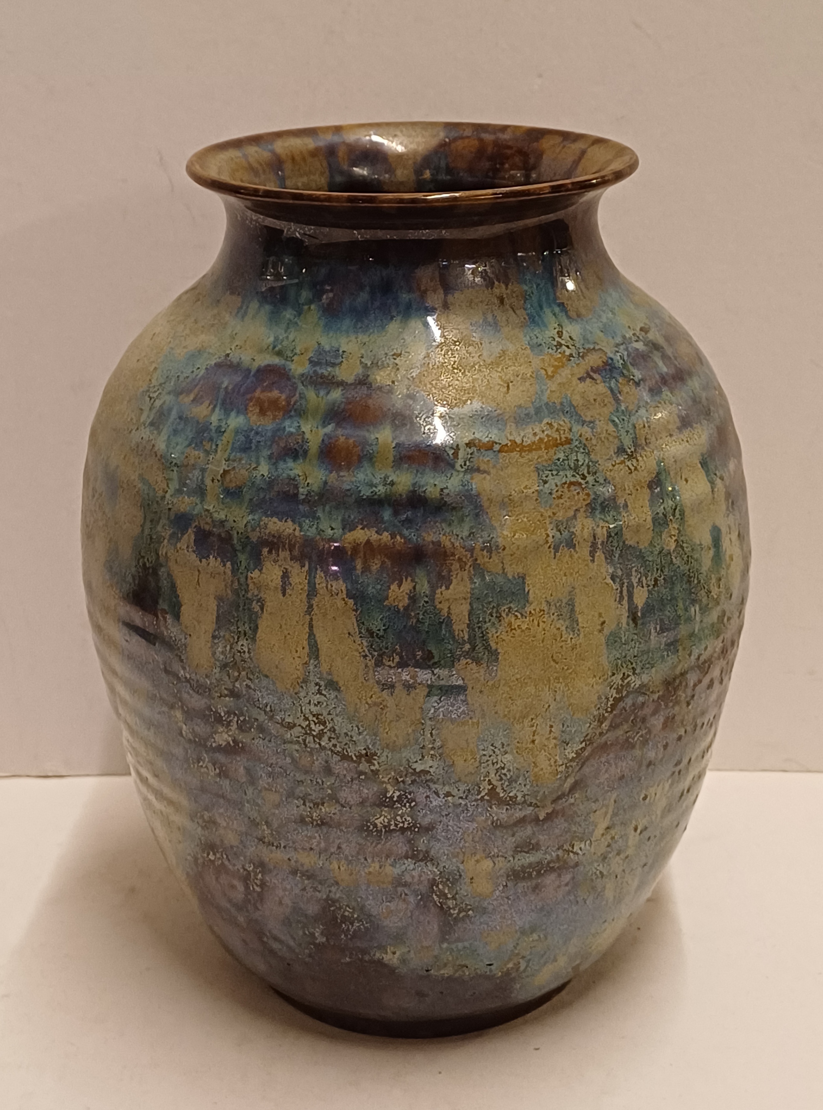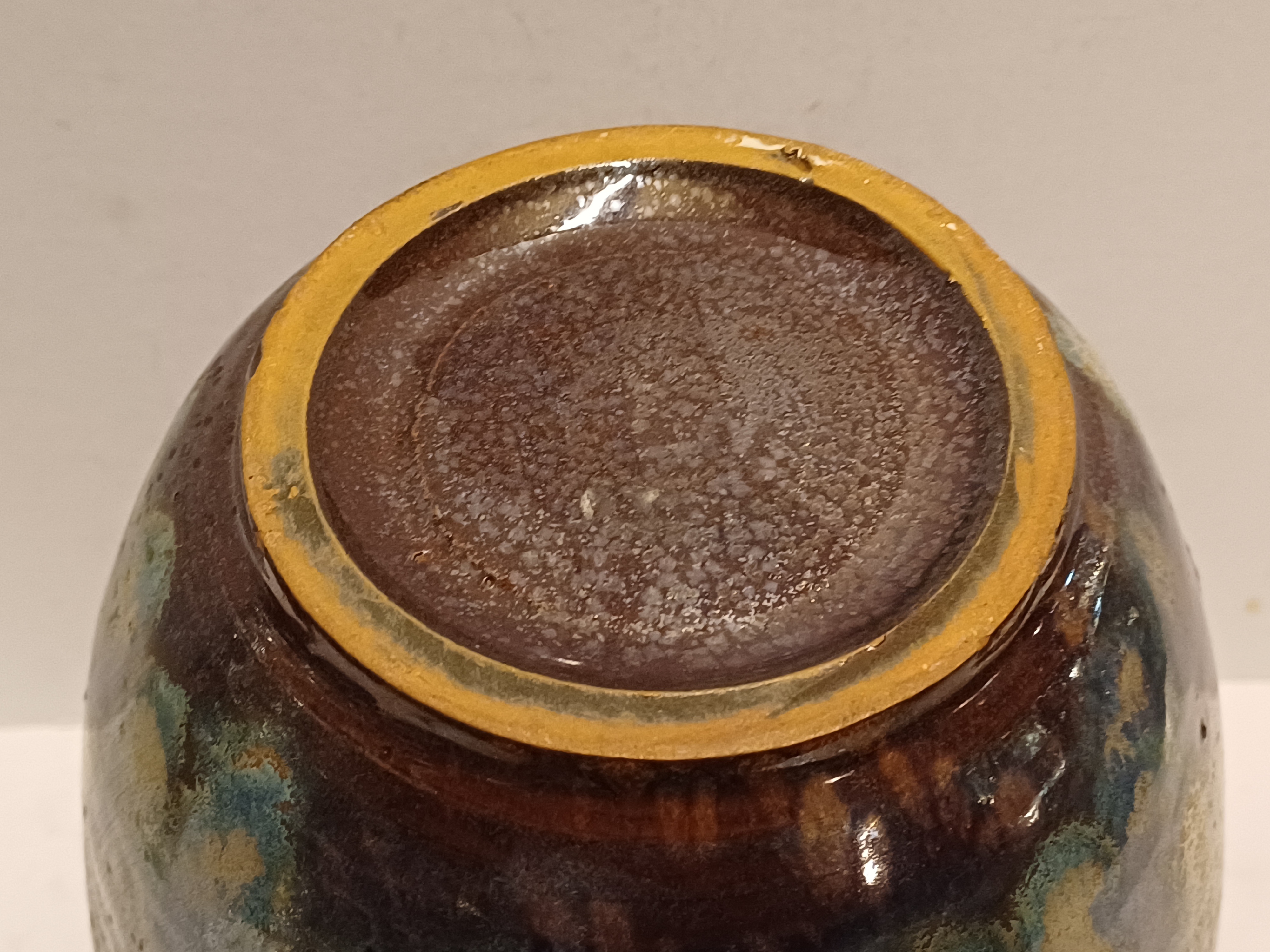 Vaso in terracotta fatto a mano con smalto metallico scuro. Parte inferiore non firmata.