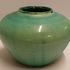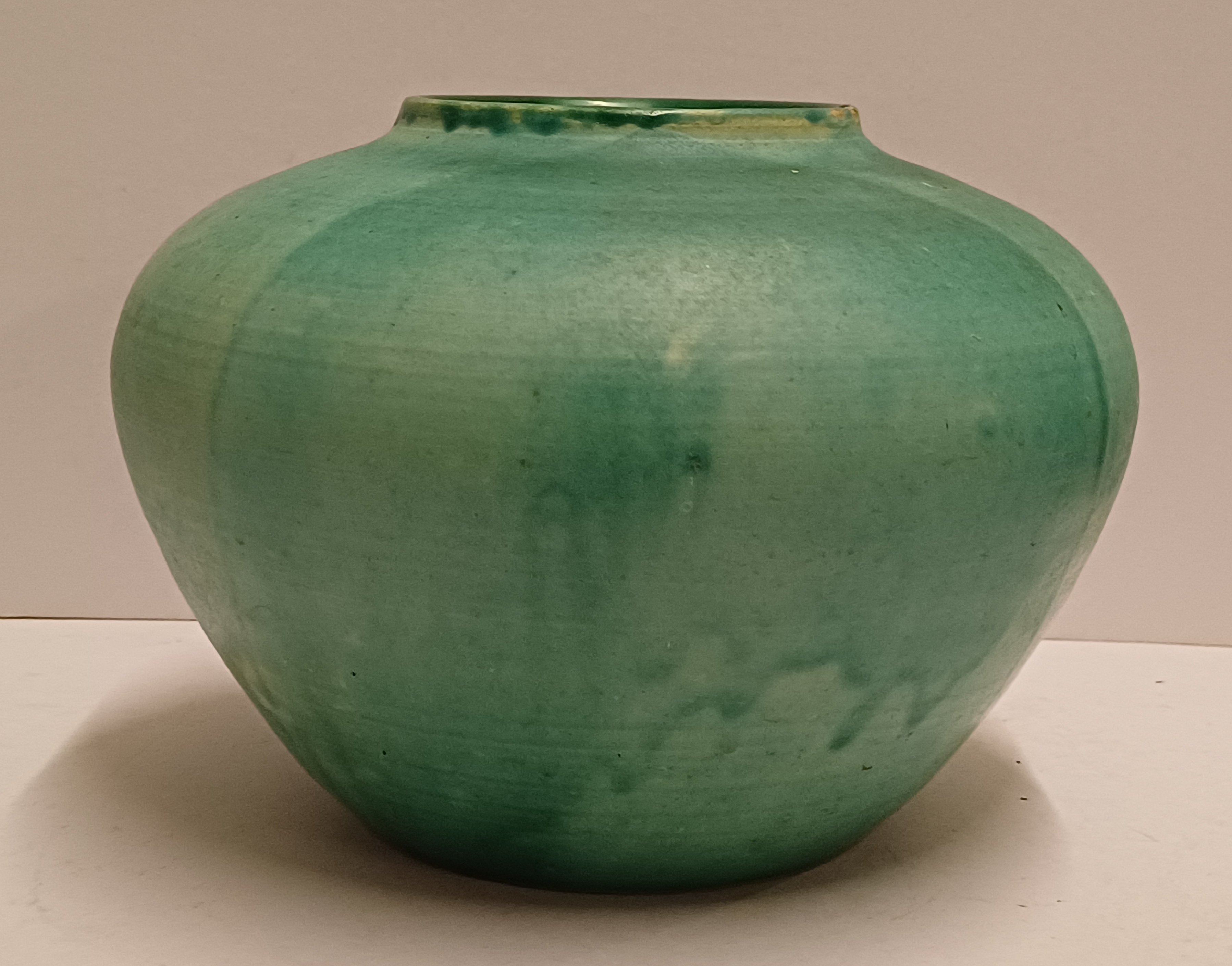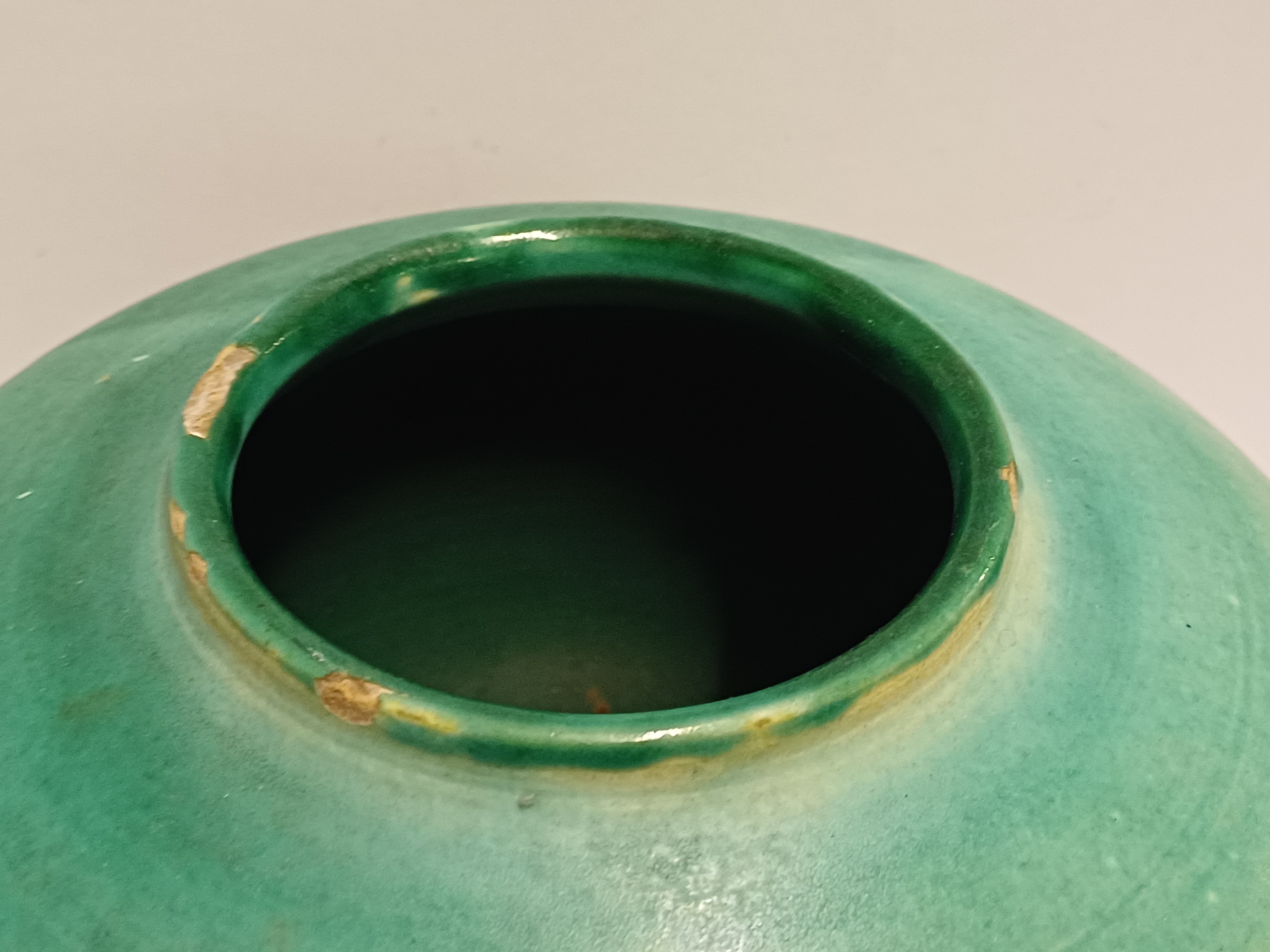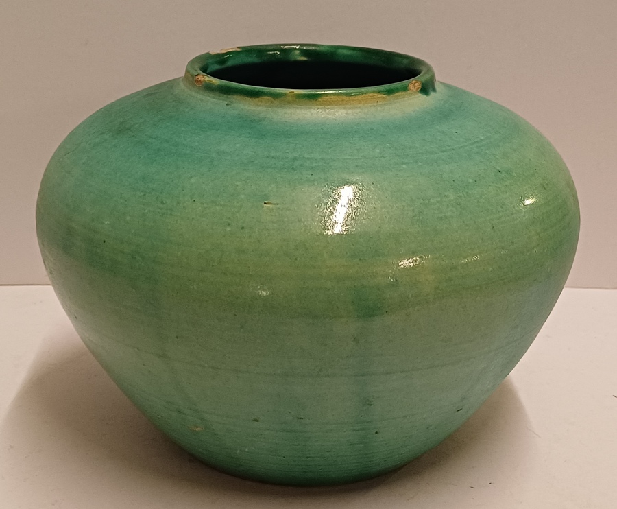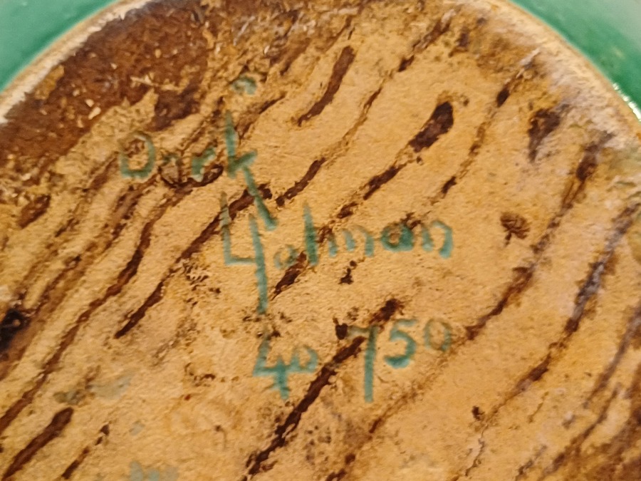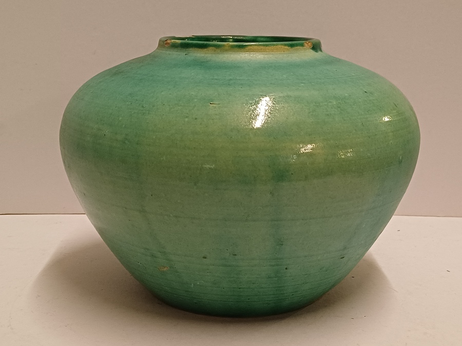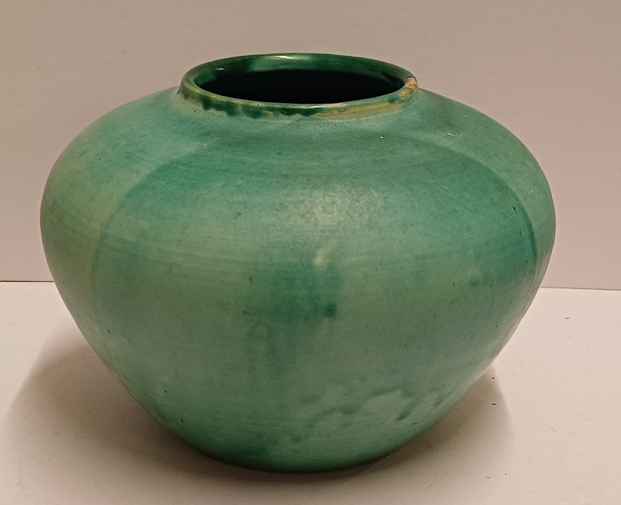 Vroege aardewerken hand gedraaide vaas met mat groene glazuur. Onderzijde met ingekraste signatuur Derk Holman (19)40-750.