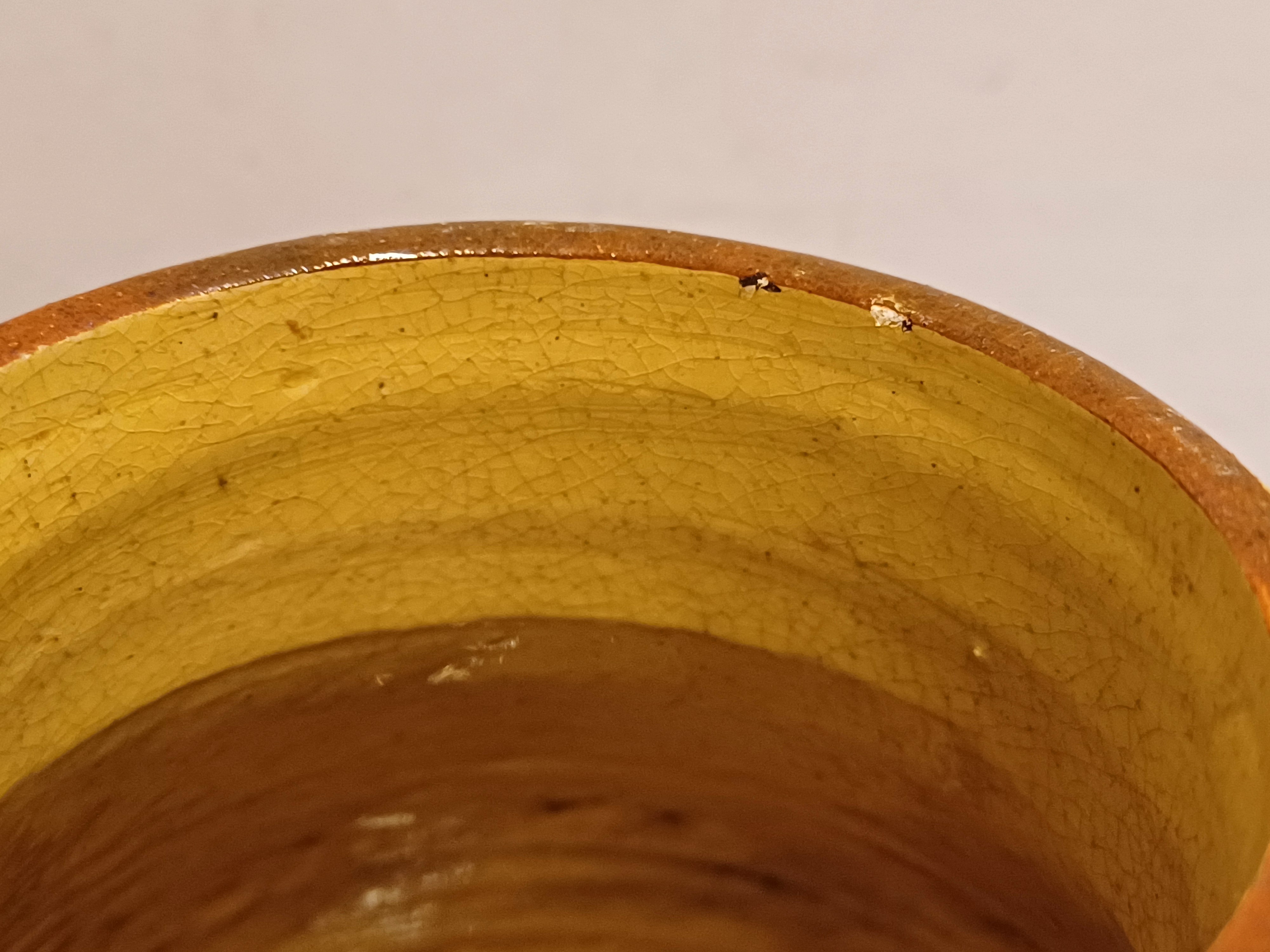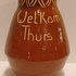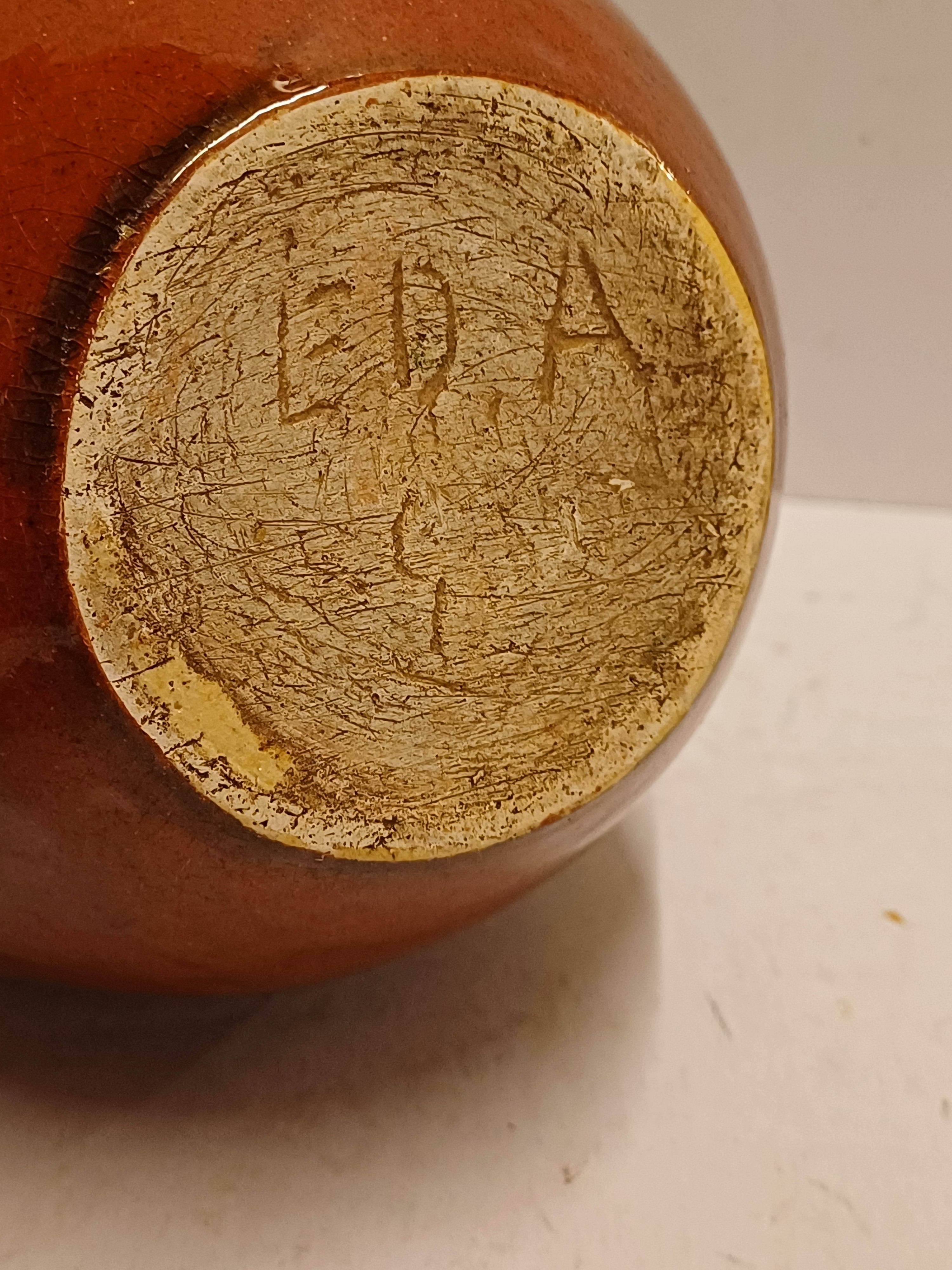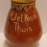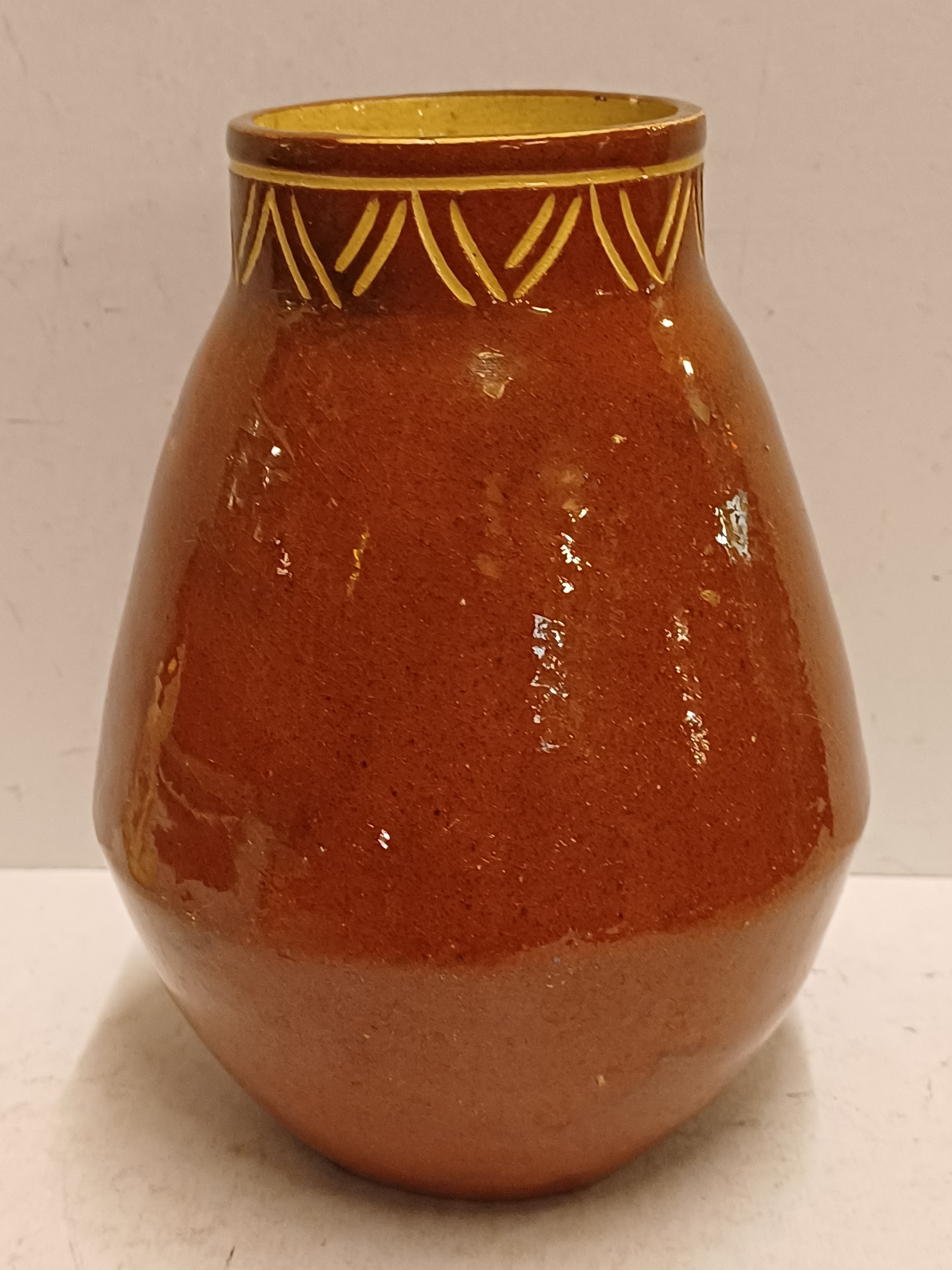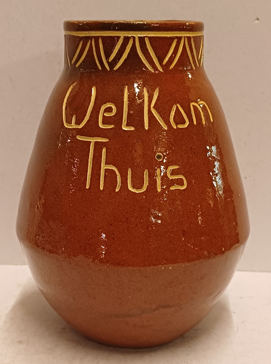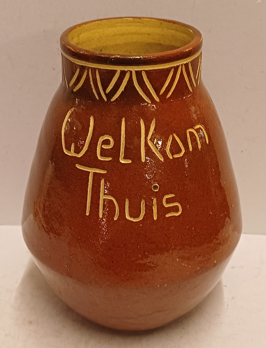 Vroege handgedraaide vaas met ingekerfd decor van de tekst "Welkom Thuis" en geometrisch decor aan de mondrand. Onderzijde gesigneerd