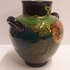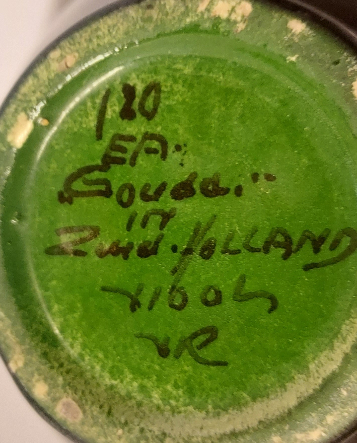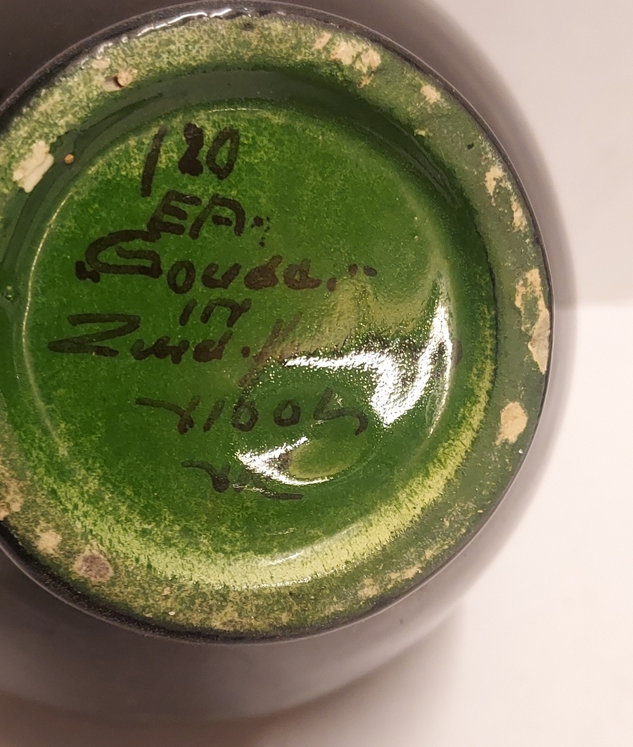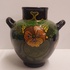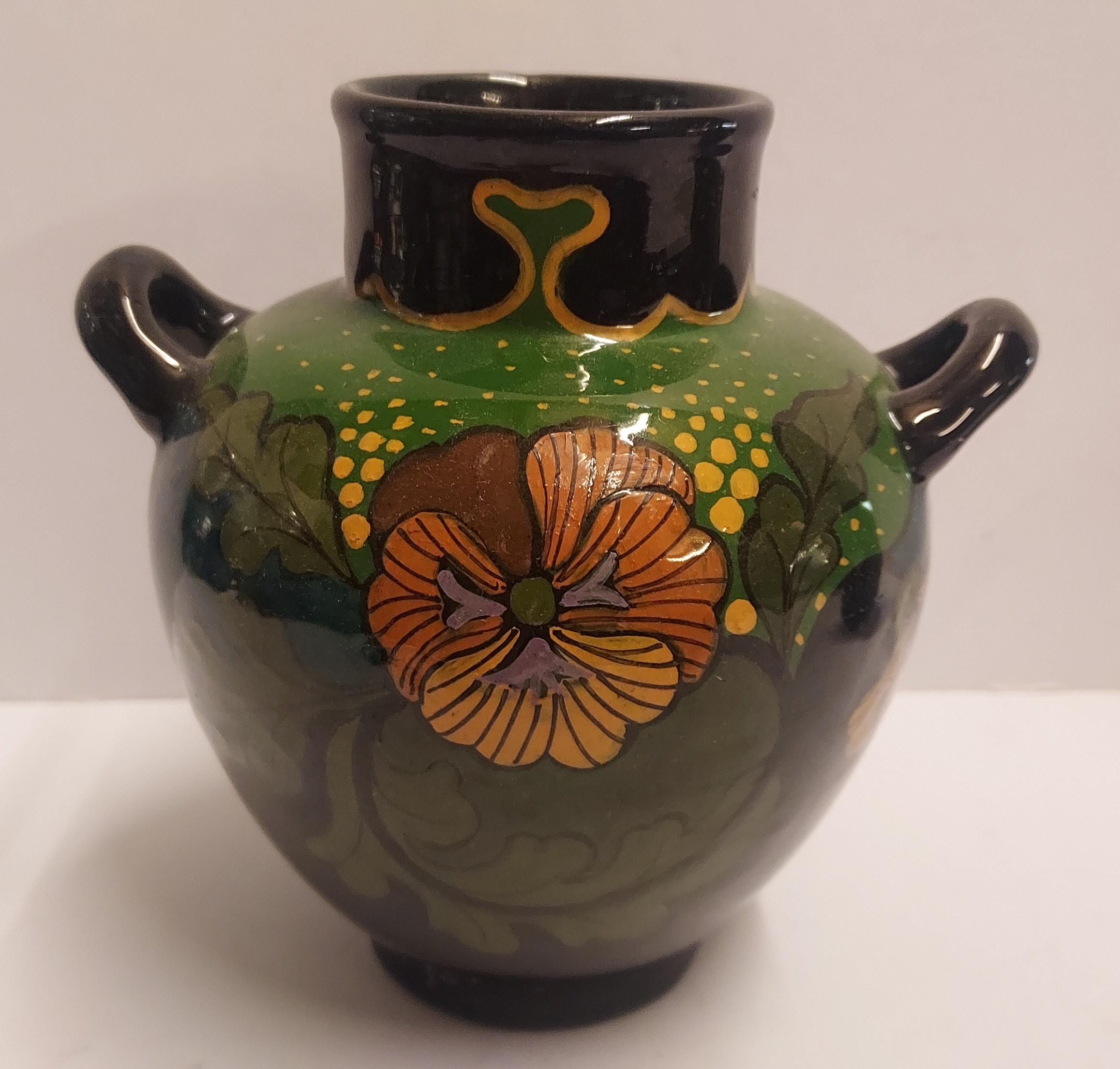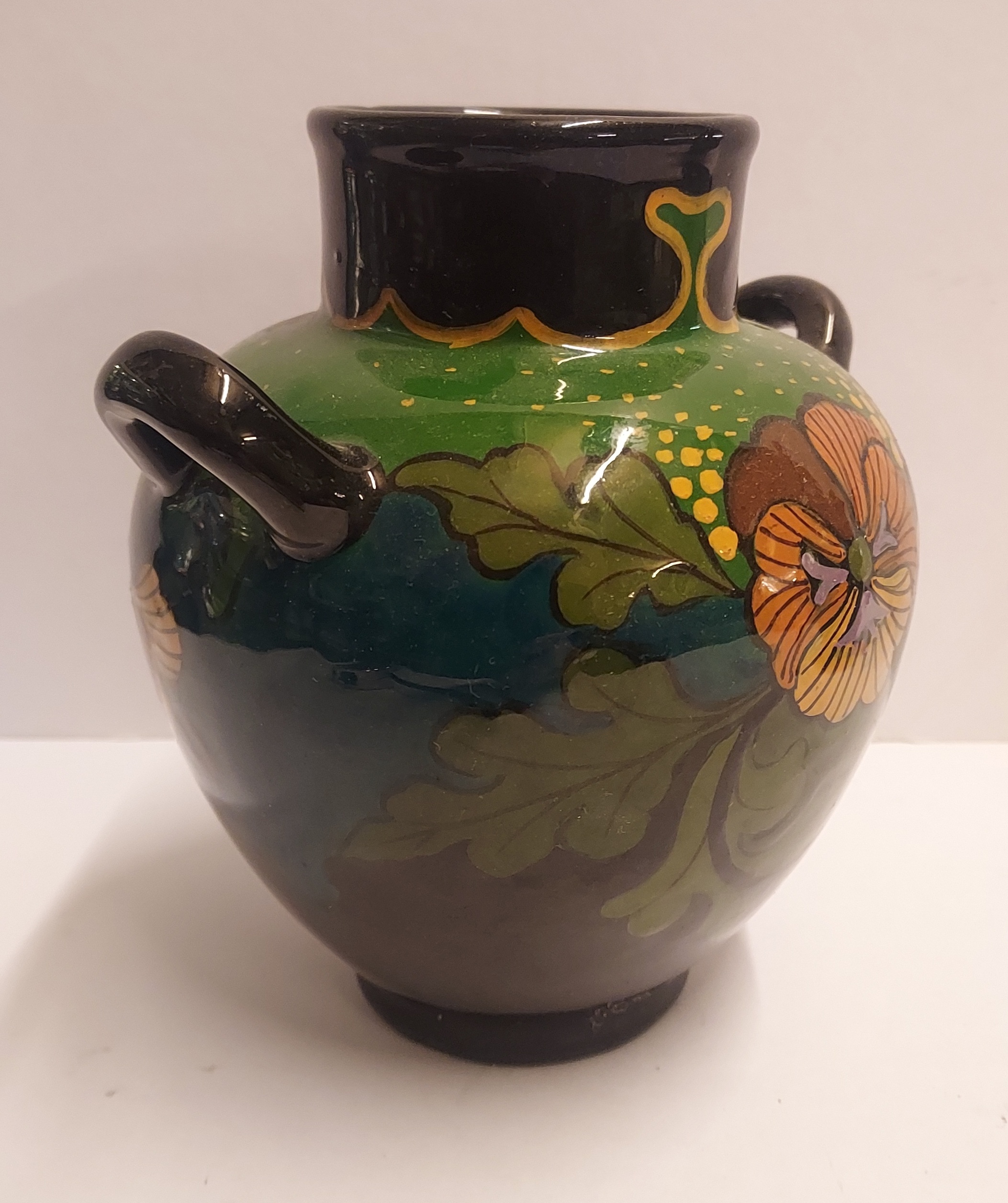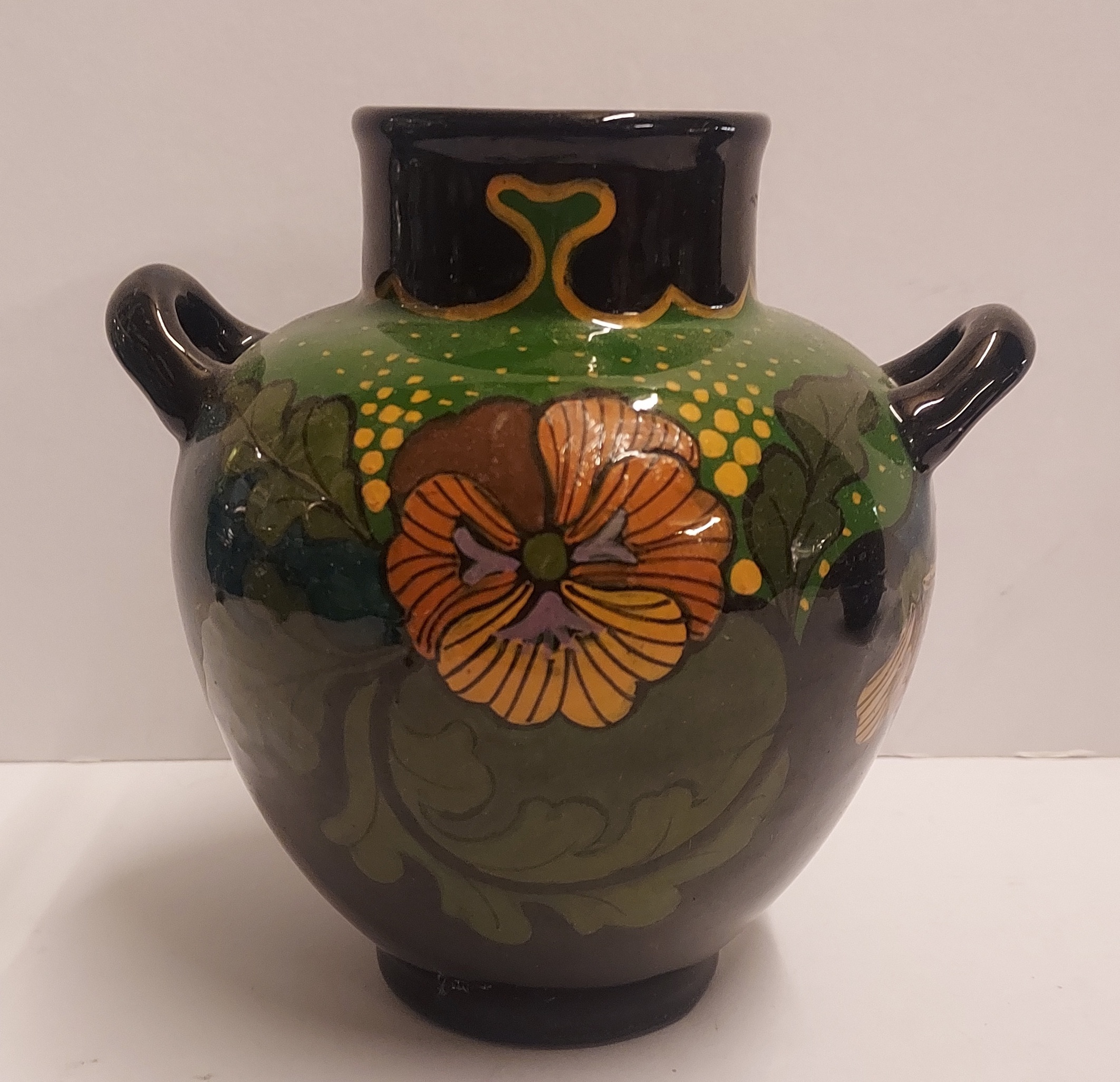 Vasetto in piastrelle lucide con due manici alti. Sul fondo marcato E.A. e nome del decoro "viool".