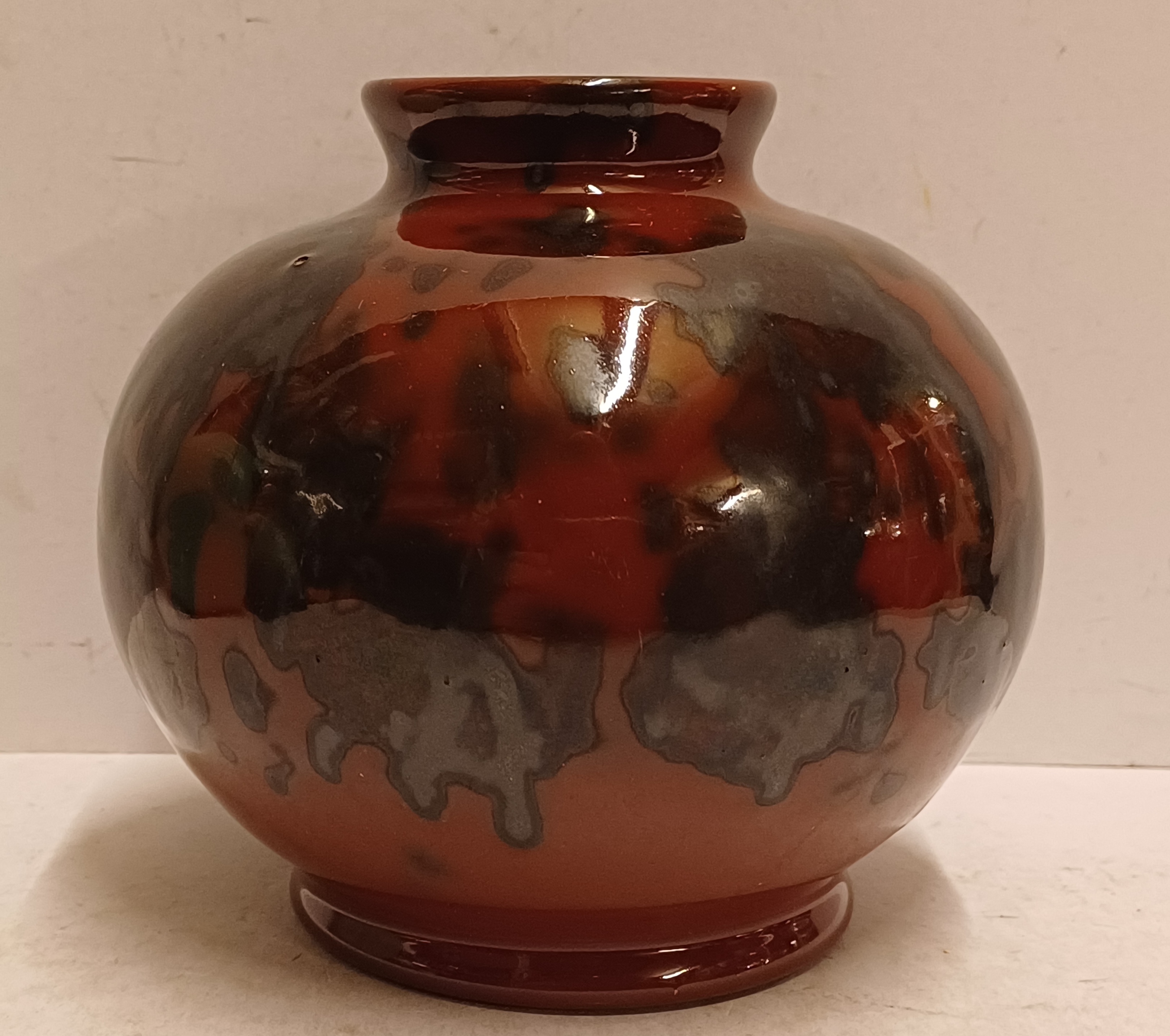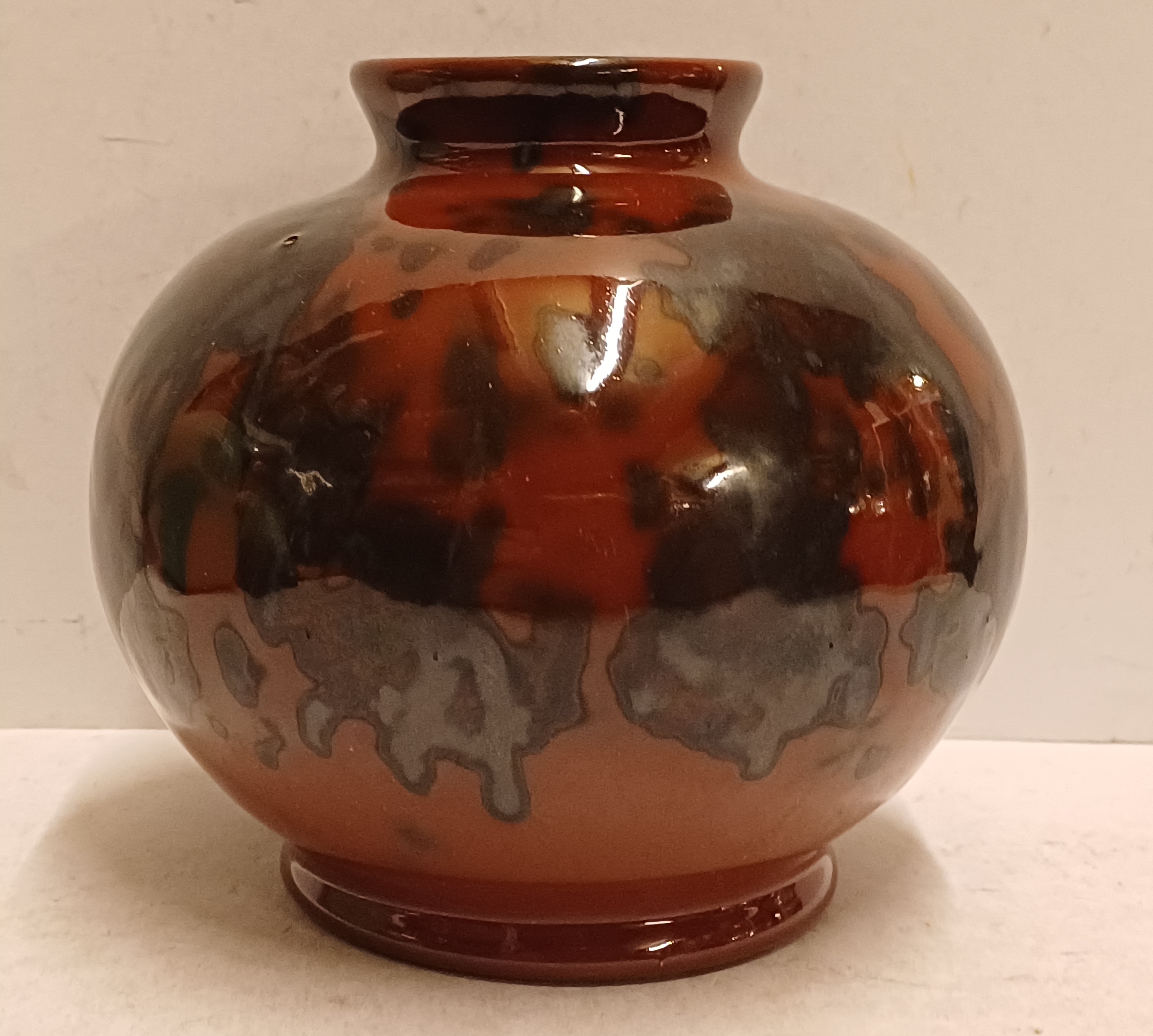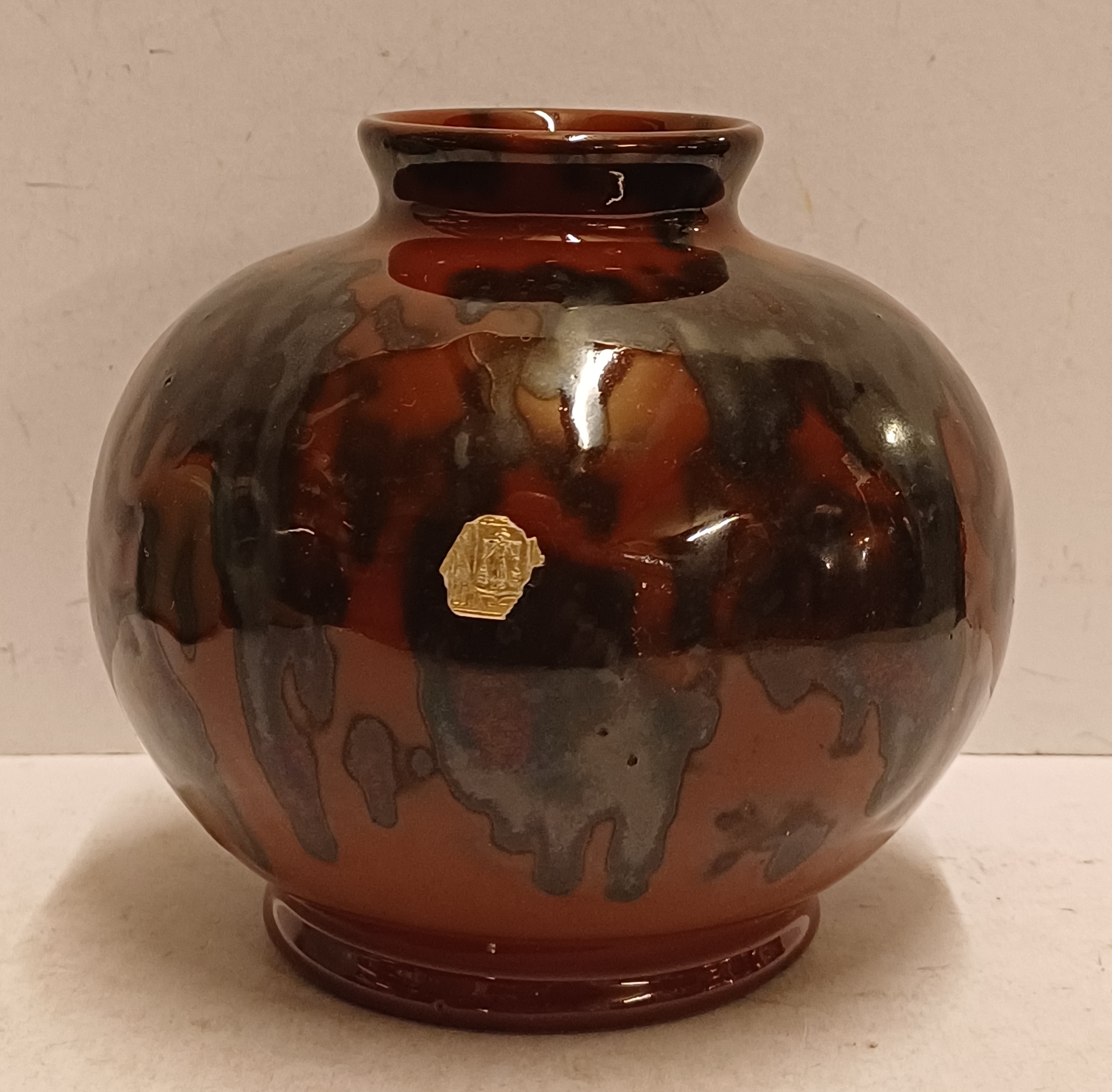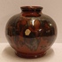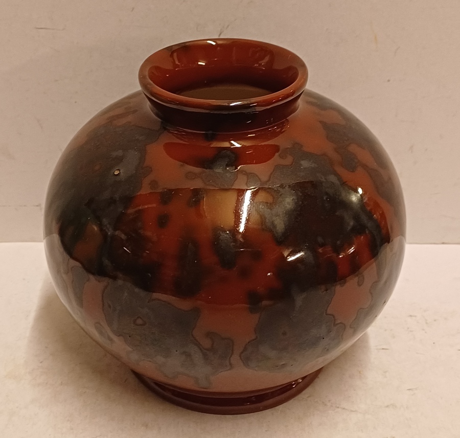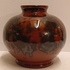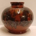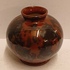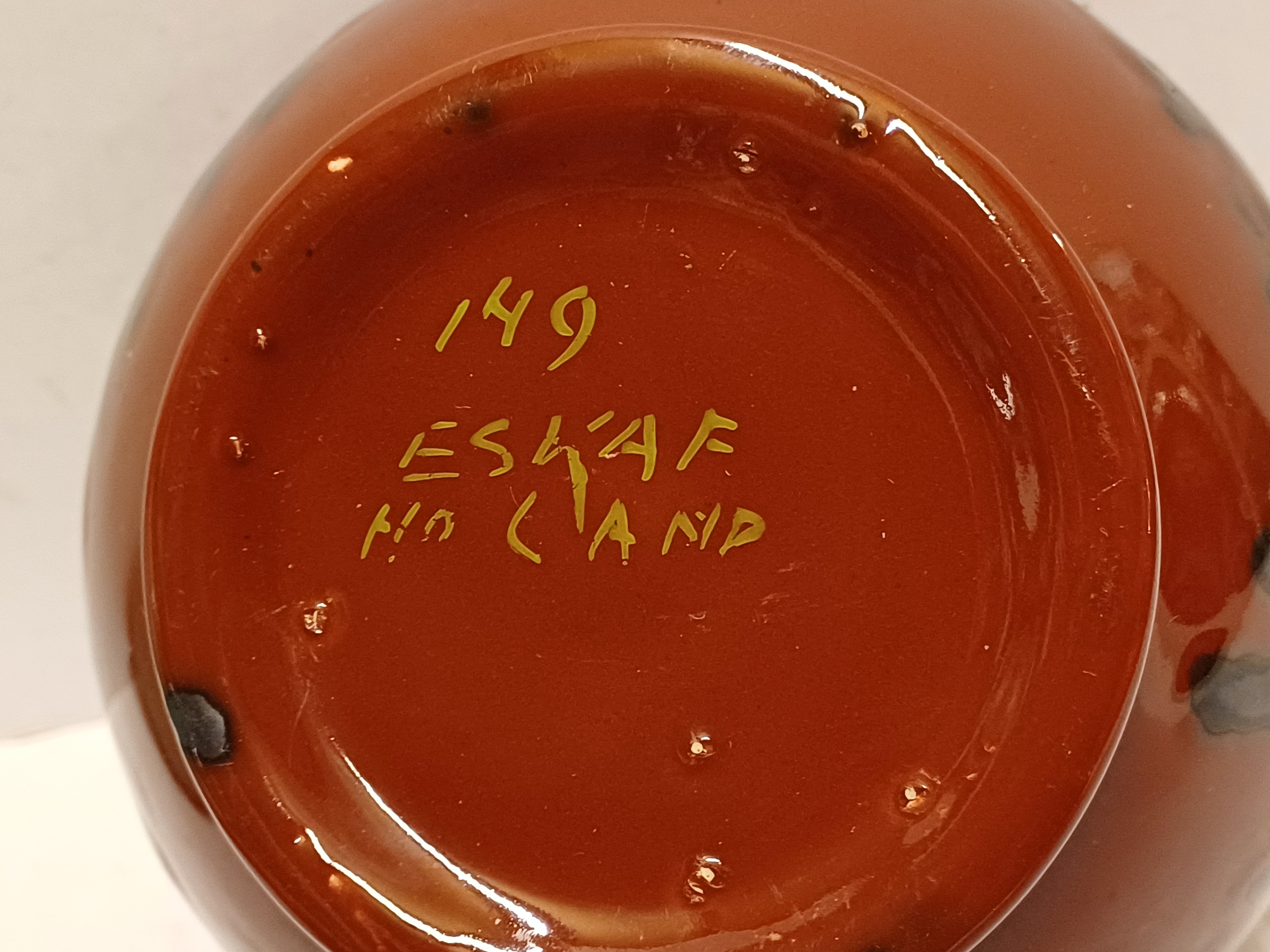 Bruin zwart gevlekte vaas met Eskaf Huizen sticker op de buik. Onderzijde gemerkt in geel.