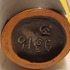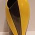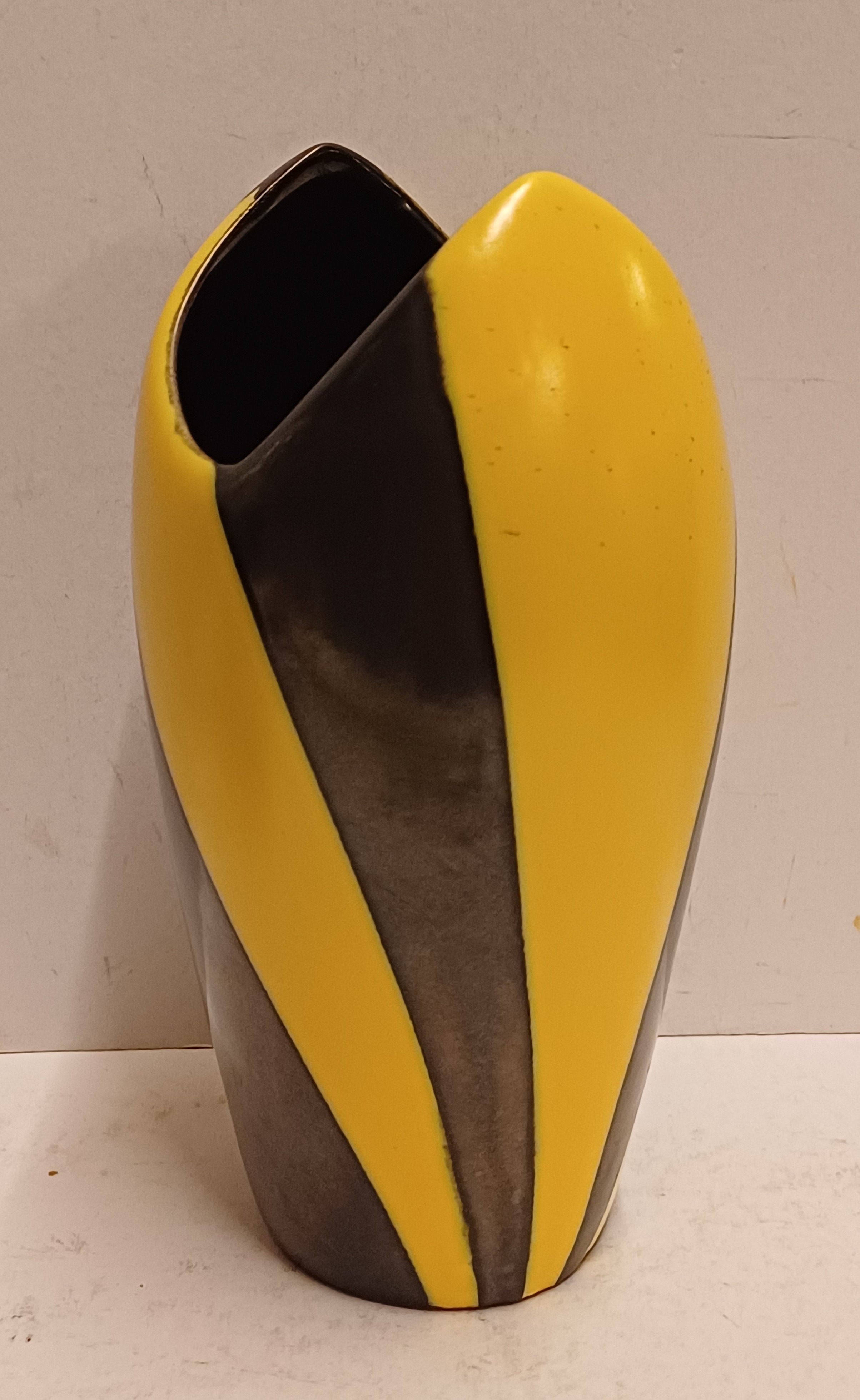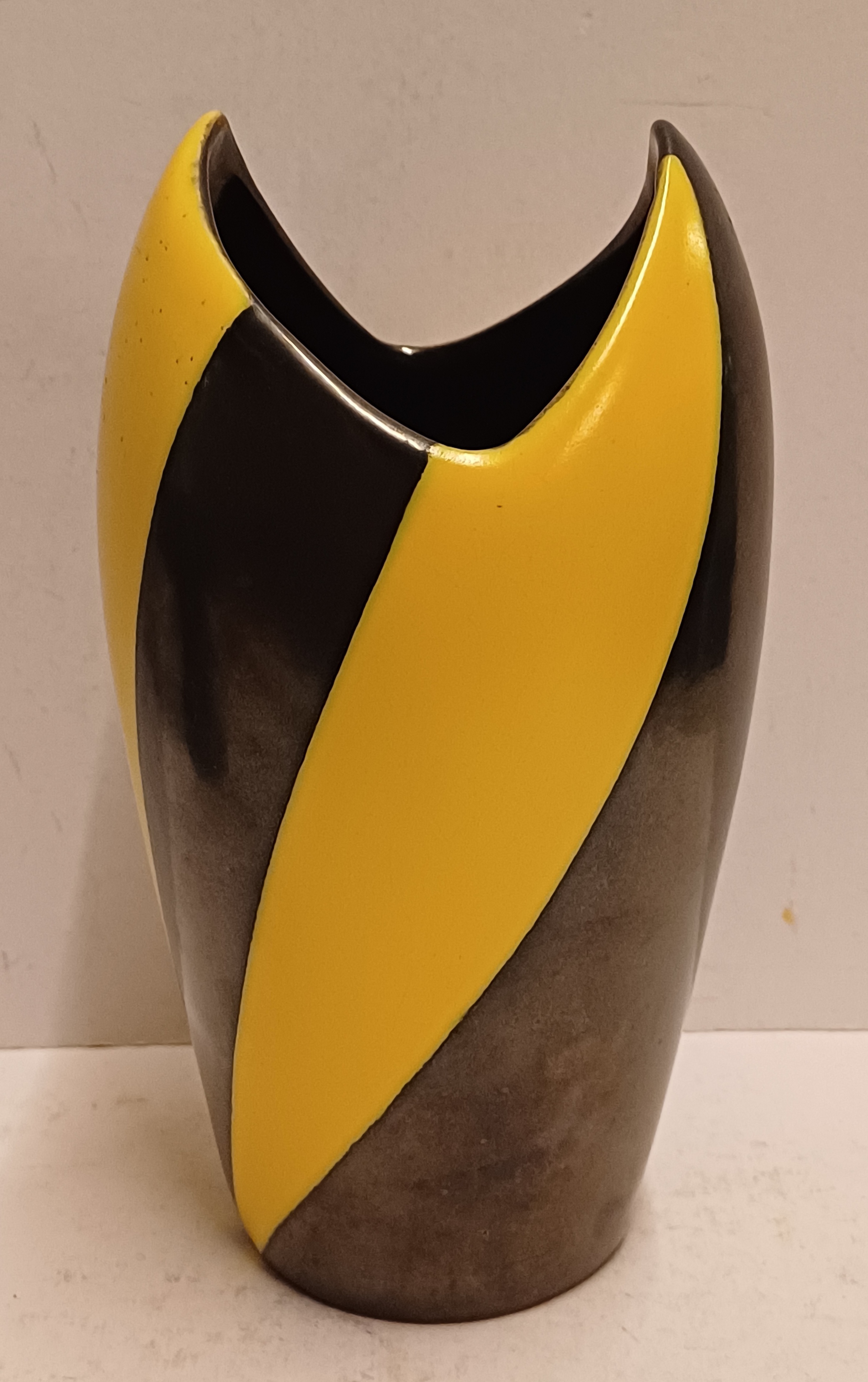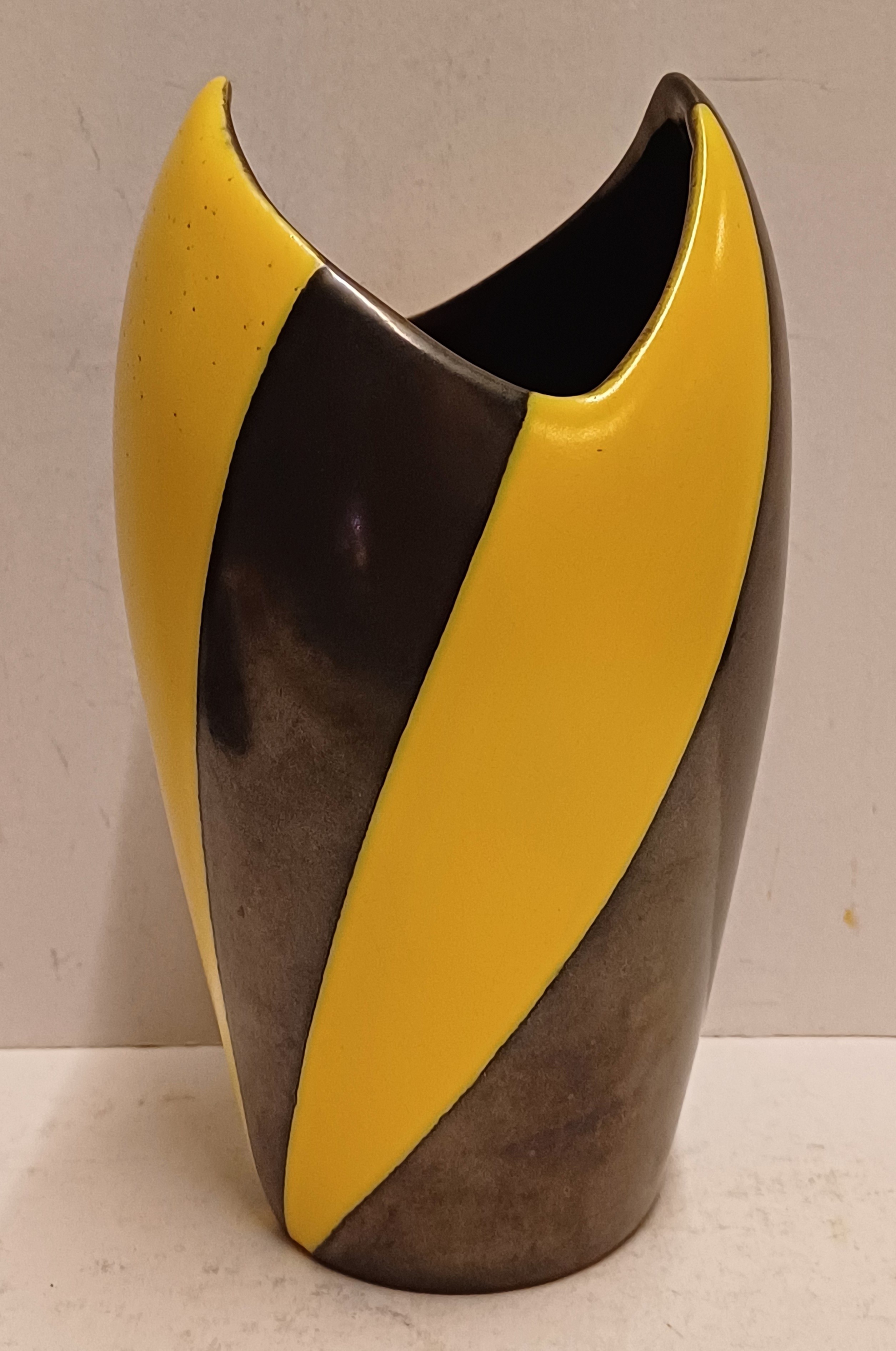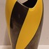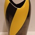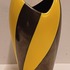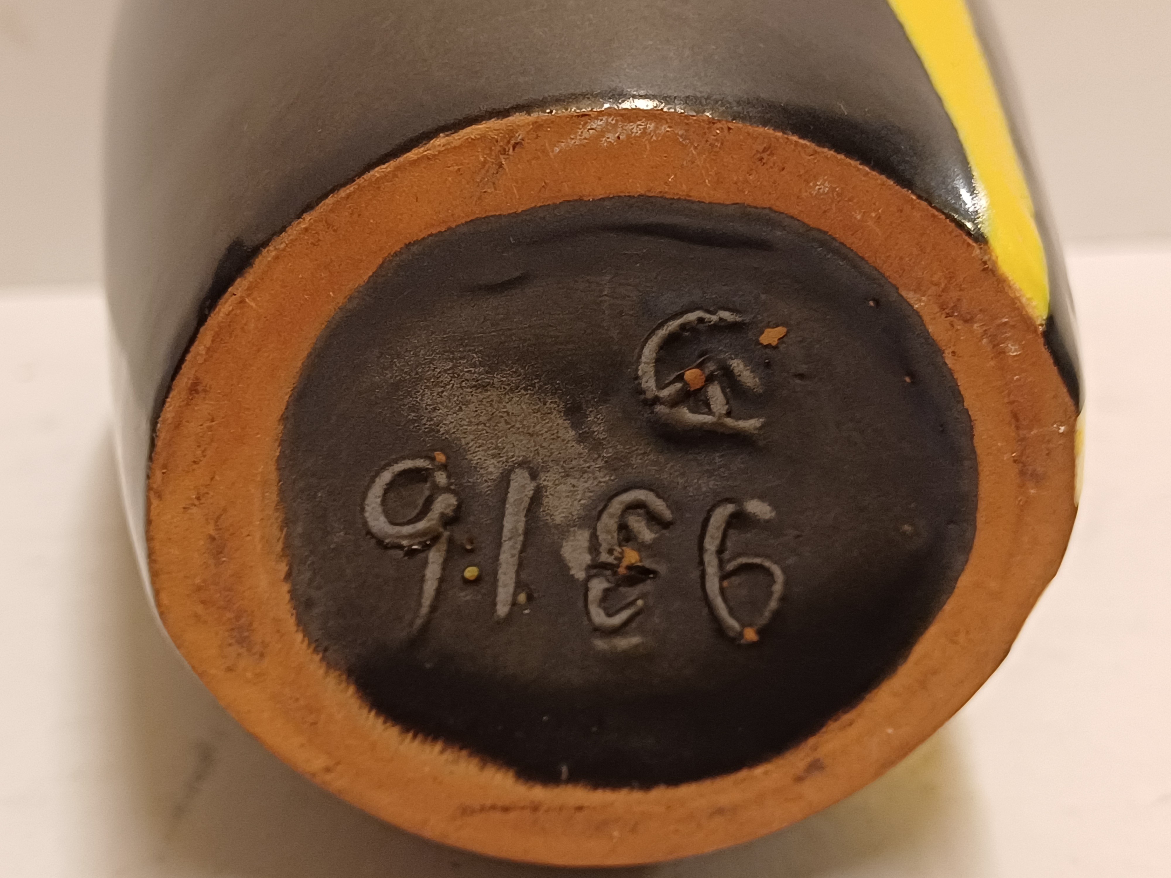 Gegoten aardewerken vaas met gele en zwarte banen decoratie. Onderzijde met signatuur en modelnummer.