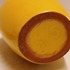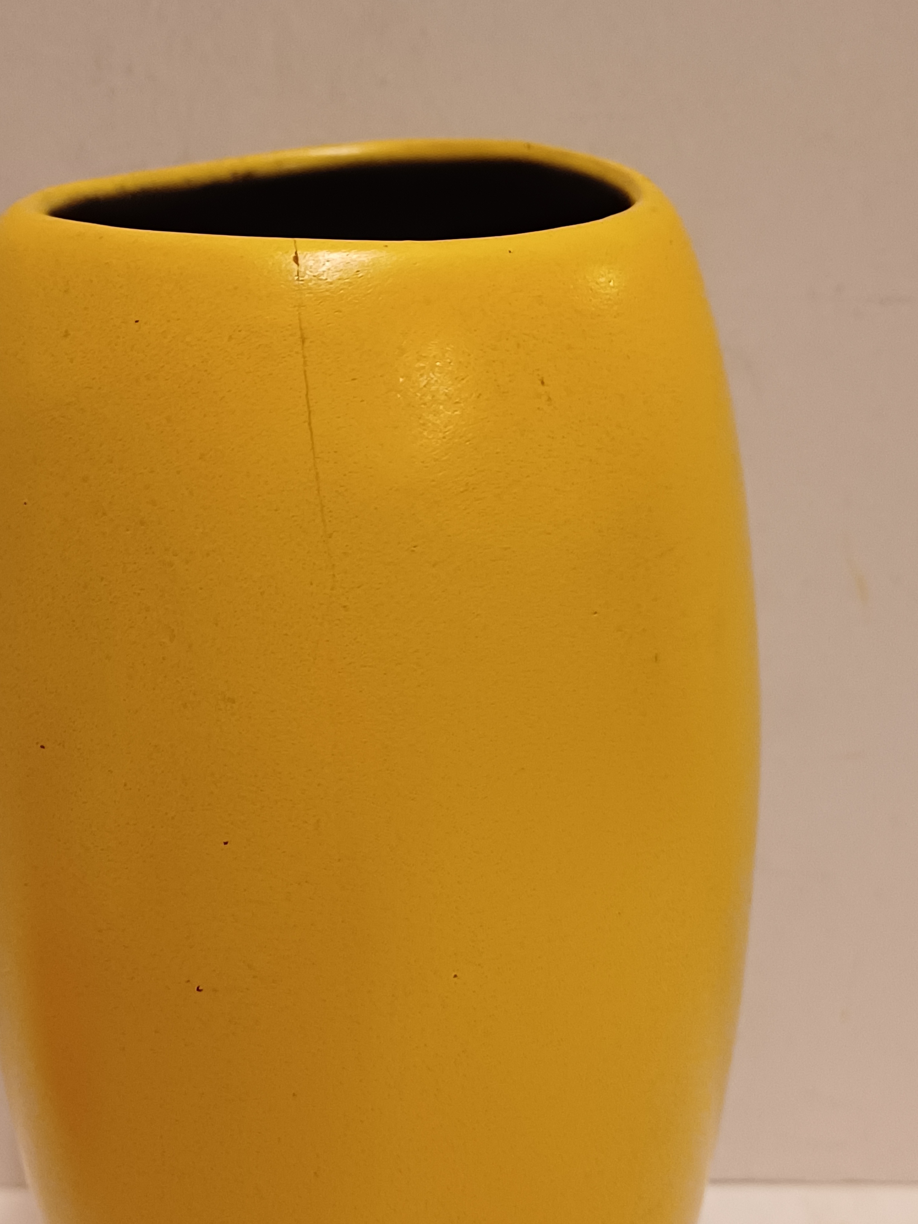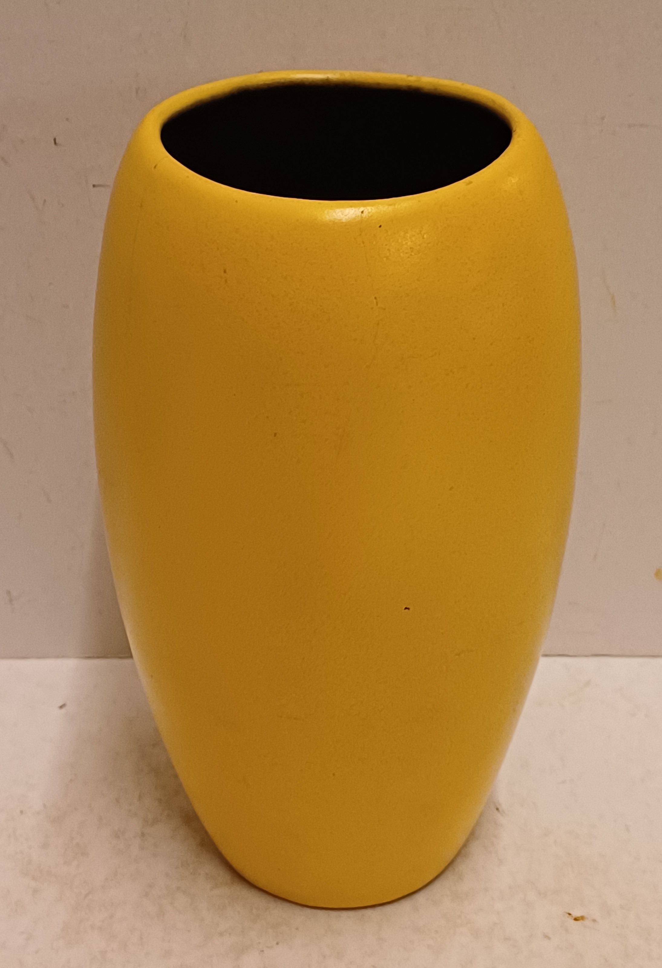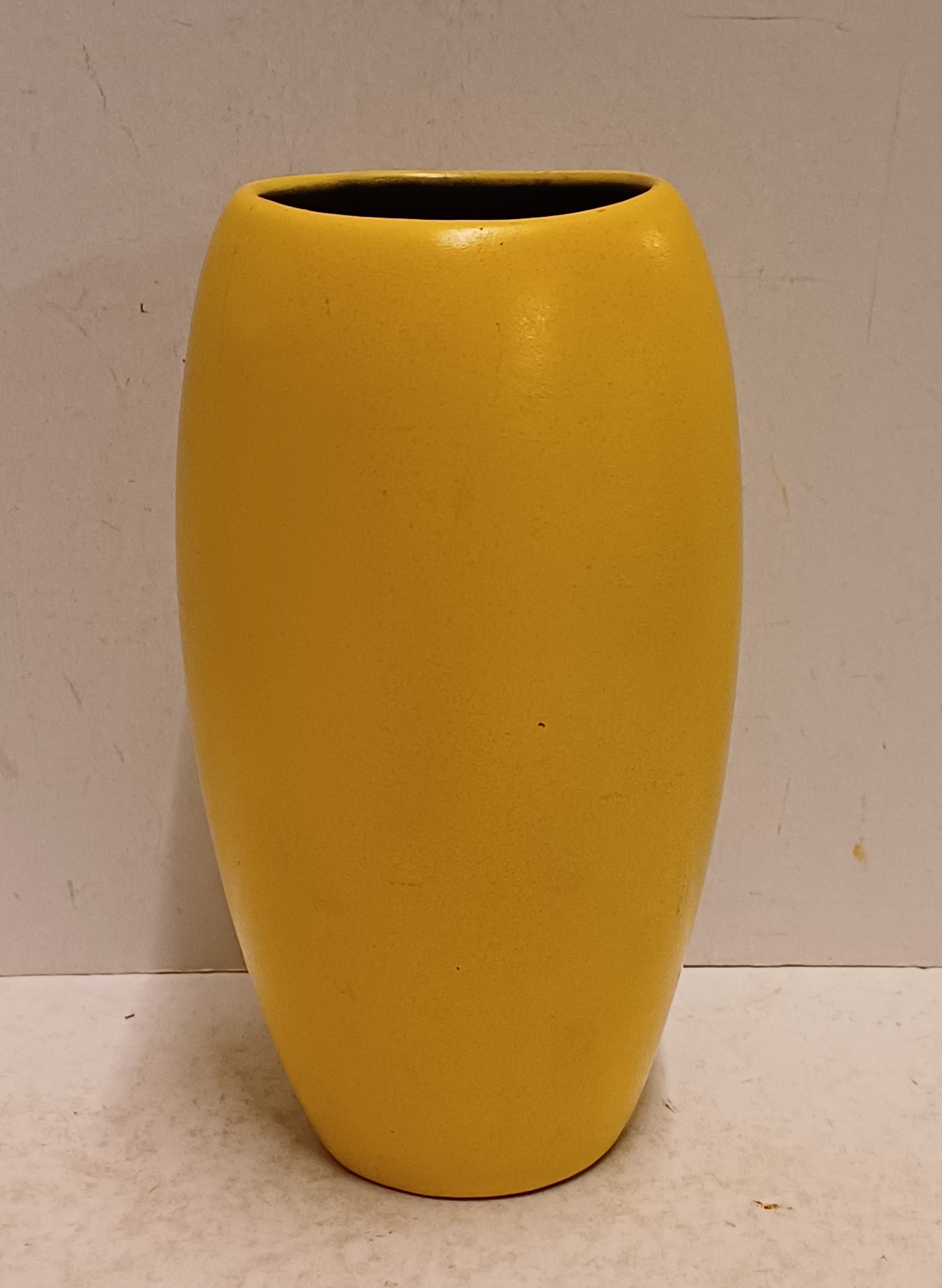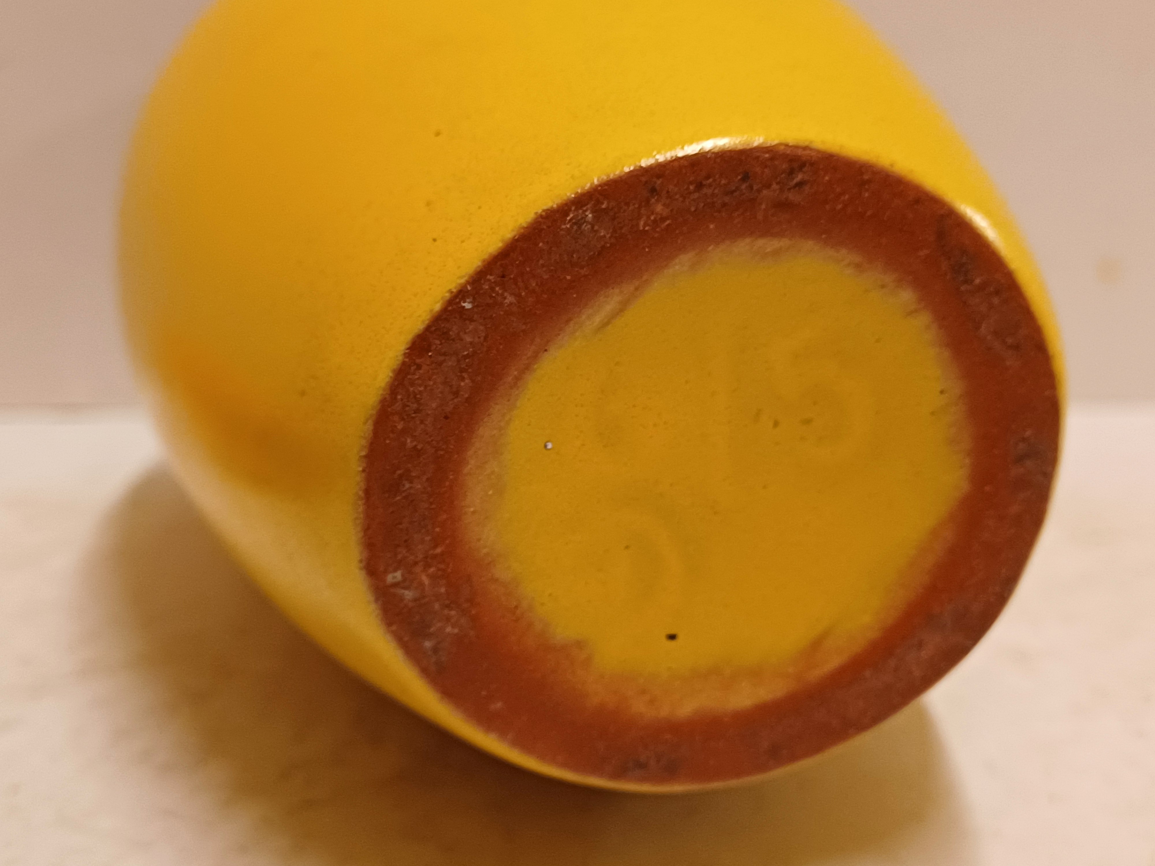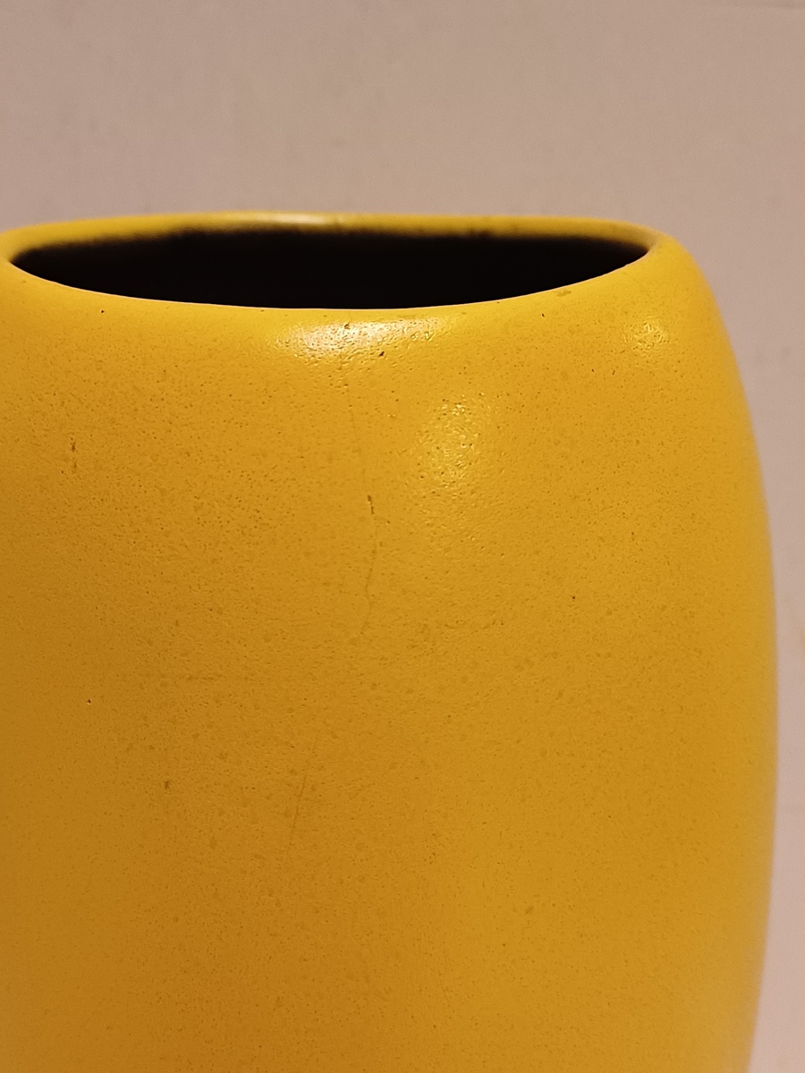 Gegoten aardwerken vaas met gele glazuur en zwarte binnenzijde. Onderzijde met fabrieksmerk.