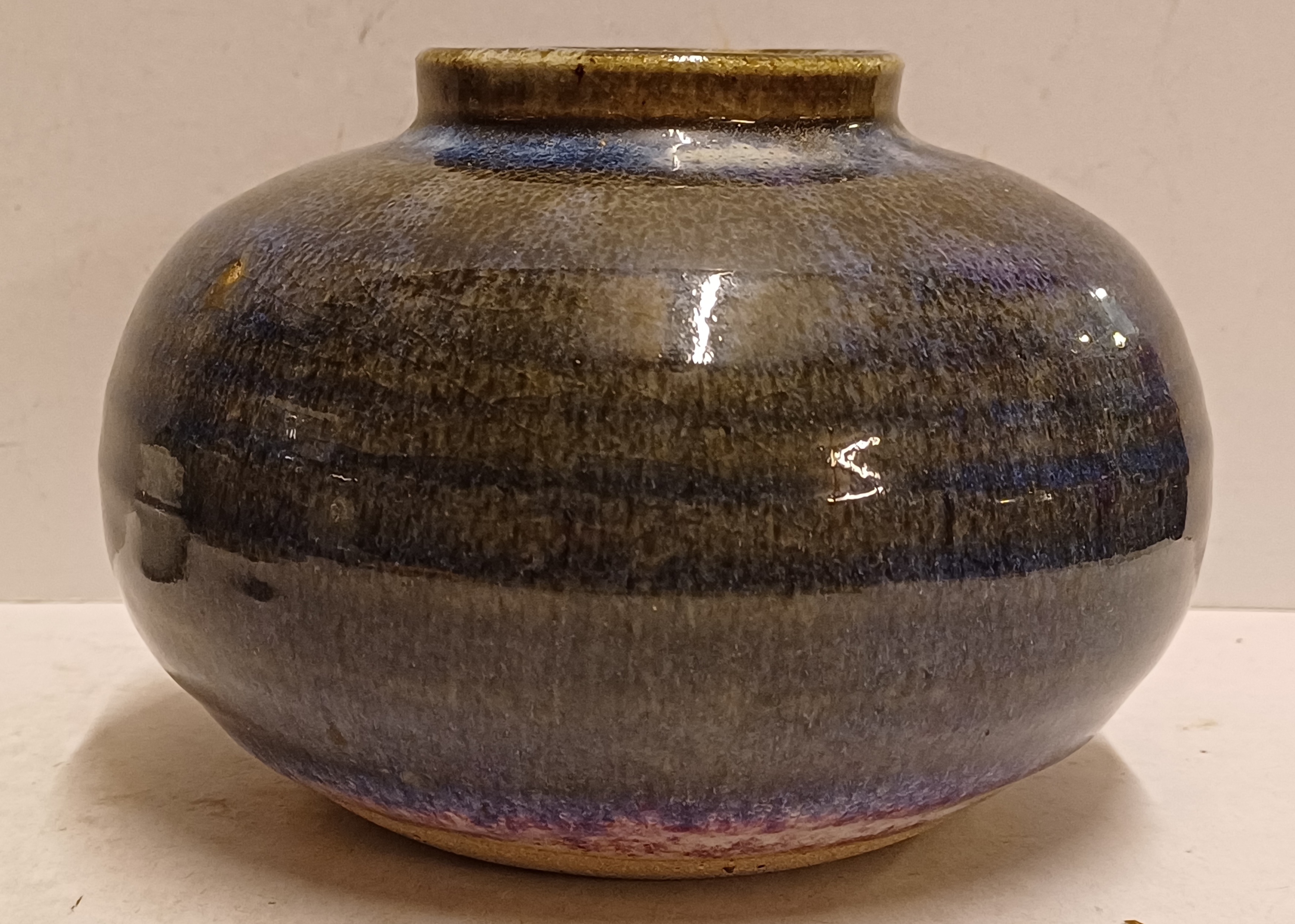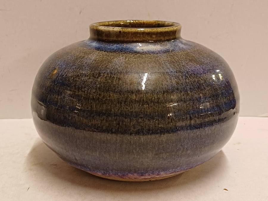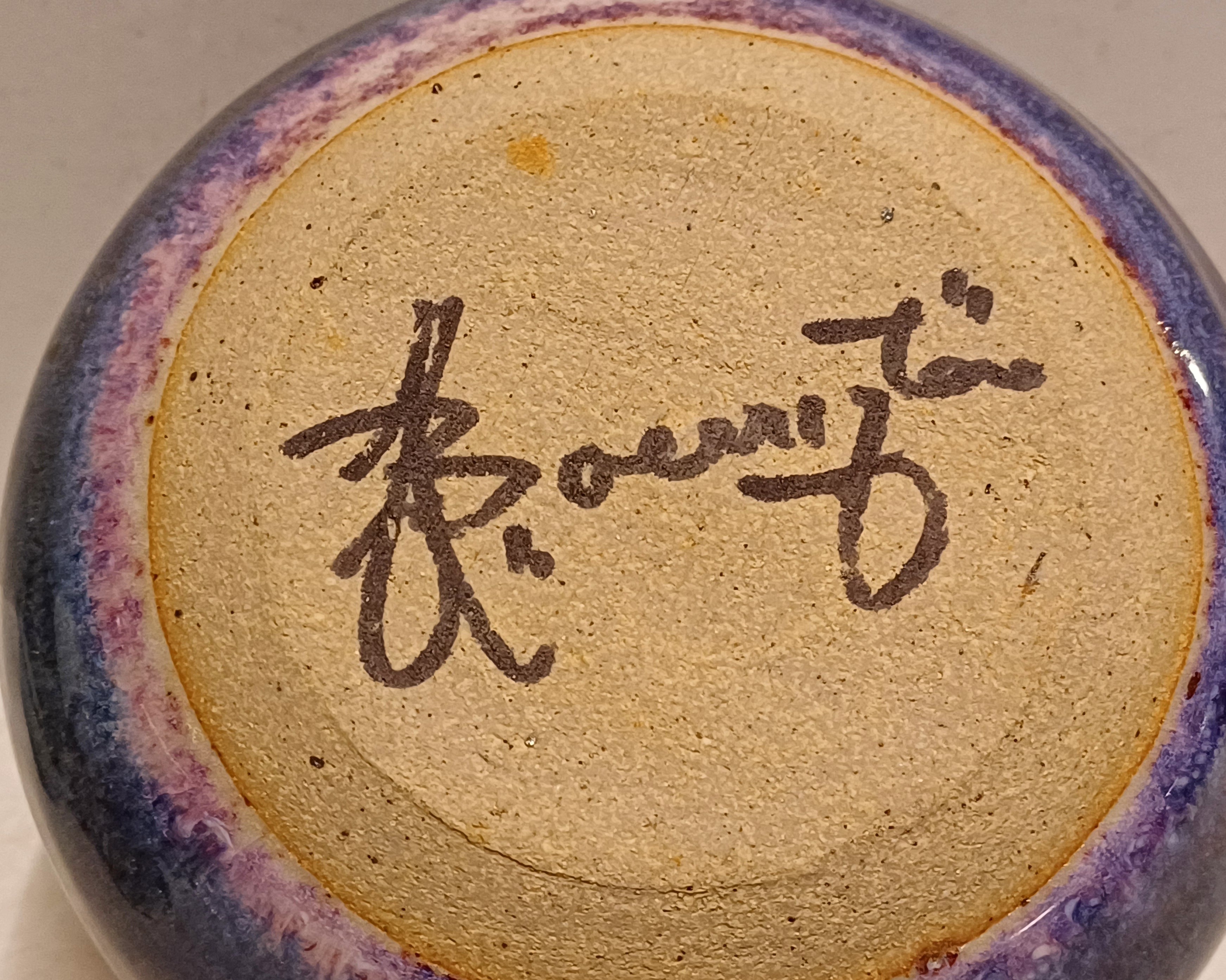 Handgedraaide vaas met donkere paarsige glazuur. Onderzijde gesigneerd in zwart.