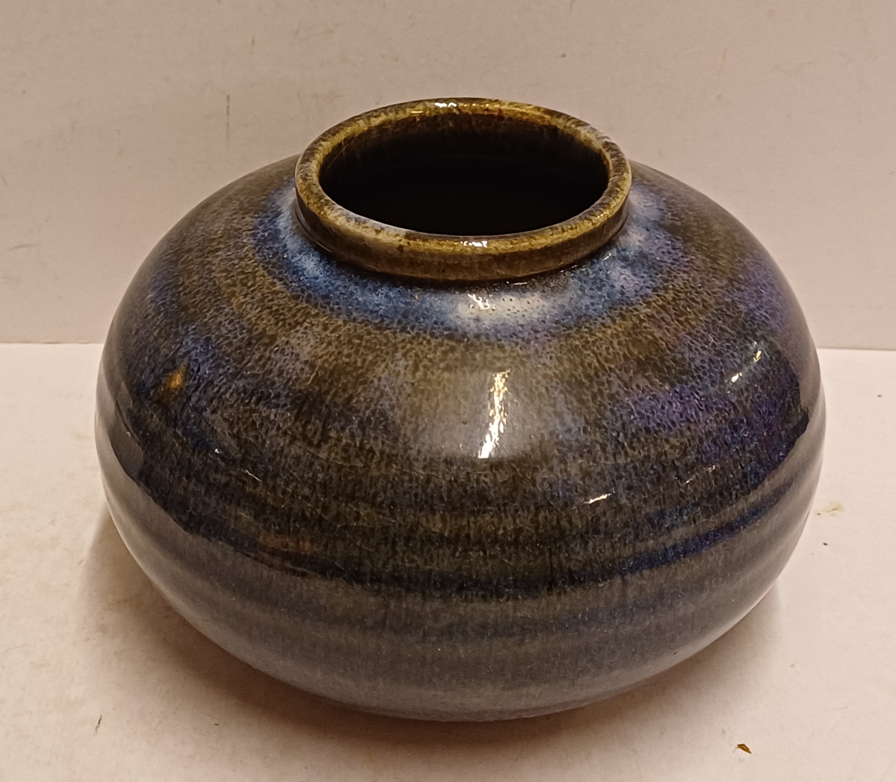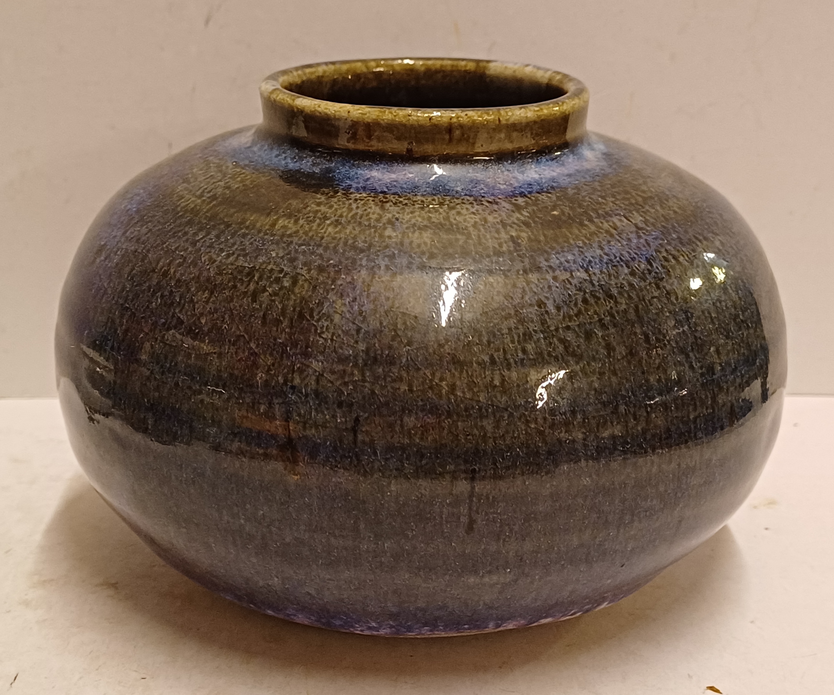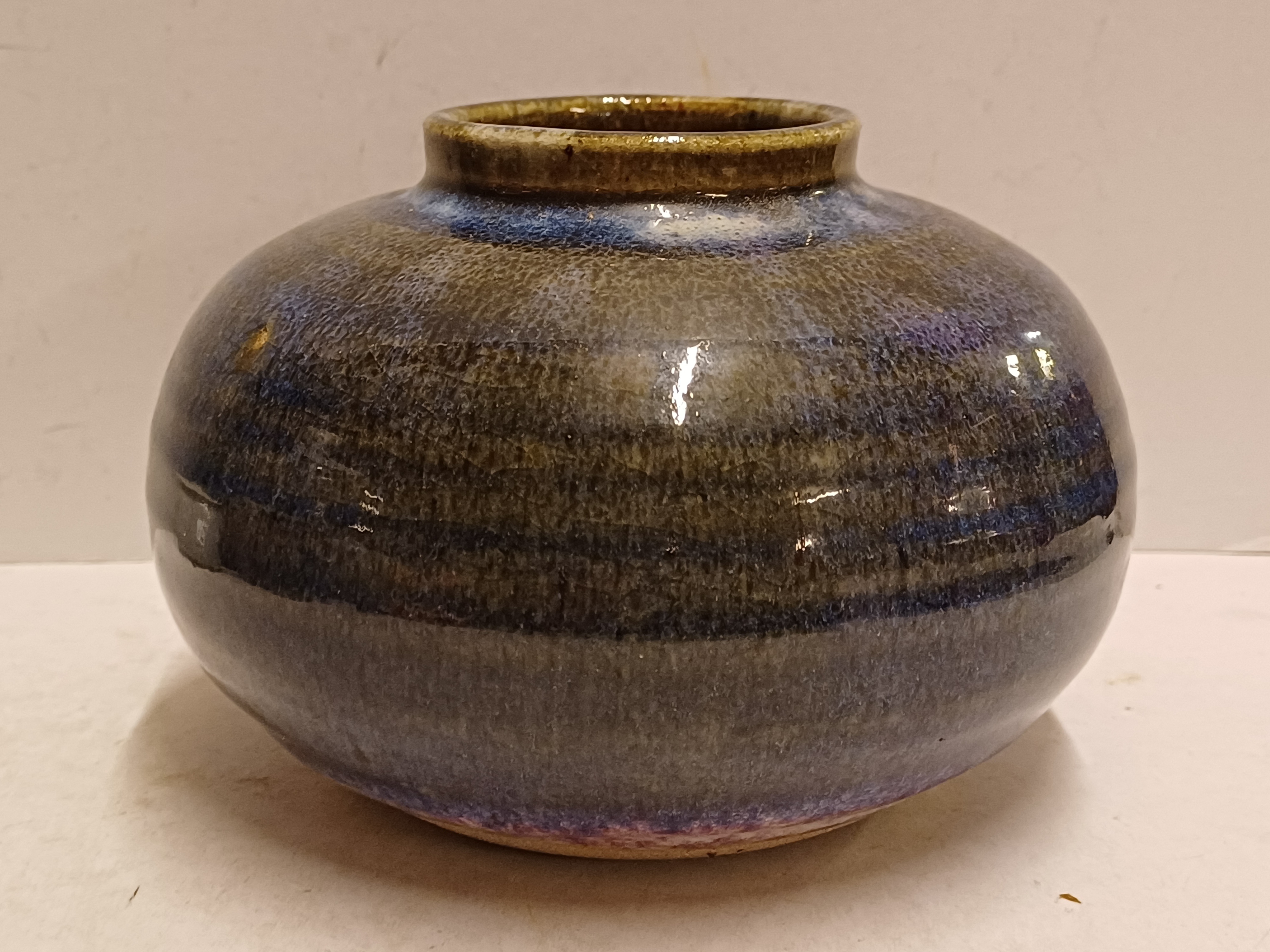 Handgedraaide vaas met donkere paarsige glazuur. Onderzijde gesigneerd in zwart.
