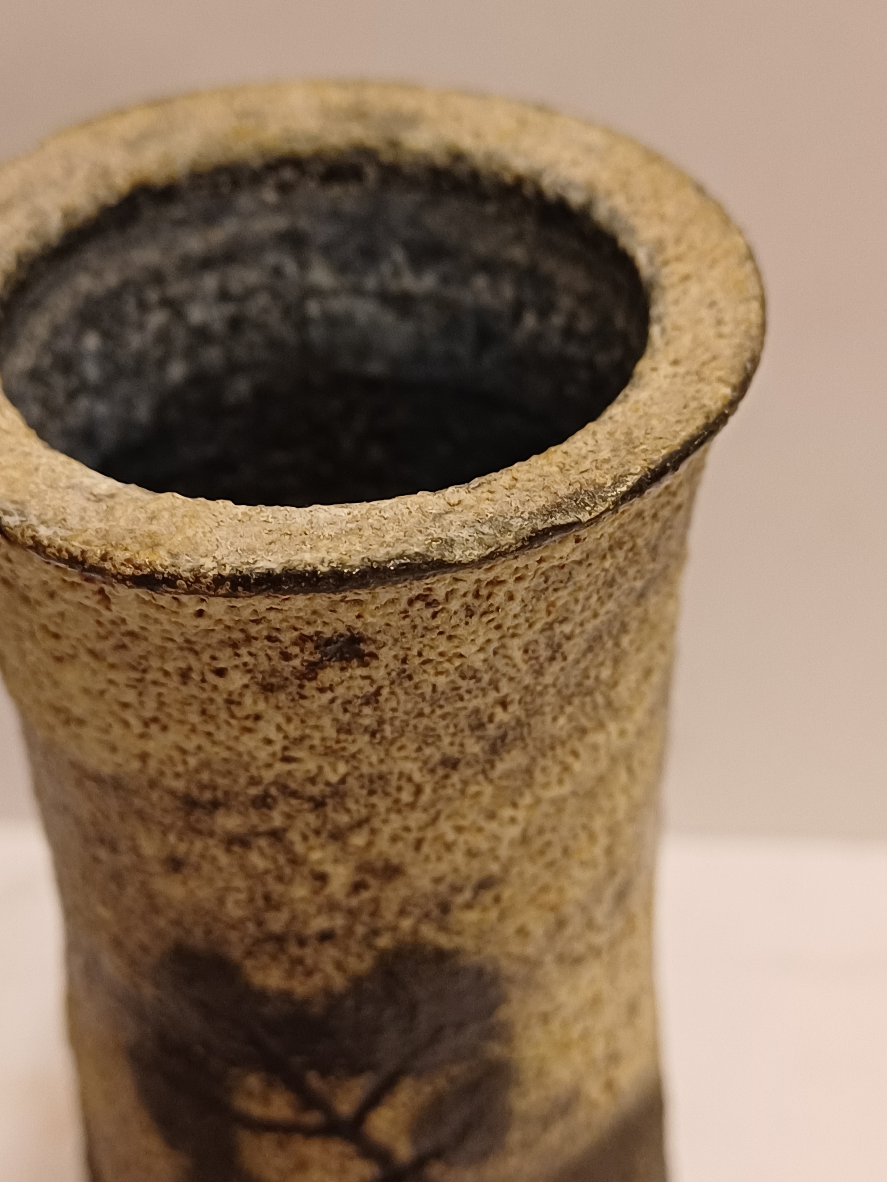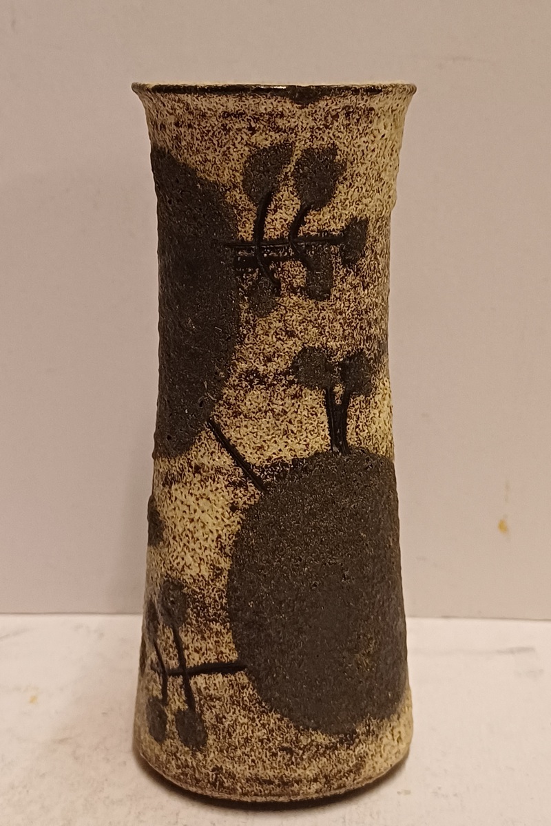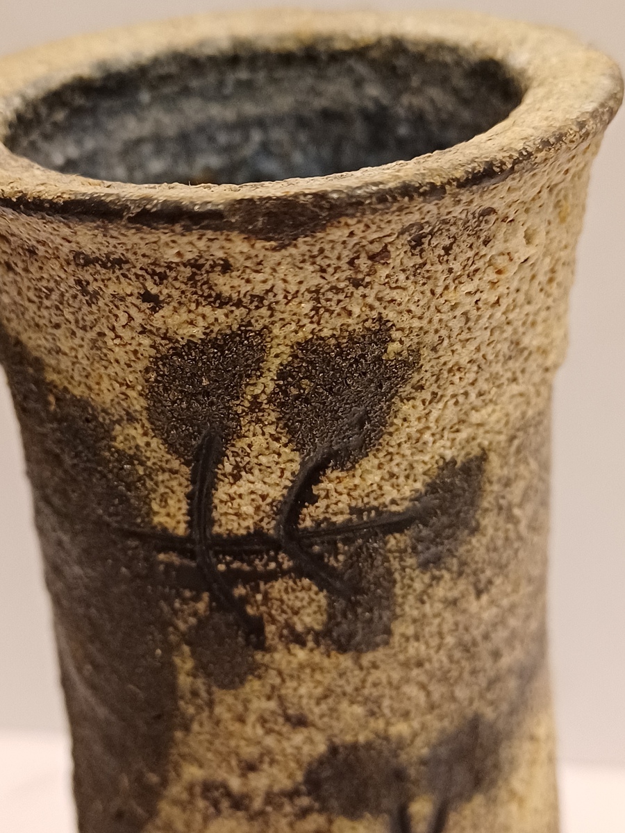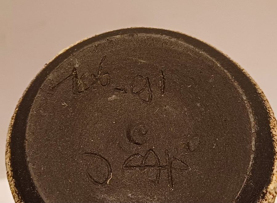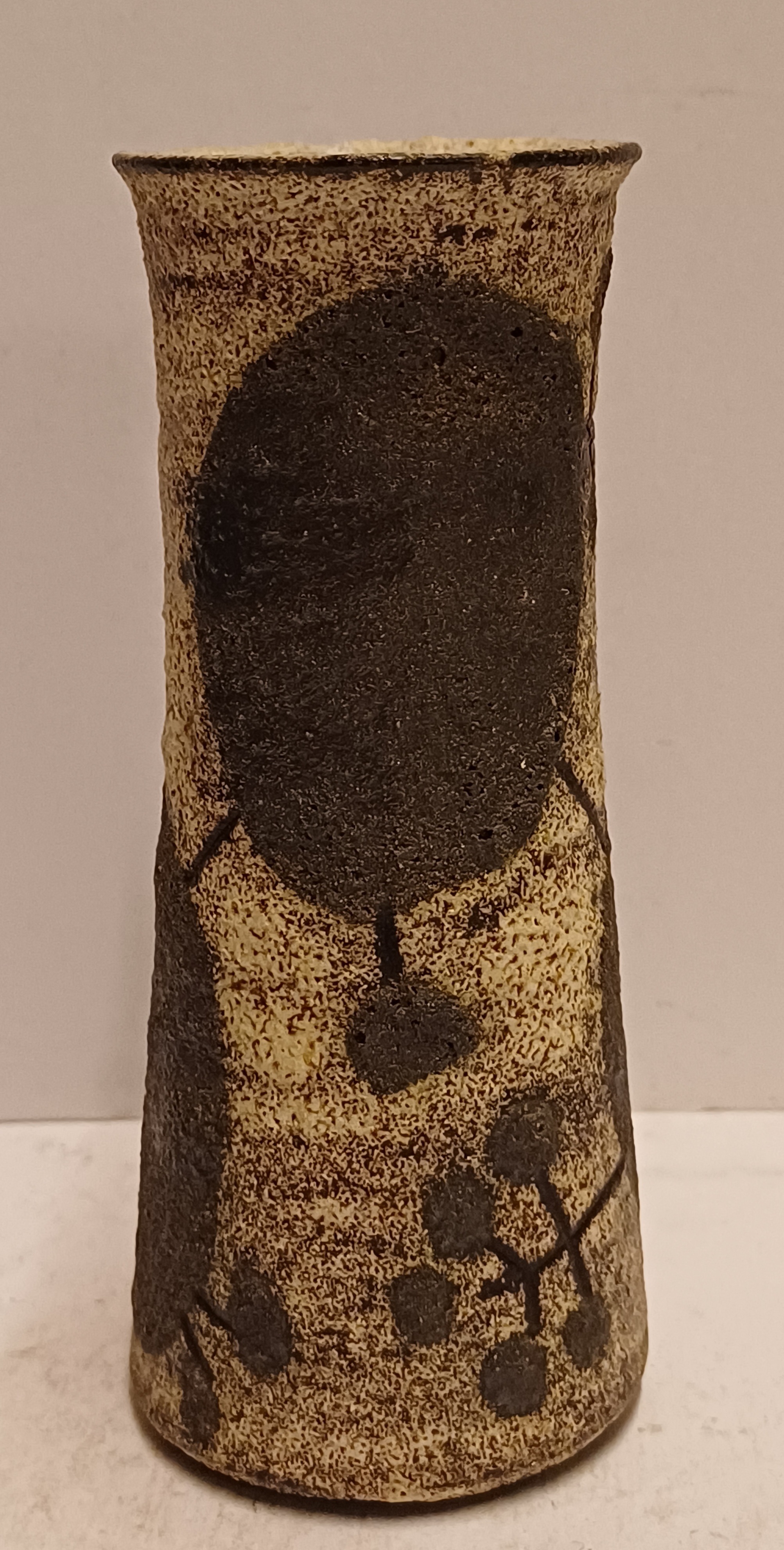 Vasetto in terracotta con smalto bianco e decorazione astratta nera. Inferiore marcato Jaap.
