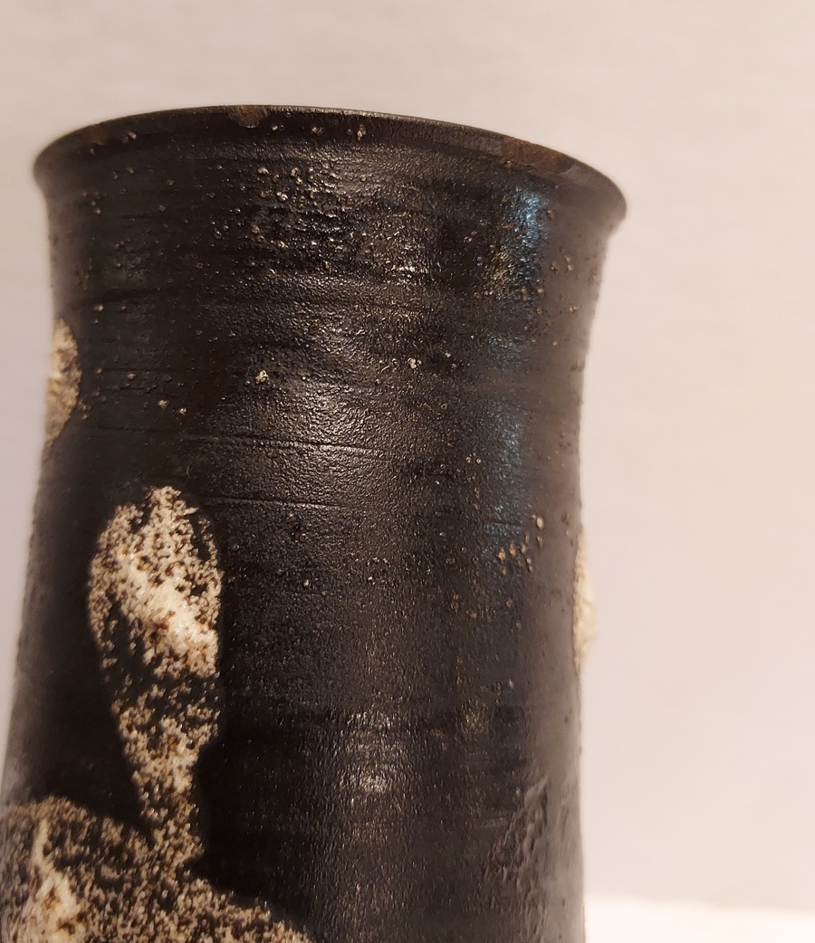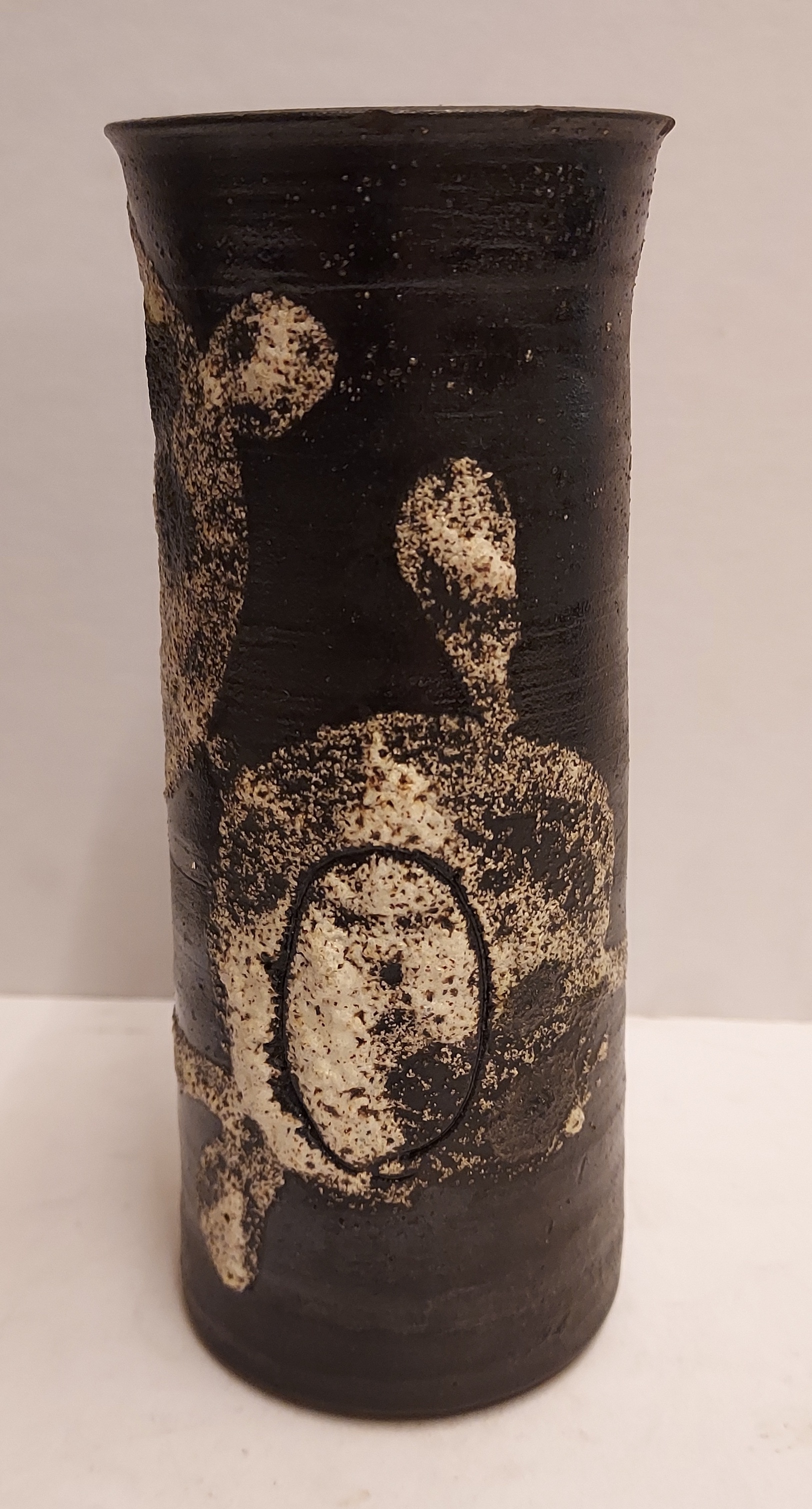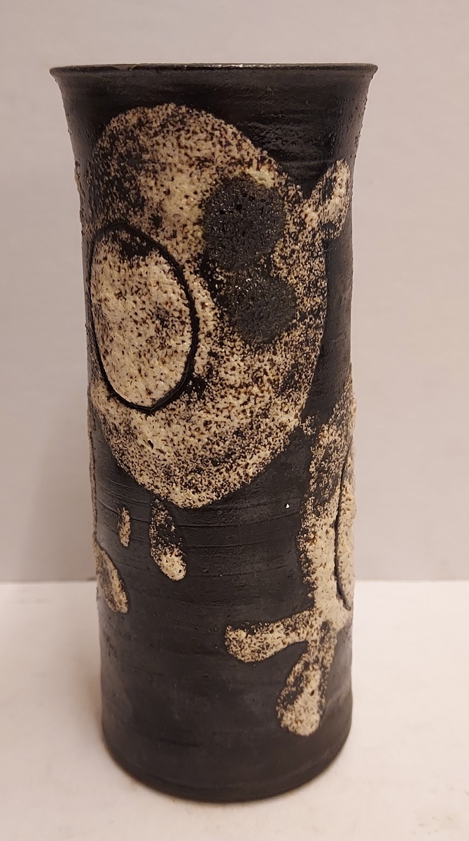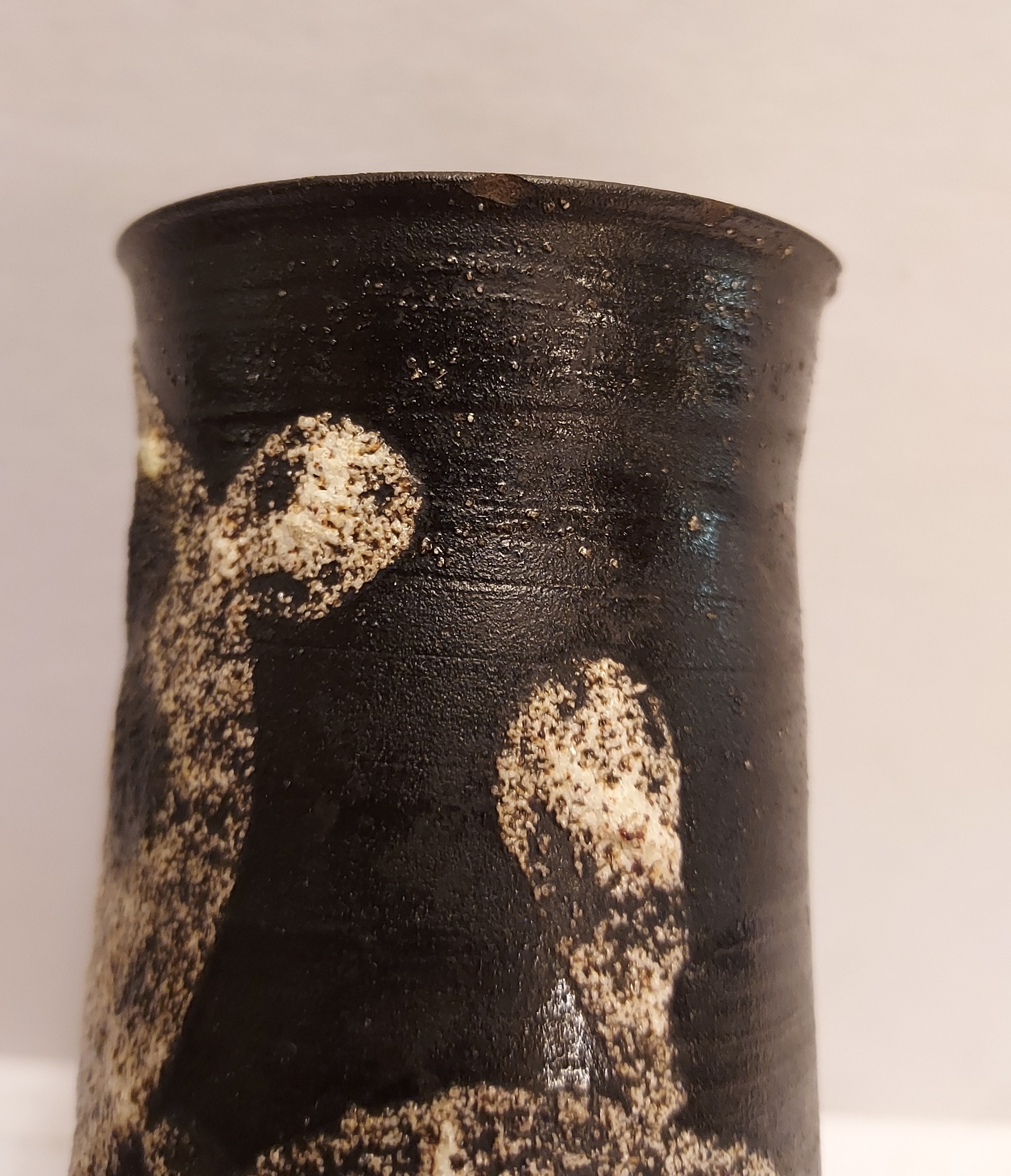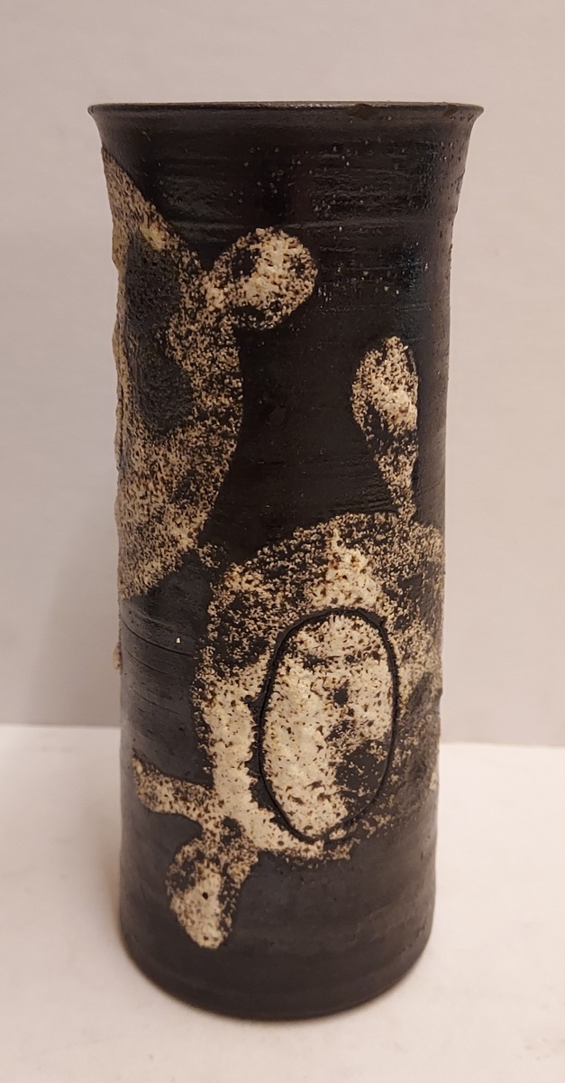 Vasetto smaltato in nero con decoro astratto Cobra in bianco. Parte inferiore firmata.