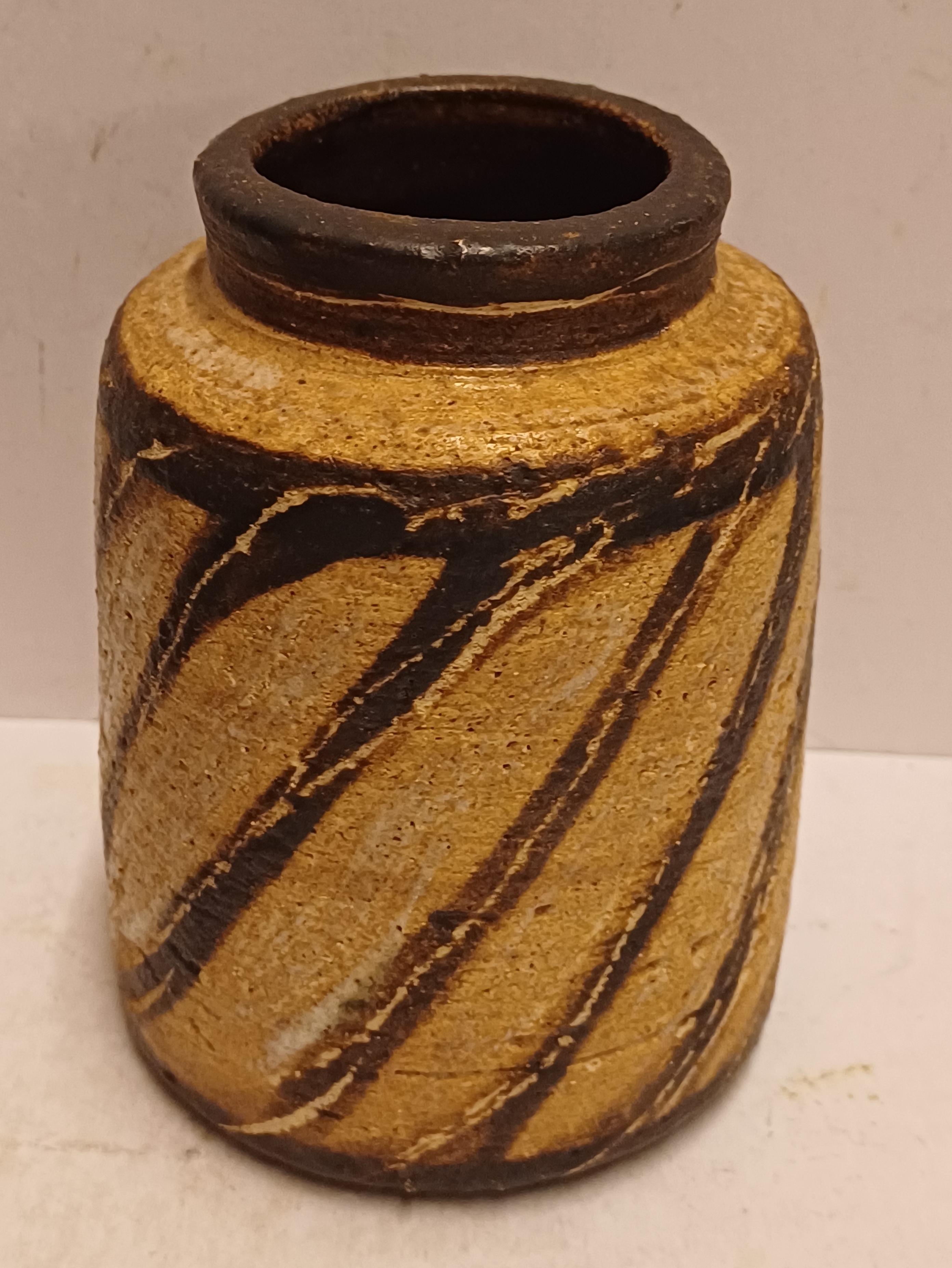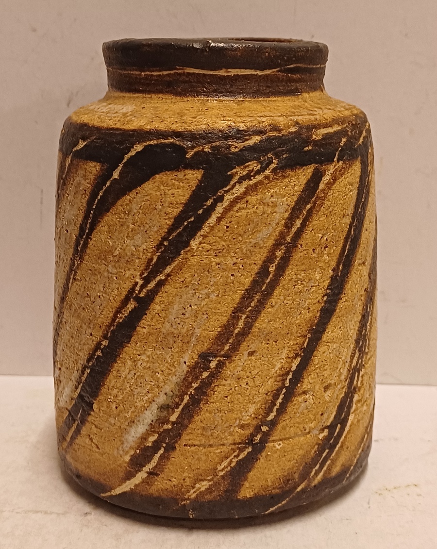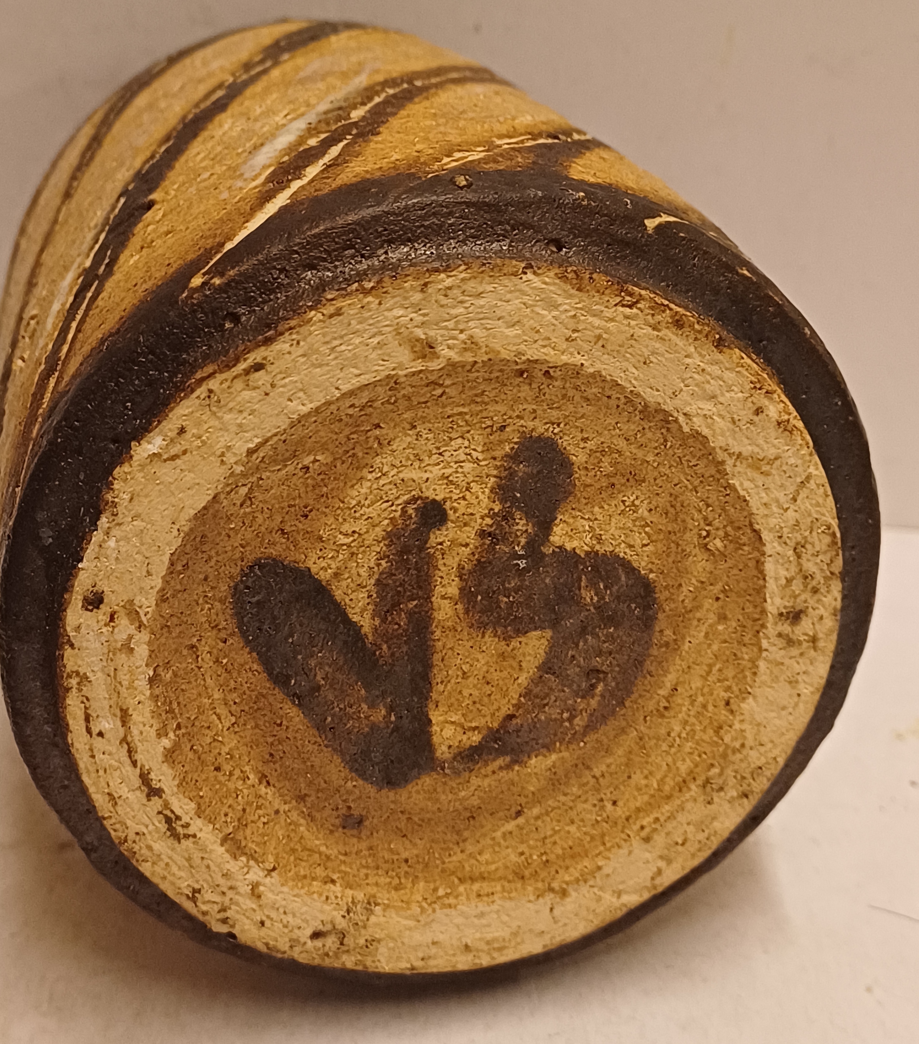 Aardewerken vaas met band met lijn decor. Onderzijde met monogram