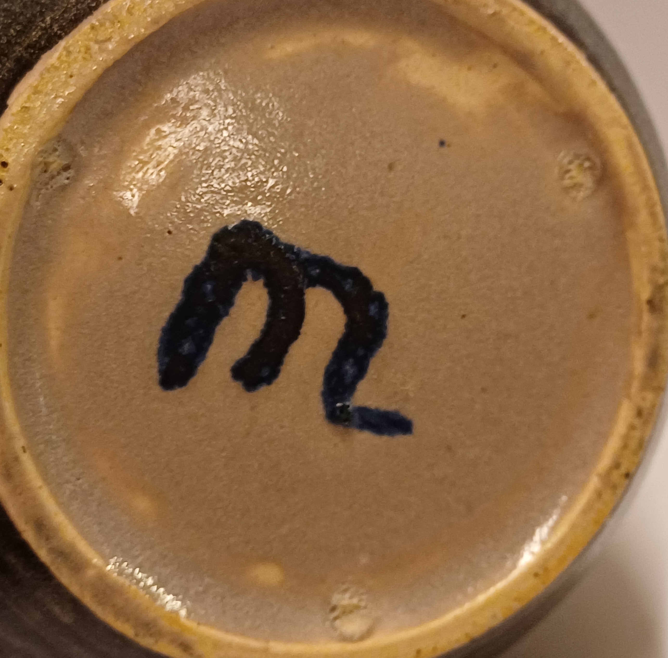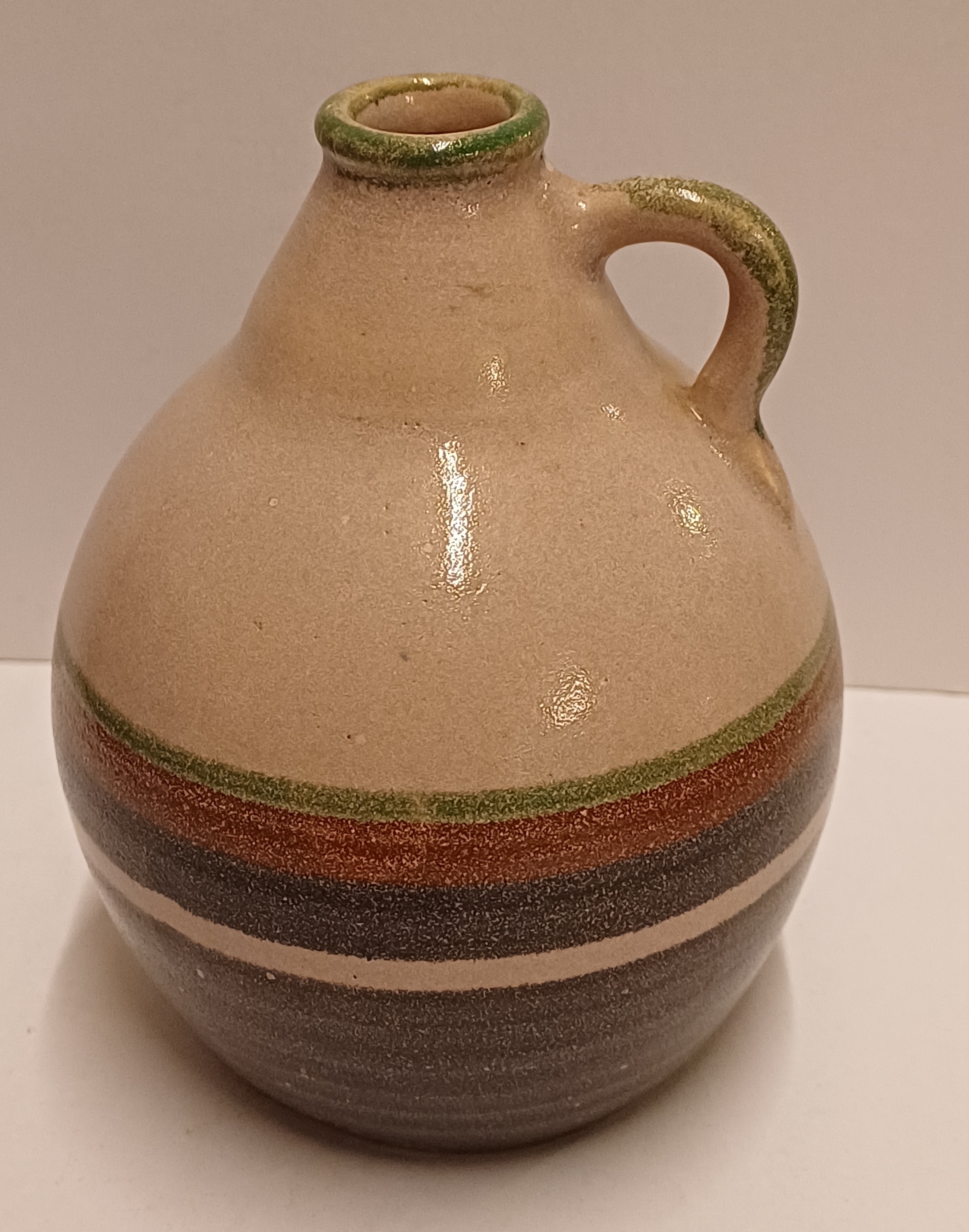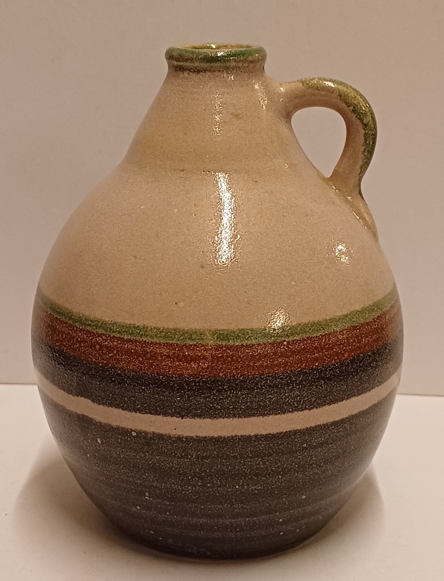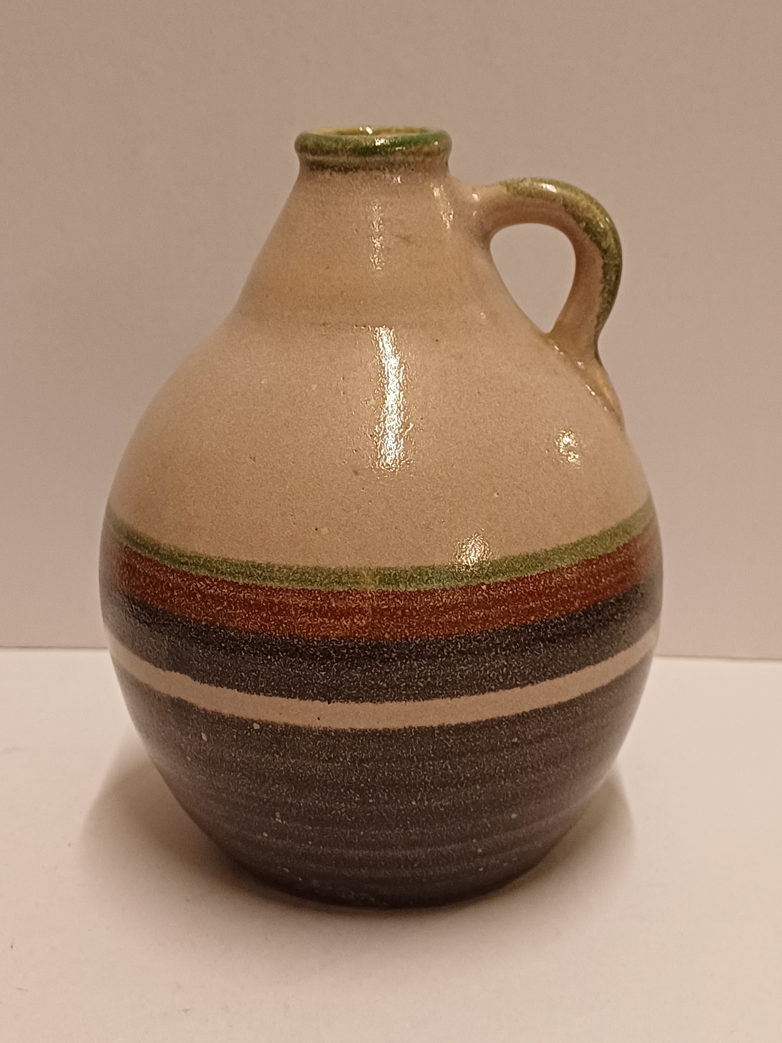 Aardewerken kannetje met horizontaal band decor. Onderzijde met signatuur.