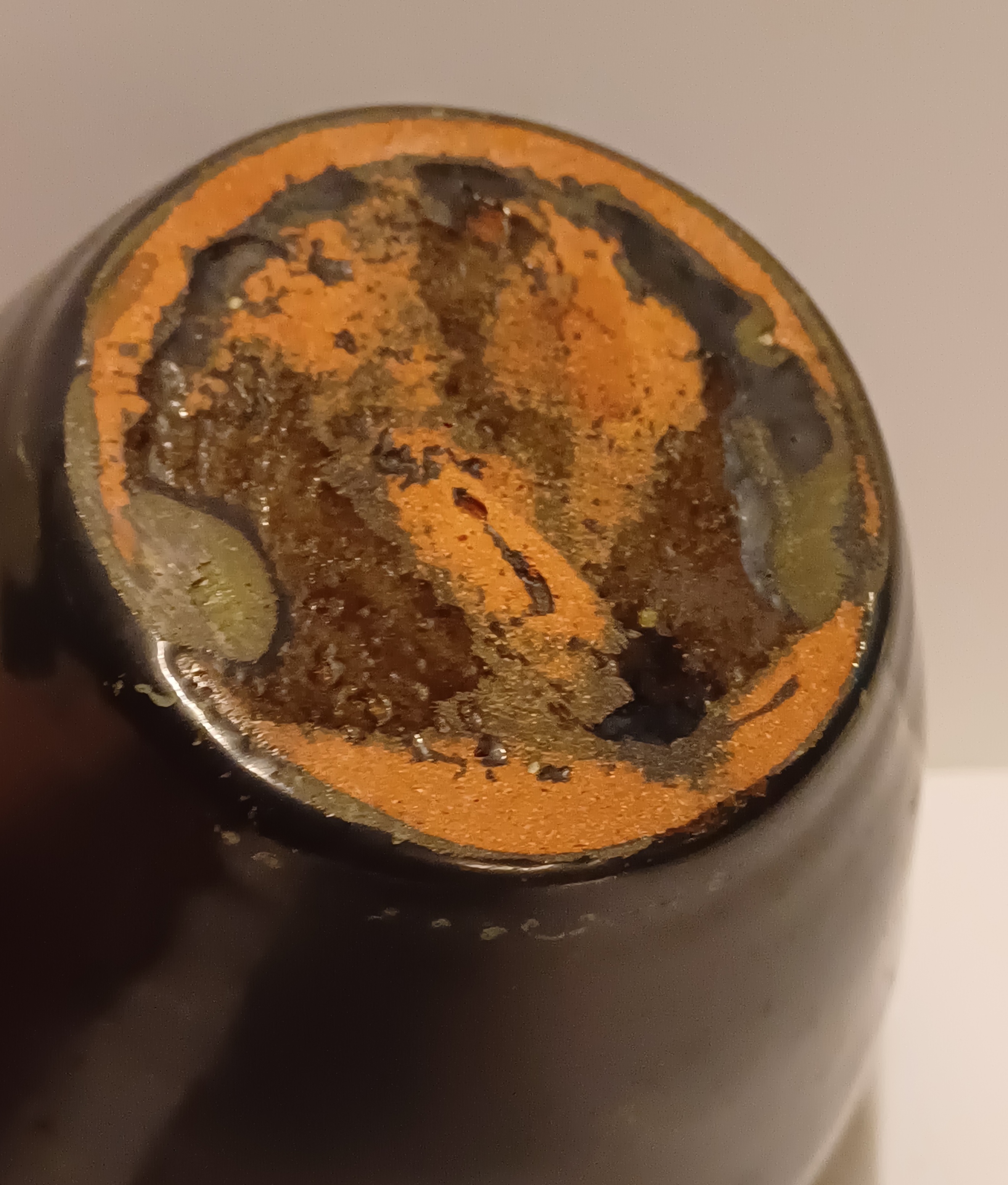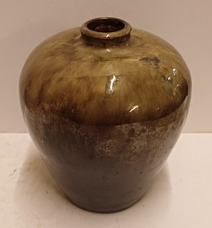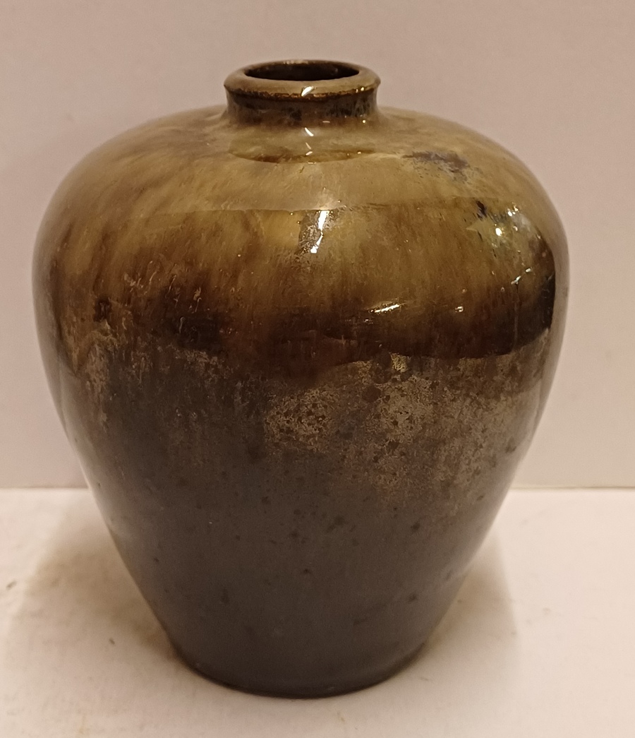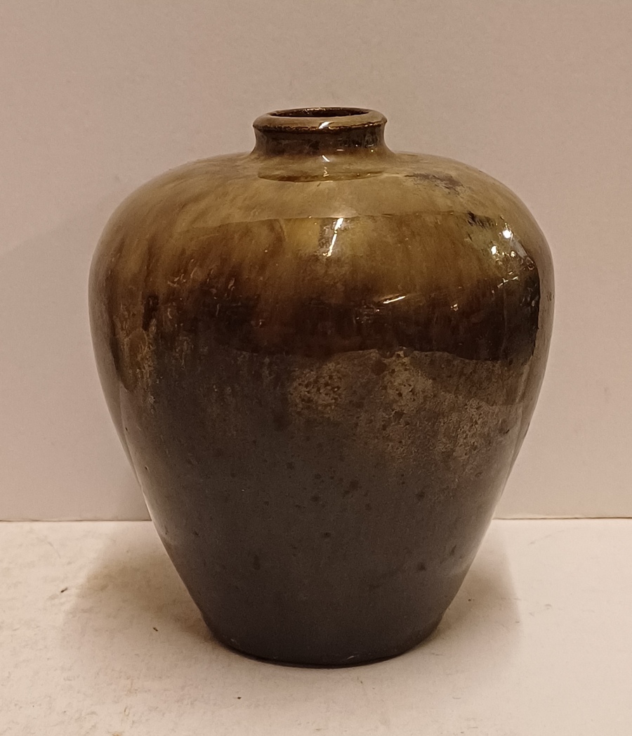 Aardewerken vaas met stroomglazuur in bruintinten. Niet gesigneerd.