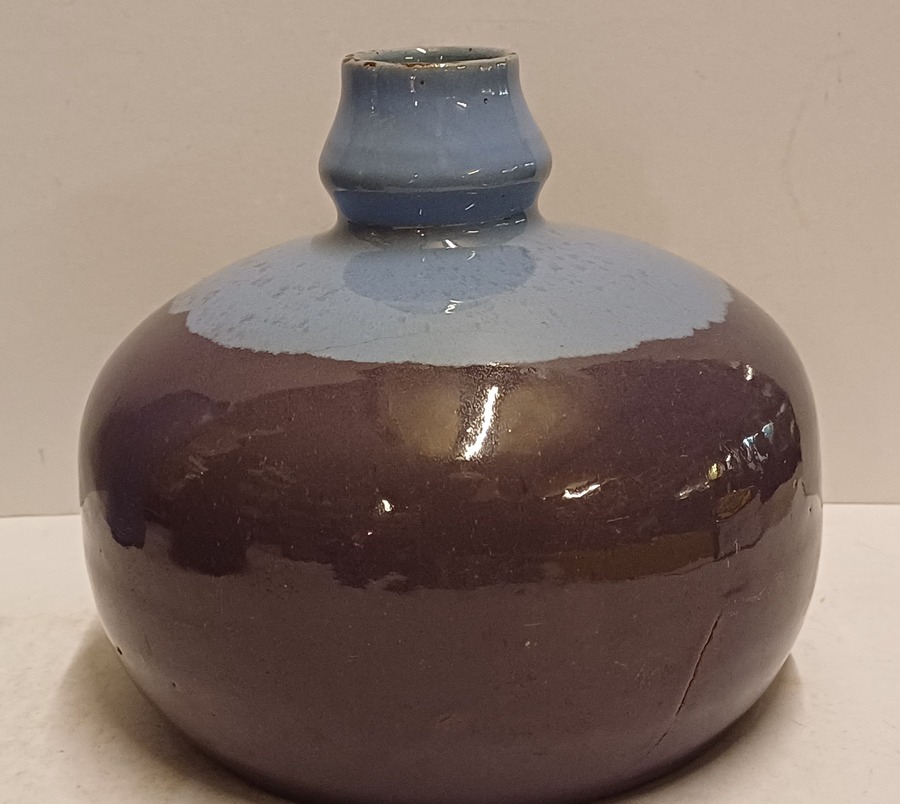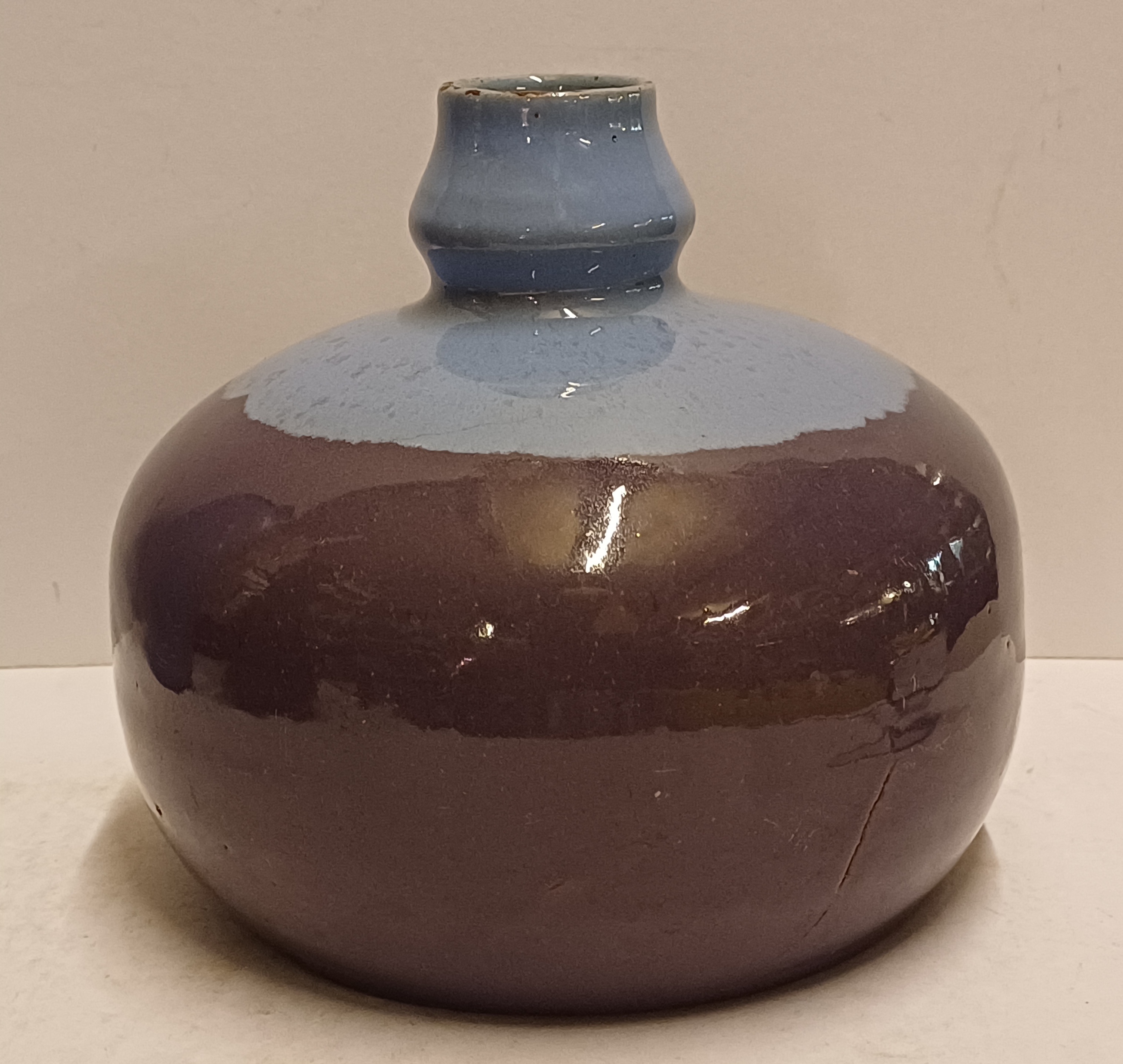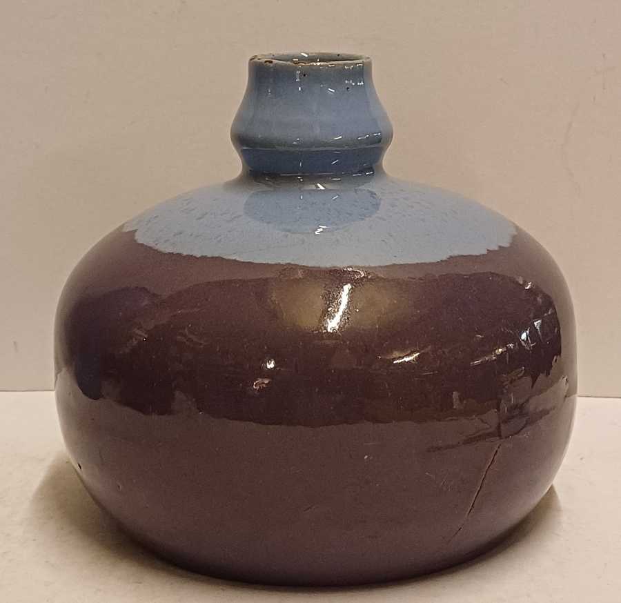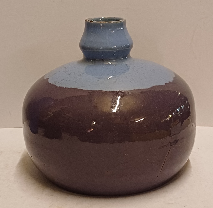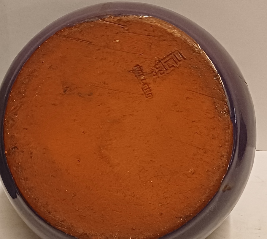 Vaso in terracotta con smalto viola e azzurro chiaro. Parte inferiore firmata.