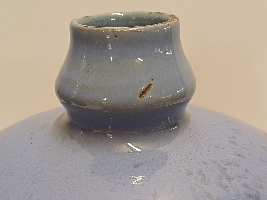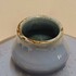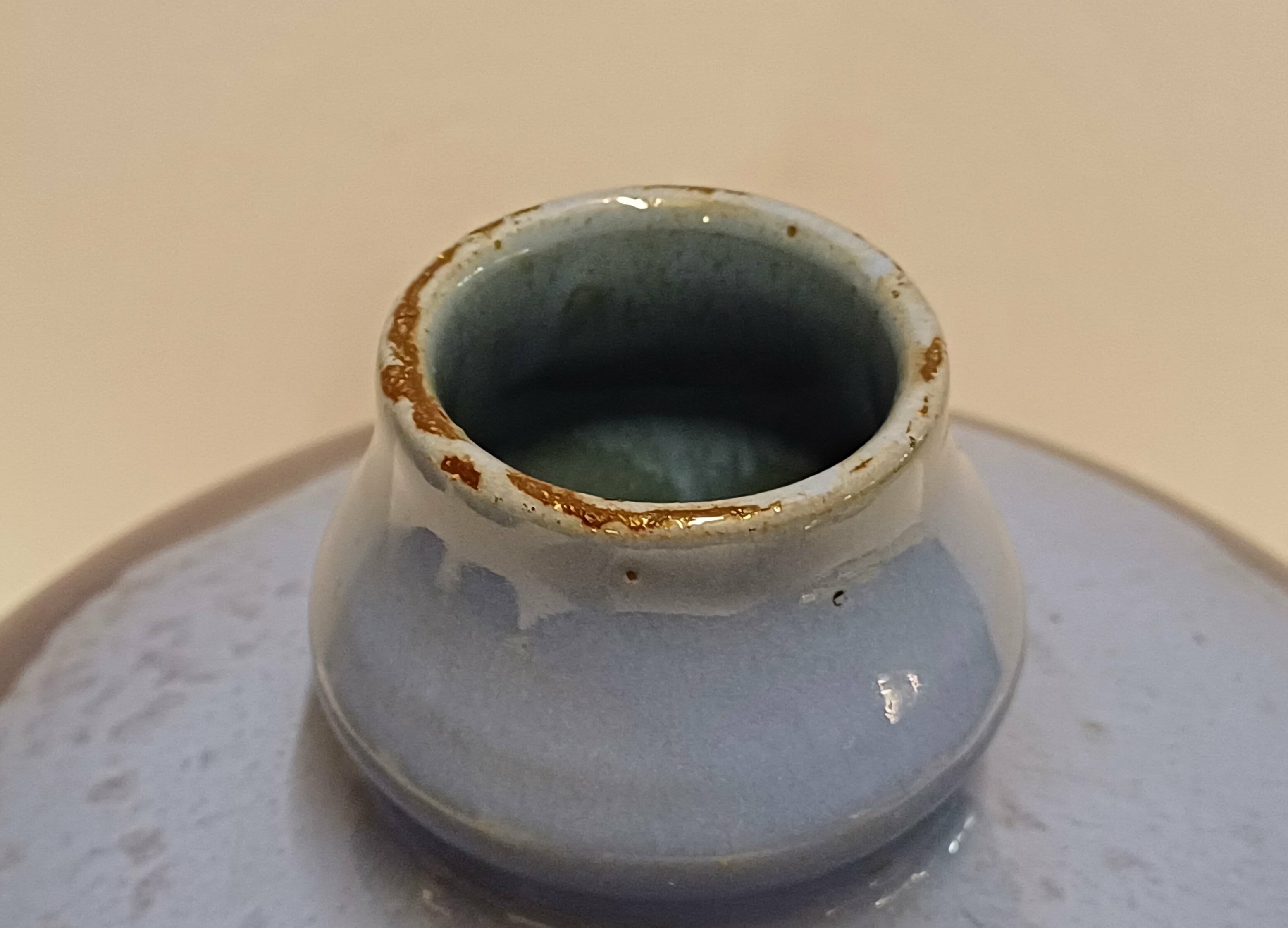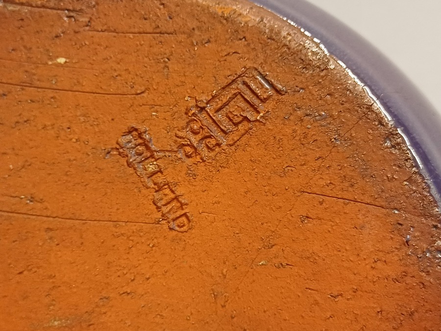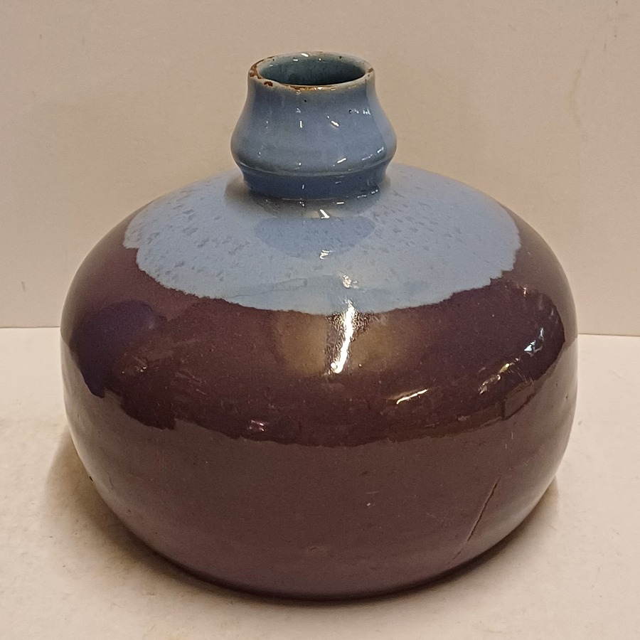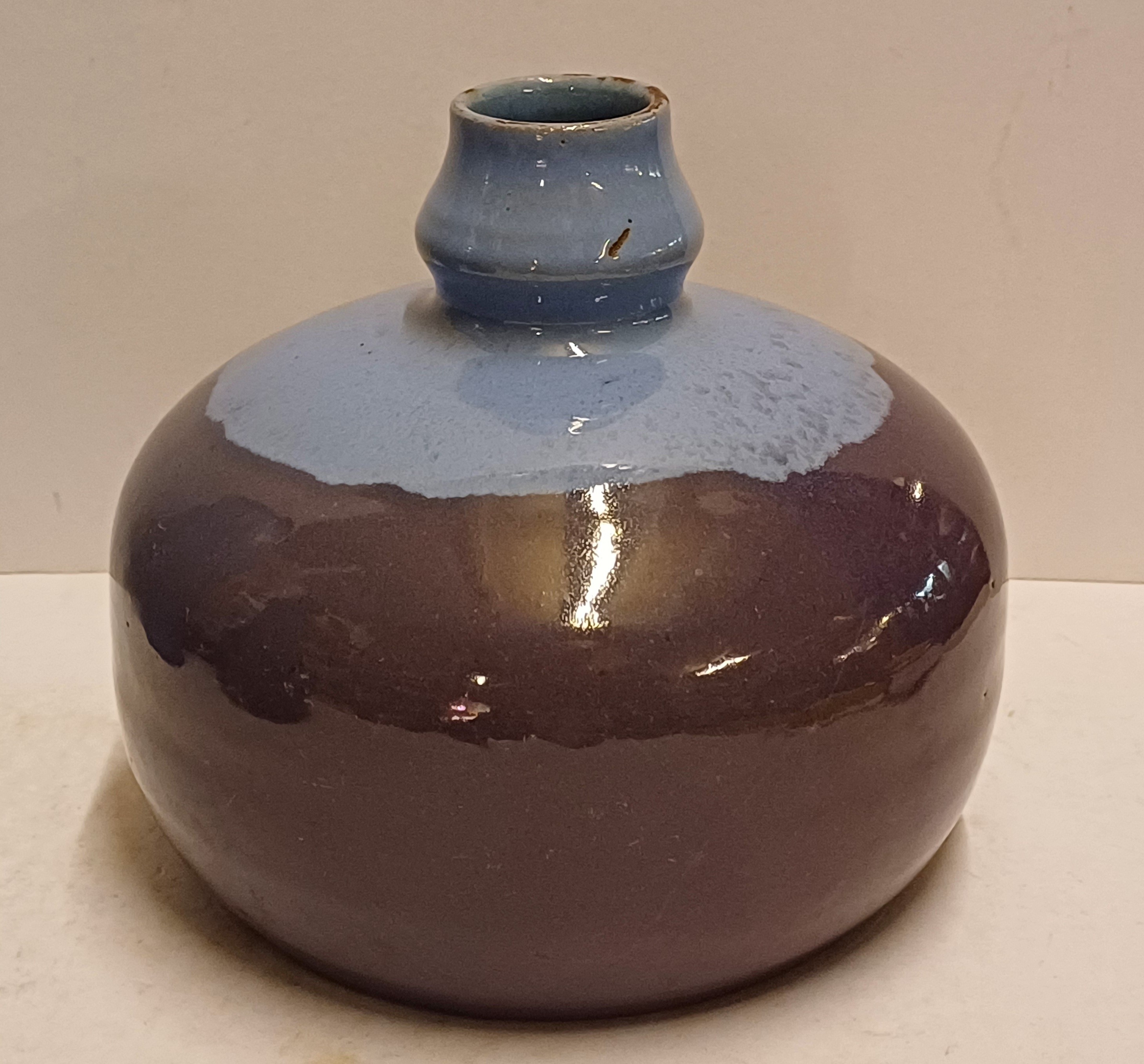Vaso in terracotta con smalto viola e azzurro chiaro. Parte inferiore firmata.